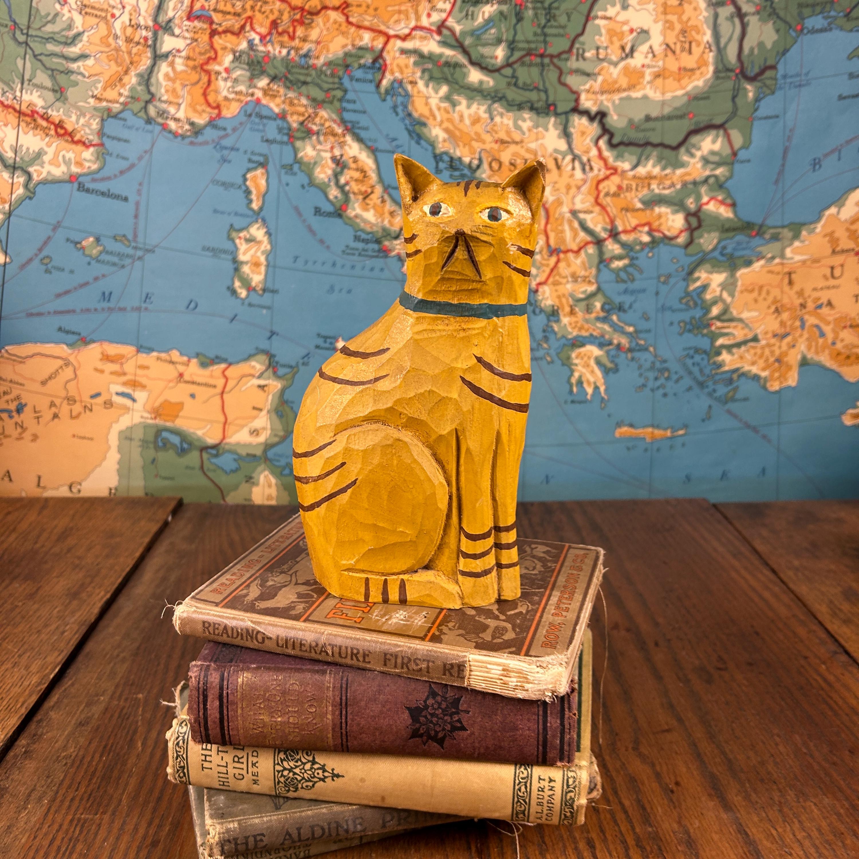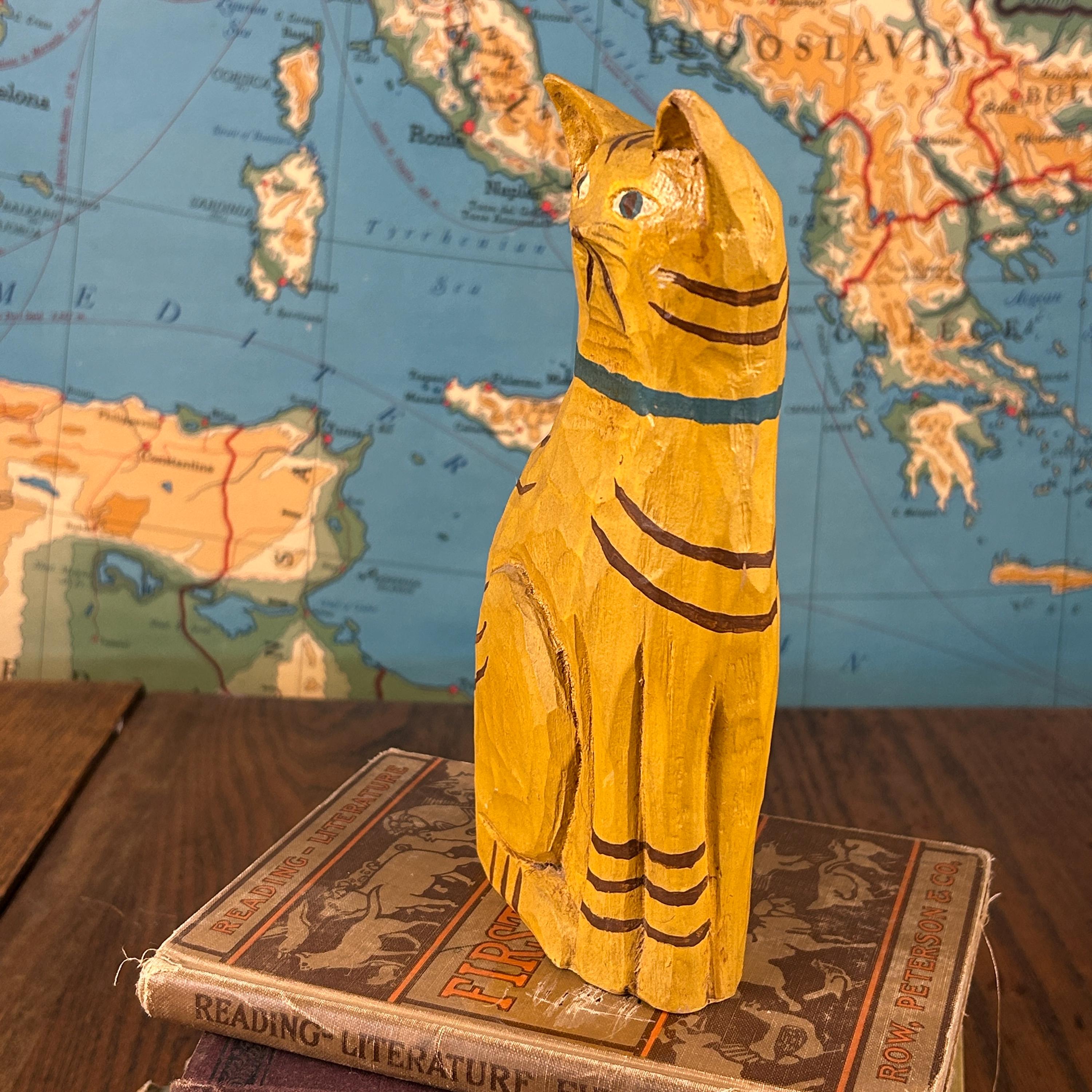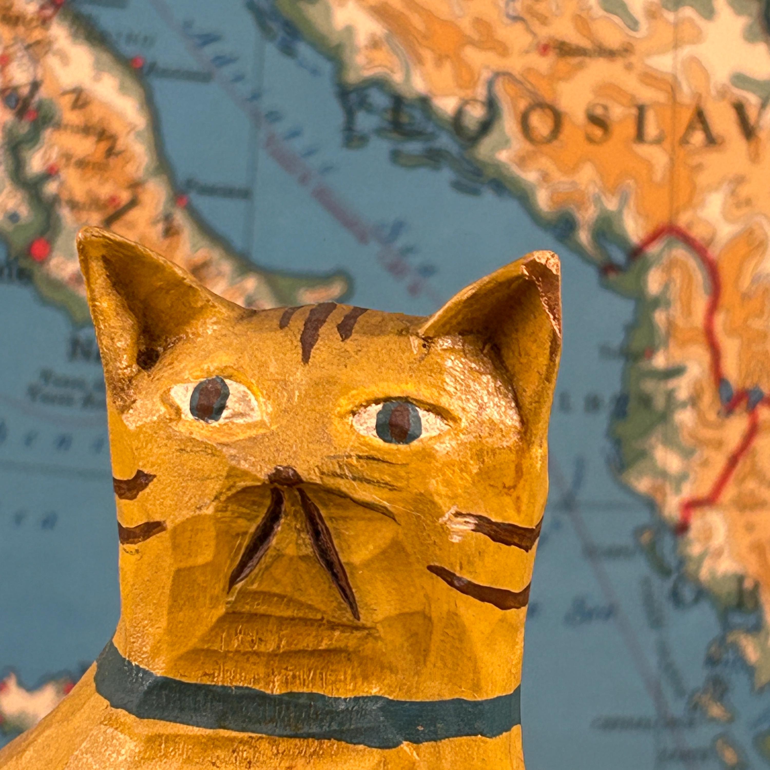 Bring a touch of warm, whimsical charm to your home décor with this hand-carved and painted wooden folk art cat figurine. This sweet sitting orange tabby cat is carved from solid wood and features hand-painted striped details and a cheerful blue collar.