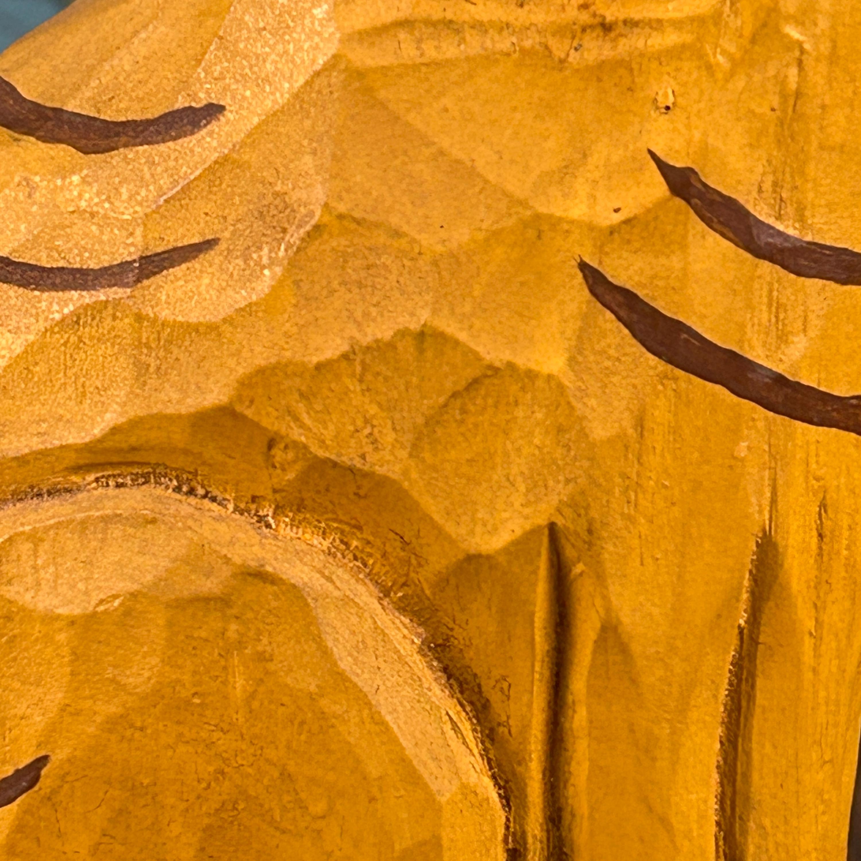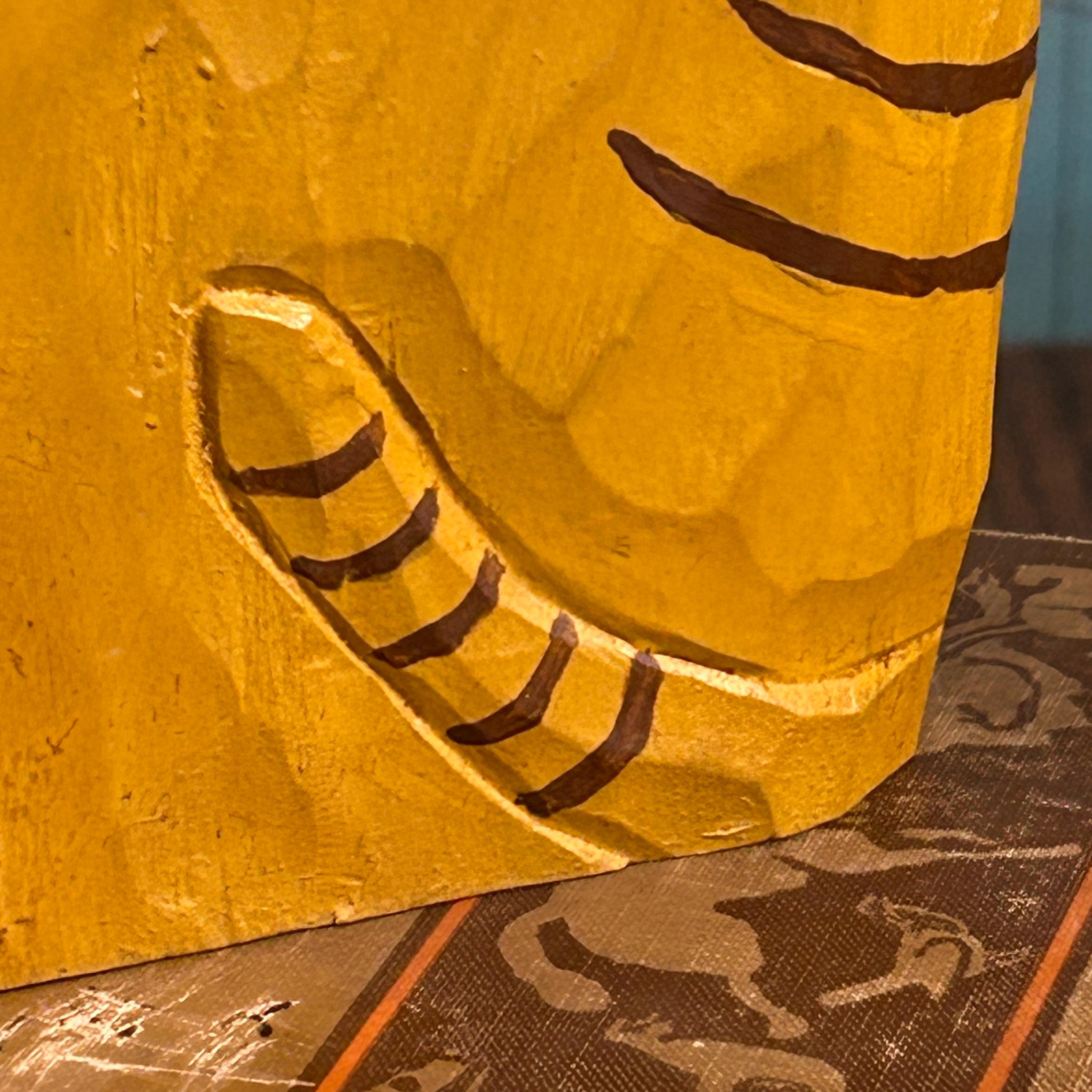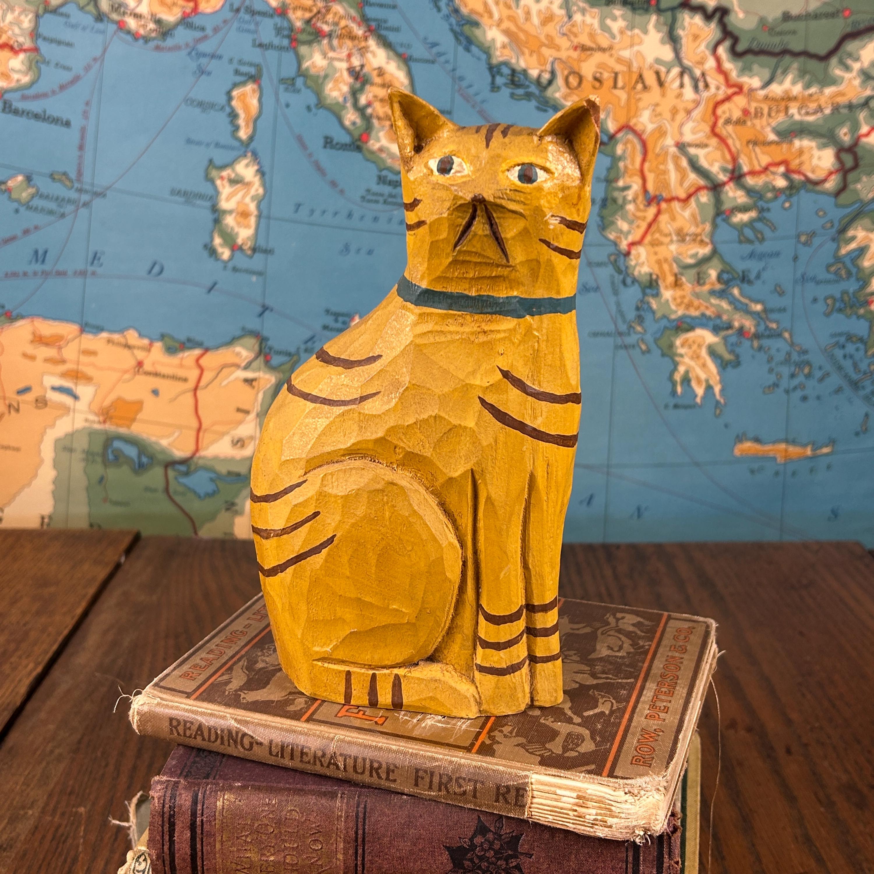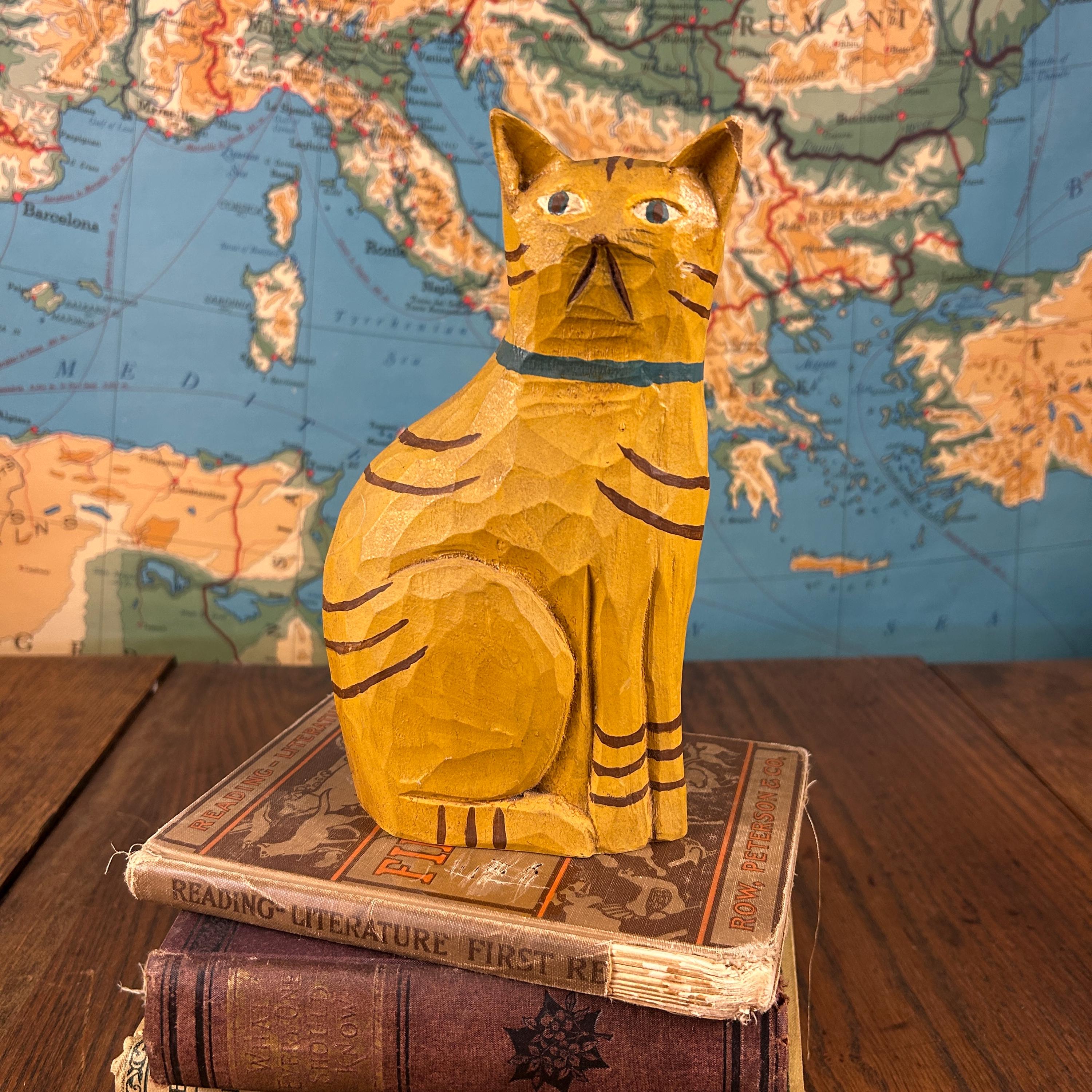 Bring a touch of warm, whimsical charm to your home décor with this hand-carved and painted wooden folk art cat figurine. This sweet sitting orange tabby cat is carved from solid wood and features hand-painted striped details and a cheerful blue collar.