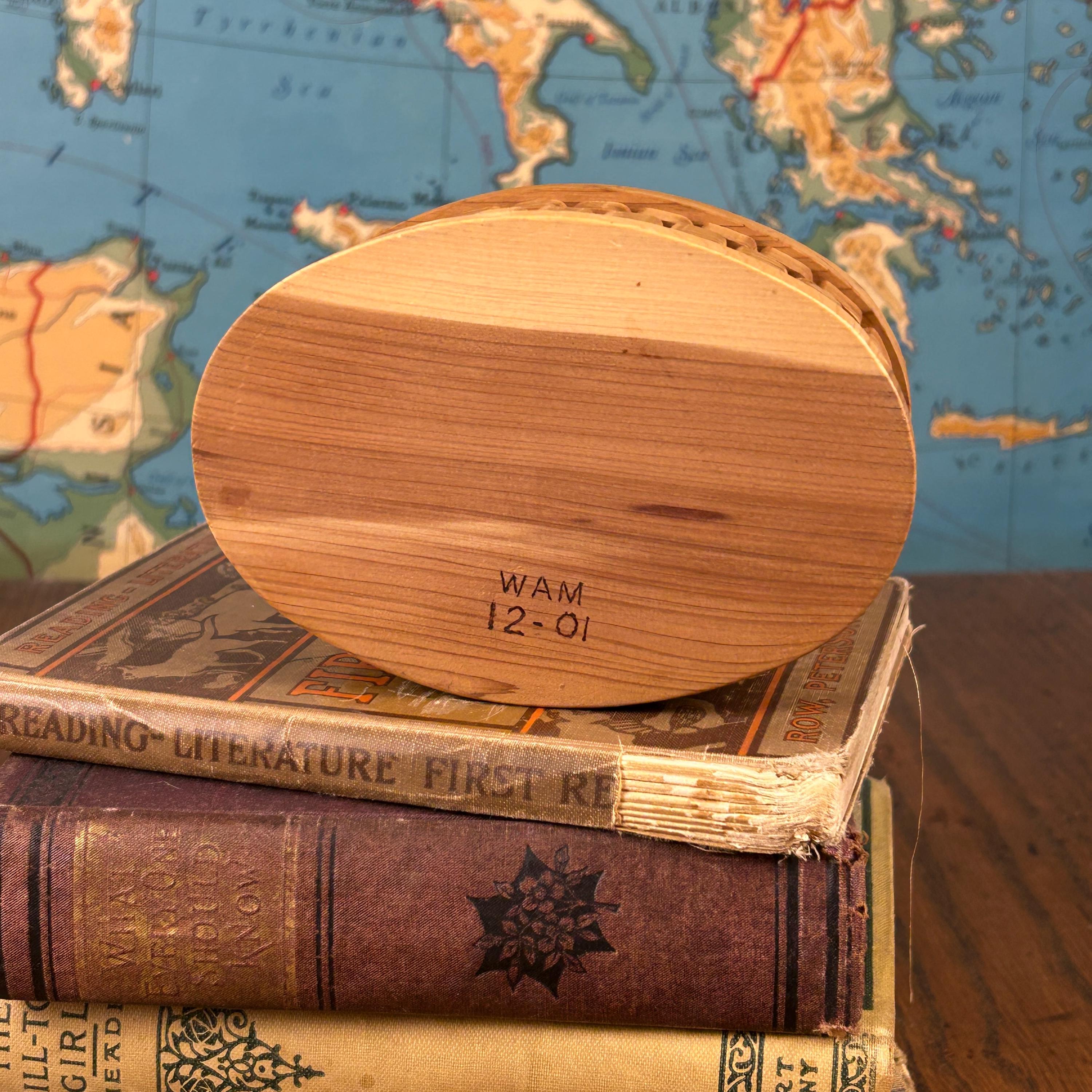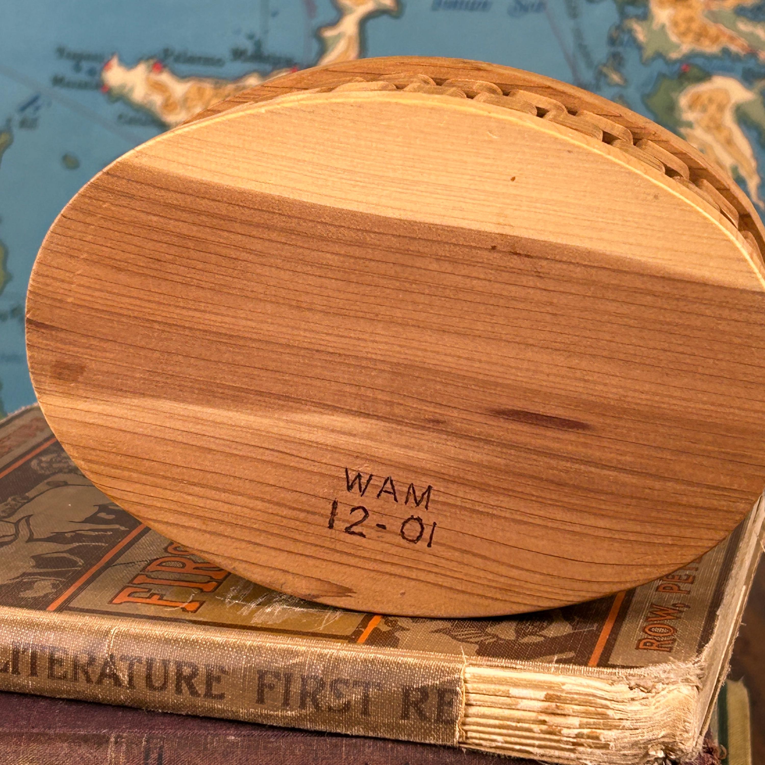 This bentwood box is crafted in the traditional style by steaming and bending a single piece of wood into shape. Likely made of cedar, the wood has a warm natural tone and classic grain. The bottom is stamped “WAM 12-01”.