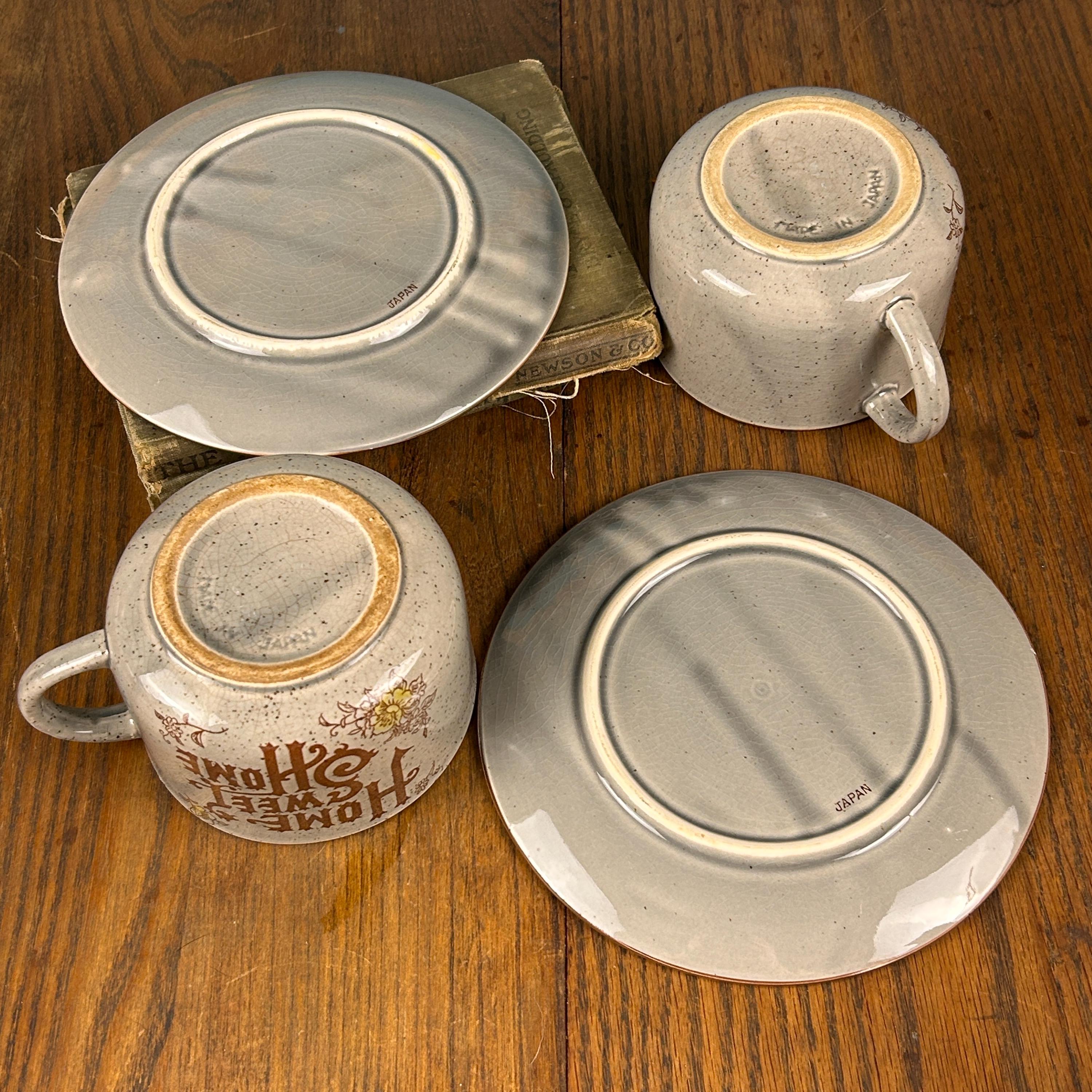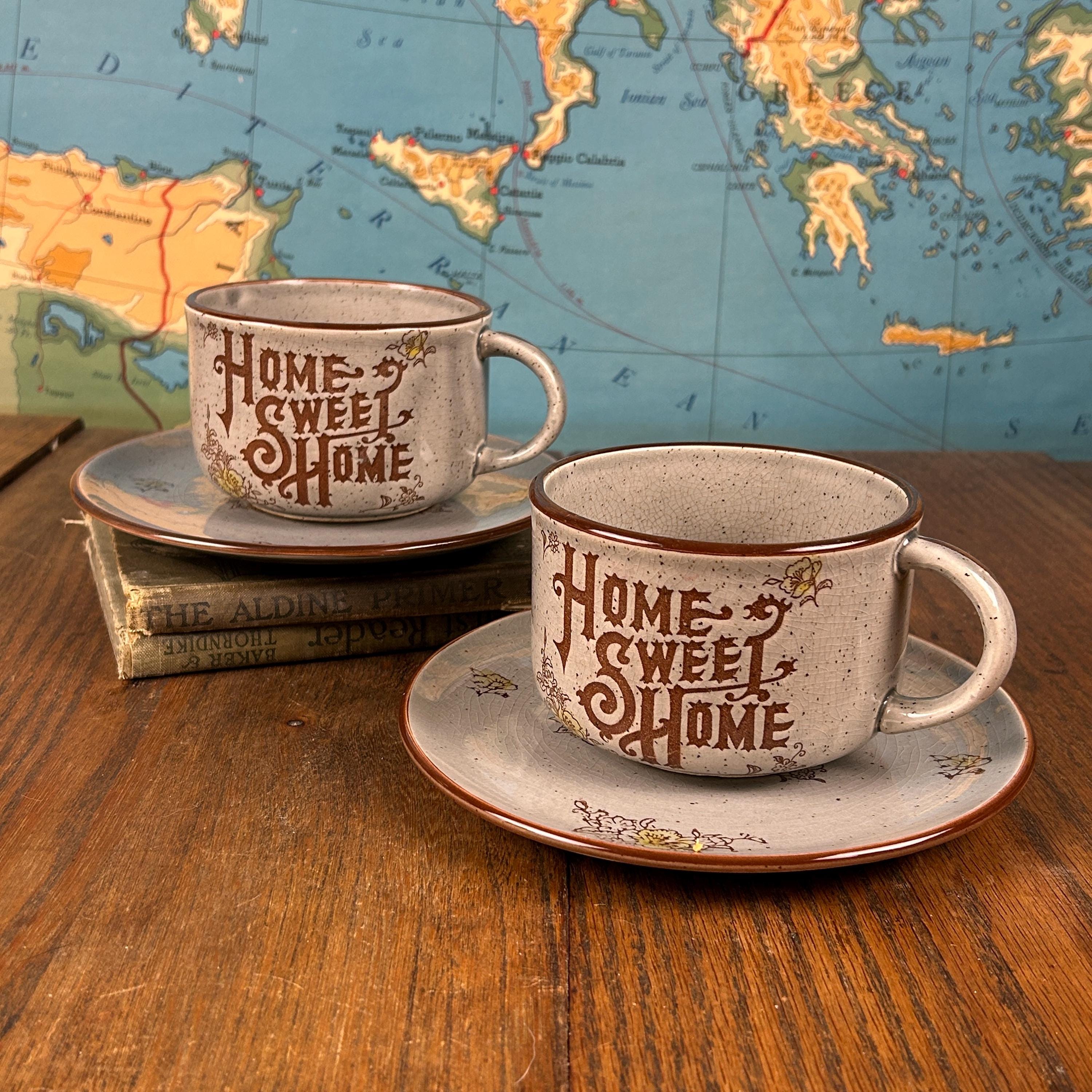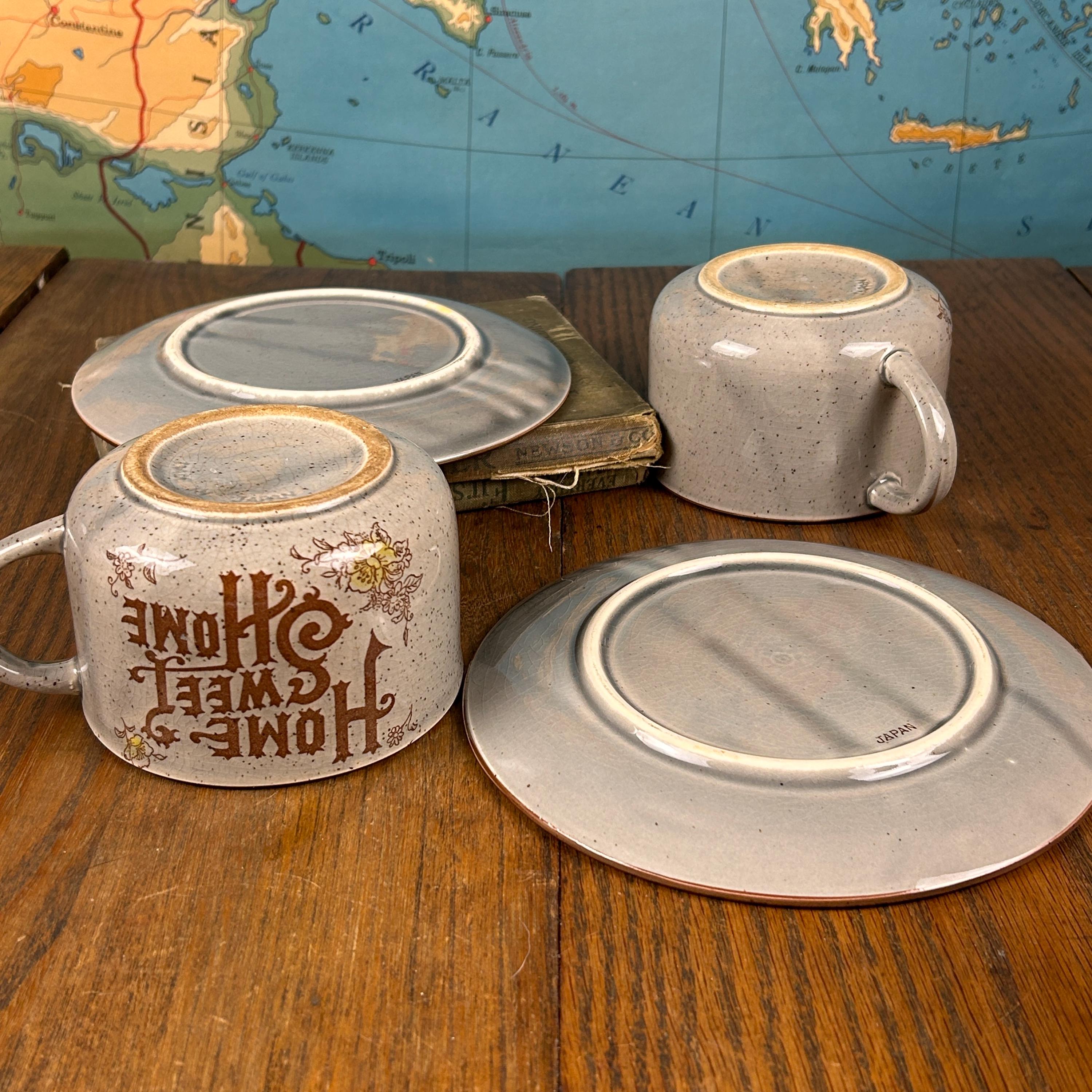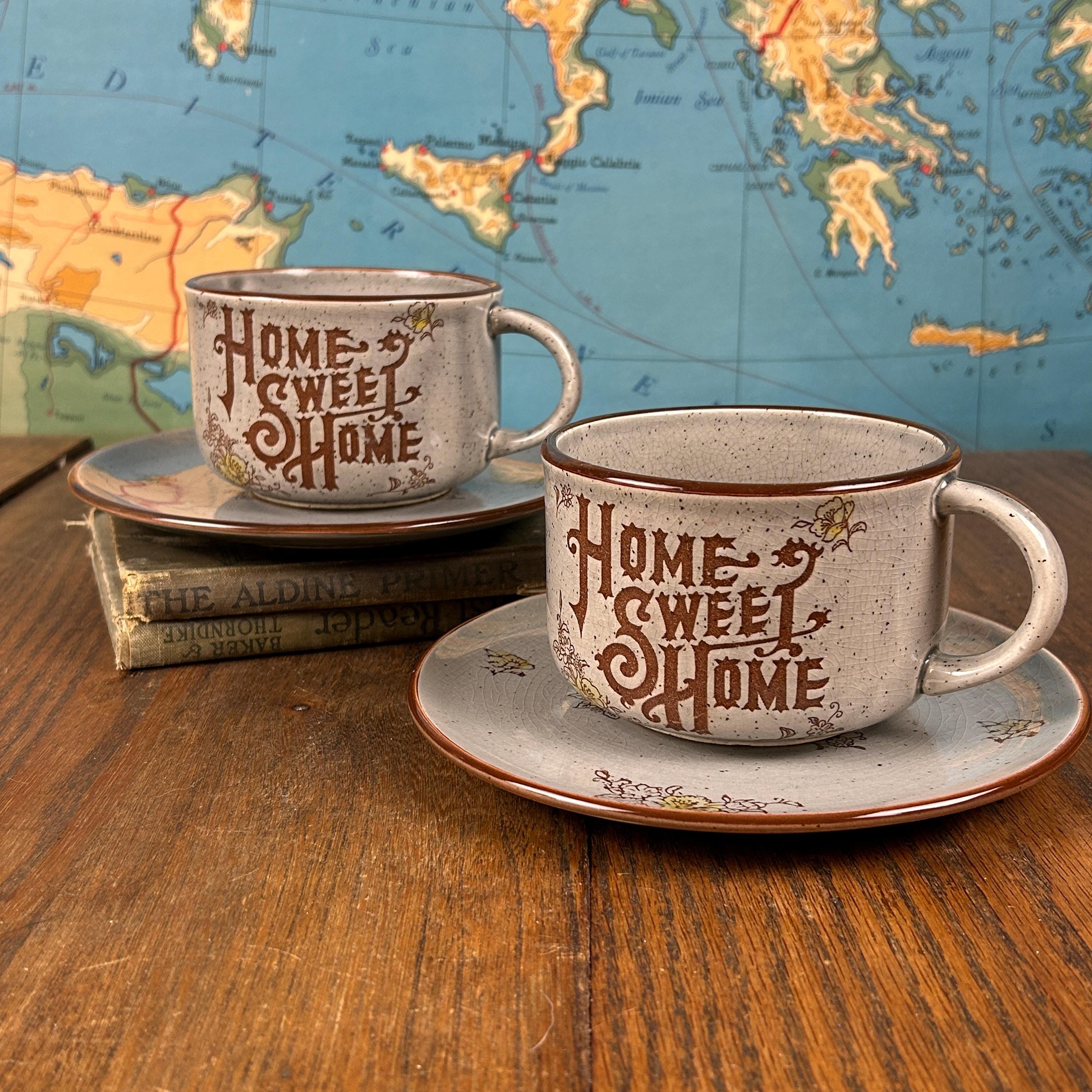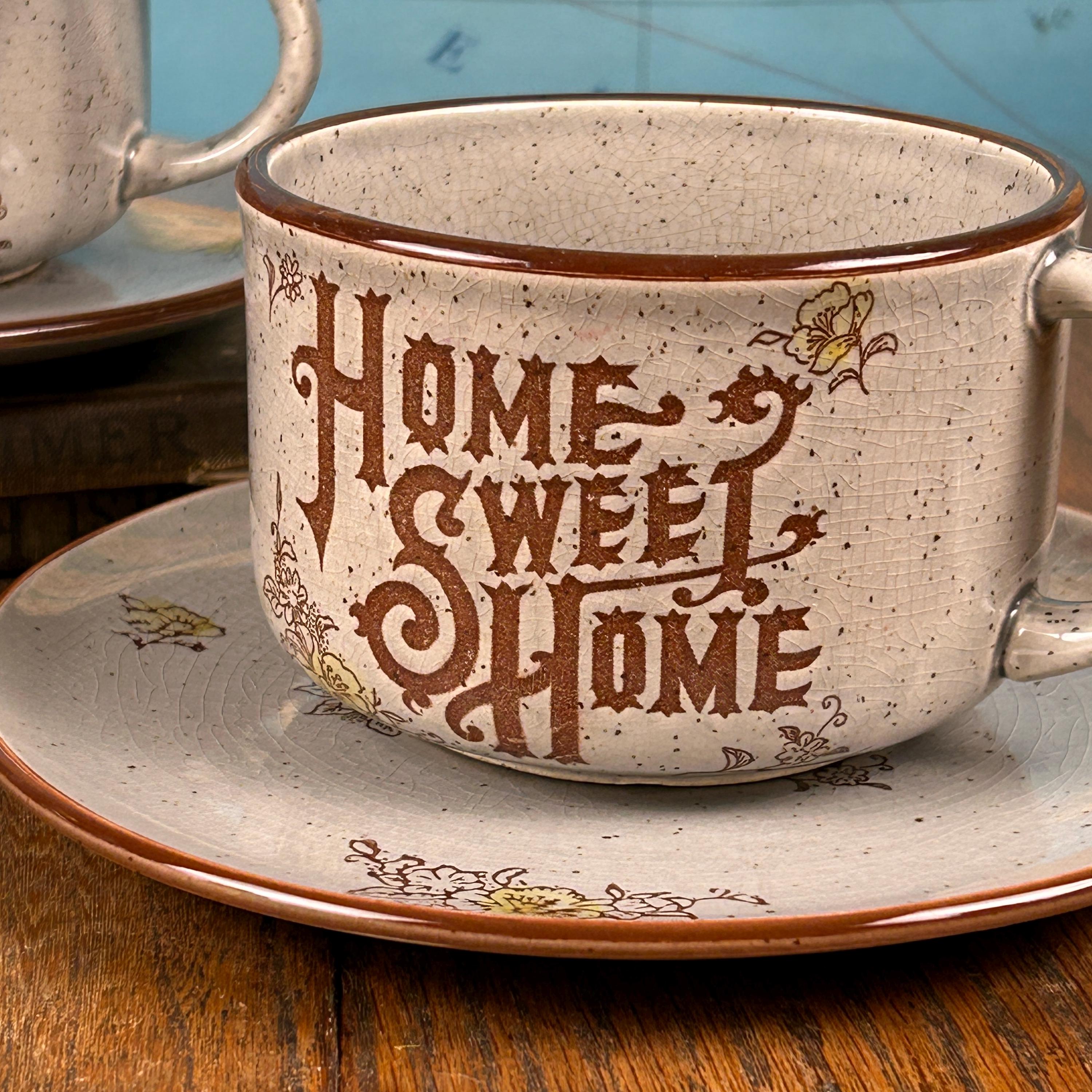 Bring cozy vintage charm to your table with this “Home Sweet Home” speckled stoneware mug and saucer set, made in Japan in the 1970s. The set features an off-white/gray speckled glaze with warm brown text and cheerful yellow floral accents, giving it a rustic farmhouse feel.