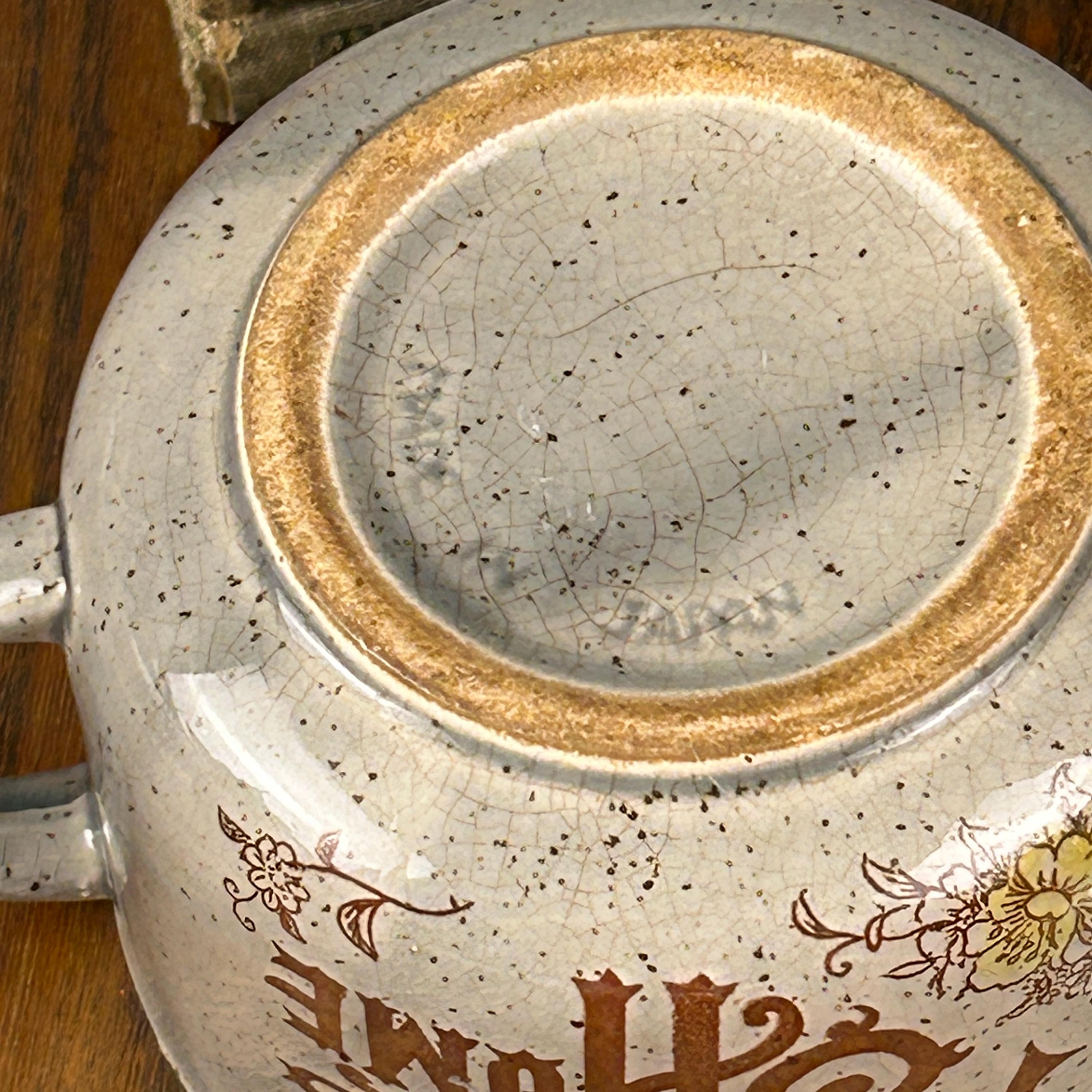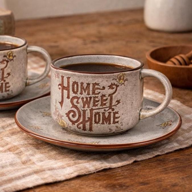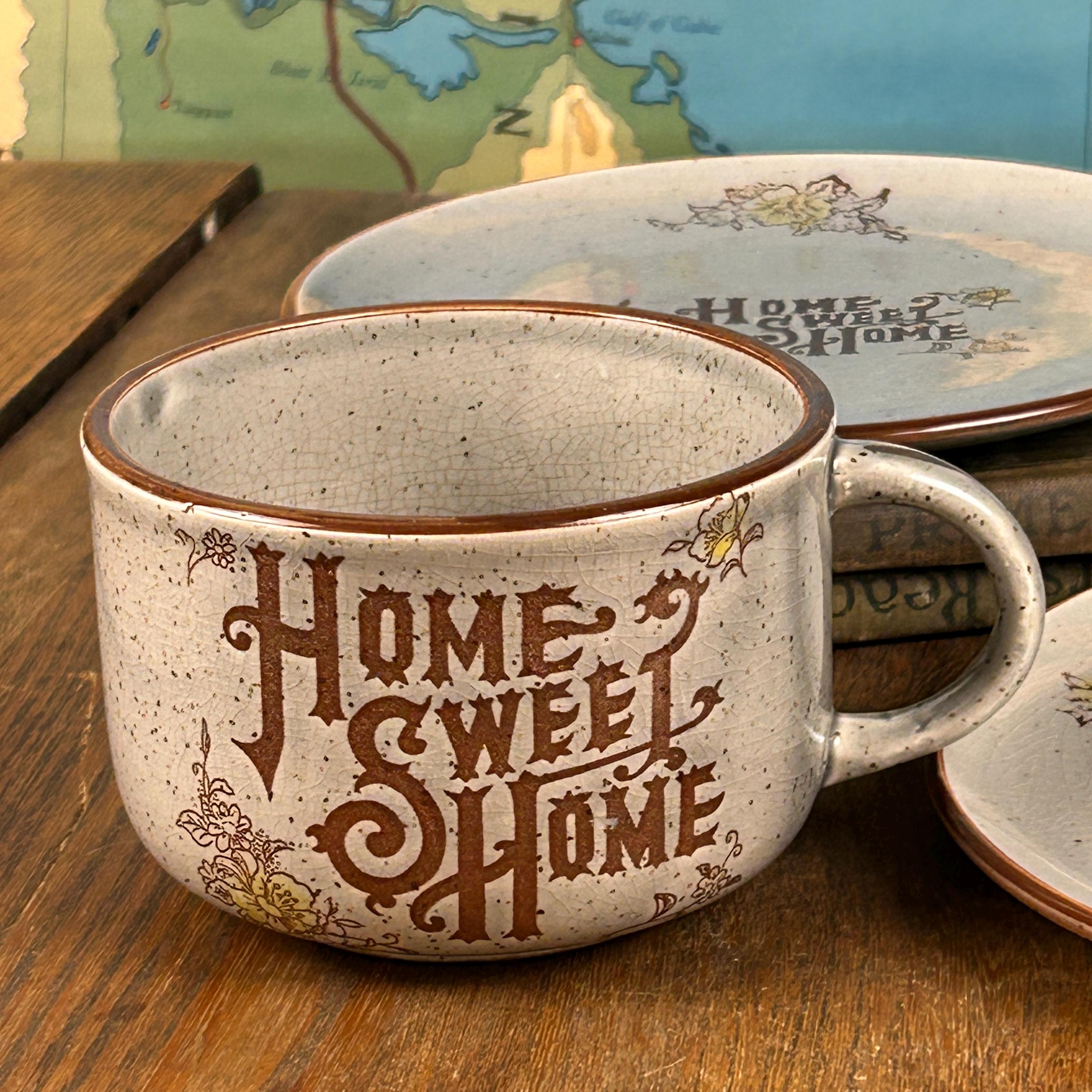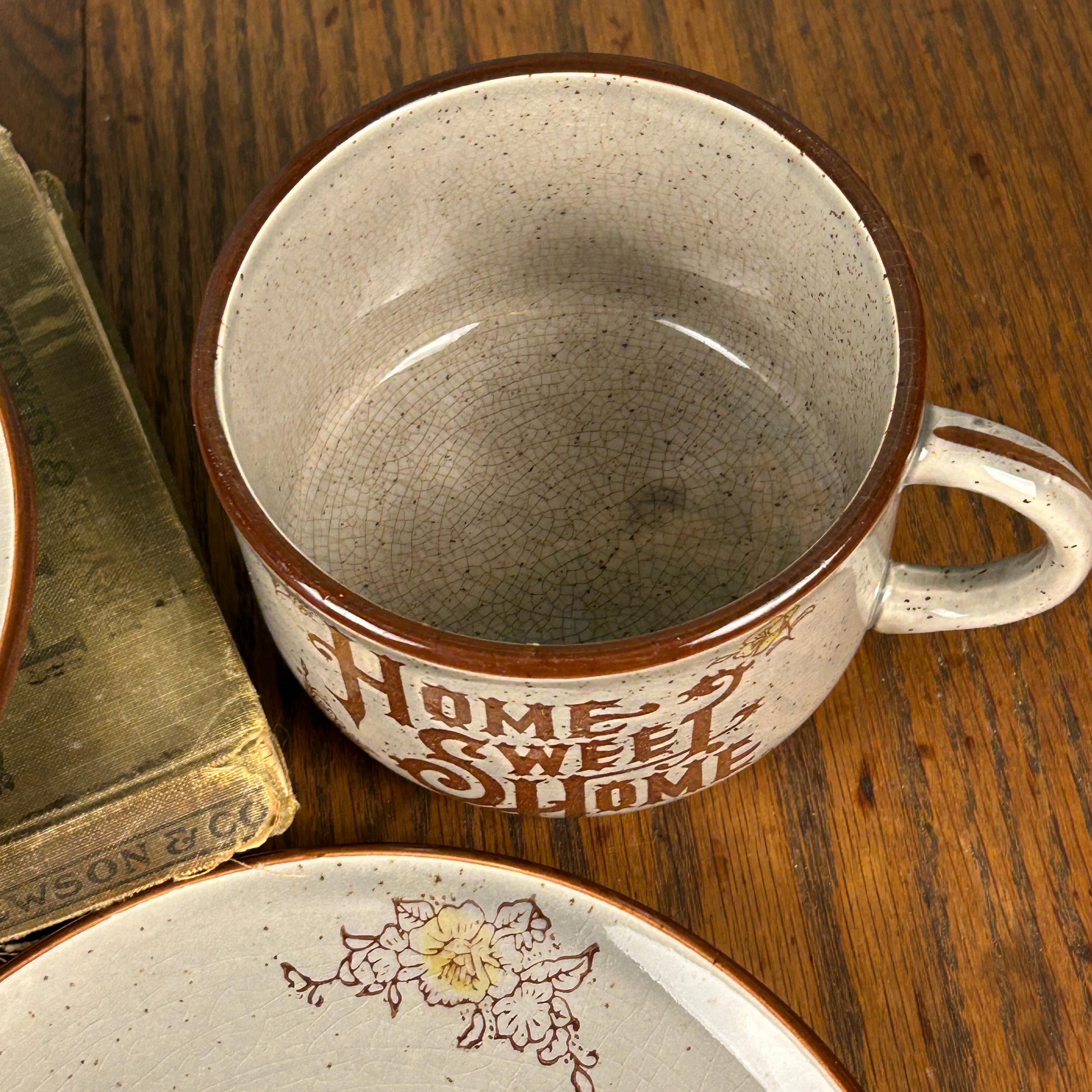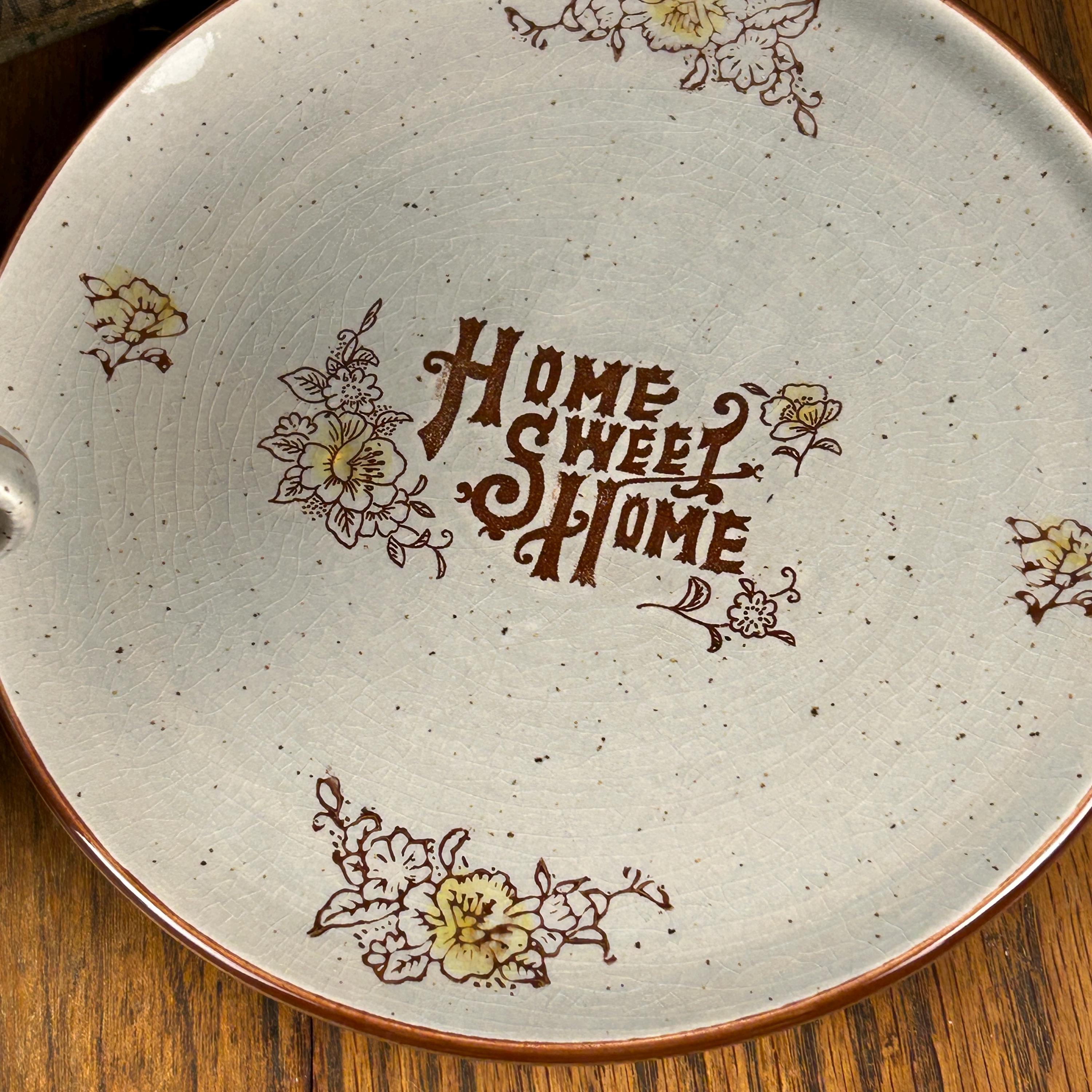 Bring cozy vintage charm to your table with this “Home Sweet Home” speckled stoneware mug and saucer set, made in Japan in the 1970s. The set features an off-white/gray speckled glaze with warm brown text and cheerful yellow floral accents, giving it a rustic farmhouse feel.