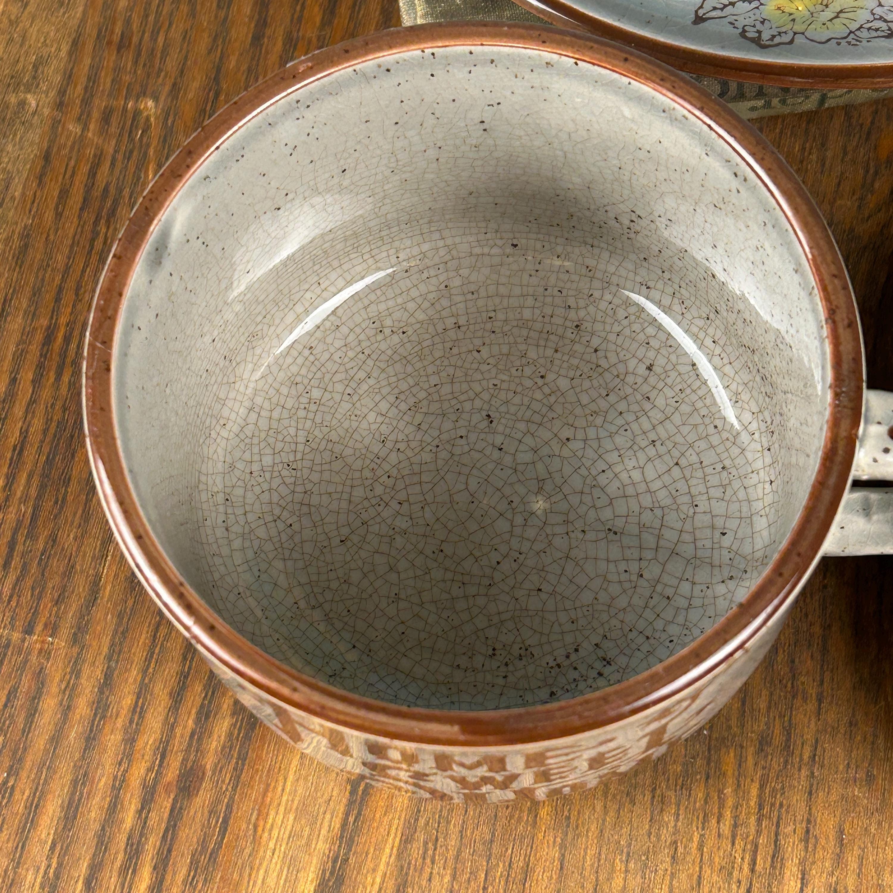 The mug has a wide, low profile that is often described as a soup mug—perfect for chili, stew, coffee, tea, or cocoa. The matching saucer completes the look and works beautifully for serving or display.