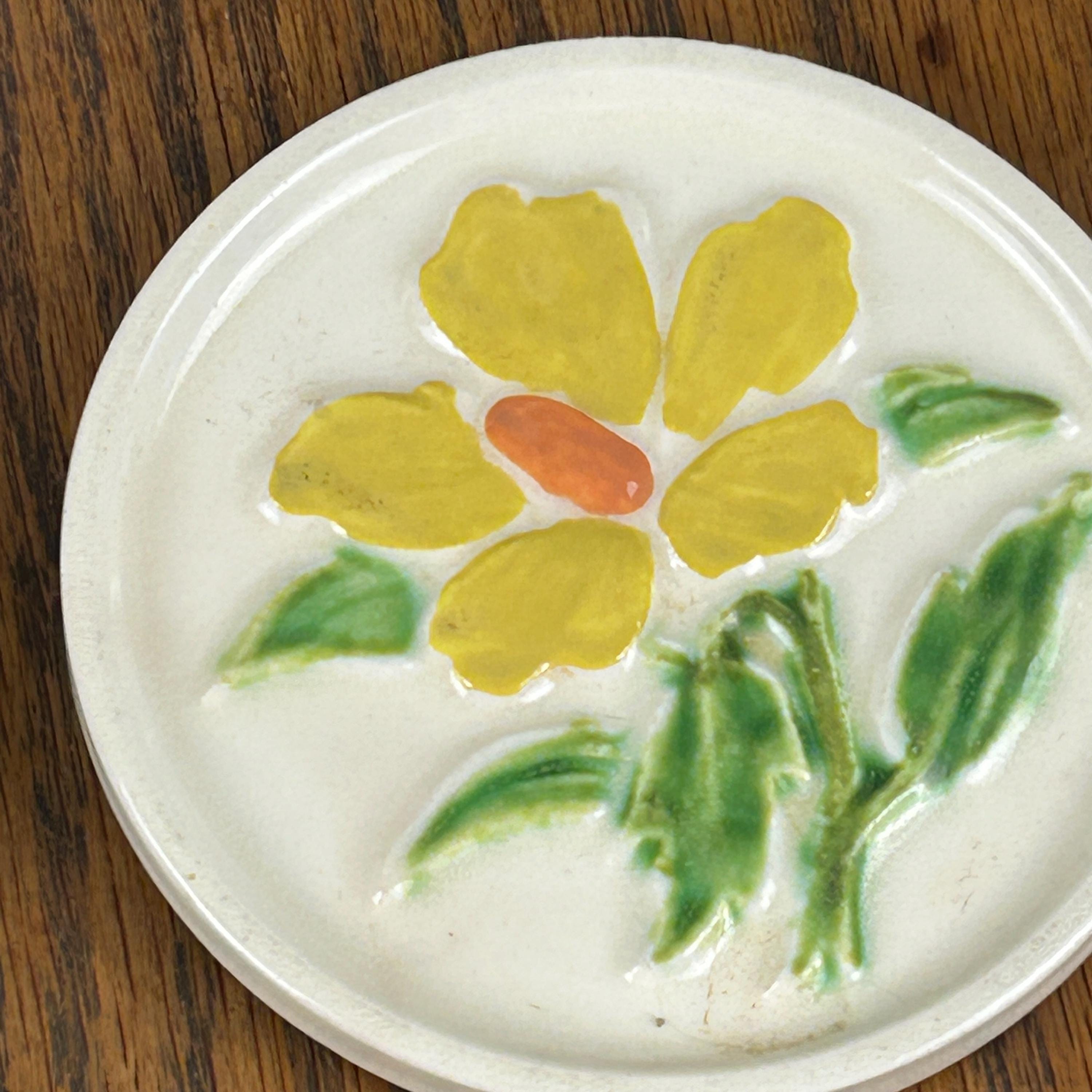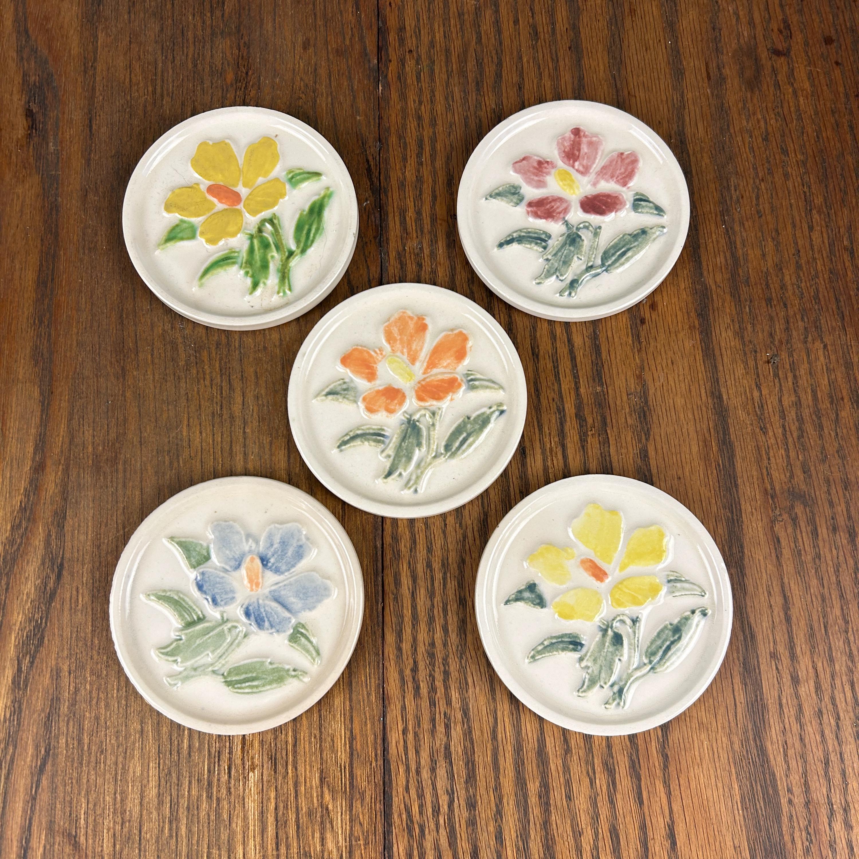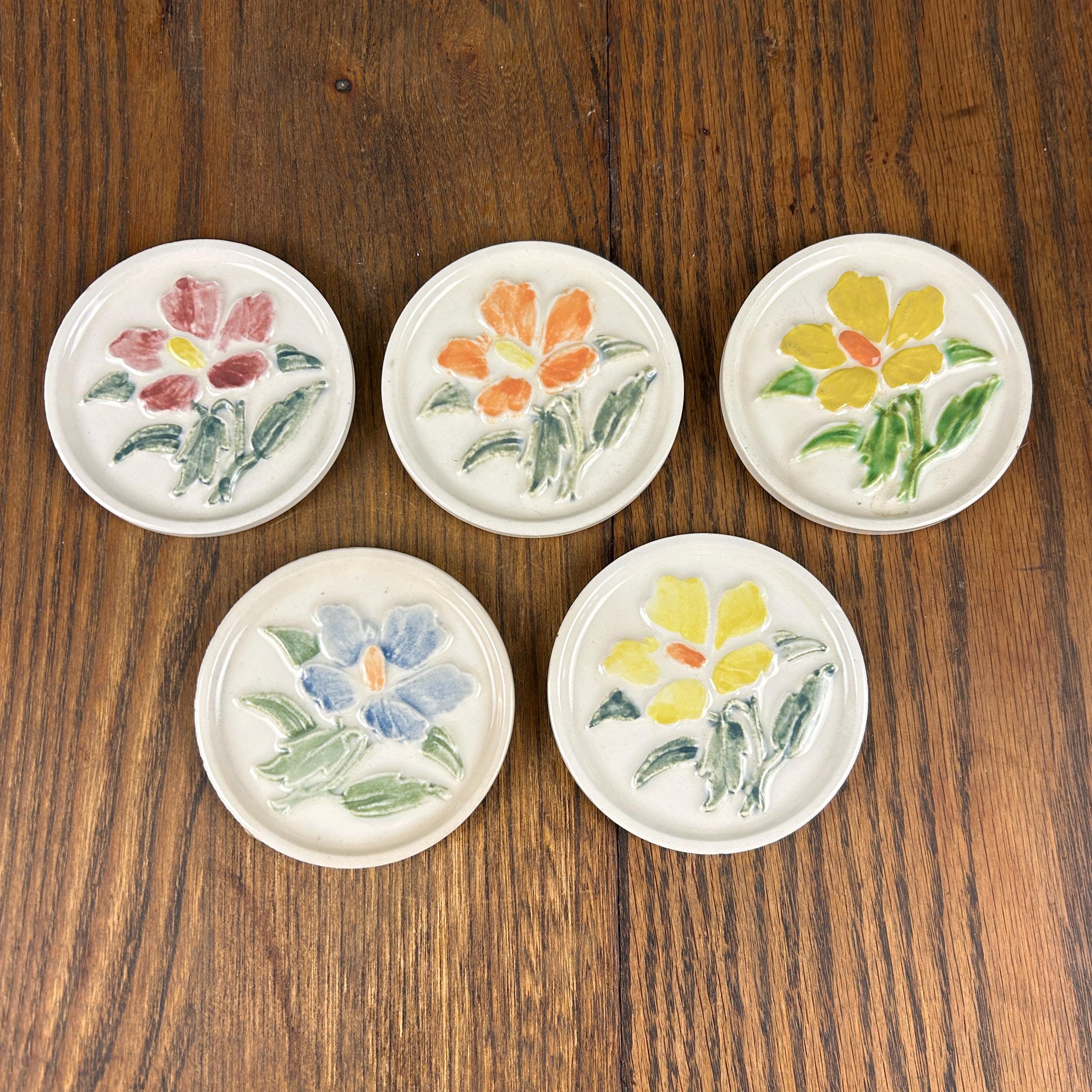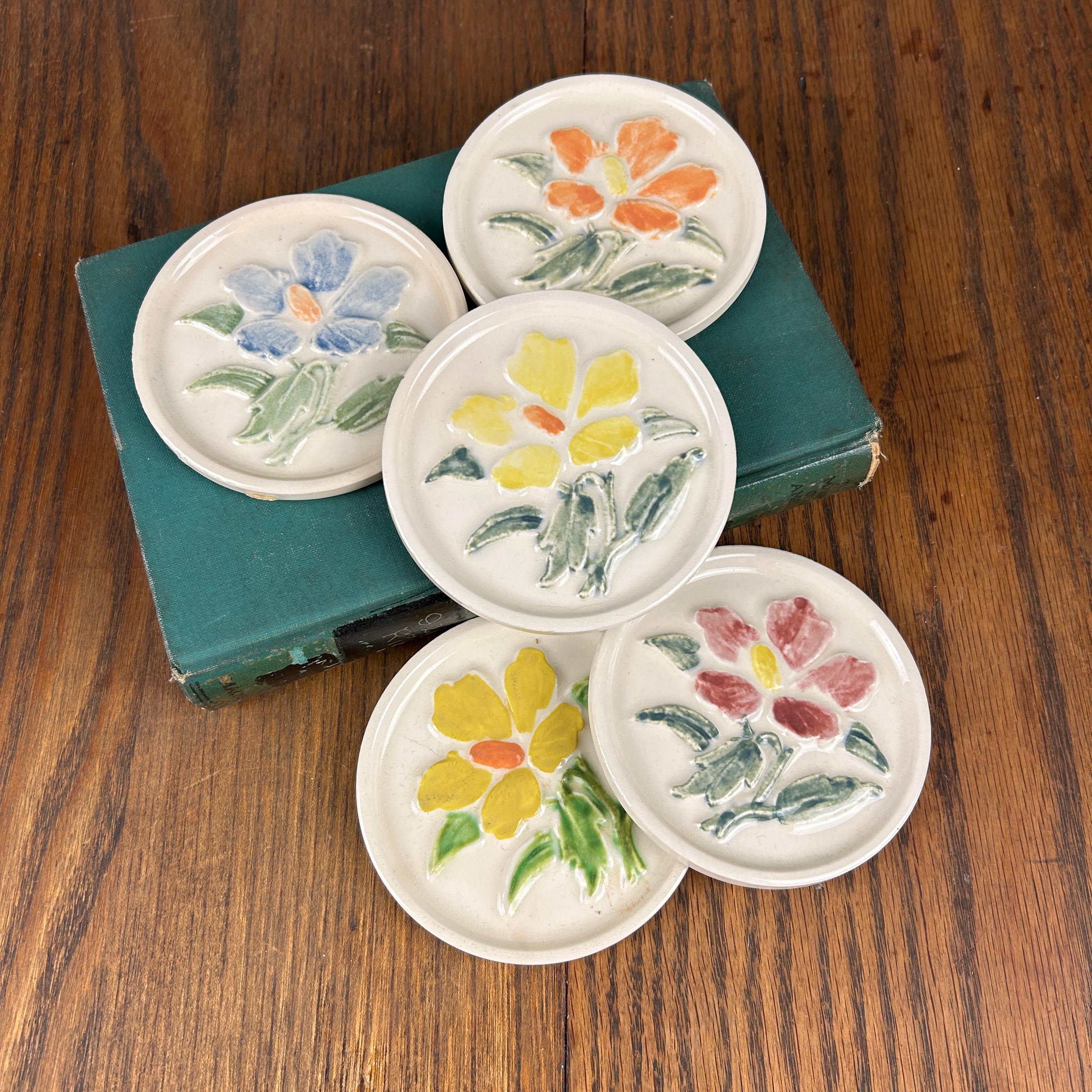Bring bright retro charm to your space with this set of five vintage ceramic “Flower Power” drink coasters. Each coaster features a bold raised floral design in high relief, beautifully hand-painted in different colors. Made in the USA, these sturdy ceramic pieces are perfect for protecting tabletops — and they also make adorable mini wall plaques when displayed together.