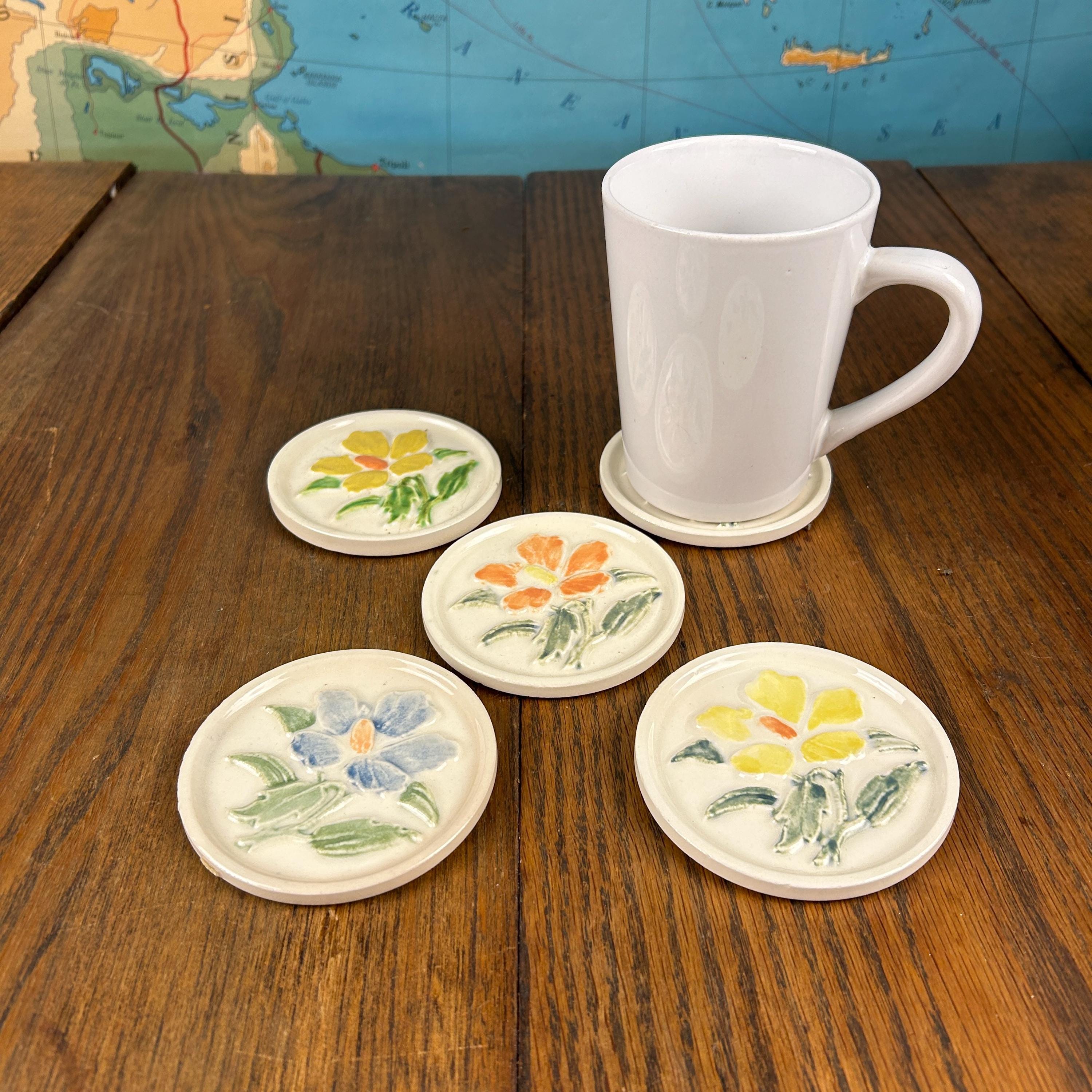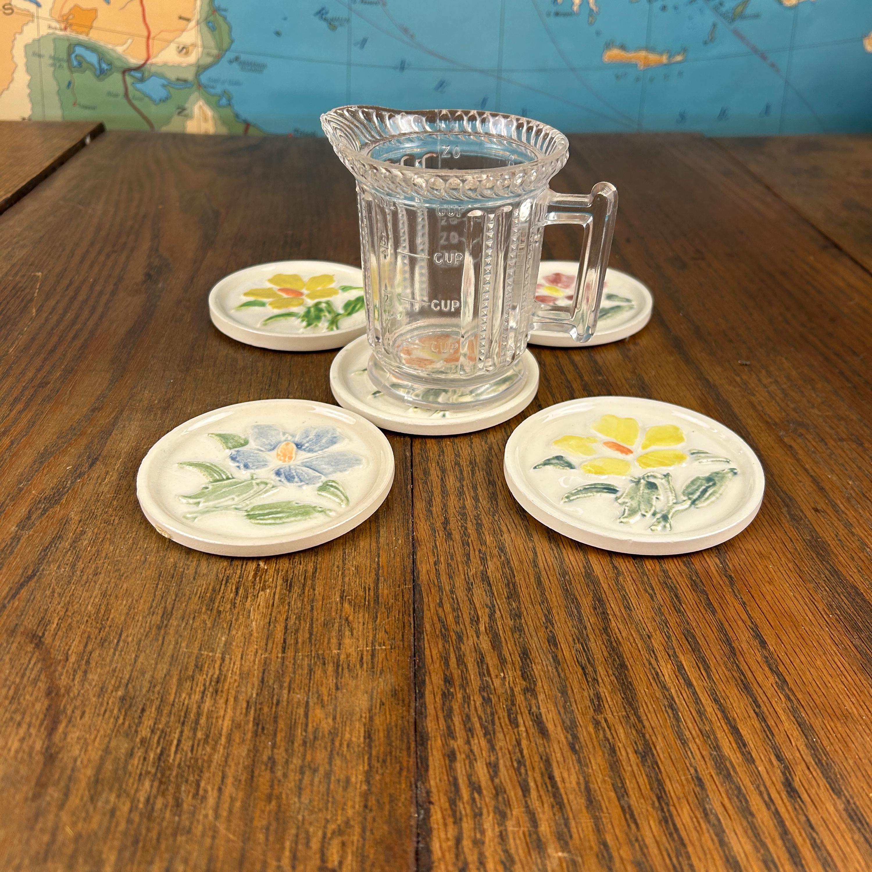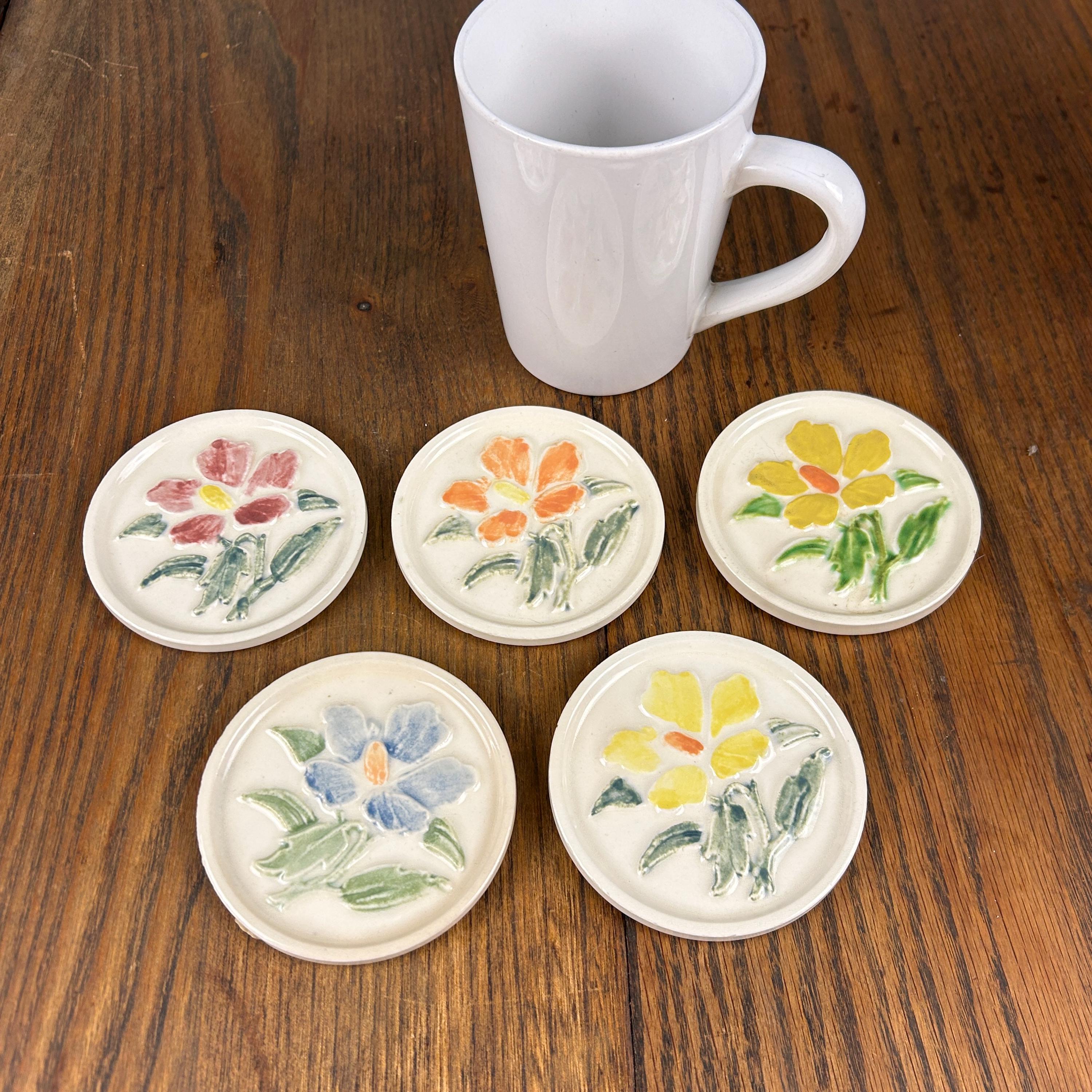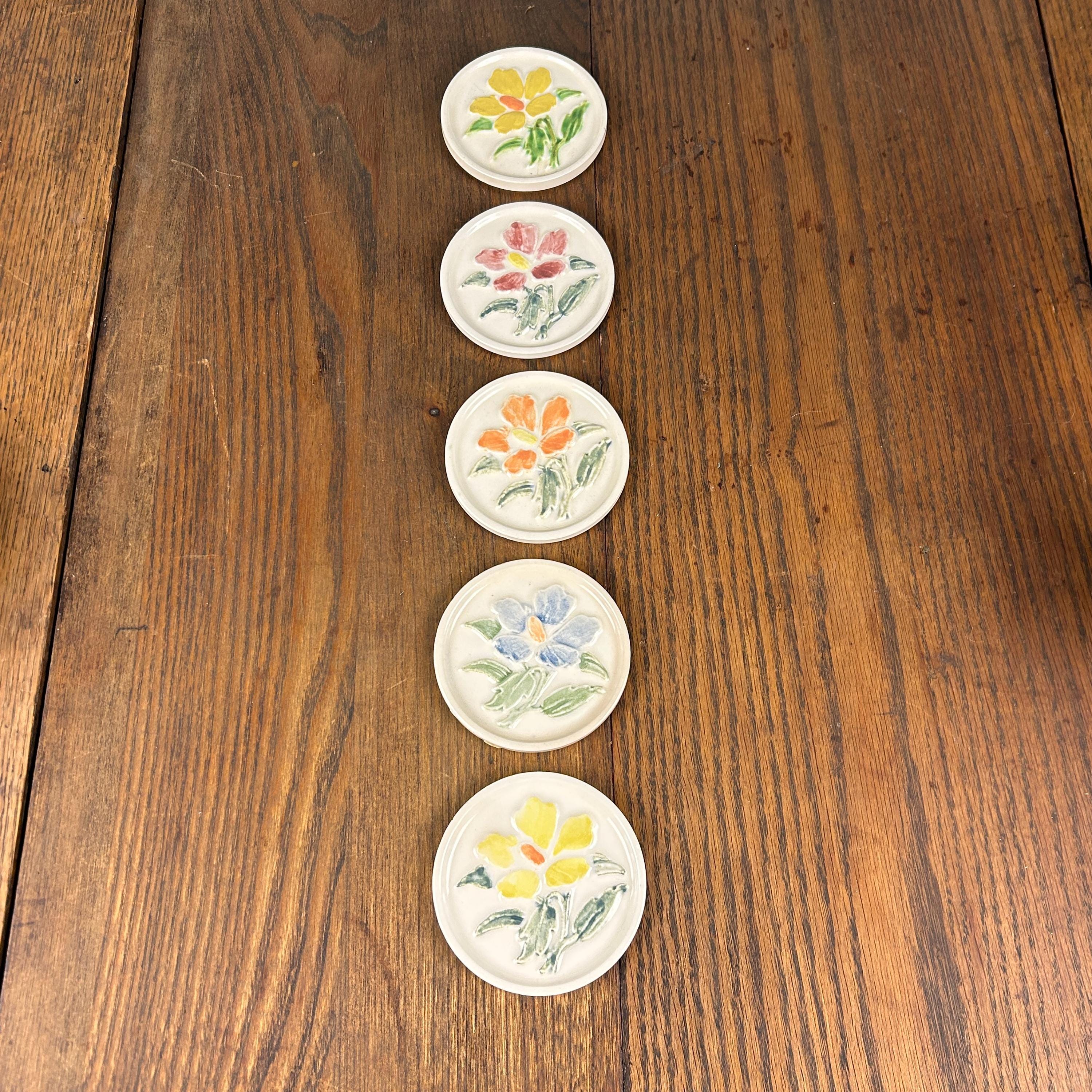 Bring bright retro charm to your space with this set of five vintage ceramic “Flower Power” drink coasters. Each coaster features a bold raised floral design in high relief, beautifully hand-painted in different colors. Made in the USA, these sturdy ceramic pieces are perfect for protecting tabletops — and they also make adorable mini wall plaques when displayed together.