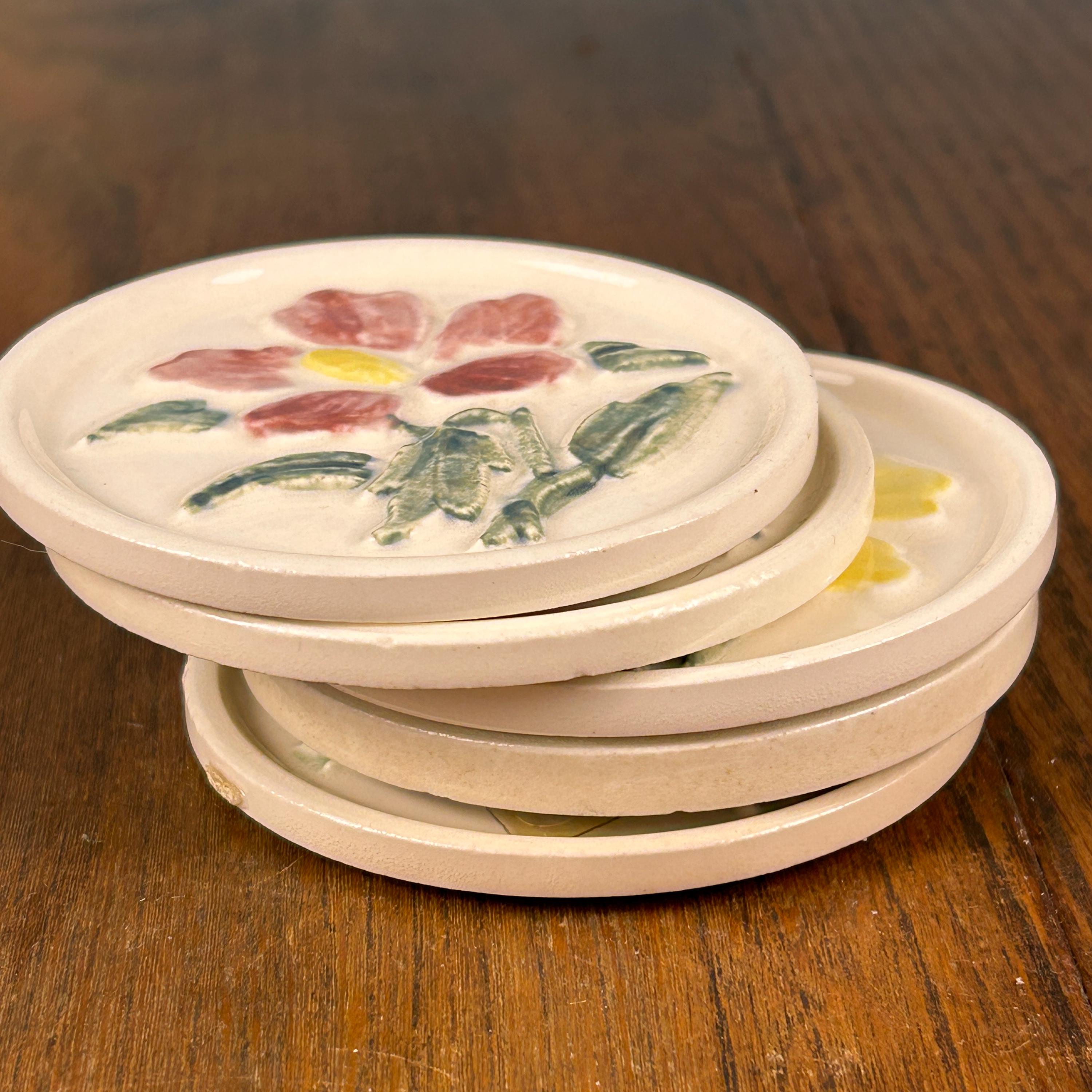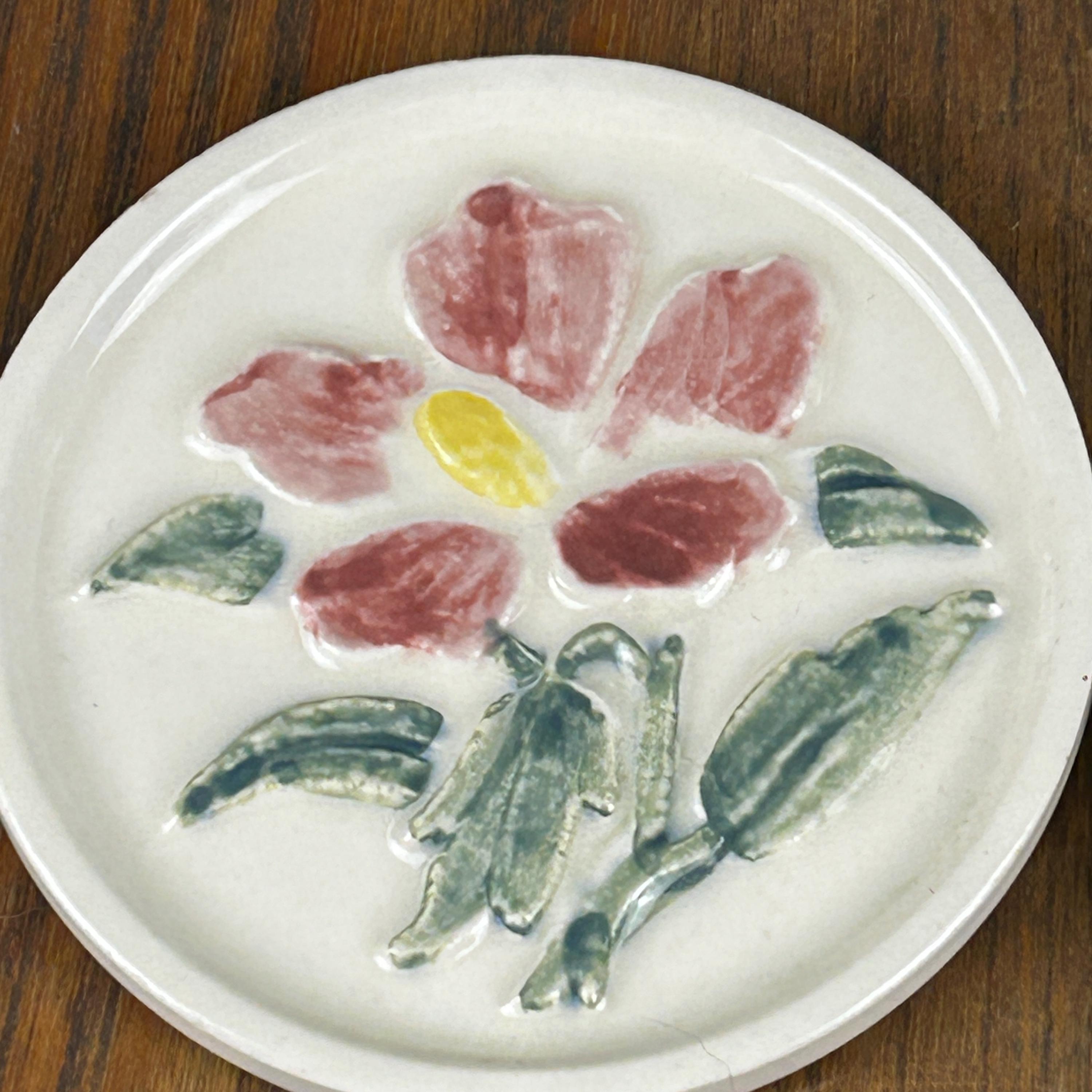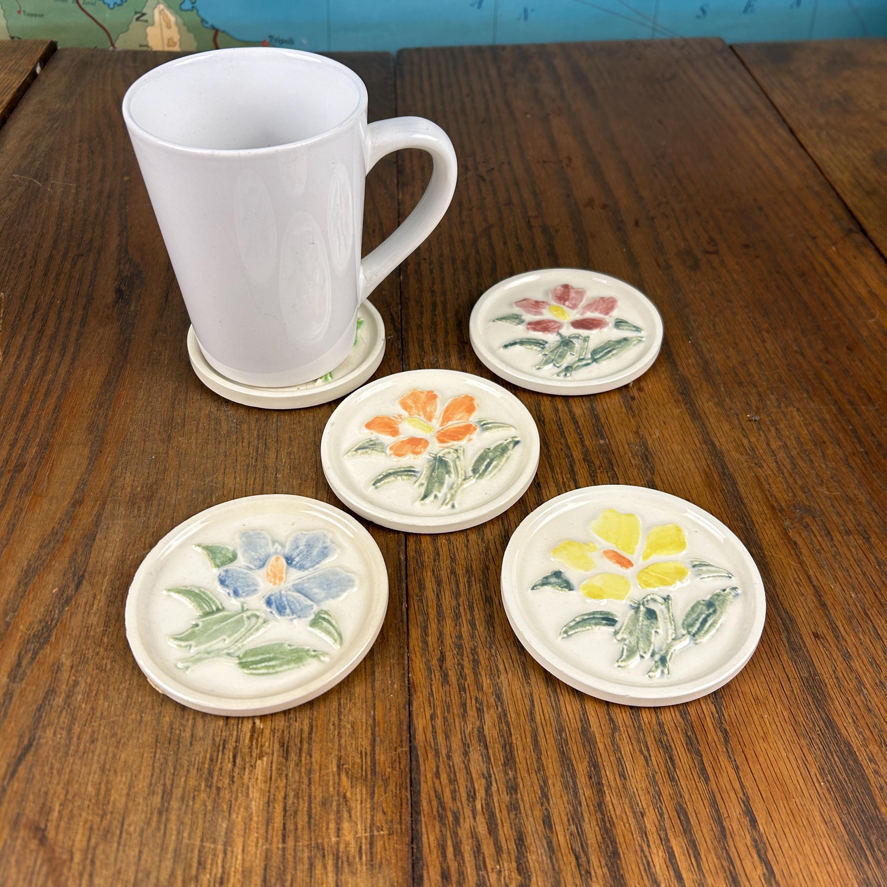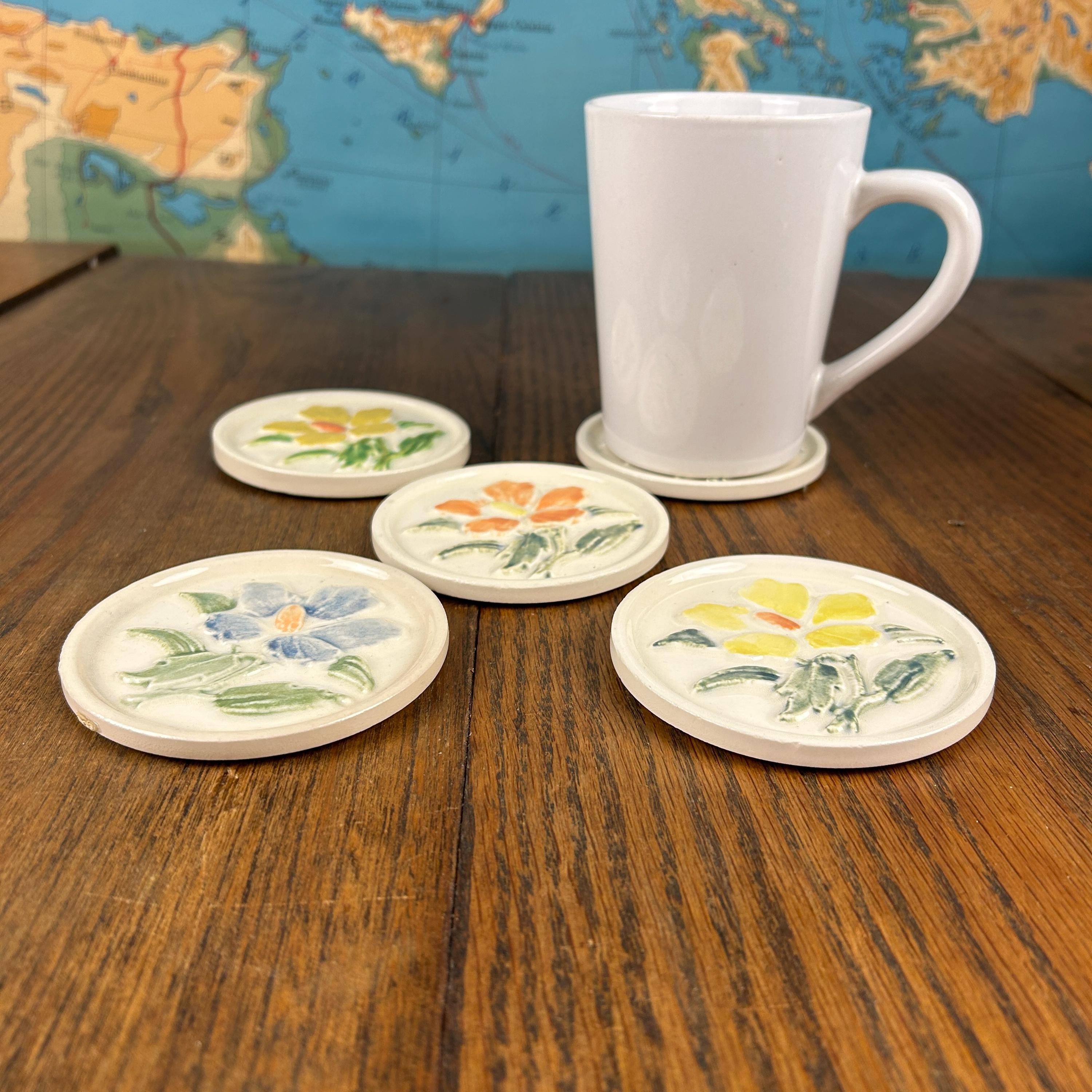 Bring bright retro charm to your space with this set of five vintage ceramic “Flower Power” drink coasters. Each coaster features a bold raised floral design in high relief, beautifully hand-painted in different colors. Made in the USA, these sturdy ceramic pieces are perfect for protecting tabletops — and they also make adorable mini wall plaques when displayed together.