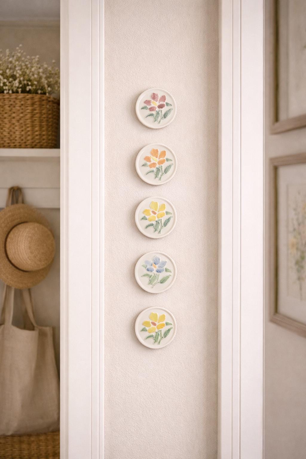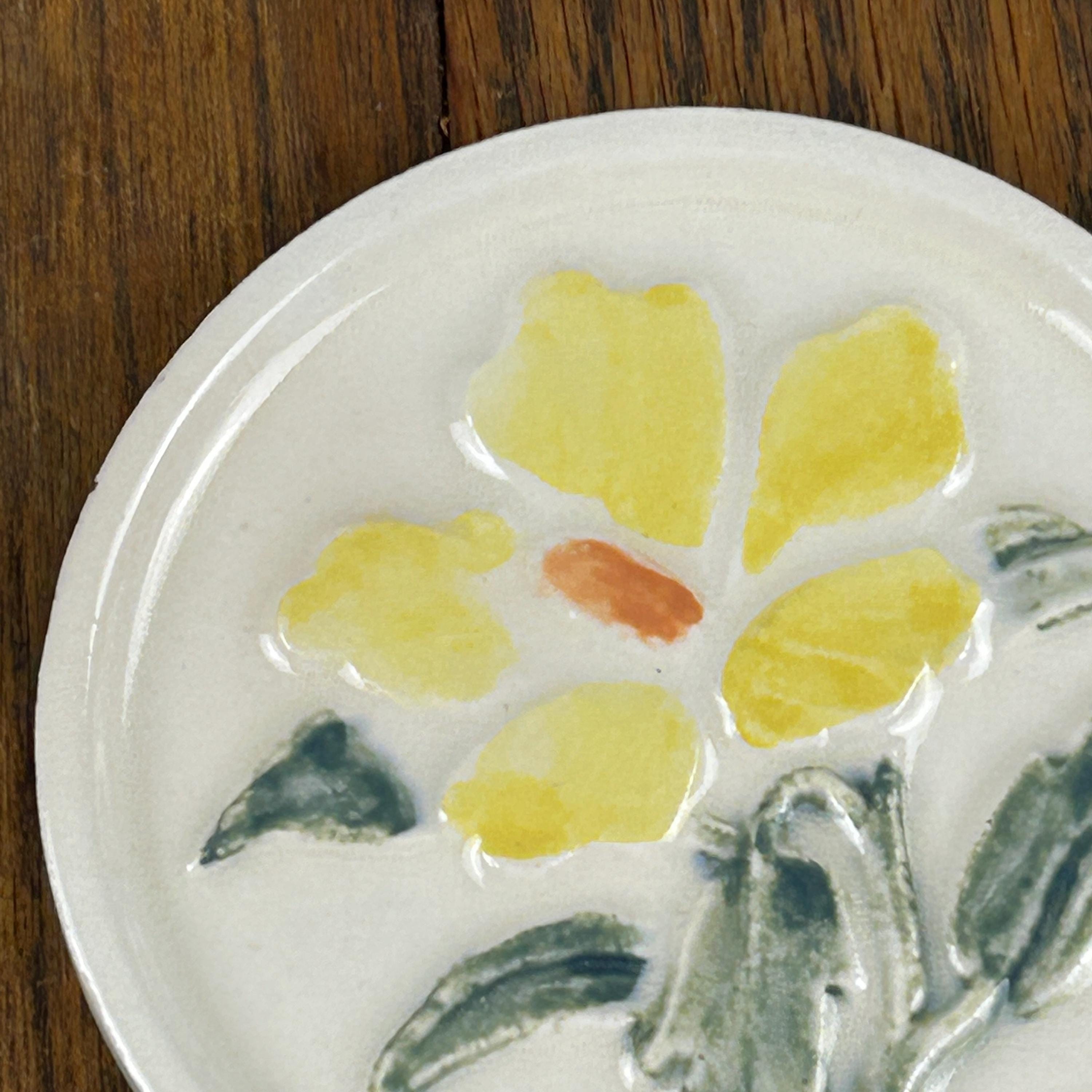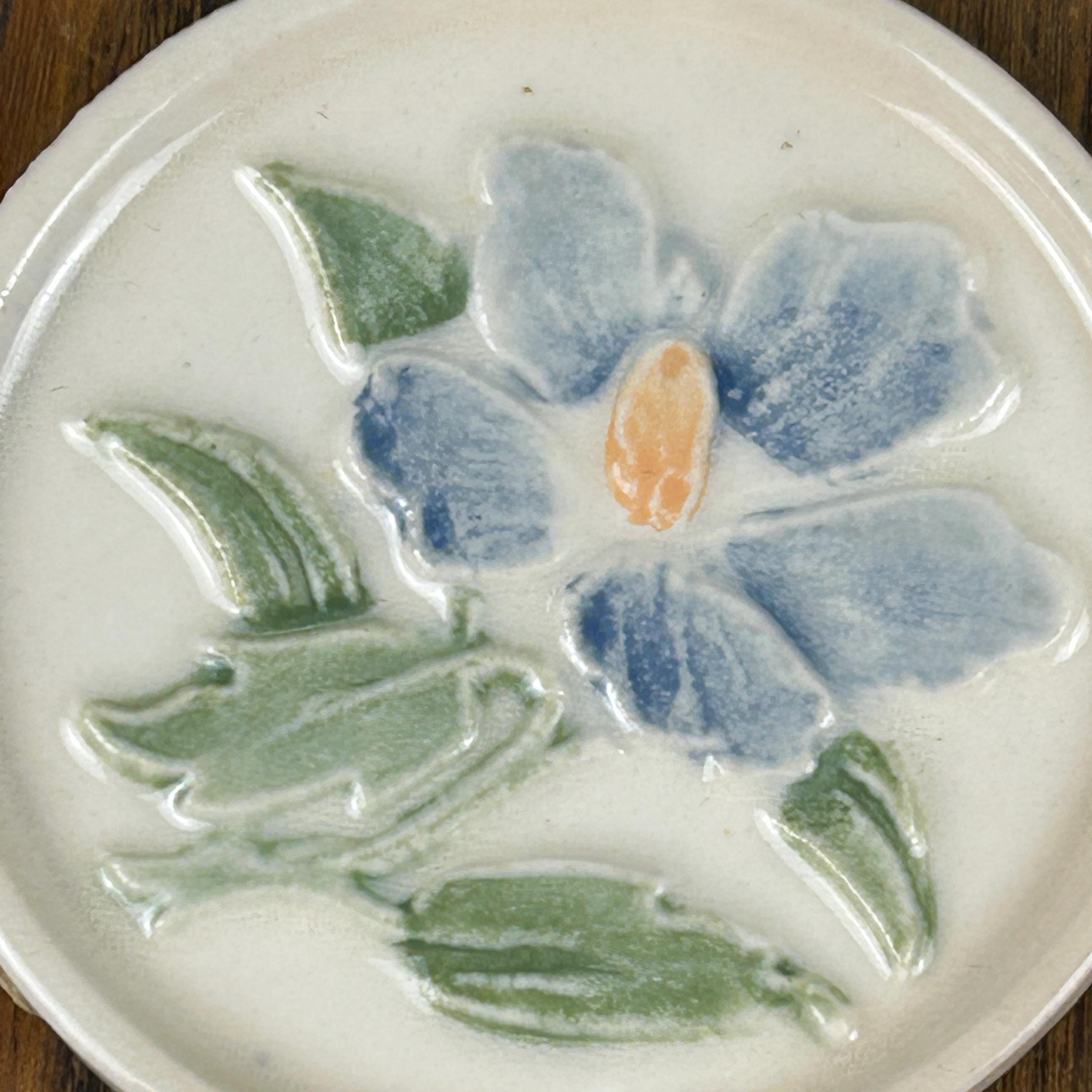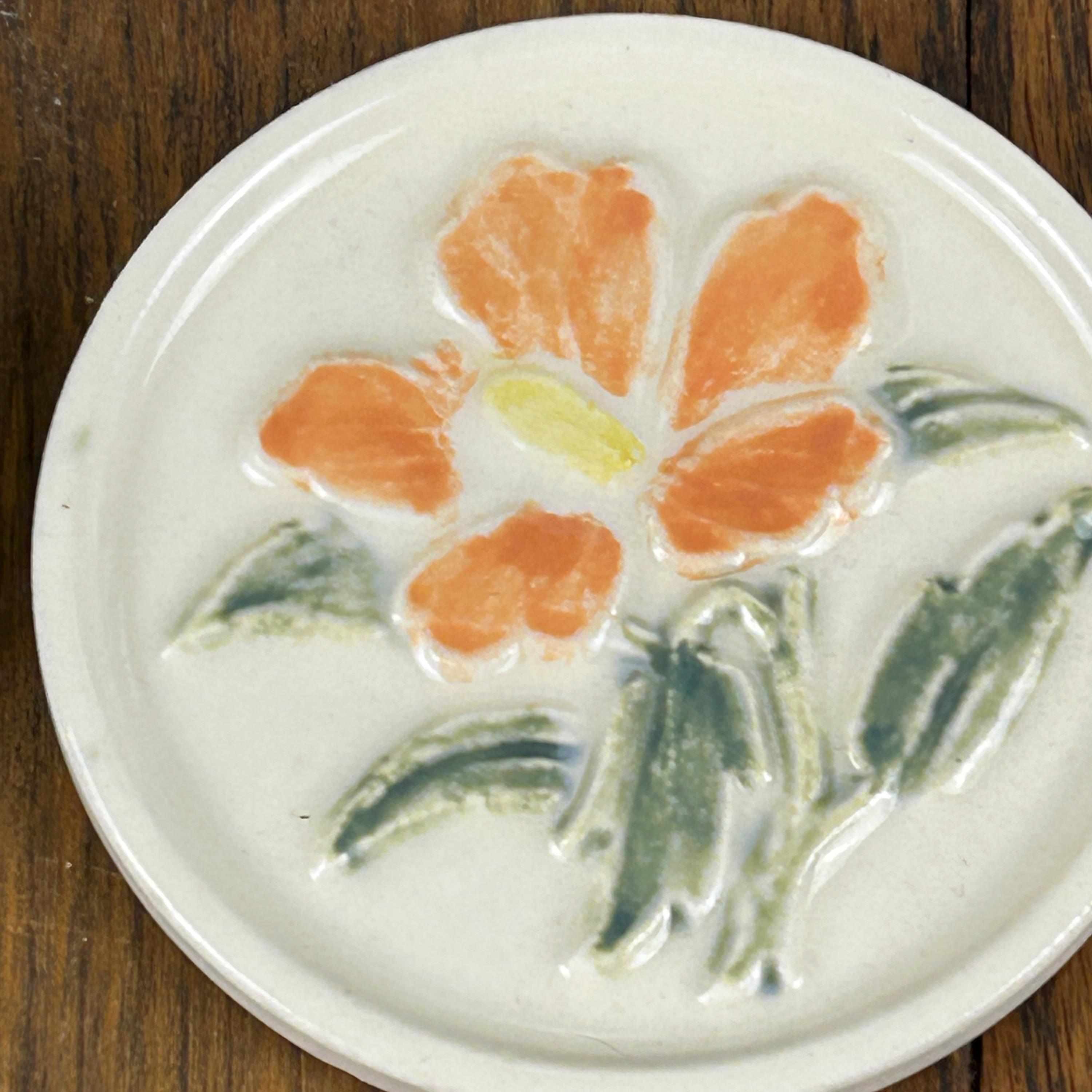 Bring bright retro charm to your space with this set of five vintage ceramic “Flower Power” drink coasters. Each coaster features a bold raised floral design in high relief, beautifully hand-painted in different colors. Made in the USA, these sturdy ceramic pieces are perfect for protecting tabletops — and they also make adorable mini wall plaques when displayed together.