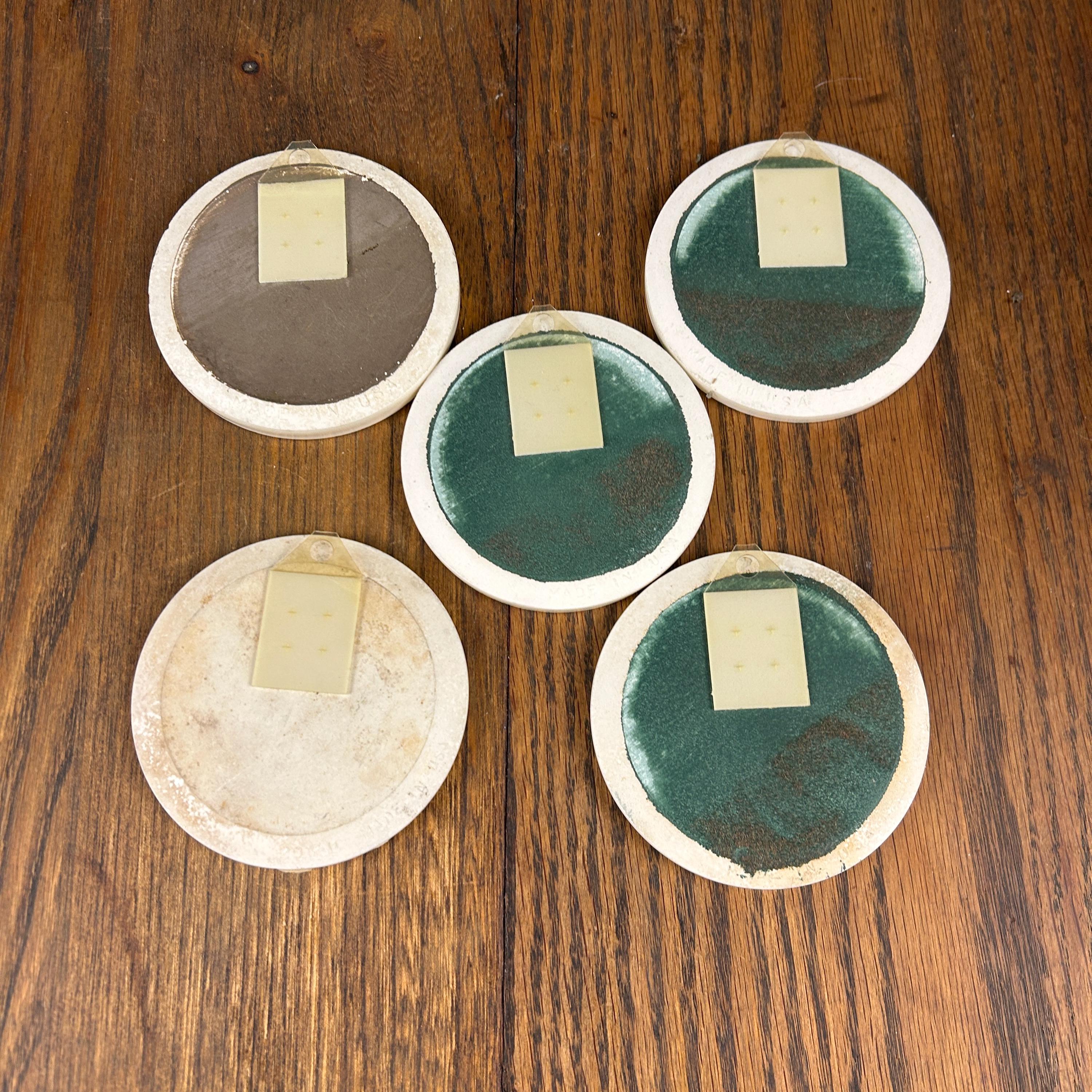 Can be used as coasters or wall decor. Backs have wall hangers for wall display.