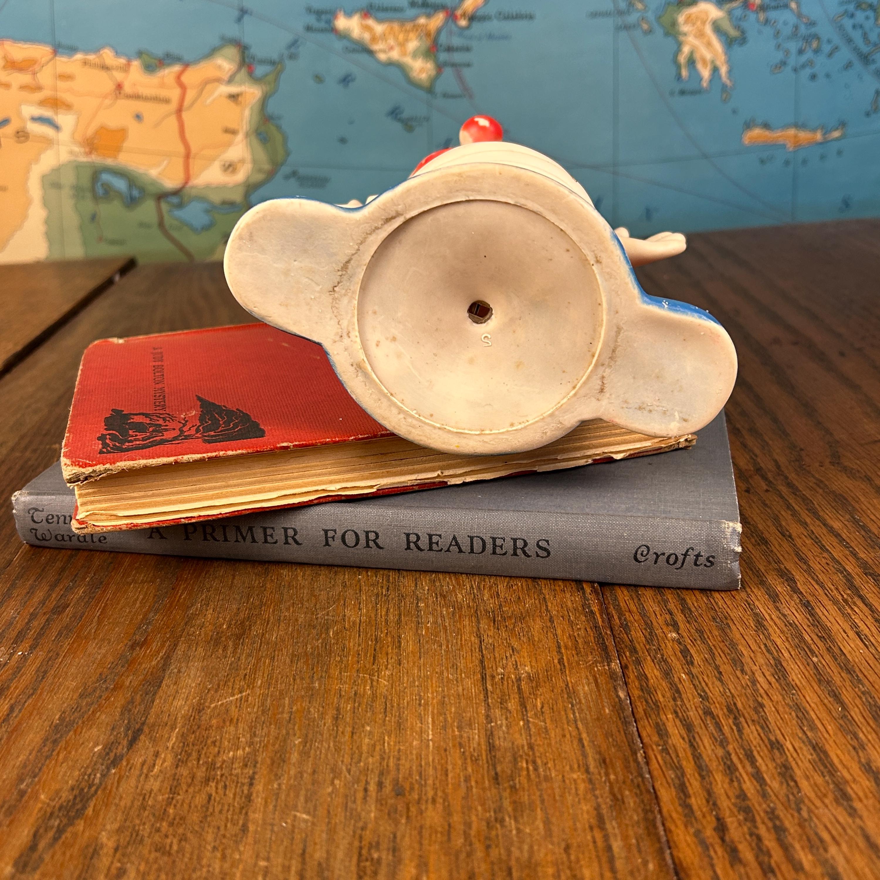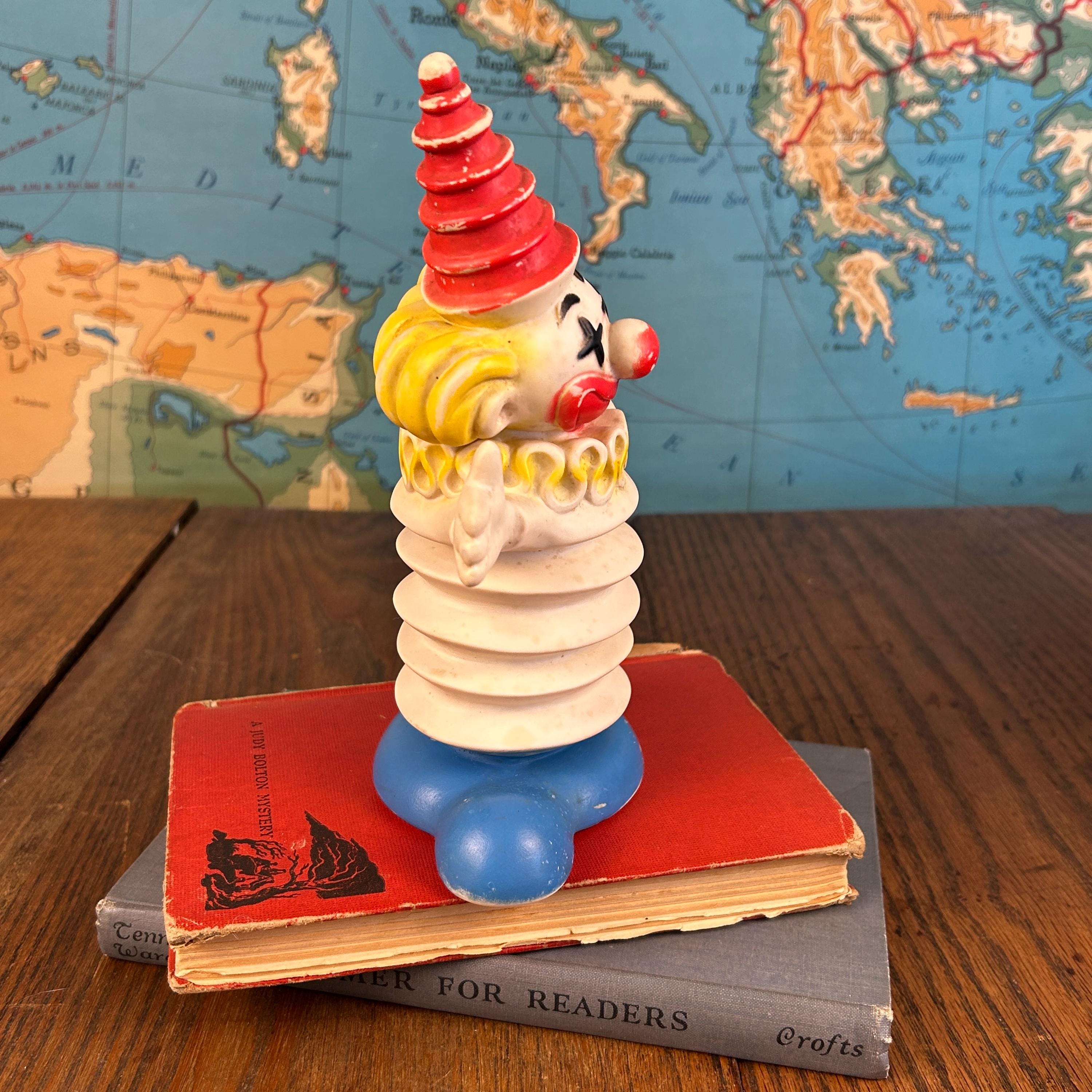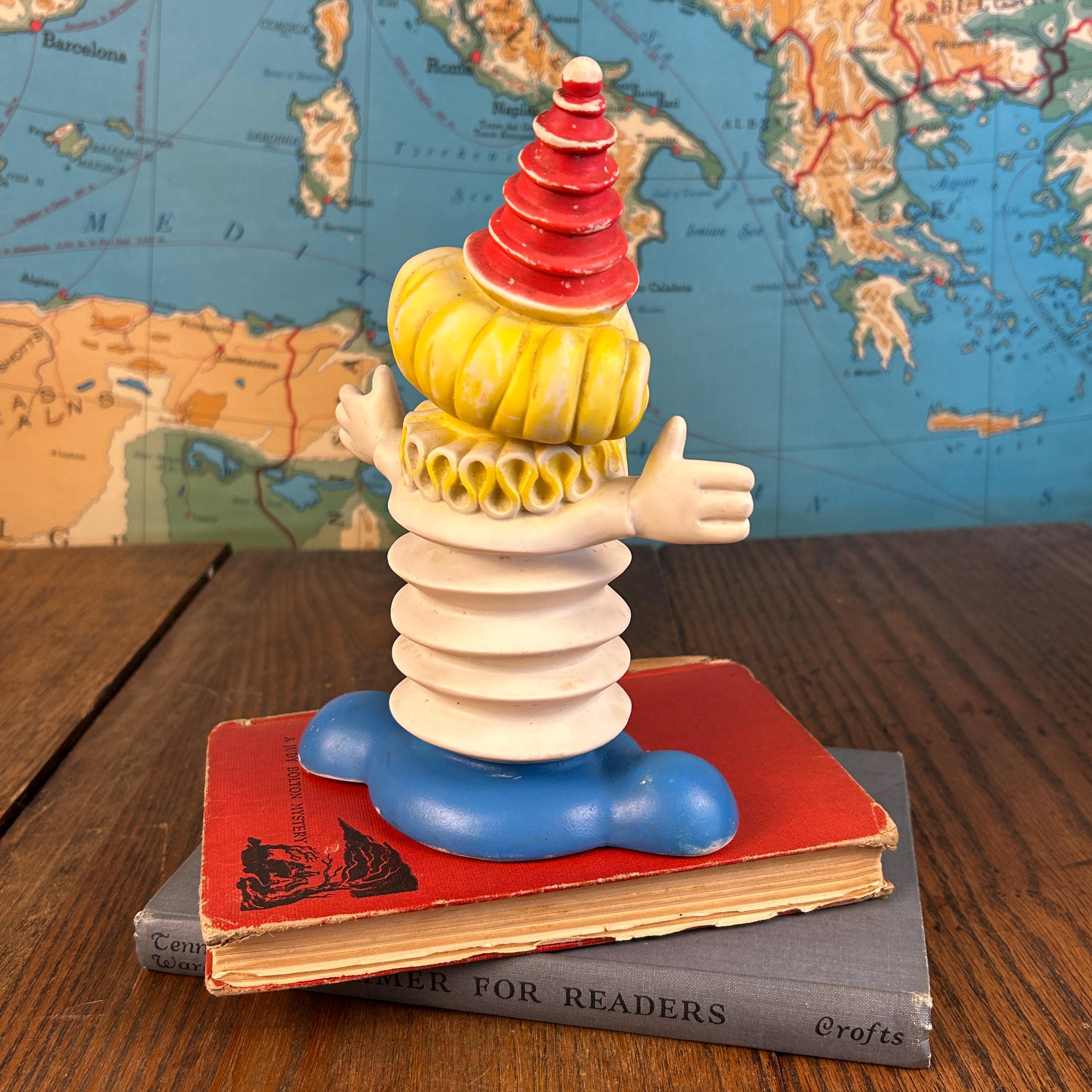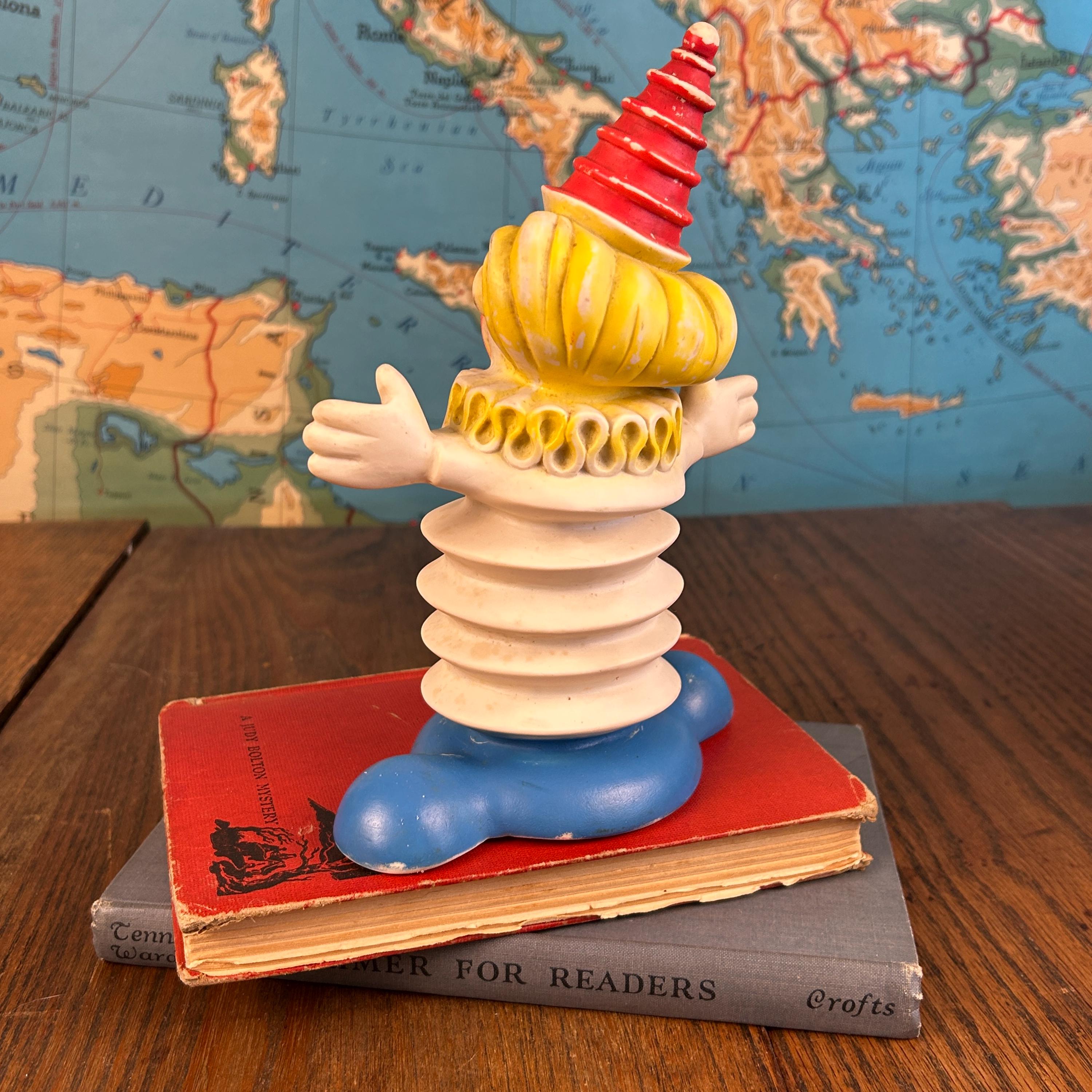 A wonderful piece for vintage toy collectors, clown memorabilia enthusiasts, or anyone who loves unique mid-century decor. Perfect for display in a retro nursery, curio shelf, or vintage collection.