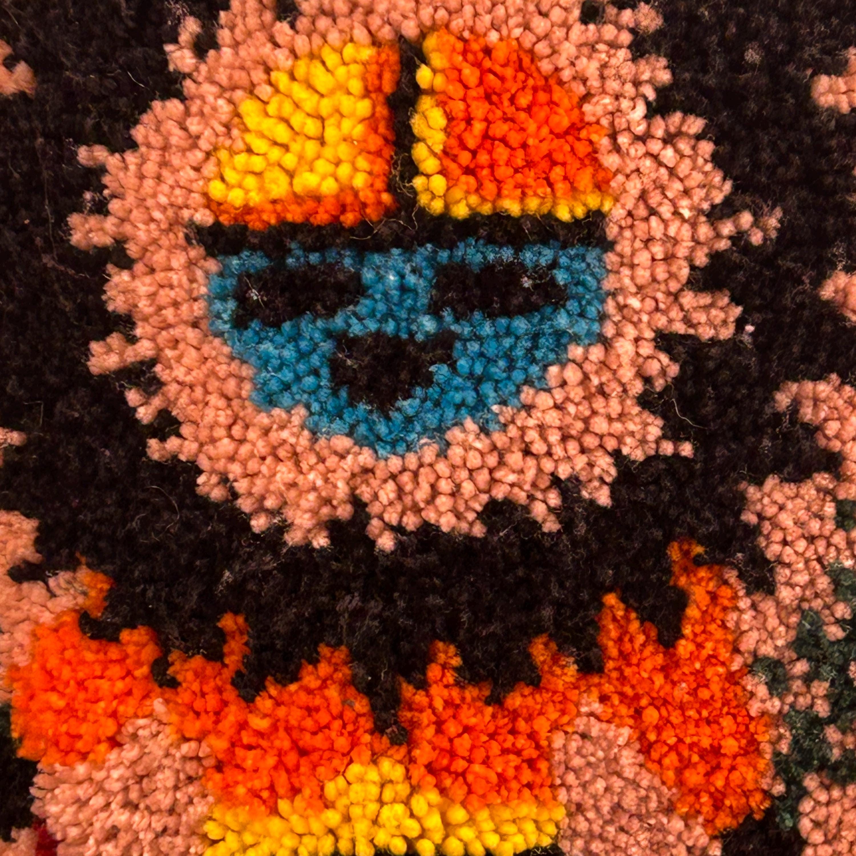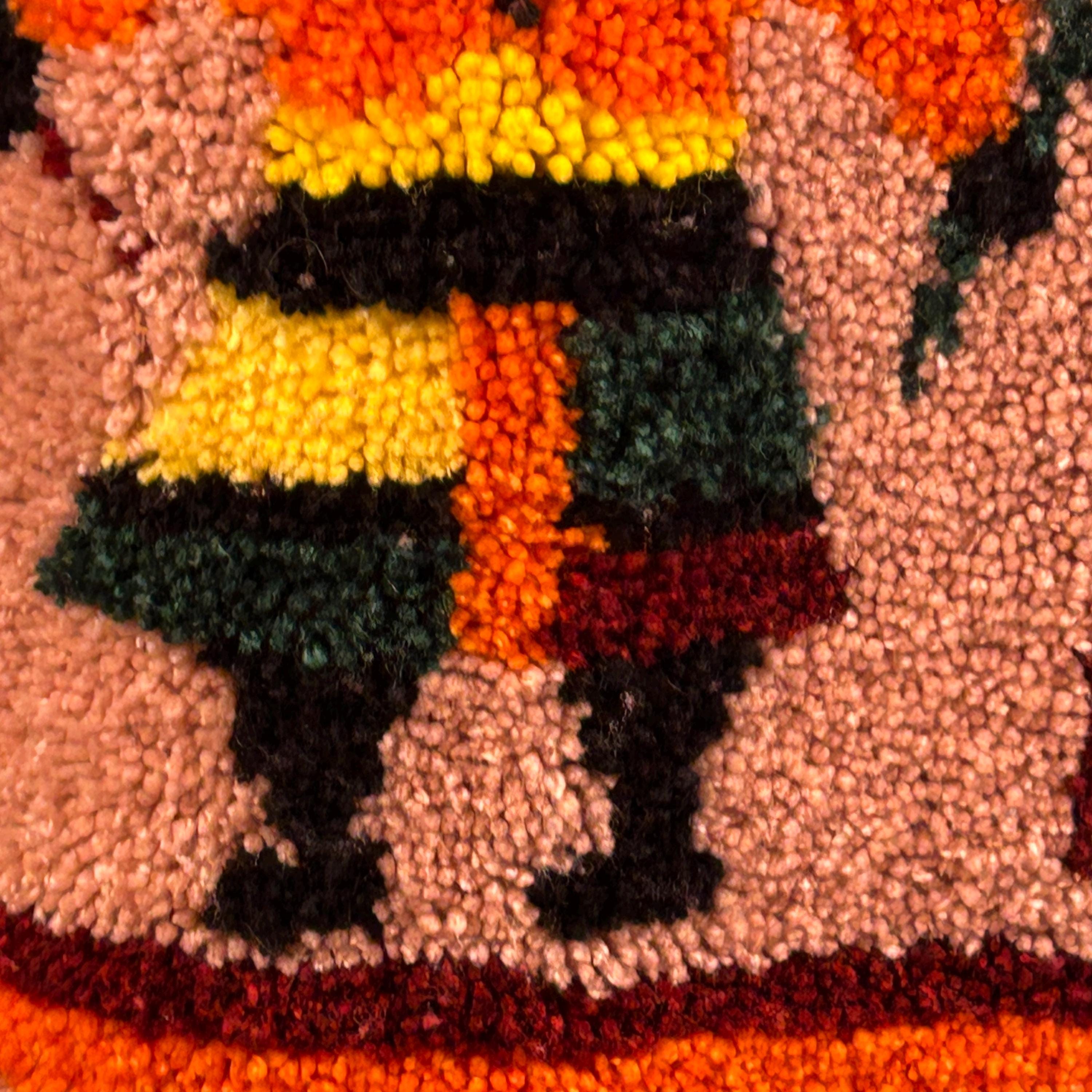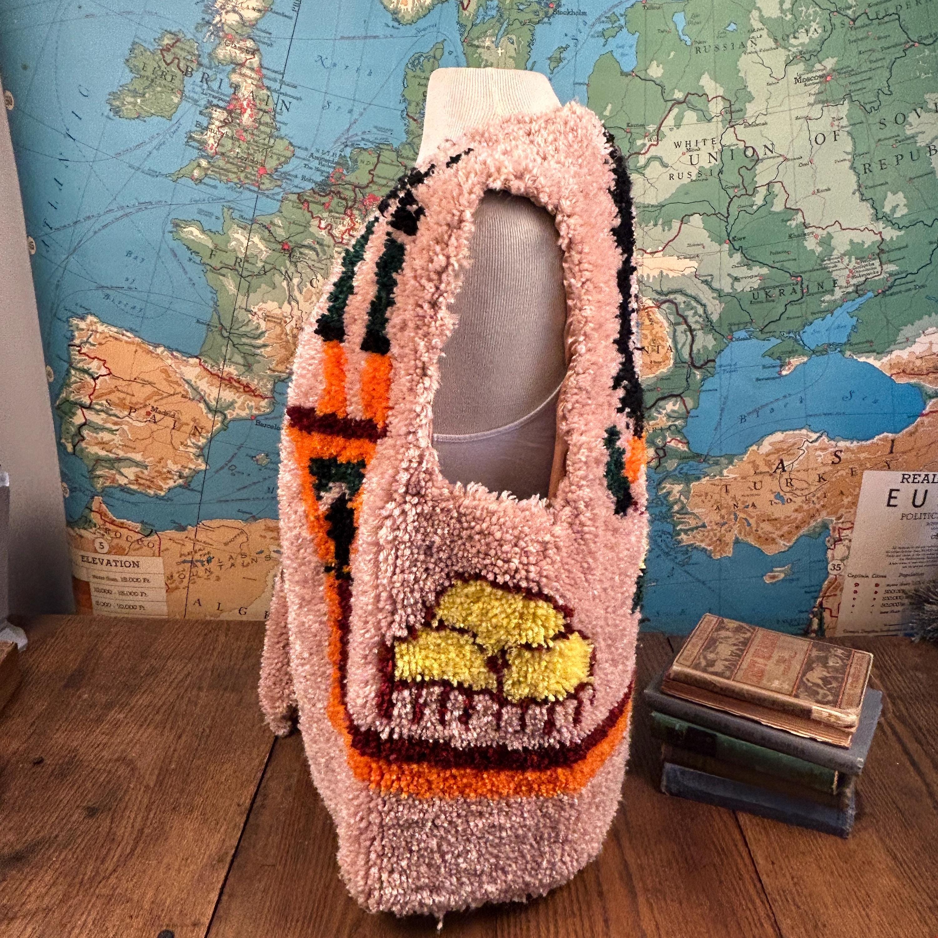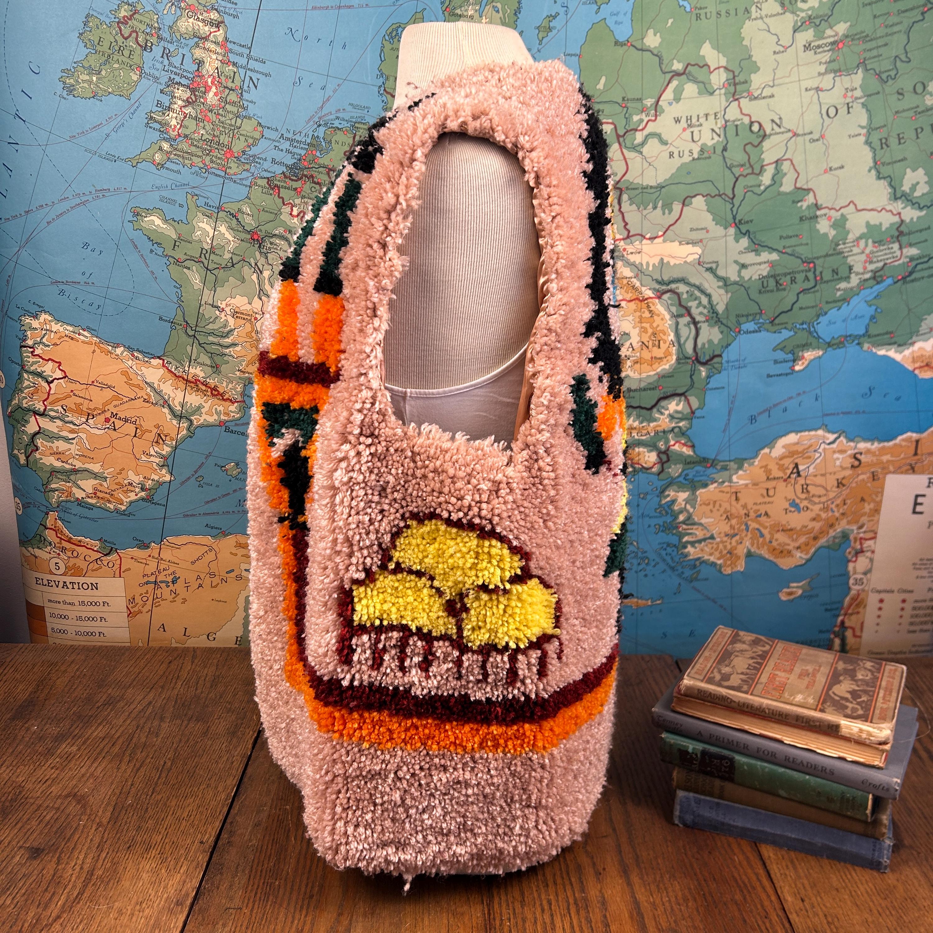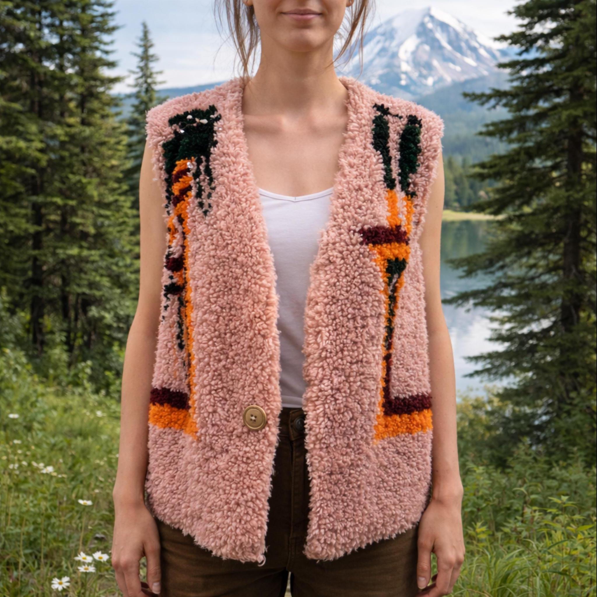 Crafted from thick yarn or wool, the vest has a richly textured, highly tactile surface with vibrant colors that make it a standout wearable art piece. The craftsmanship reflects the handmade nature of latch hook work—each loop adding depth, dimension, and character.
