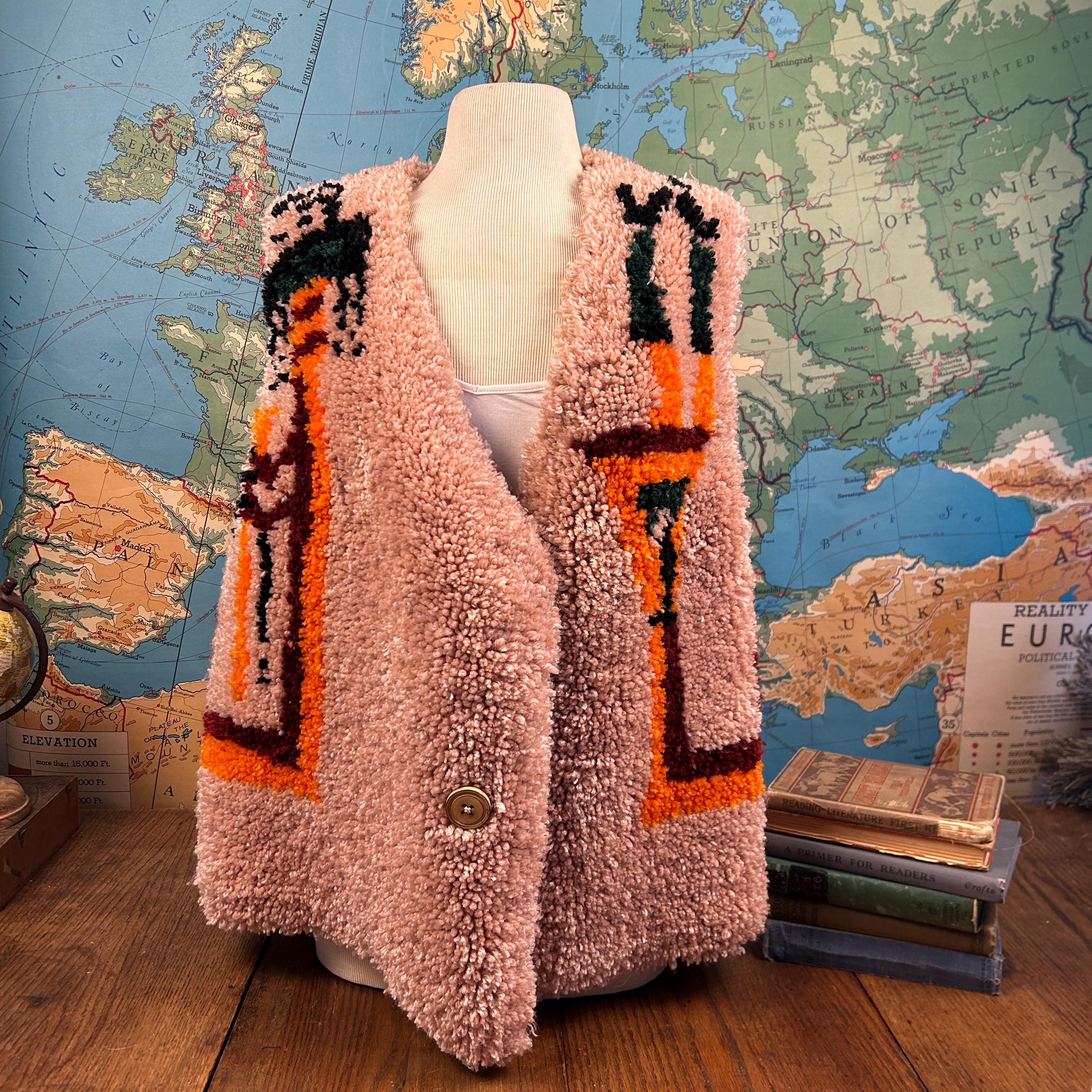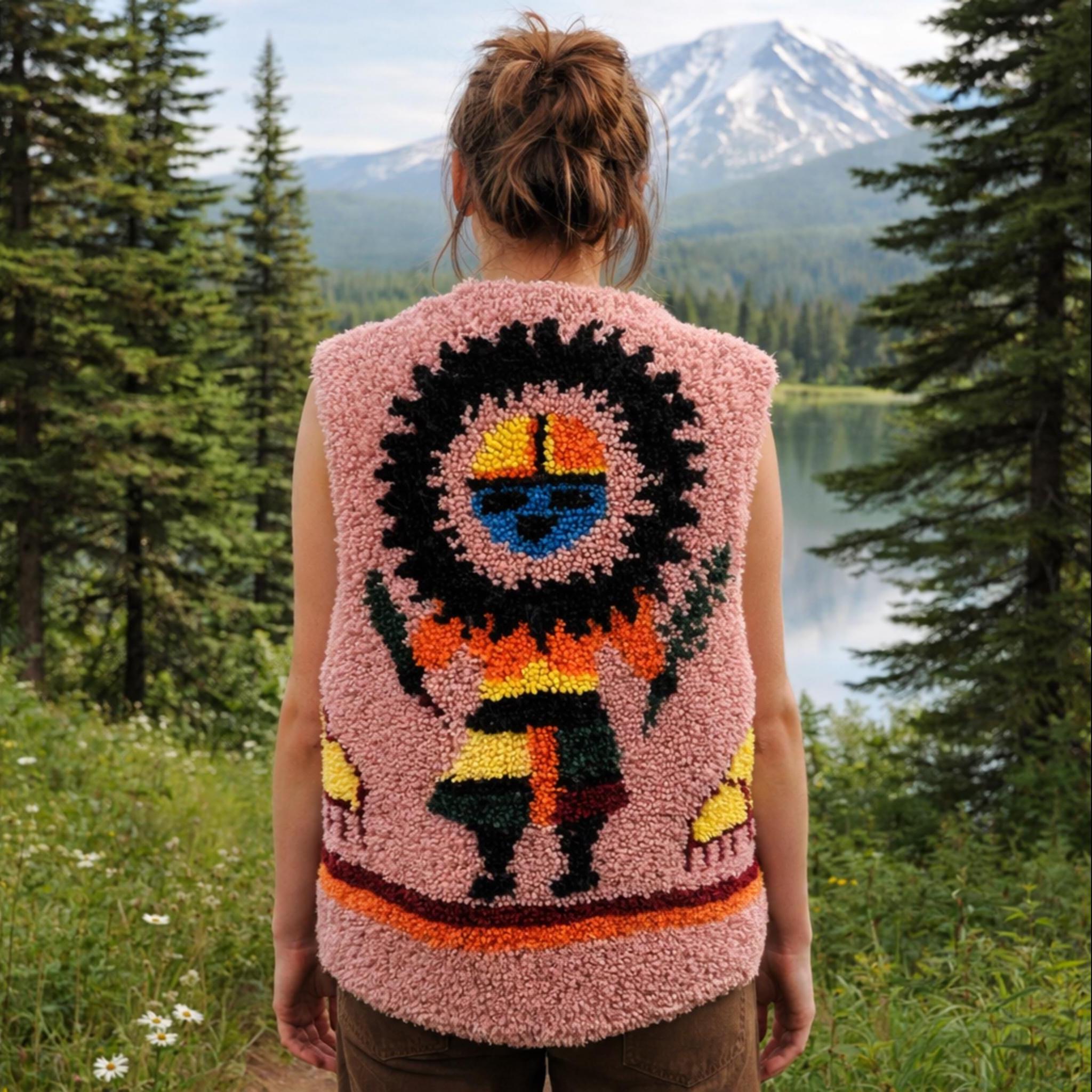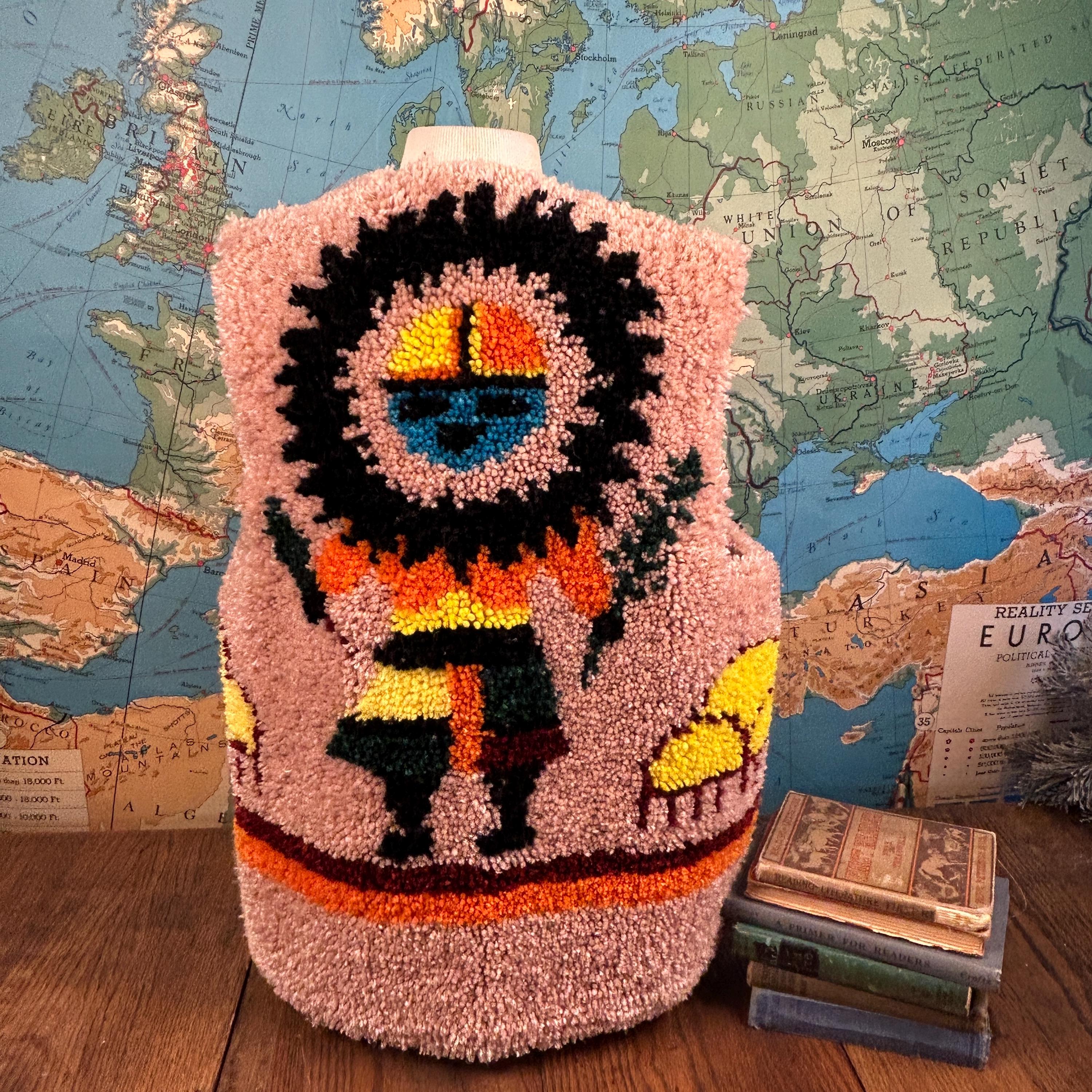 This vintage hand-hooked latch hook “rug” vest dates to approximately the 1960s–1970s and features a bold Native American–style Kachina design, depicting a Mongwa (Owl) Kachina figure. Pieces like this were often created from latch hook kits popular during the 1970s and are now highly sought after as retro folk art collectibles.