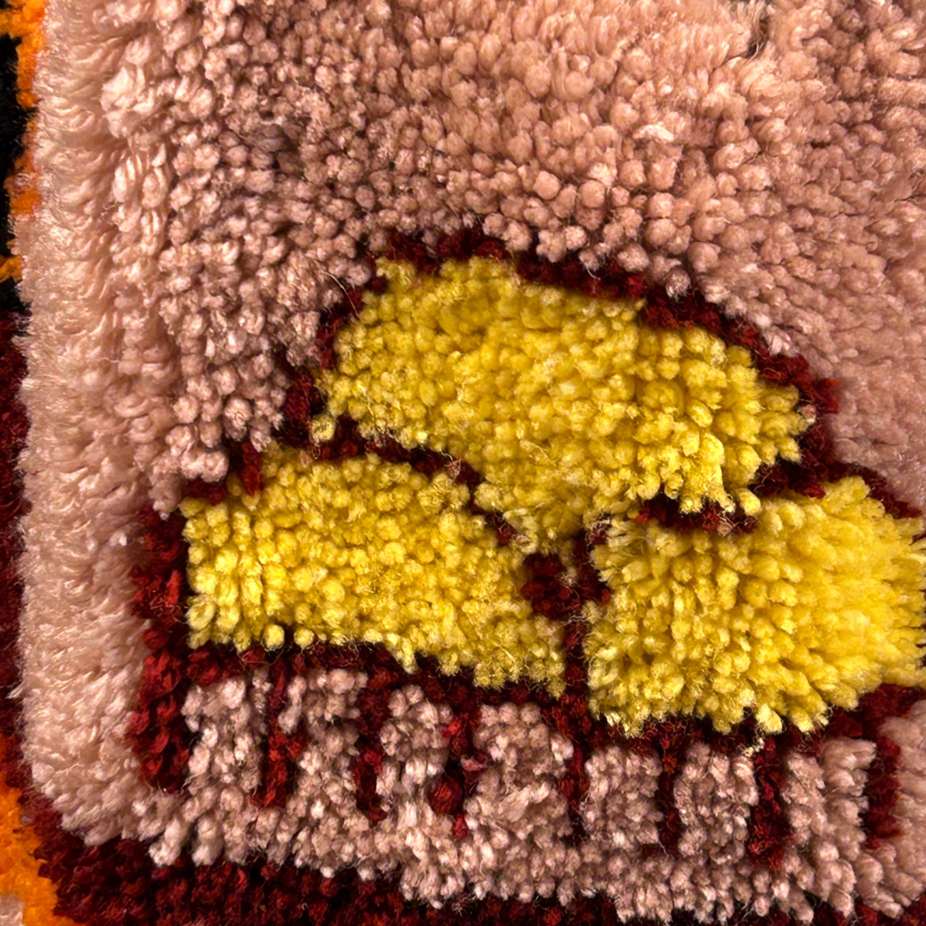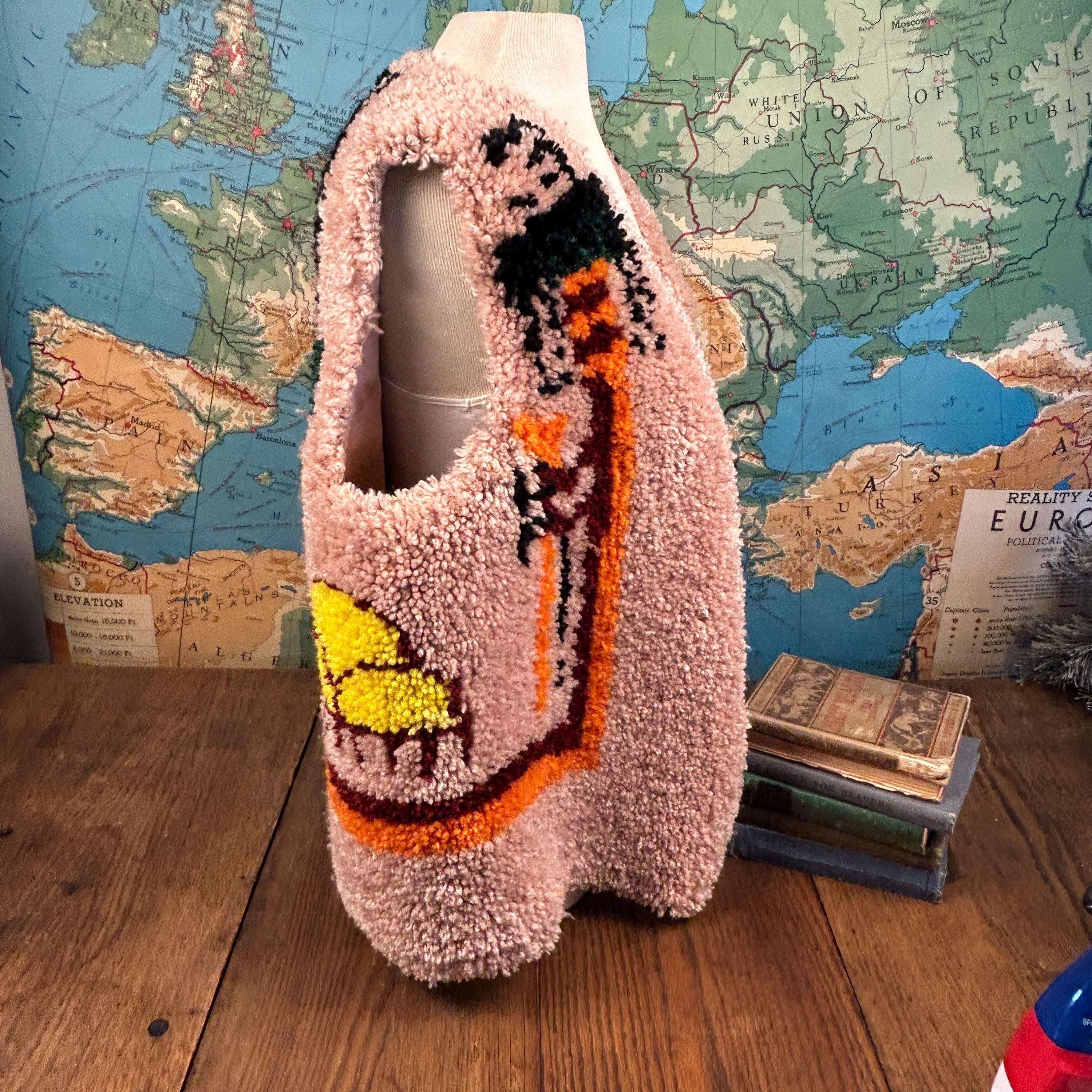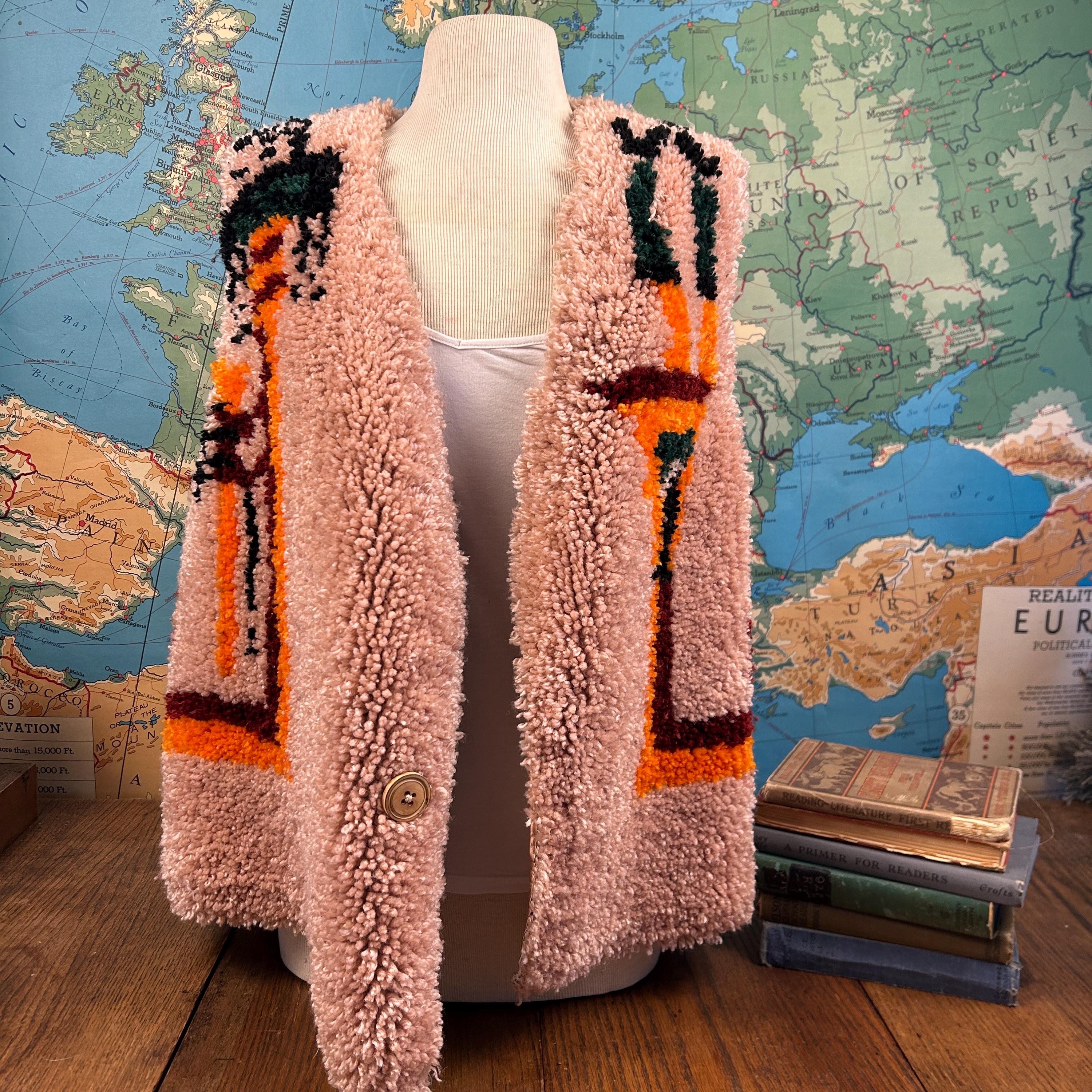 This vintage hand-hooked latch hook “rug” vest dates to approximately the 1960s–1970s and features a bold Native American–style Kachina design, depicting a Mongwa (Owl) Kachina figure. Pieces like this were often created from latch hook kits popular during the 1970s and are now highly sought after as retro folk art collectibles.