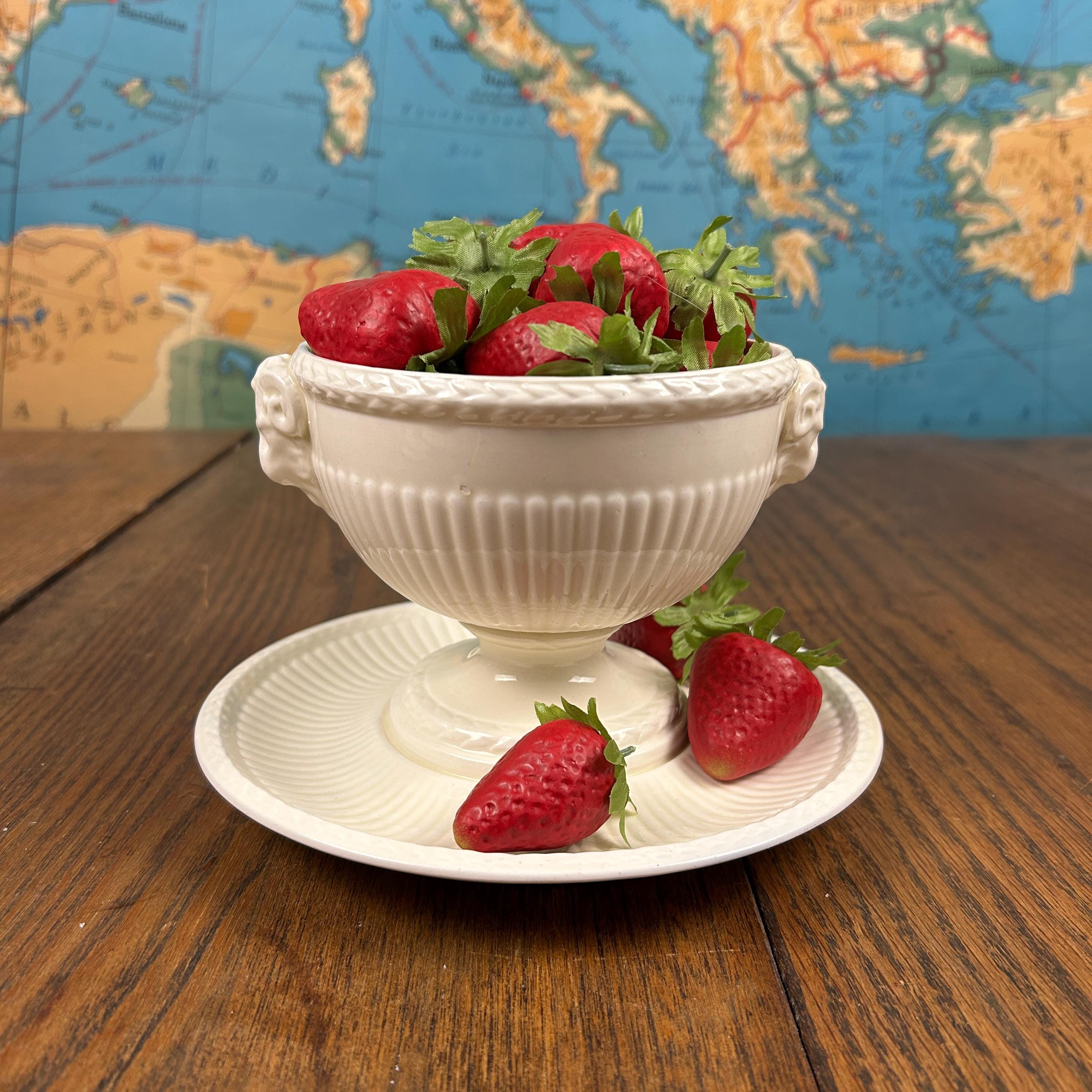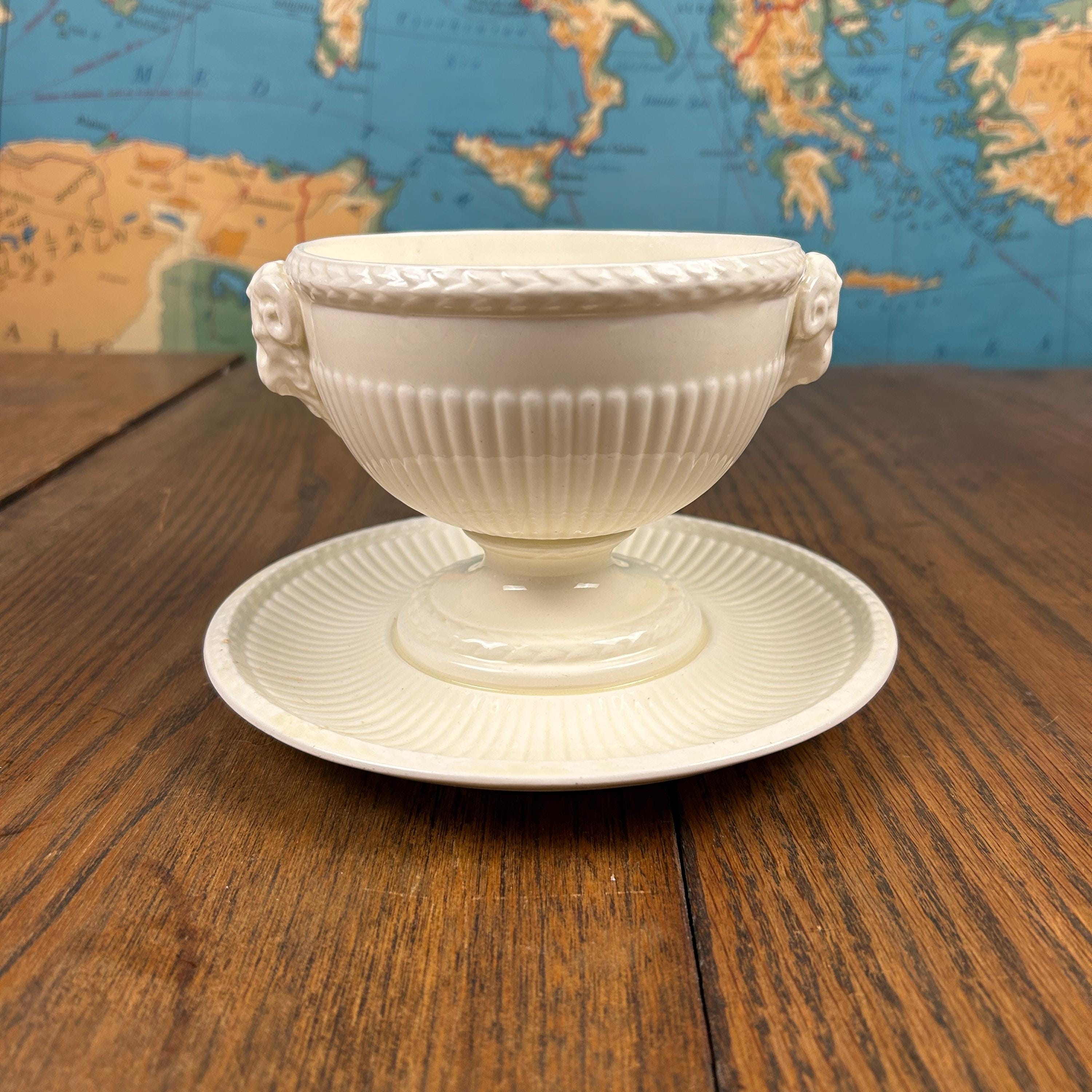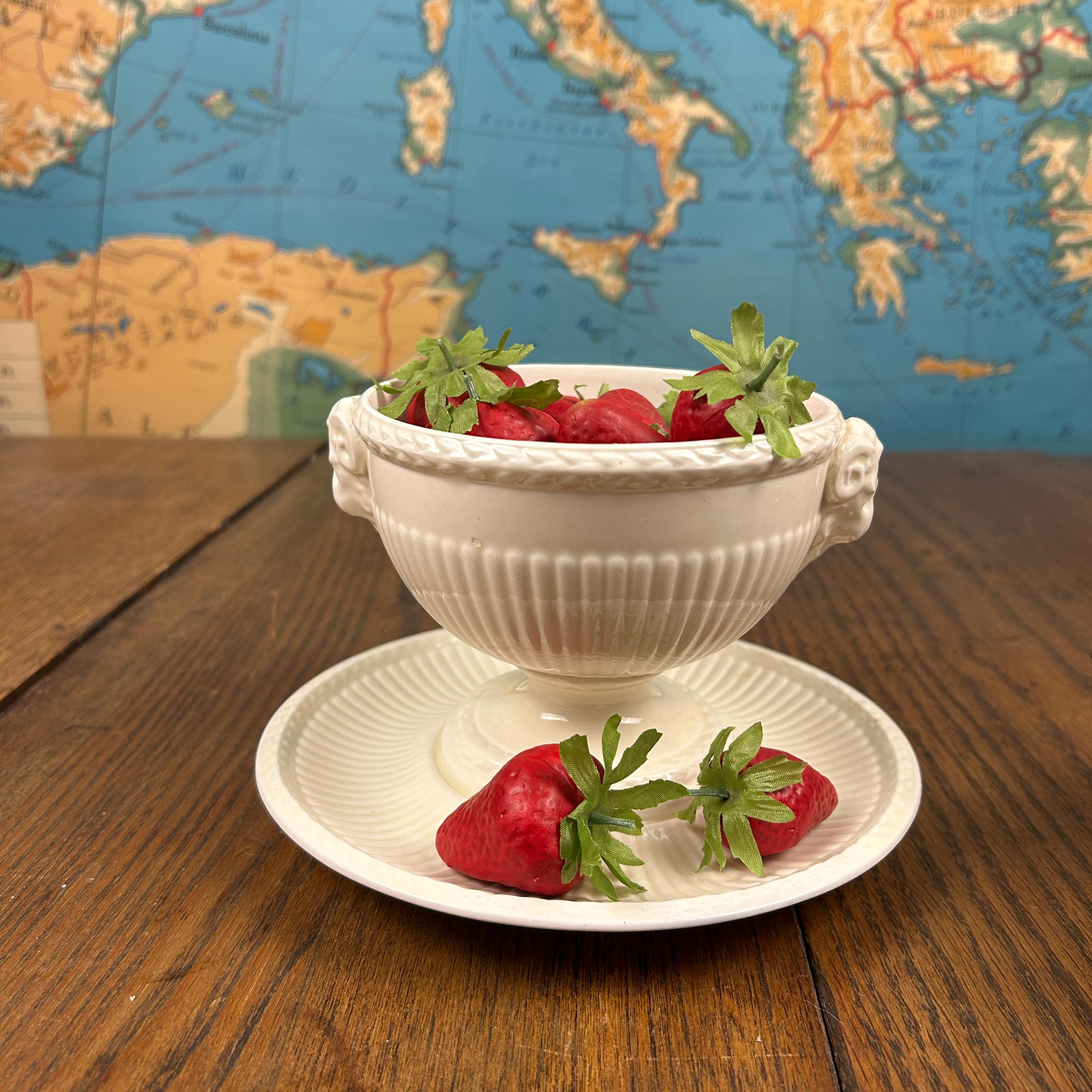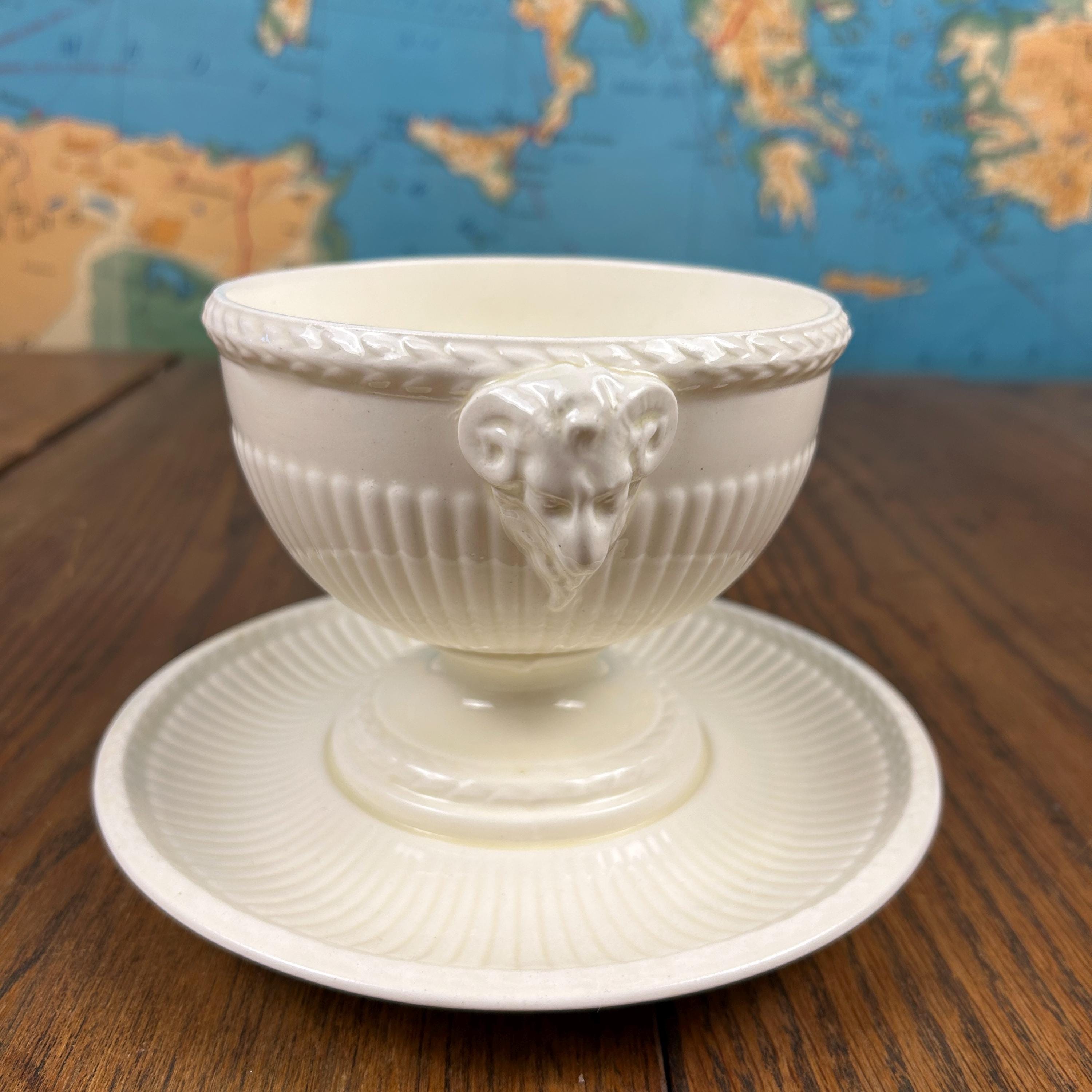 The bowl features graceful ram’s head handles, fluted detailing, and a pedestal base, lending it a sculptural presence that works beautifully both at the table and on display. Designed by John Goodwin, Wedgwood’s former art director, the Edme pattern is known for its neoclassical influence and enduring appeal.