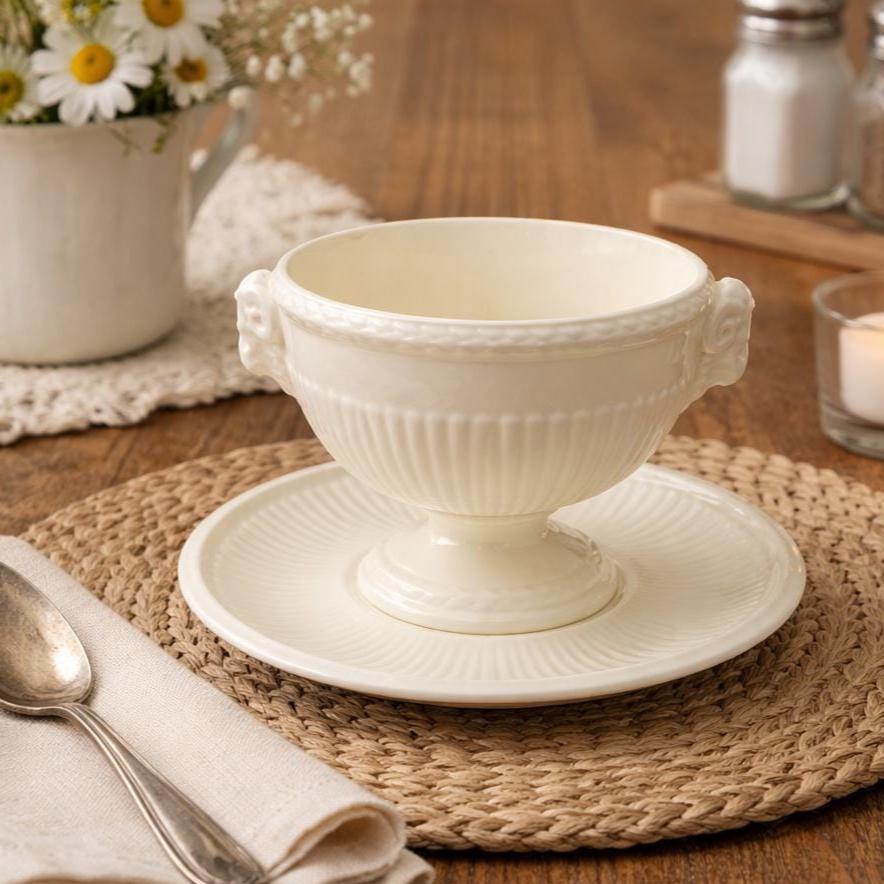 This elegant Wedgwood Edme large footed serving bowl is a timeless example of classic English tableware design. Crafted from cream-colored earthenware (creamware)—a material developed by Josiah Wedgwood in the mid-18th century—this piece showcases the refined simplicity that has made Edme a beloved pattern for generations.