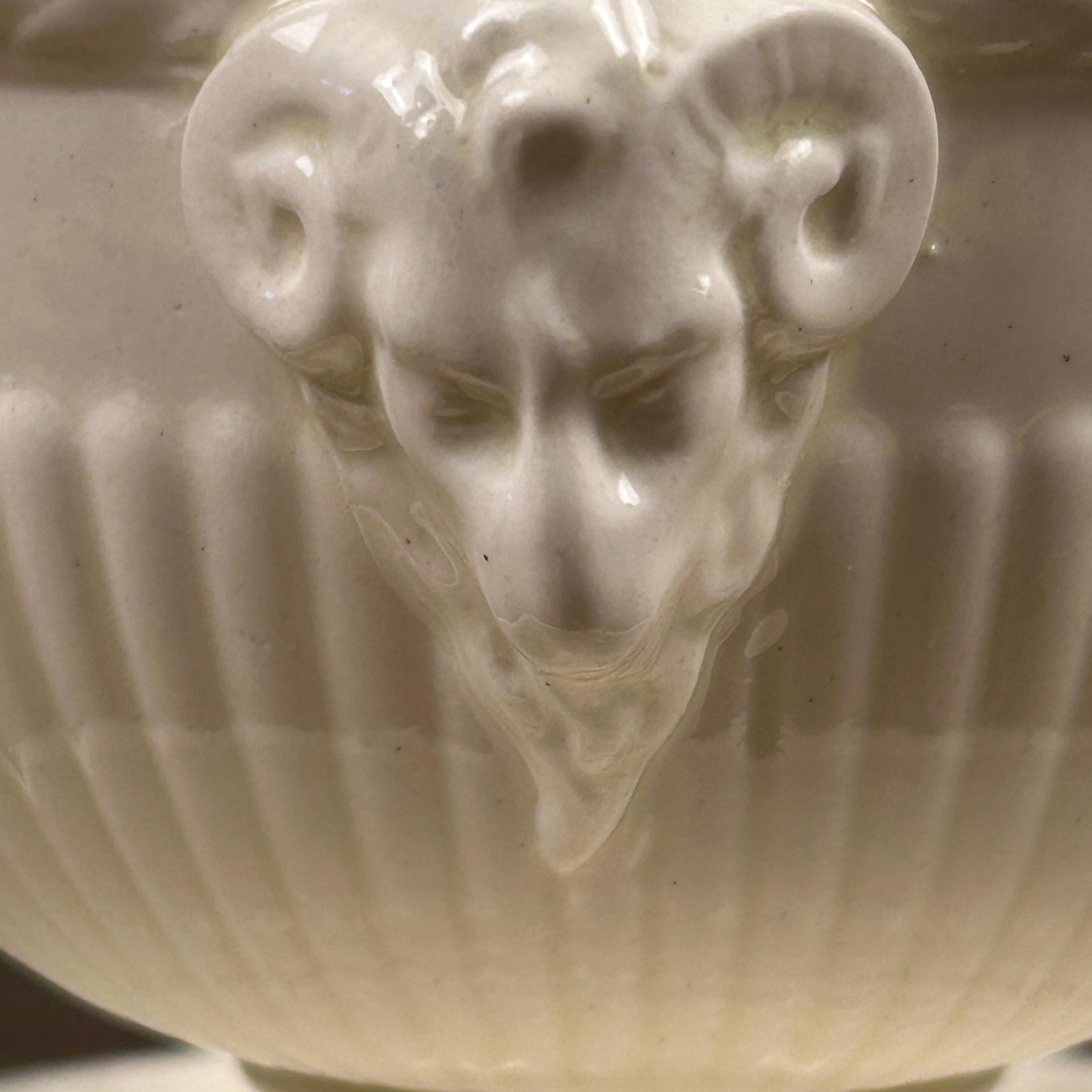 Features: Ram’s head handles, fluted body, pedestal base