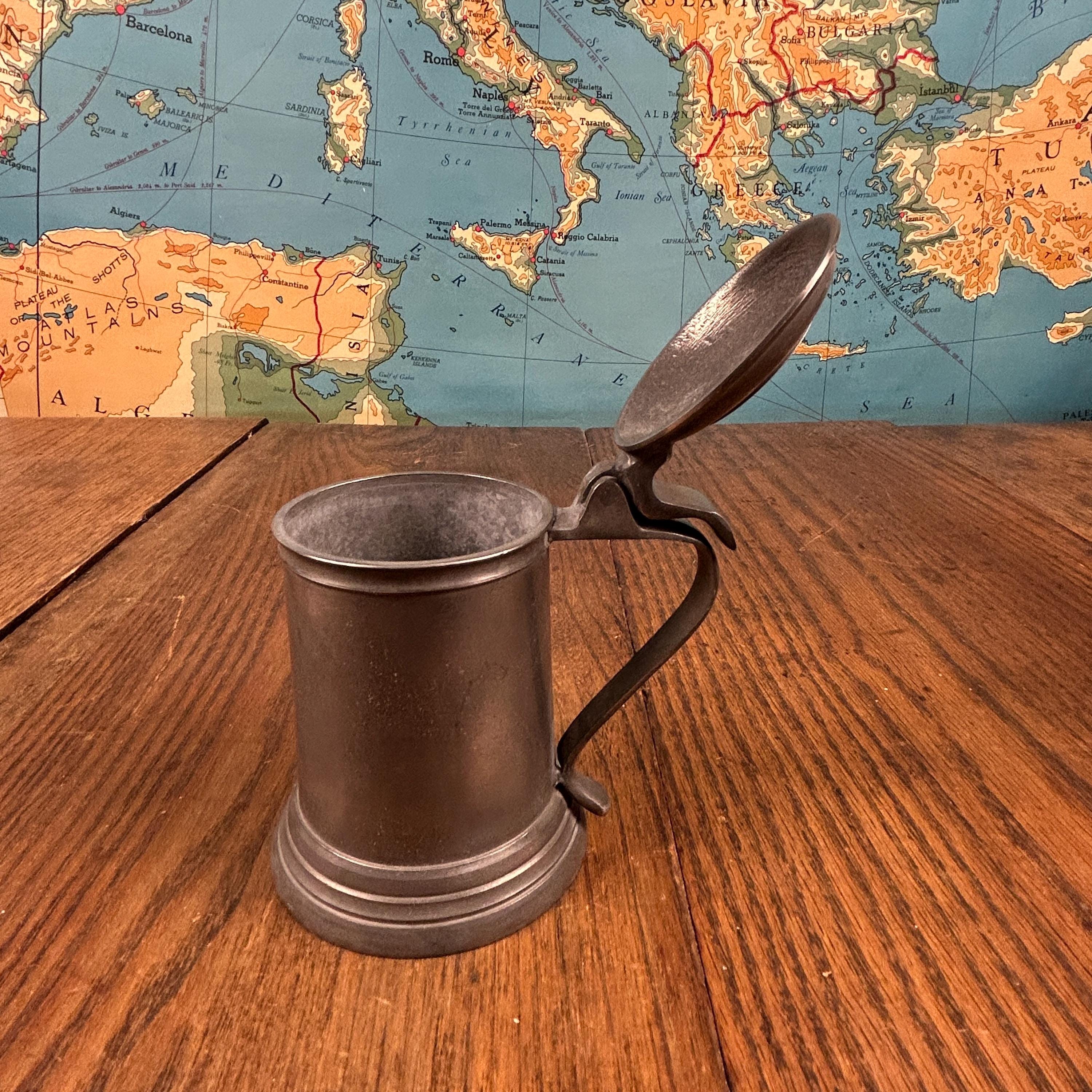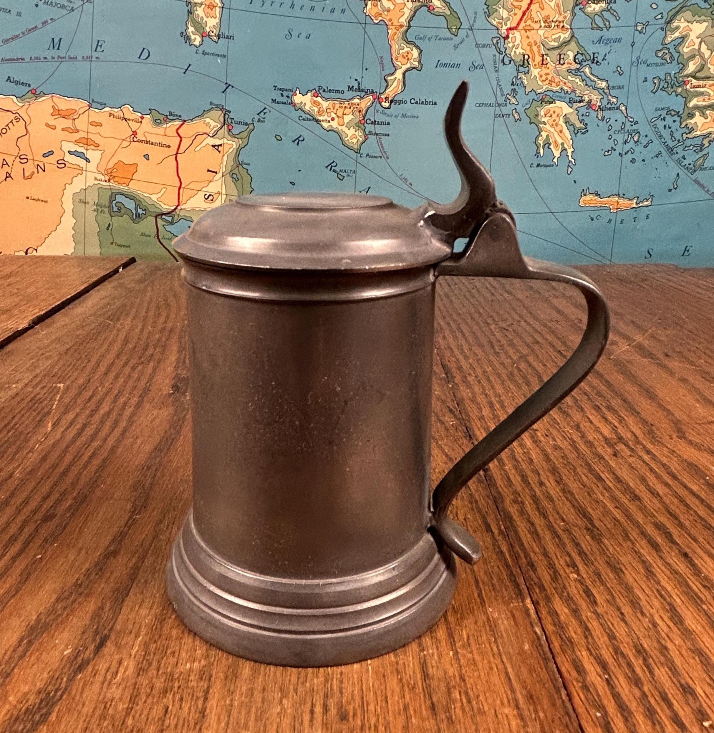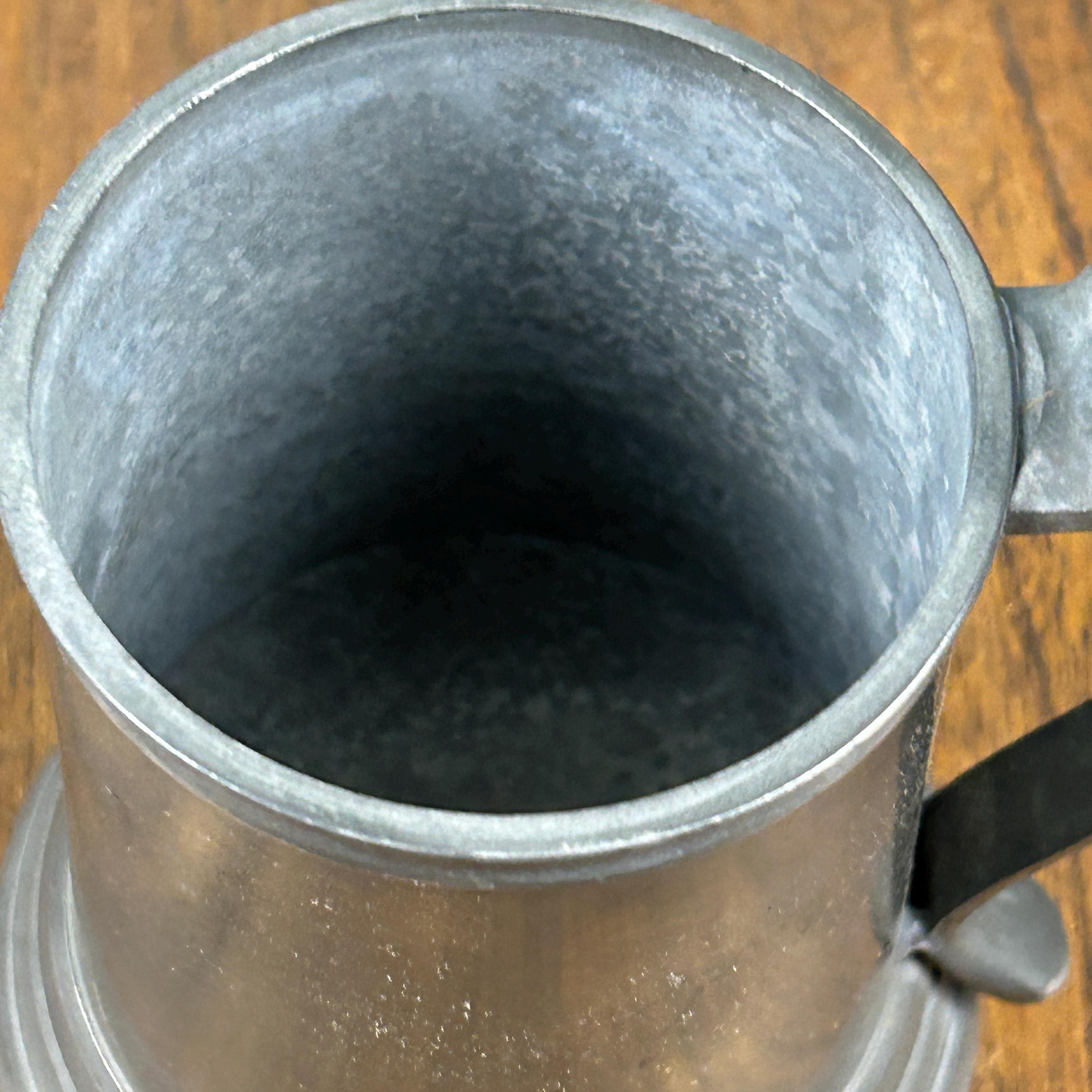 This antique pewter tankard is a wonderful example of traditional European-style drinkware, featuring a classic hinged lid and sturdy handle. Crafted from pewter—an alloy primarily of tin—this piece displays the soft, aged patina and muted matte finish that collectors appreciate in authentic antique pewterware.