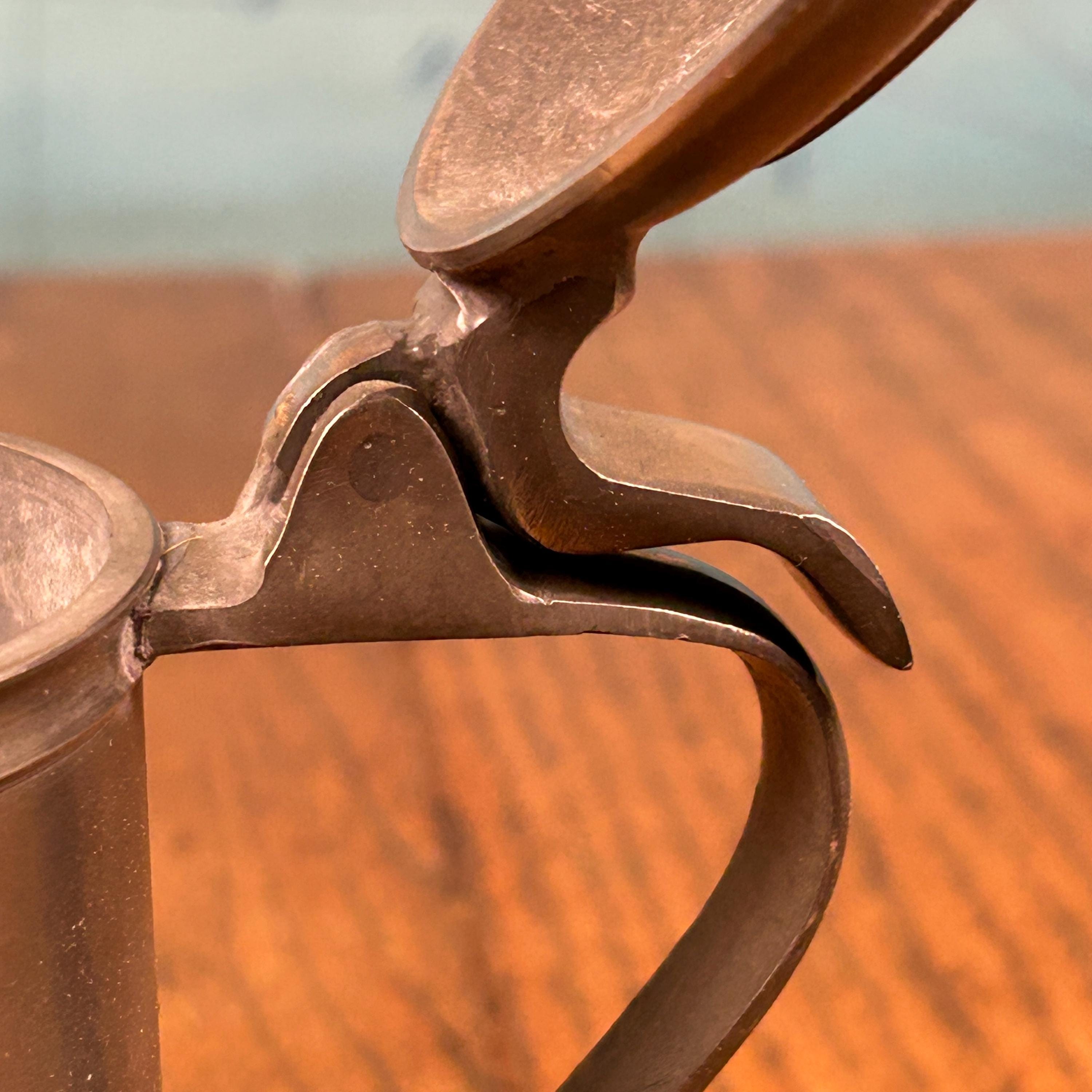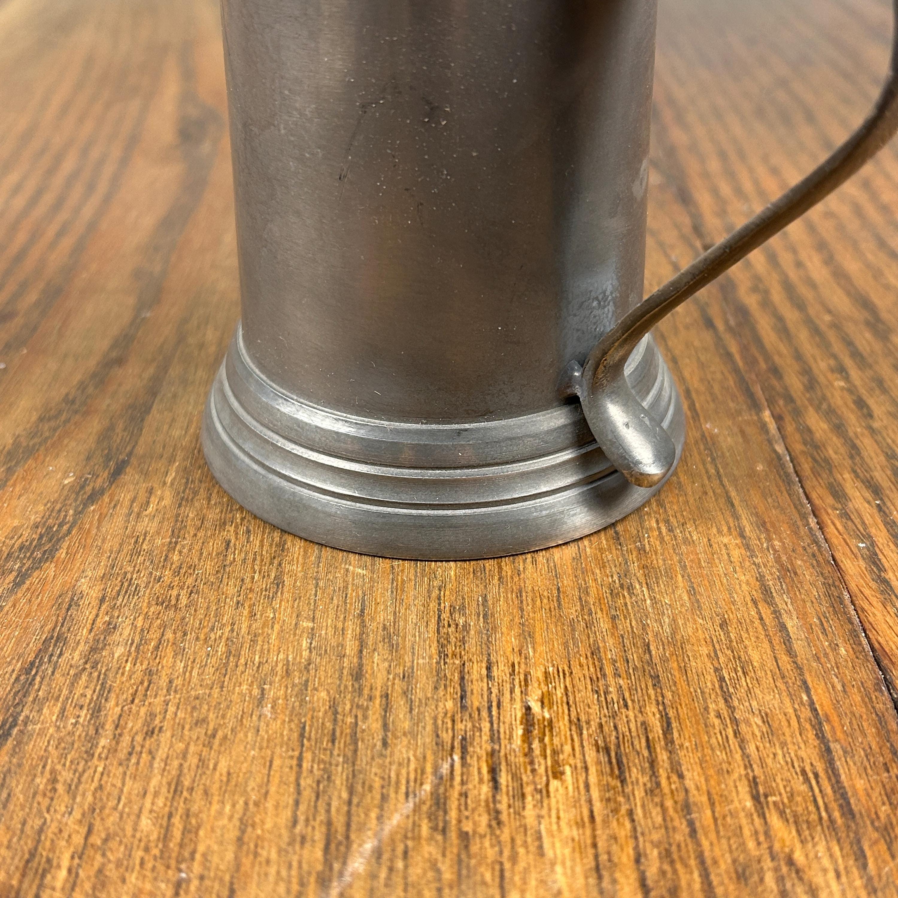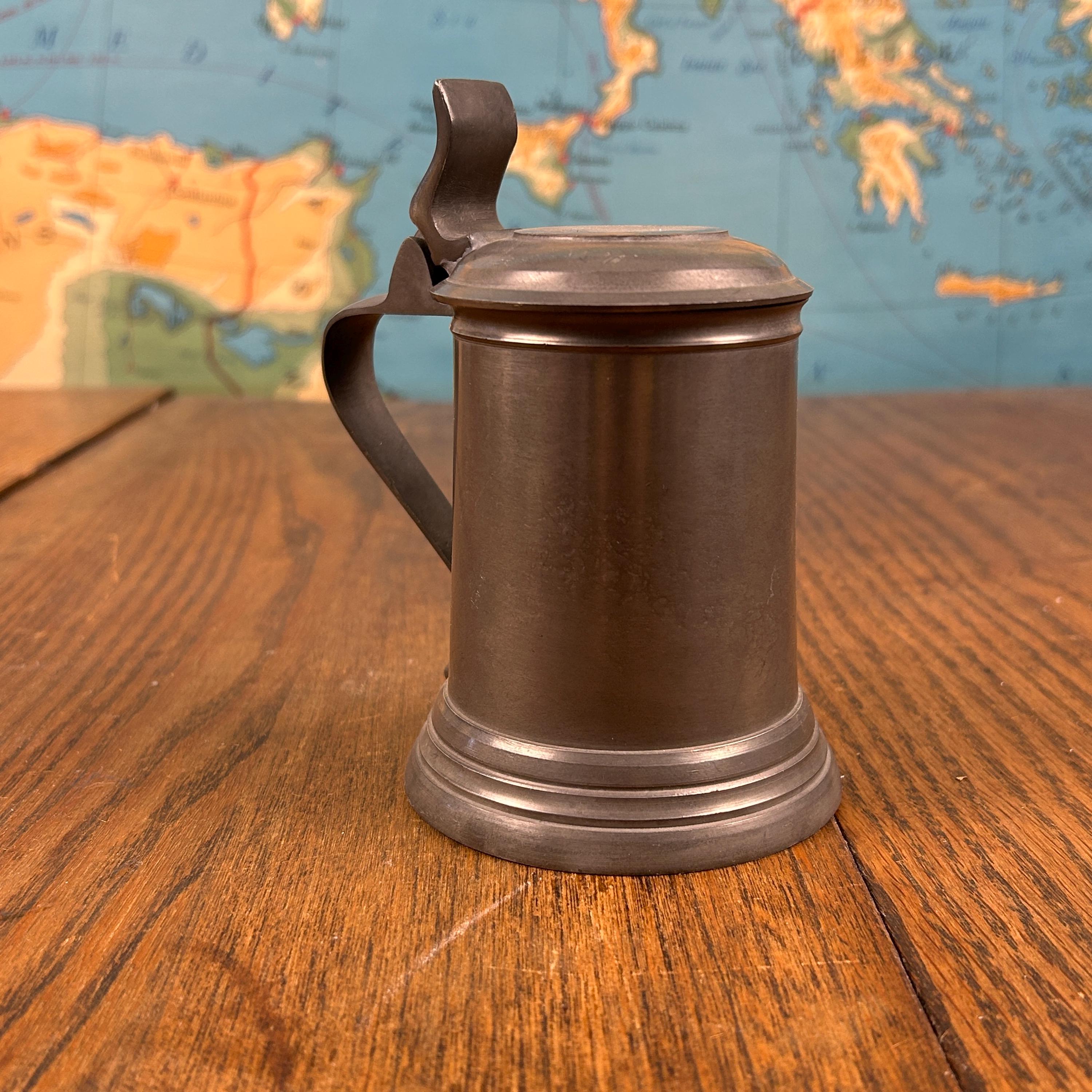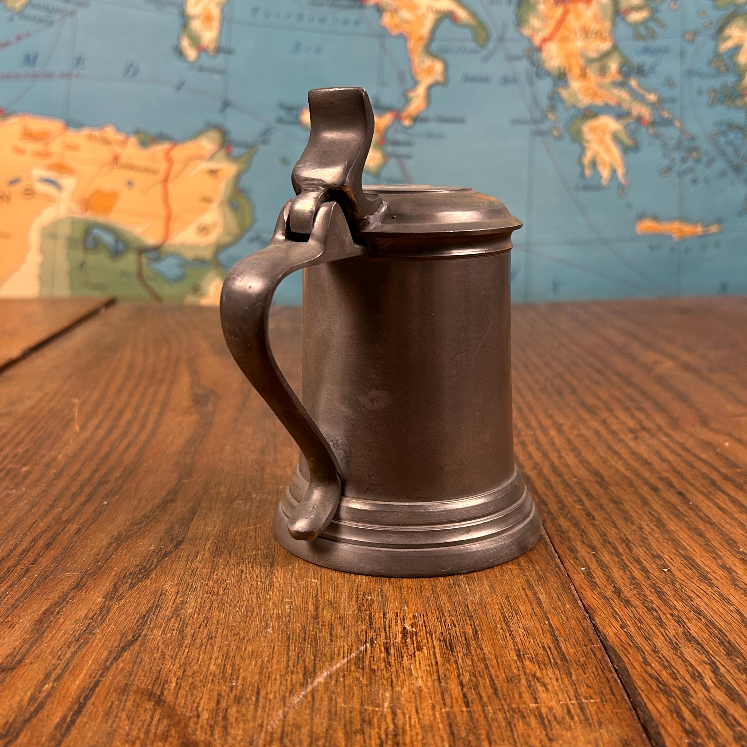 This antique pewter tankard is a wonderful example of traditional European-style drinkware, featuring a classic hinged lid and sturdy handle. Crafted from pewter—an alloy primarily of tin—this piece displays the soft, aged patina and muted matte finish that collectors appreciate in authentic antique pewterware.