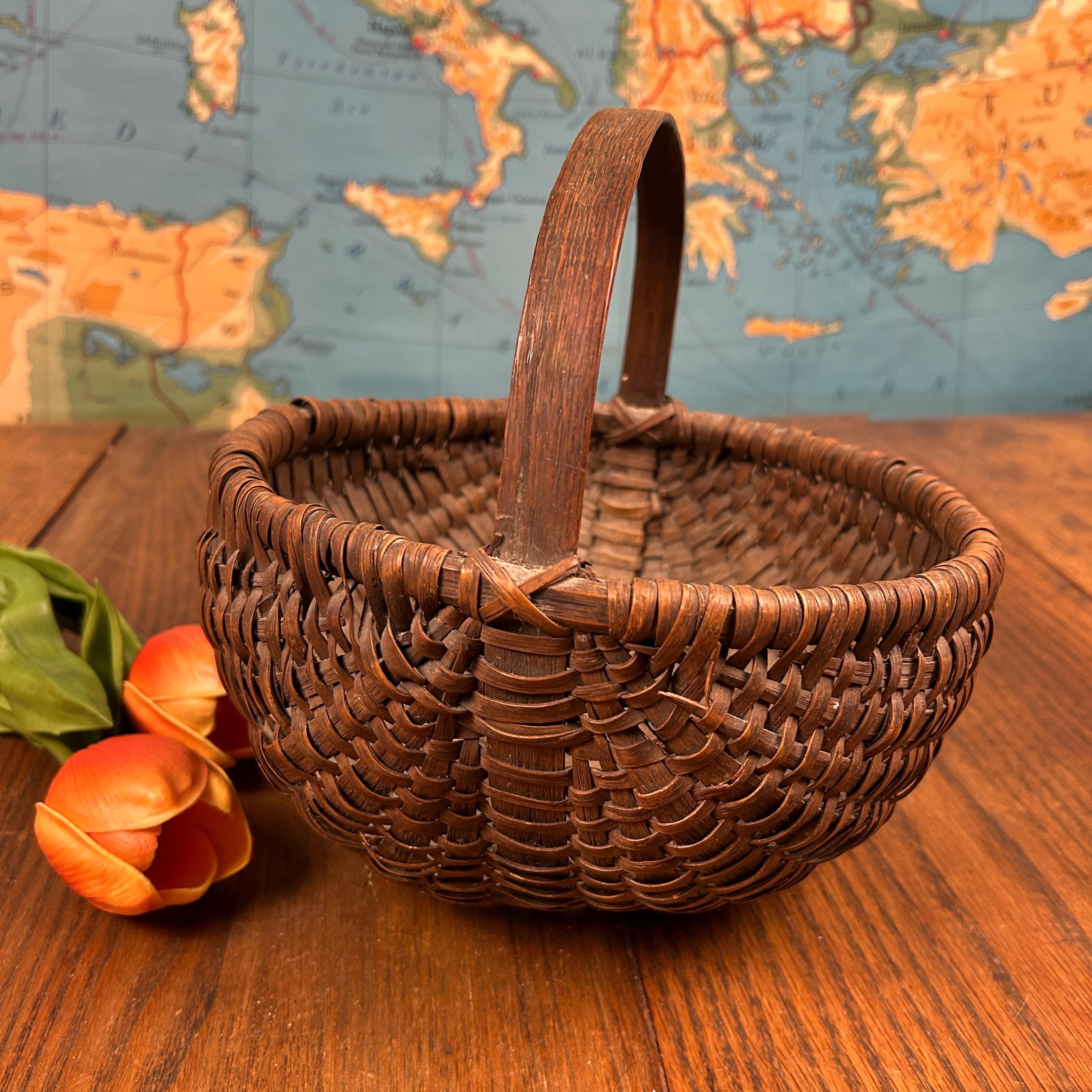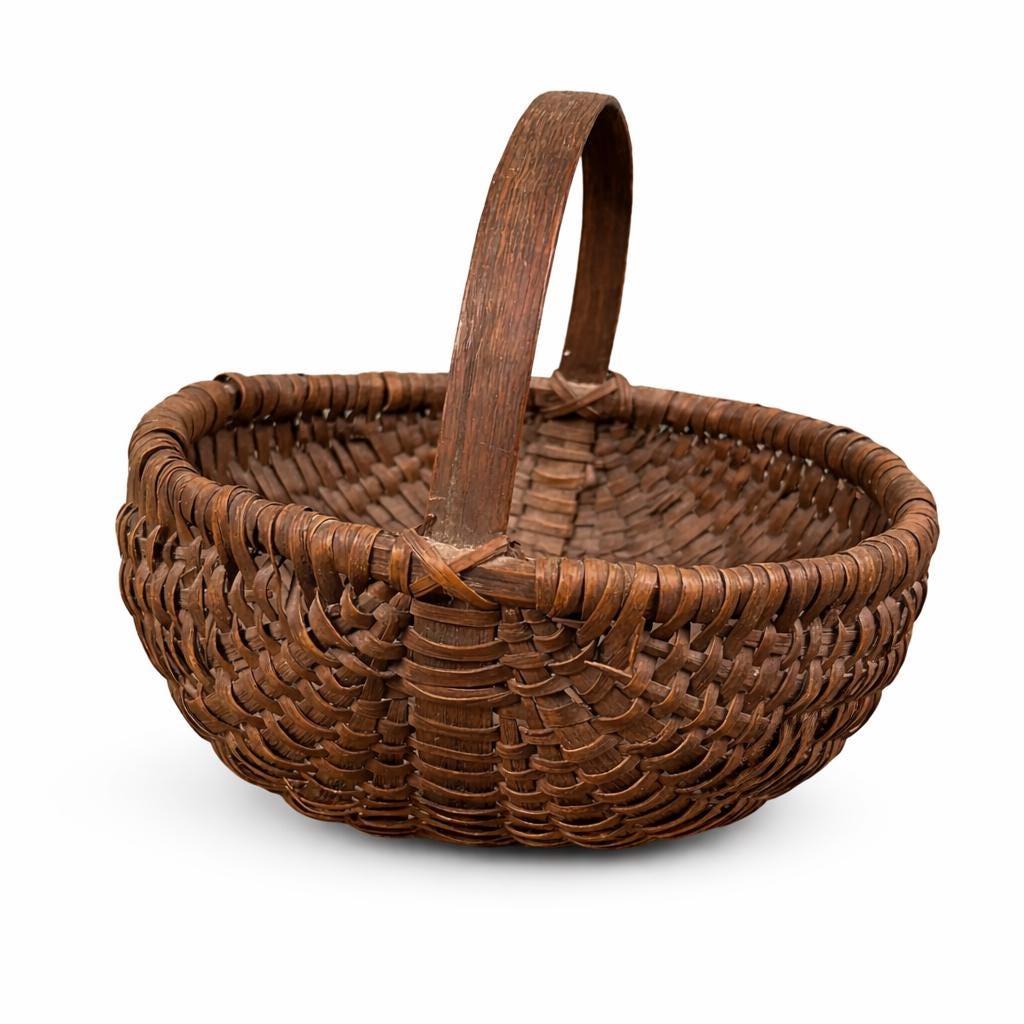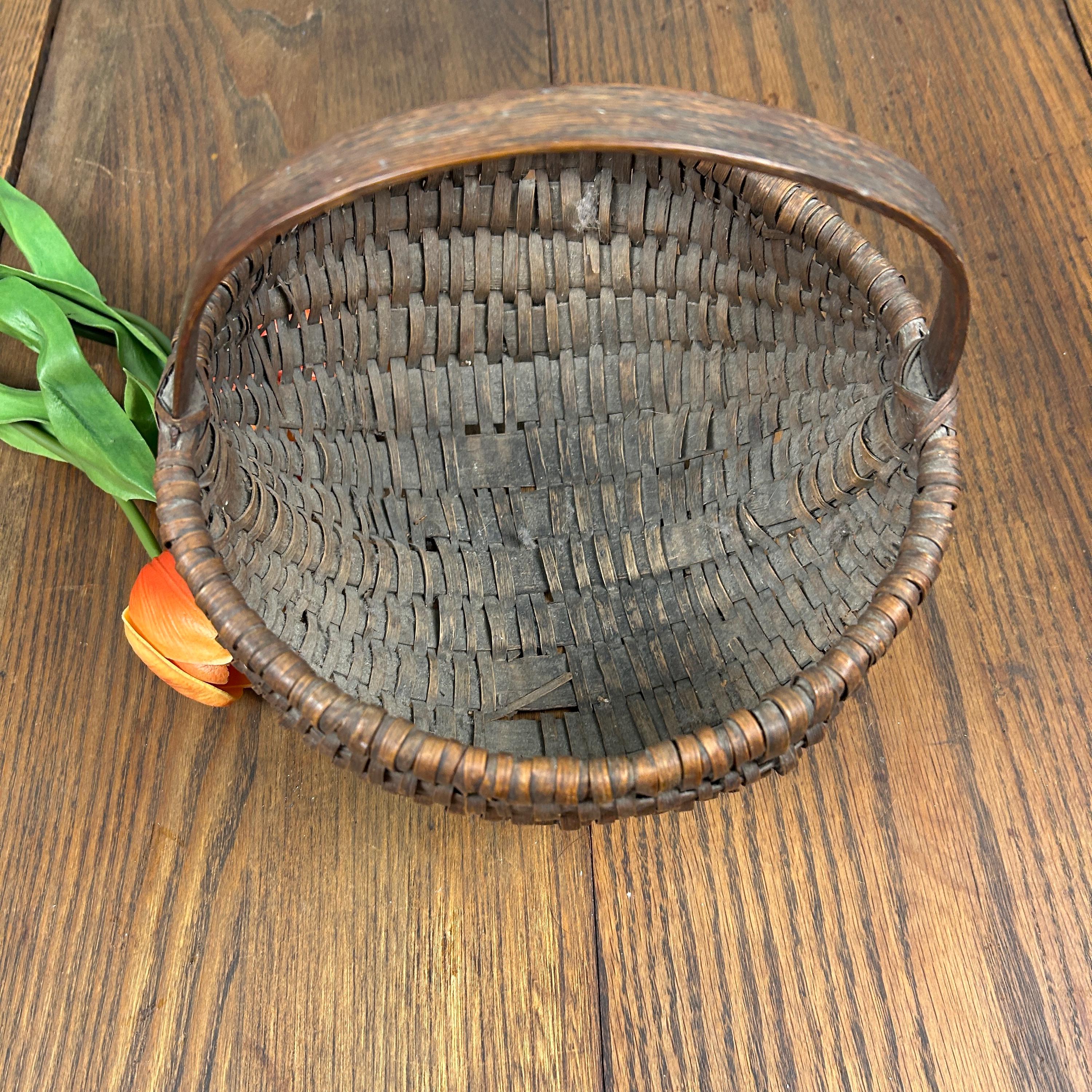 Originally used on farms for gathering melons, fruits, vegetables, flowers, or eggs, this basket reflects a style that originated in Europe and became widely adopted in early American life through colonial traditions. Its durable construction and timeless design speak to its hardworking past.