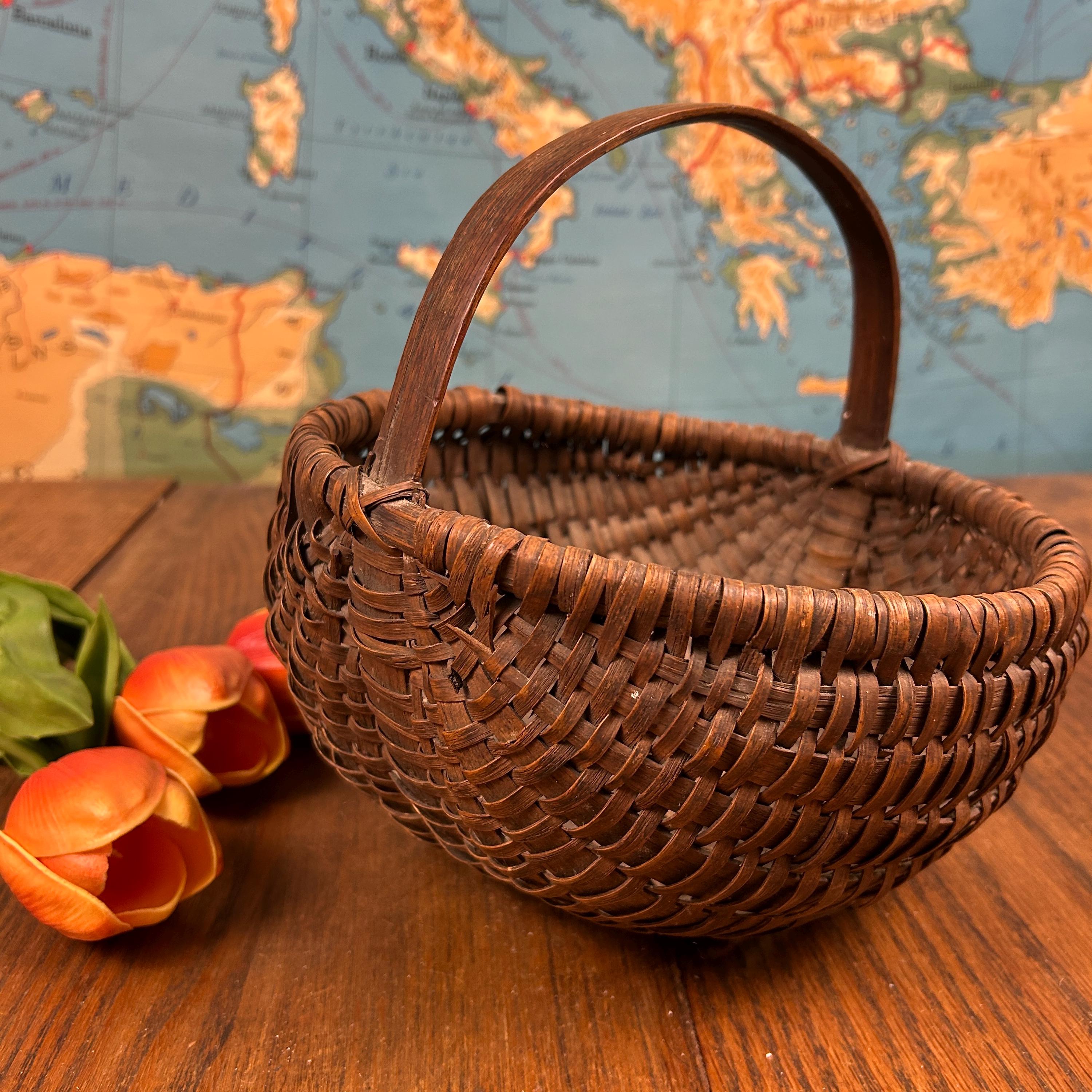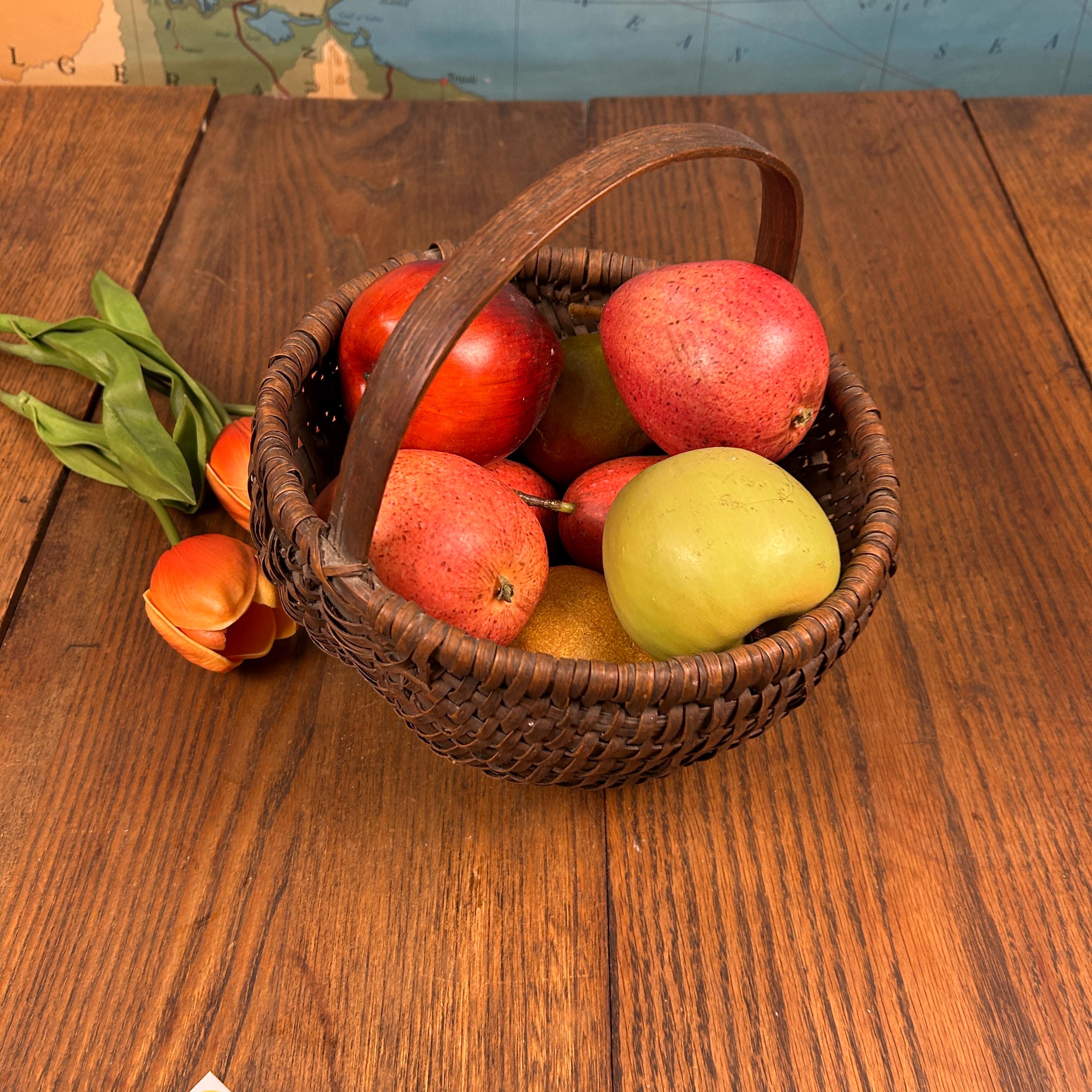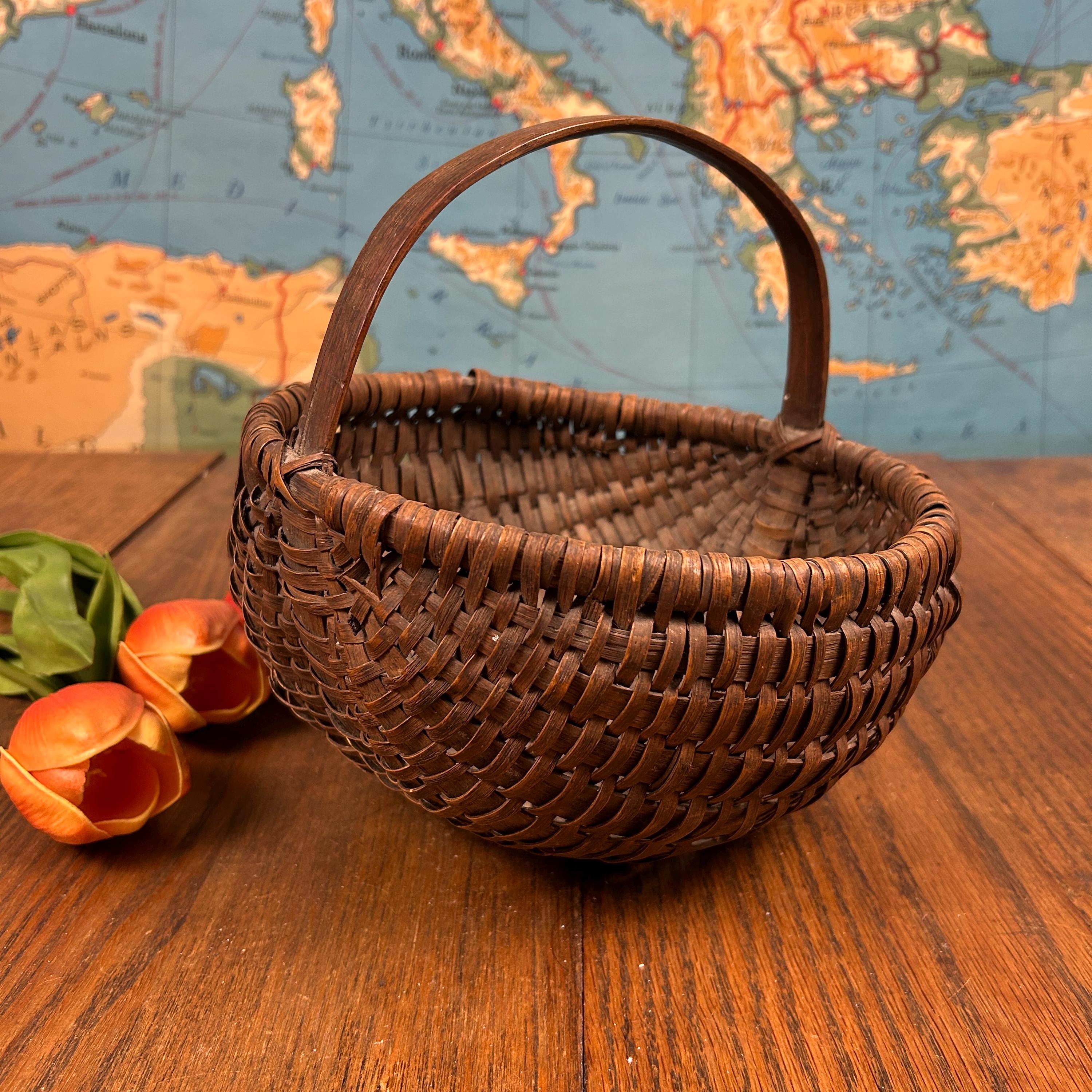 This antique hand-woven splint melon gathering basket is a beautiful example of early functional basketry, dating to the 19th or early 20th century. Crafted from thin wooden splints—commonly oak or ash—it features a classic oval, egg-shaped form with a sturdy bentwood handle and a tightly woven body.