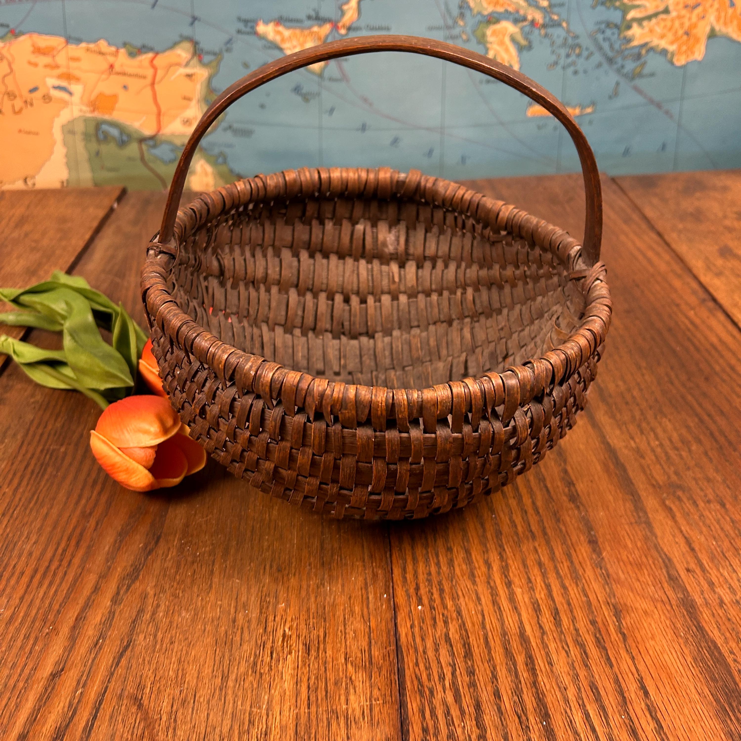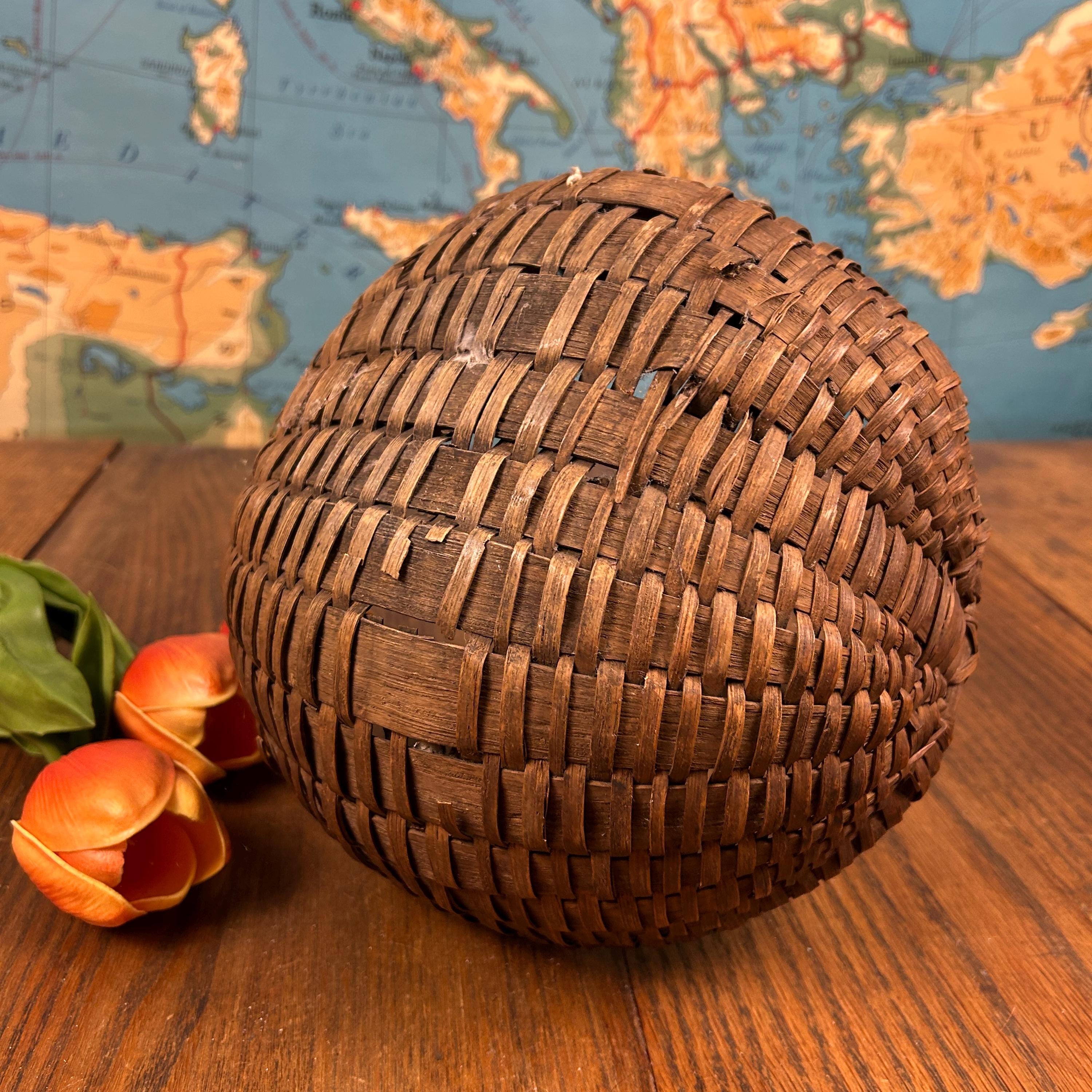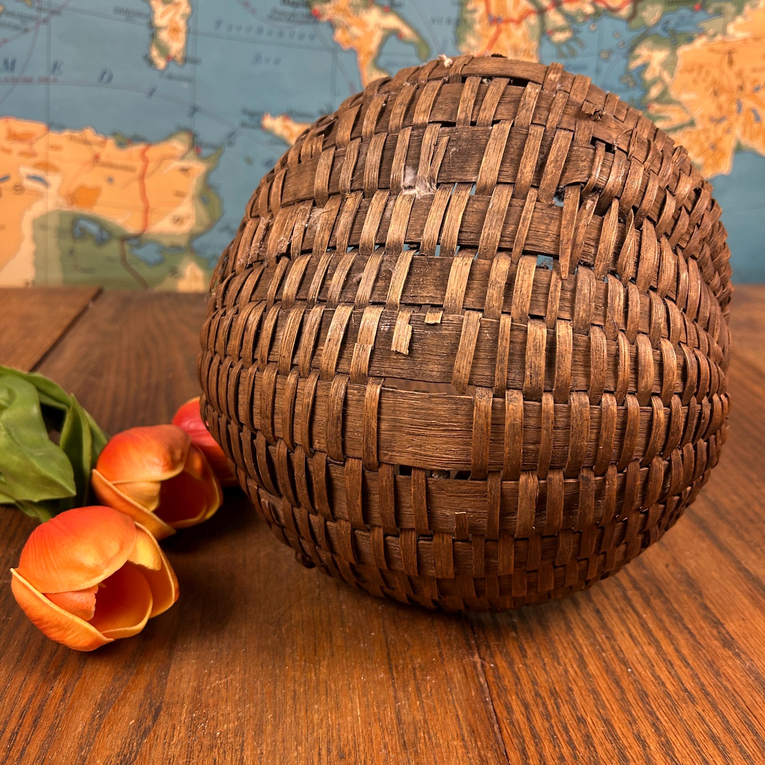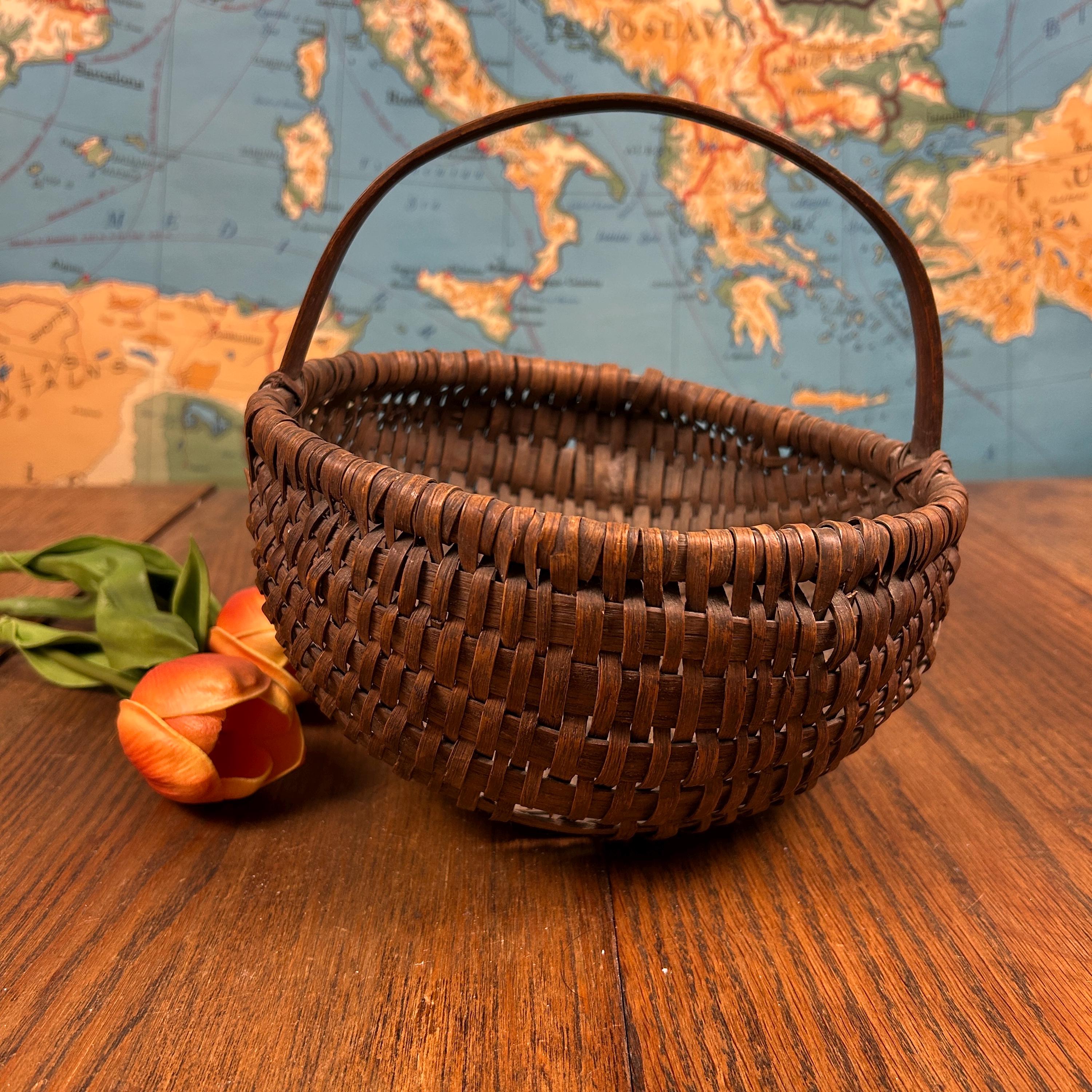 This antique hand-woven splint melon gathering basket is a beautiful example of early functional basketry, dating to the 19th or early 20th century. Crafted from thin wooden splints—commonly oak or ash—it features a classic oval, egg-shaped form with a sturdy bentwood handle and a tightly woven body.