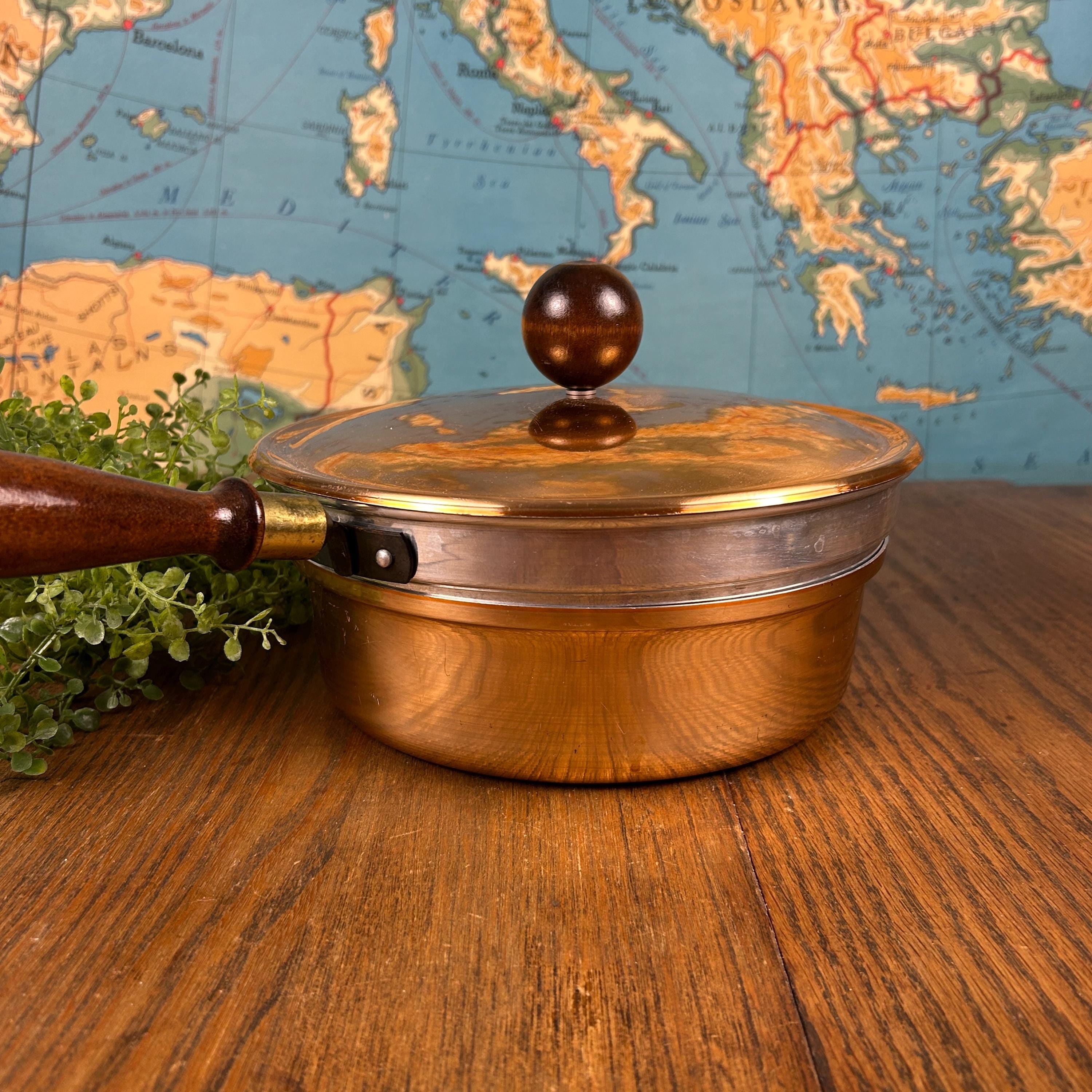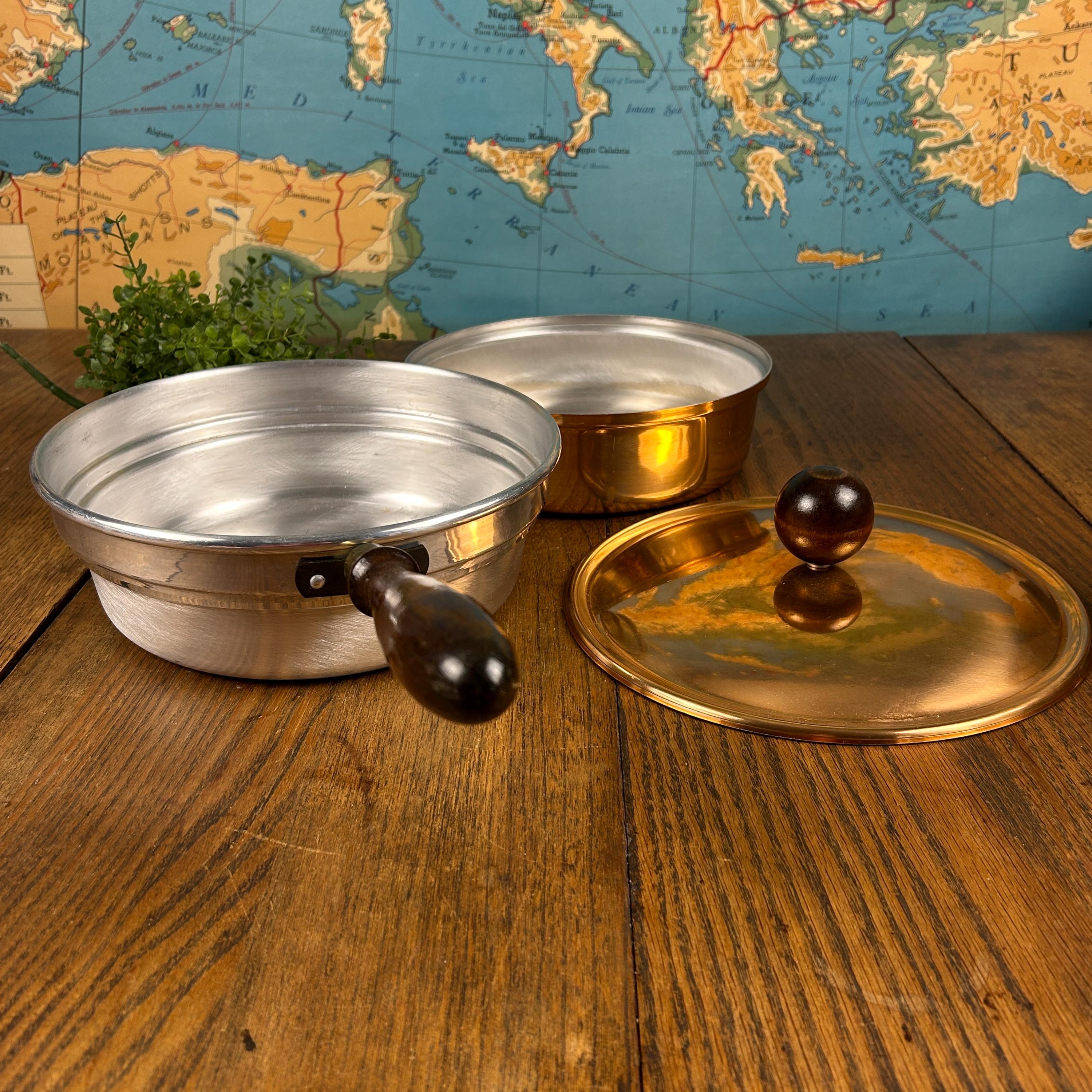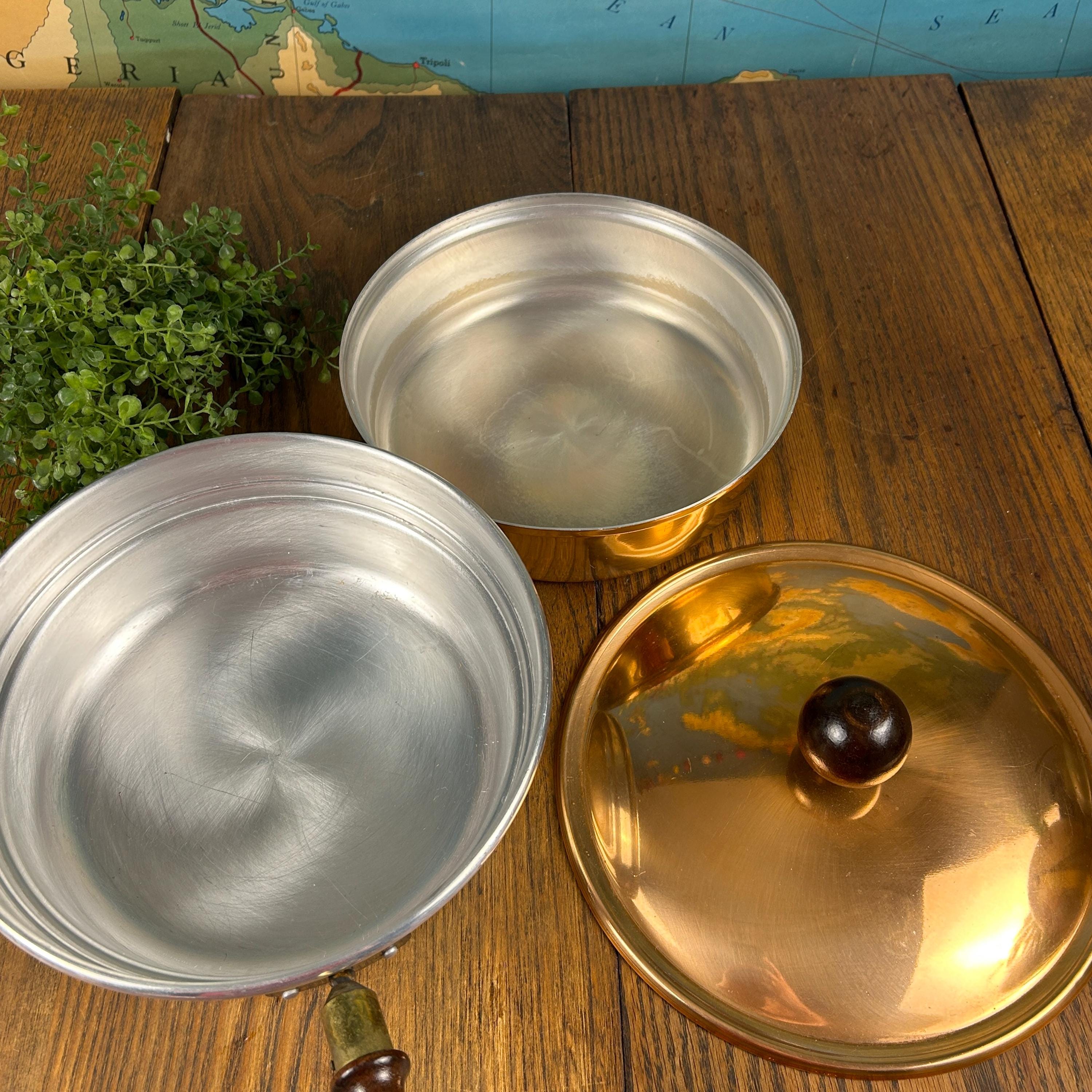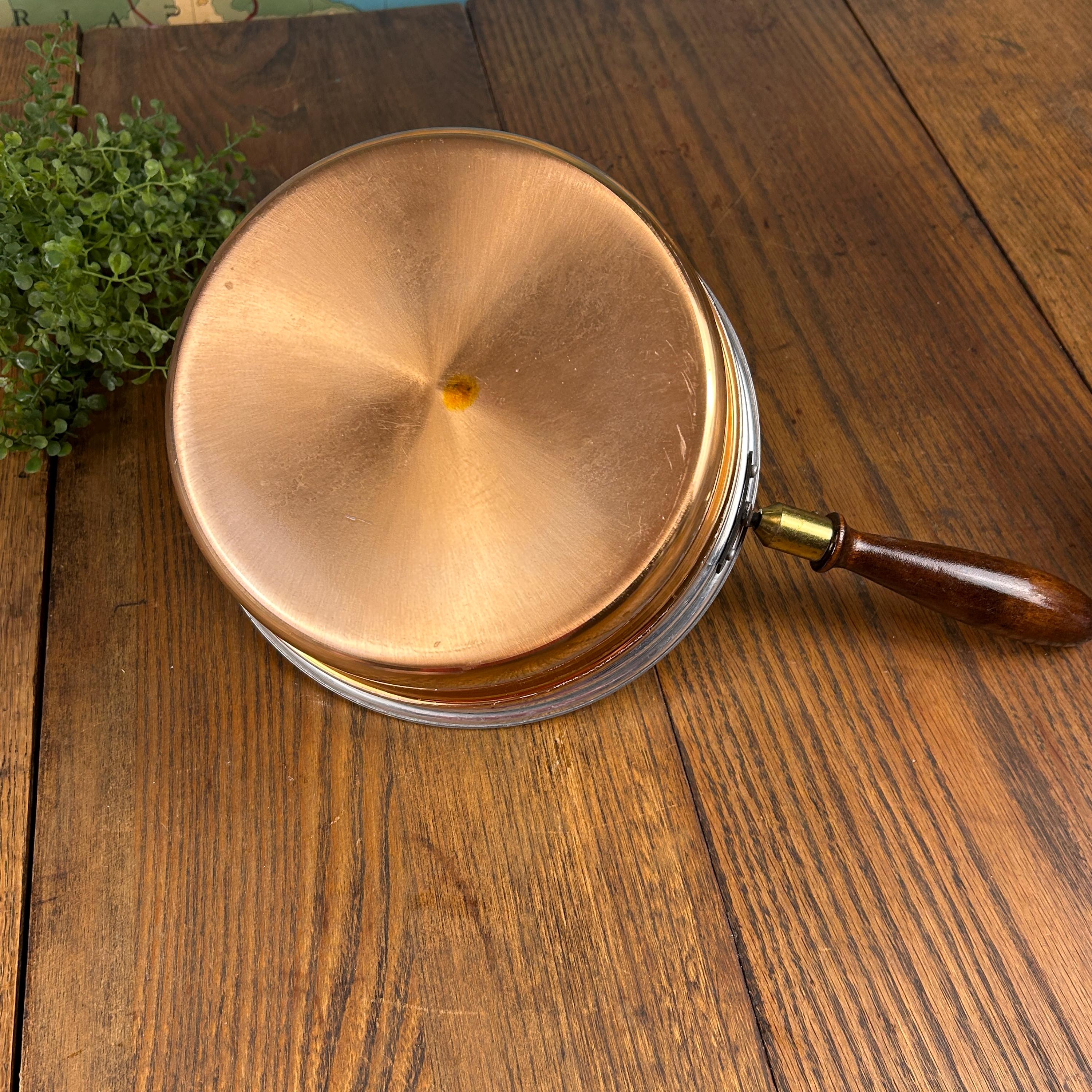 This beautiful vintage copper chafing dish / double boiler set is a functional and decorative piece for the kitchen or table. Crafted as a 3-piece set, it combines classic materials including copper, aluminum, brass, wood, and stainless steel, offering both durability and timeless appeal.