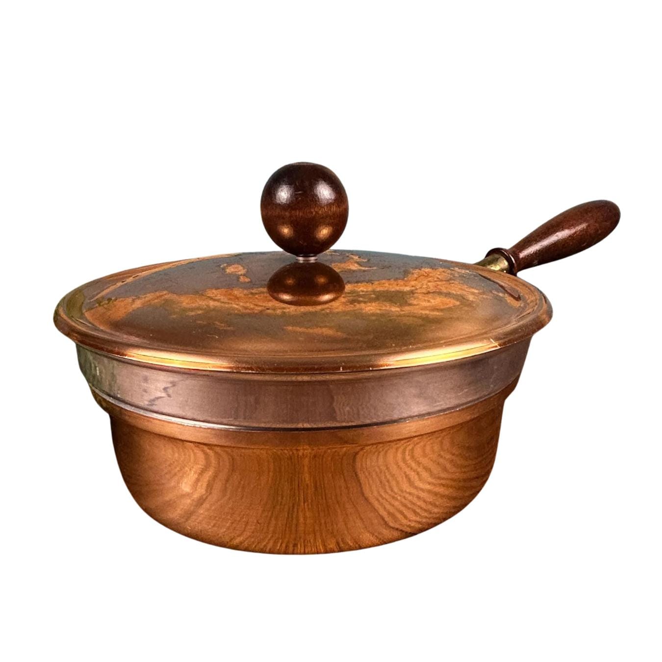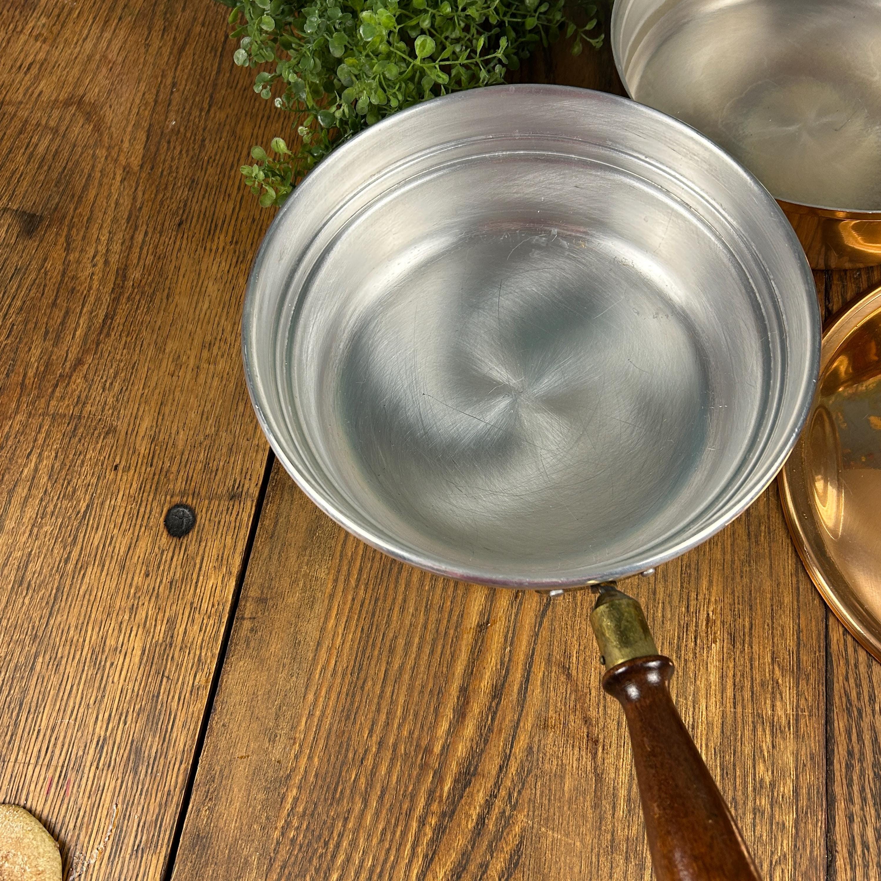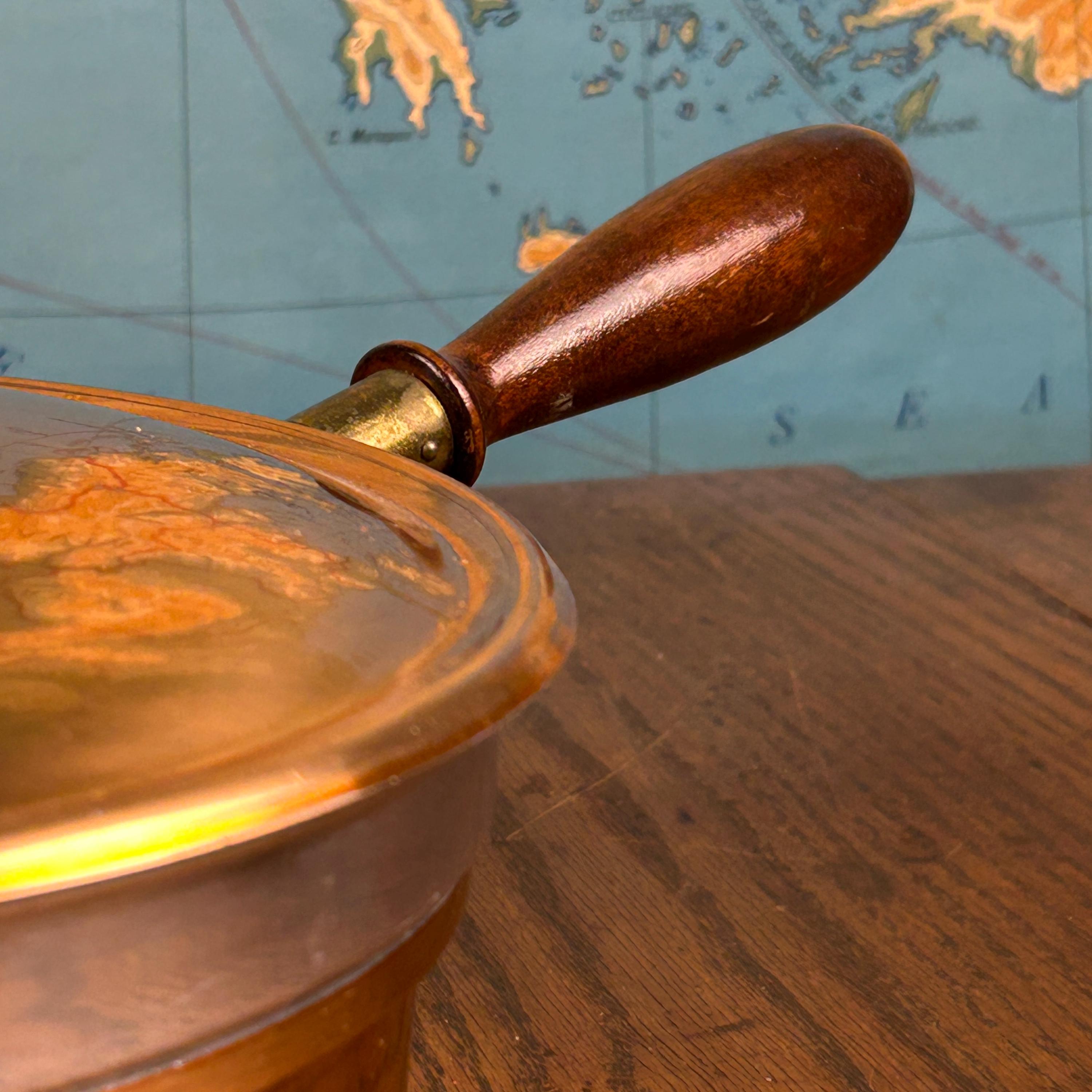 This beautiful vintage copper chafing dish / double boiler set is a functional and decorative piece for the kitchen or table. Crafted as a 3-piece set, it combines classic materials including copper, aluminum, brass, wood, and stainless steel, offering both durability and timeless appeal.