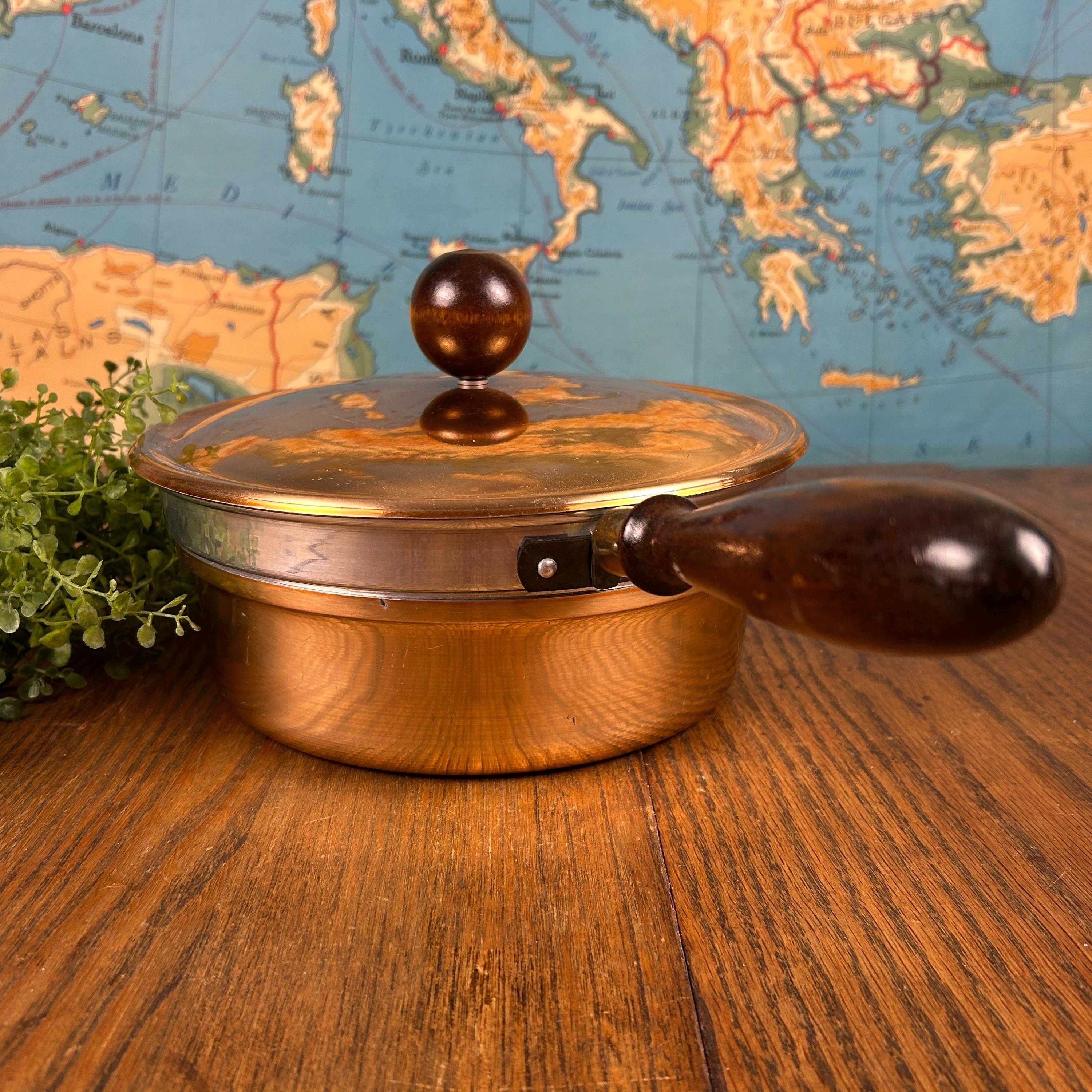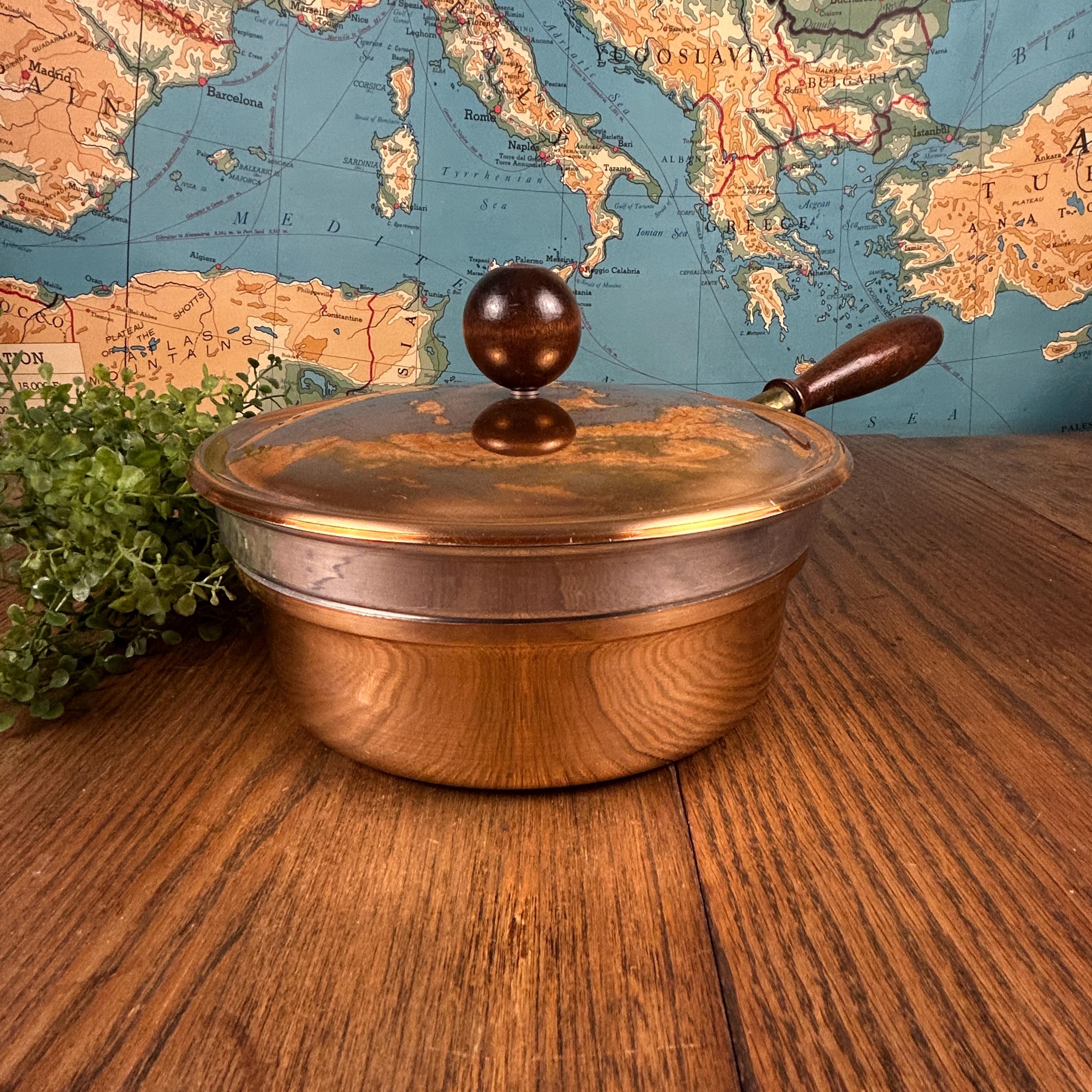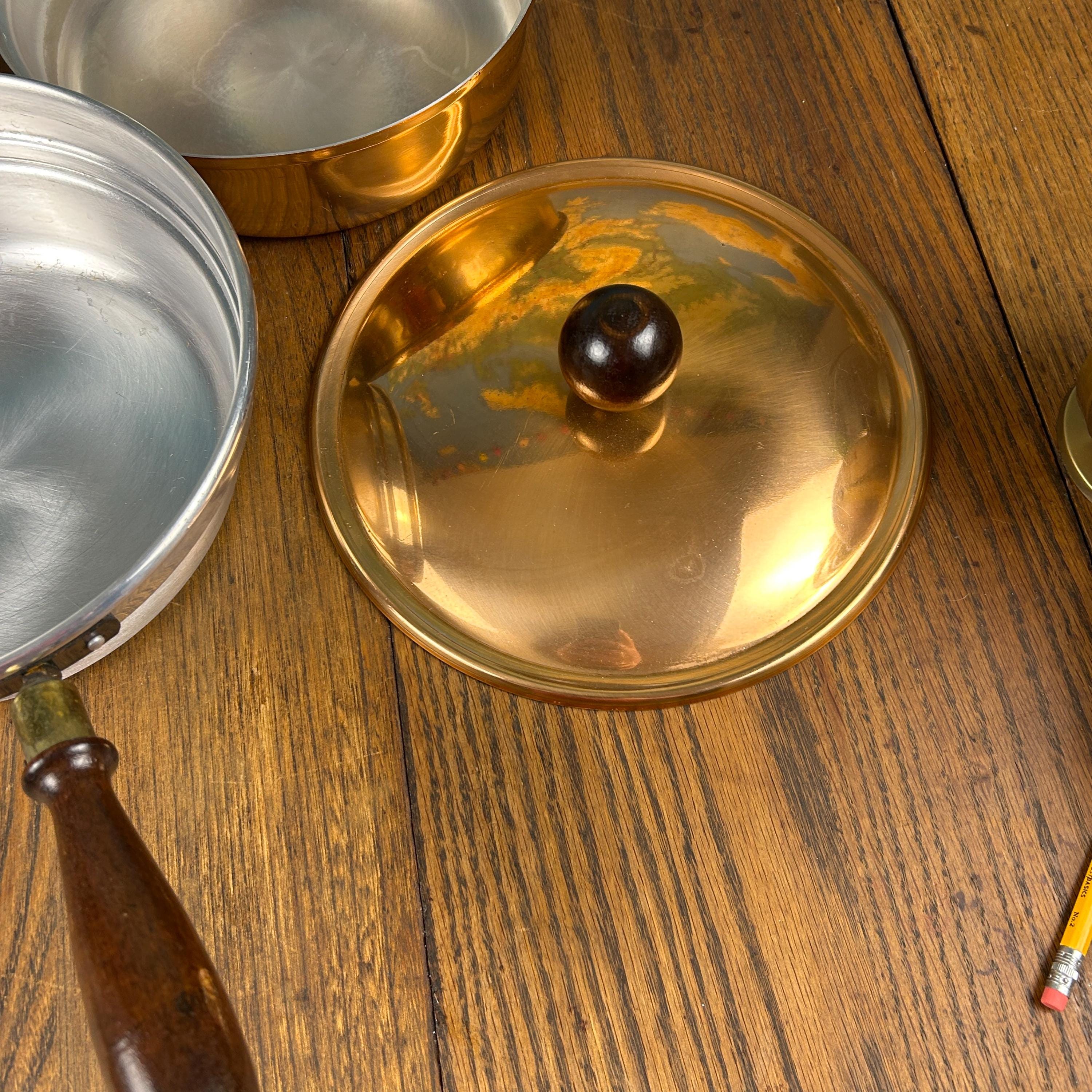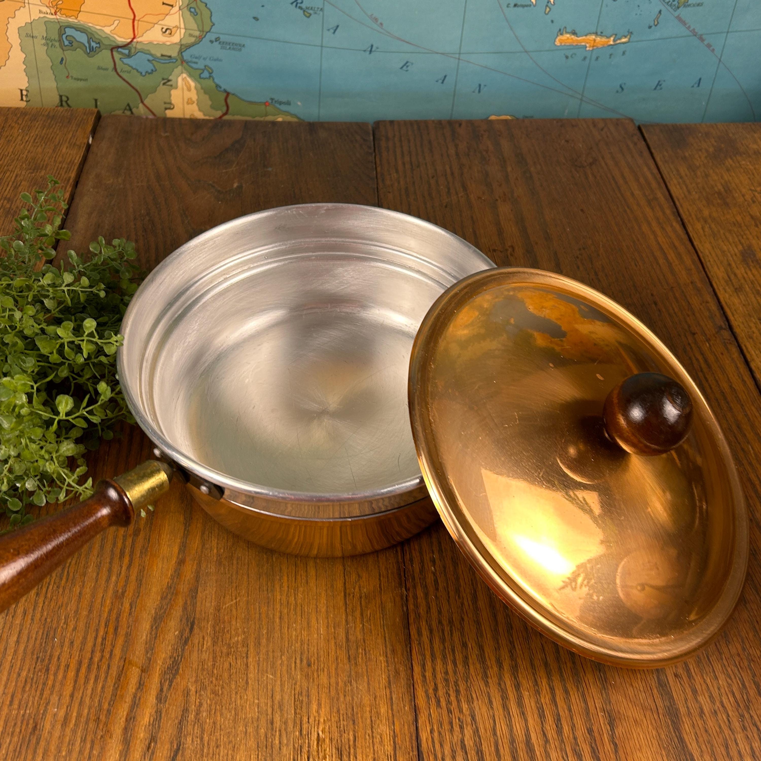 This beautiful vintage copper chafing dish / double boiler set is a functional and decorative piece for the kitchen or table. Crafted as a 3-piece set, it combines classic materials including copper, aluminum, brass, wood, and stainless steel, offering both durability and timeless appeal.