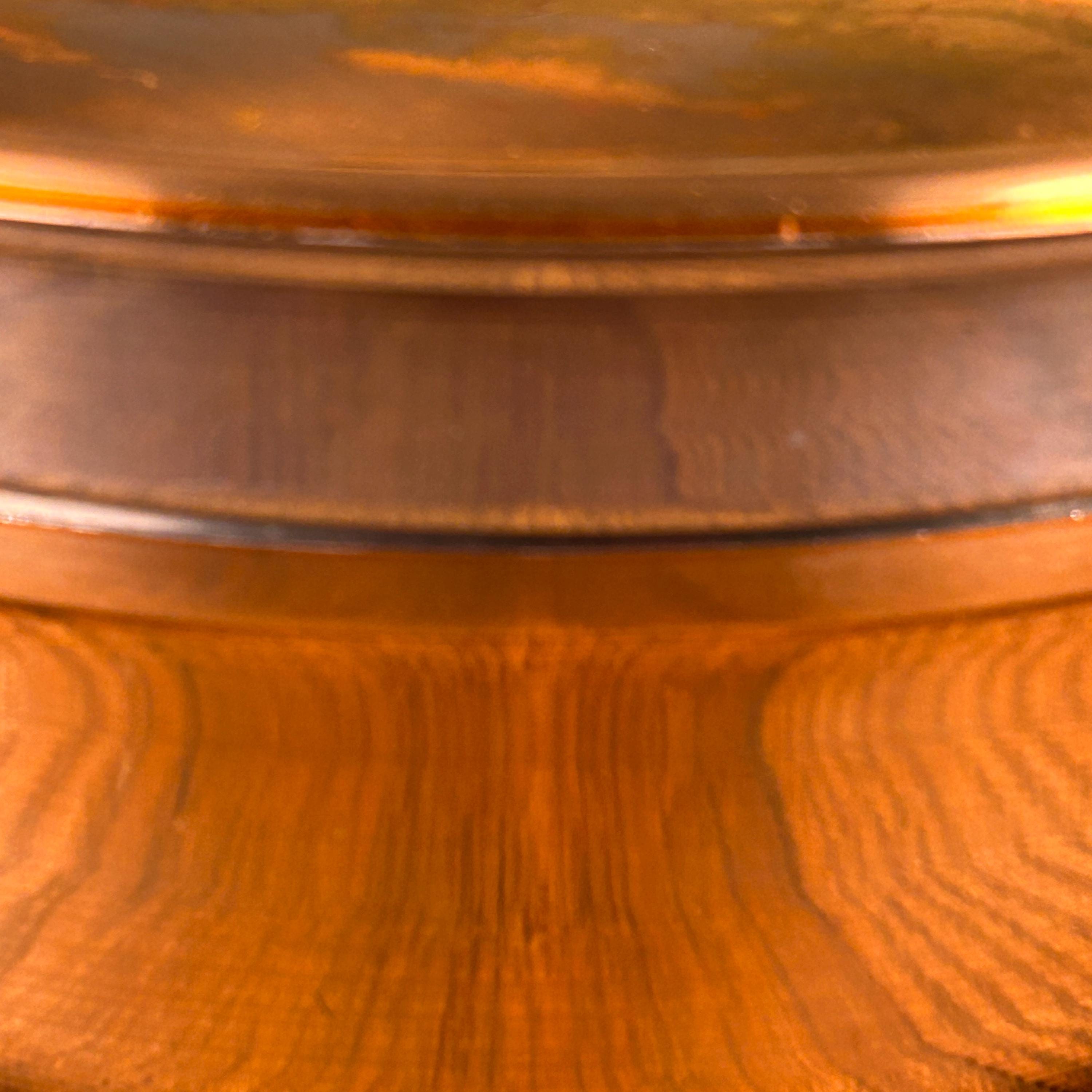 Designed to keep food warm for serving at buffets or table settings, the interior cooking surfaces and the underside of the lid are lined with stainless steel for improved food hygiene and ease of cleaning. The warm patina of the copper exterior contrasts beautifully with the wooden handle, giving this piece an elegant vintage character.