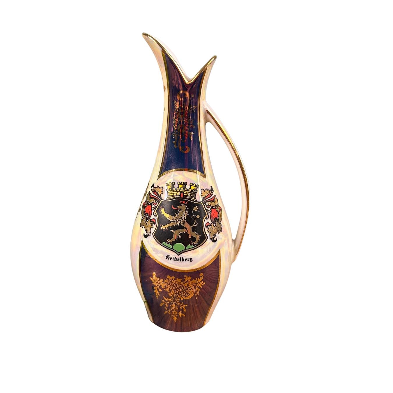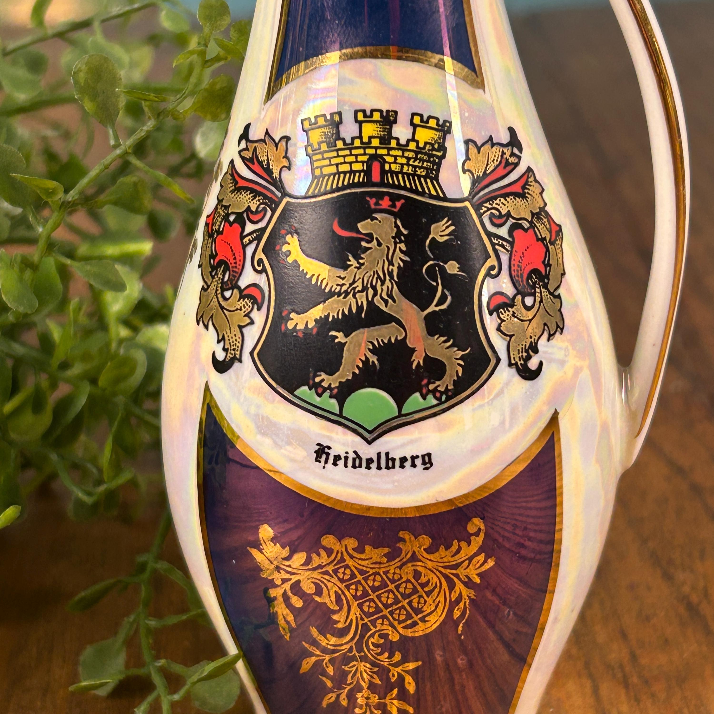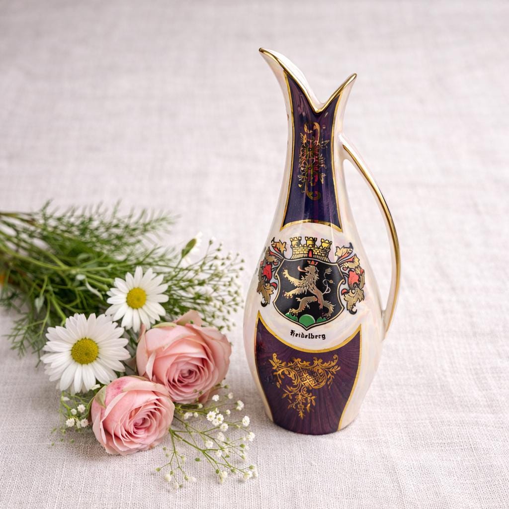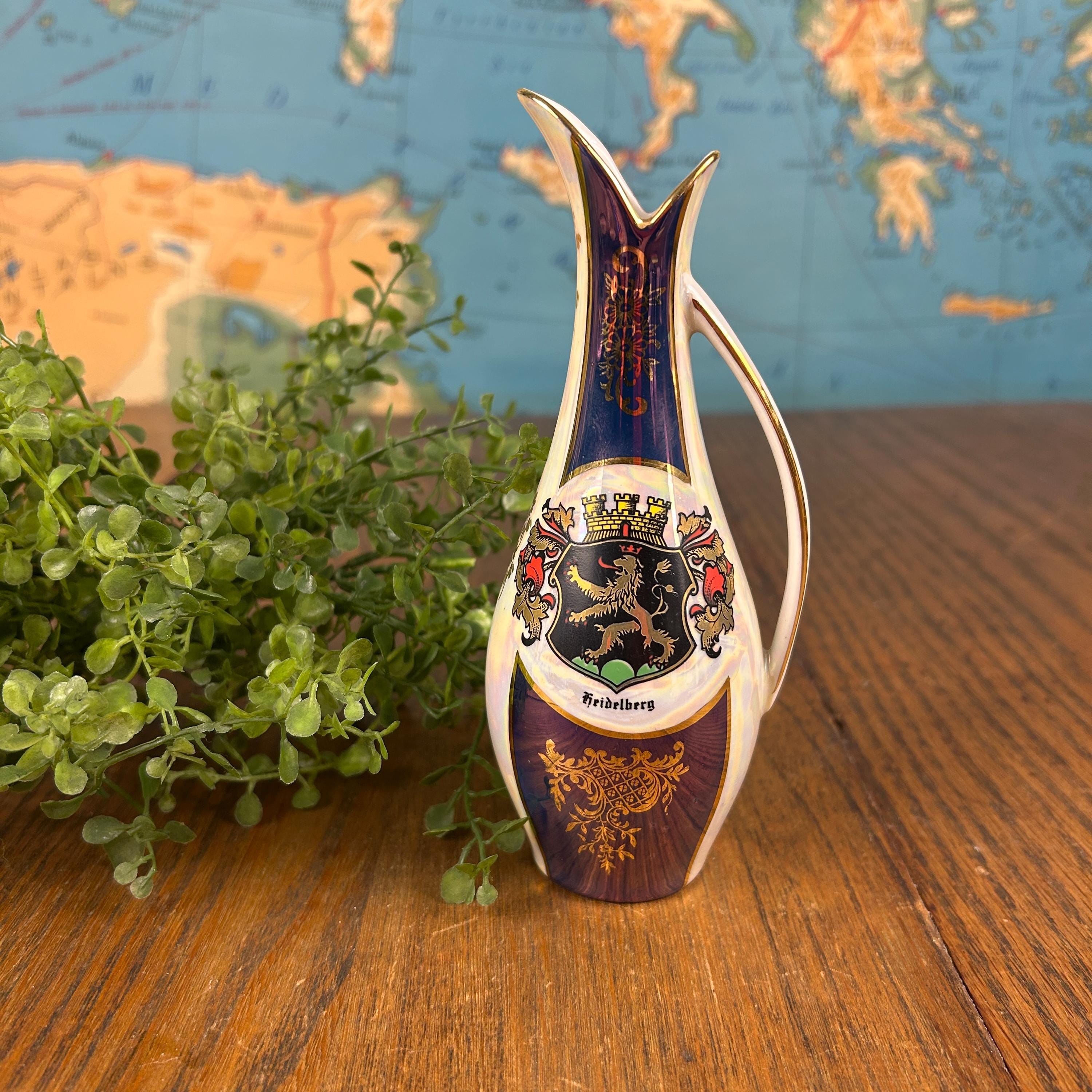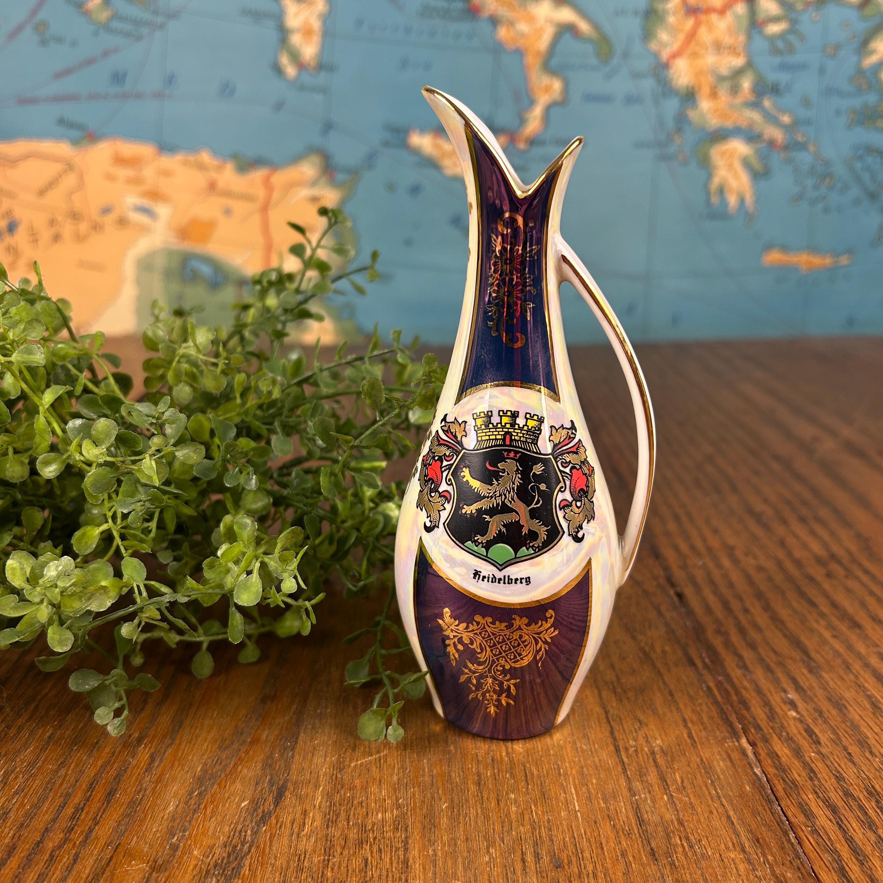This is a charming vintage porcelain ewer / bud vase from Bavaria, produced by Crown GVD, and decorated with the coat of arms of Heidelberg, Germany. Designed as a small, decorative piece, it features a graceful handle and classic ewer form.