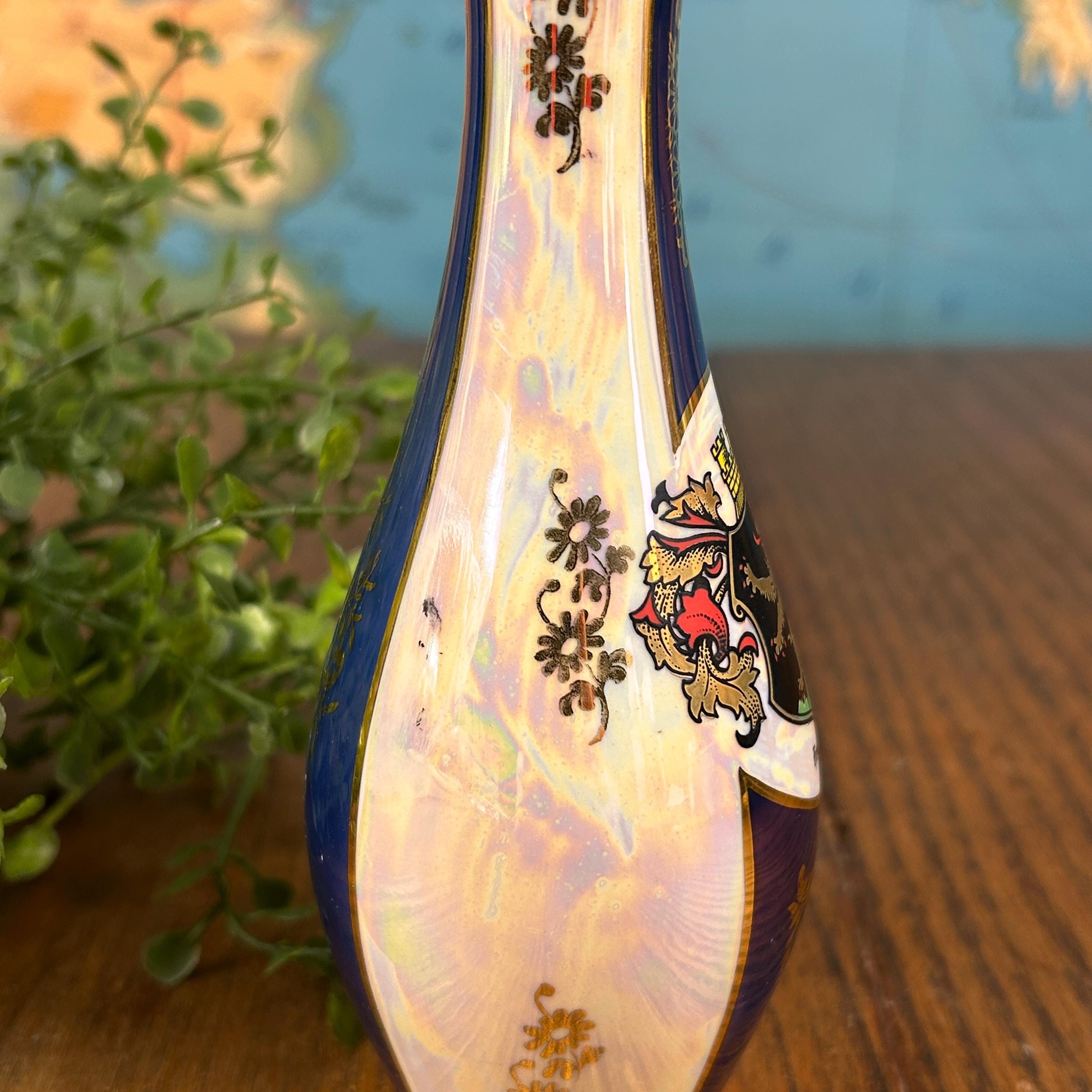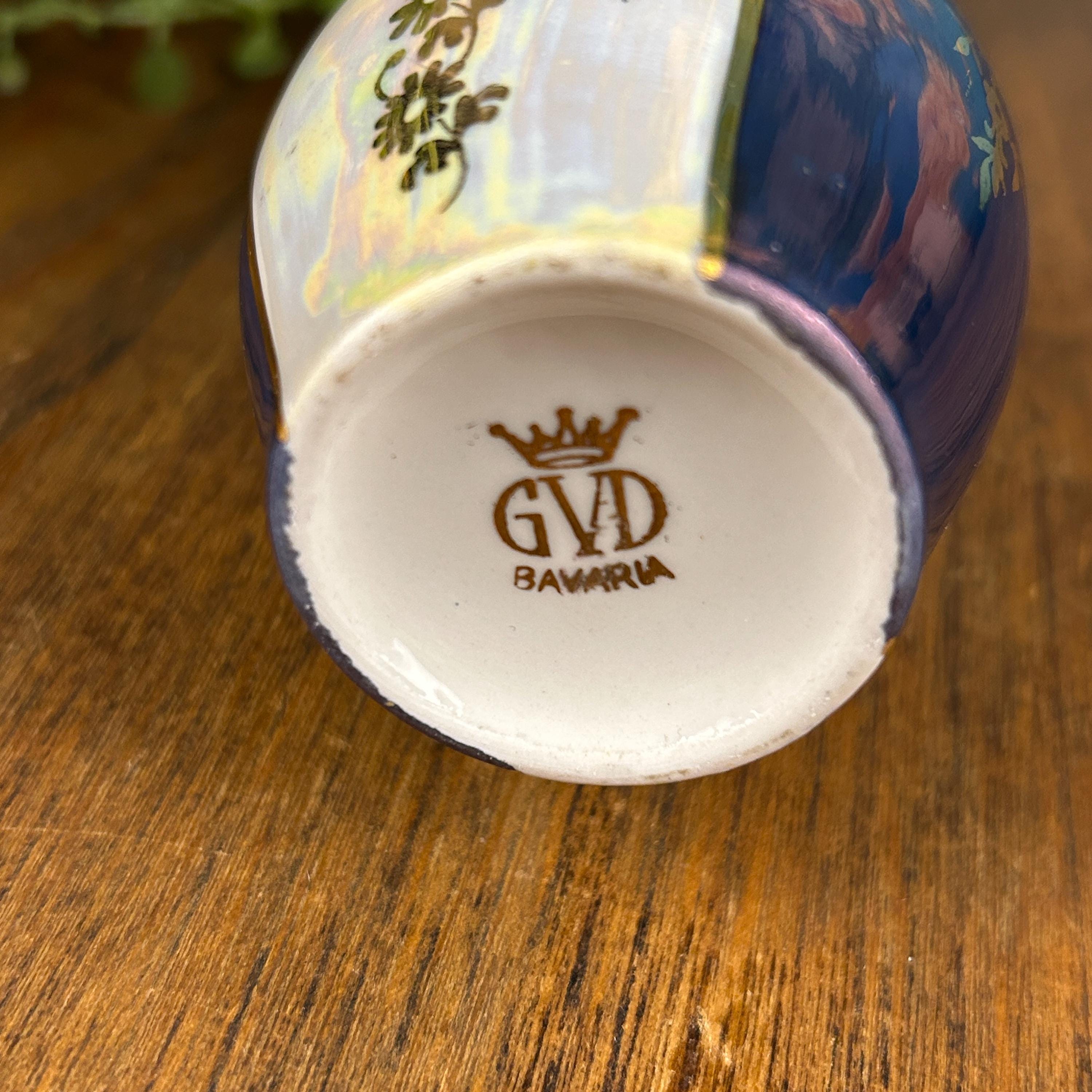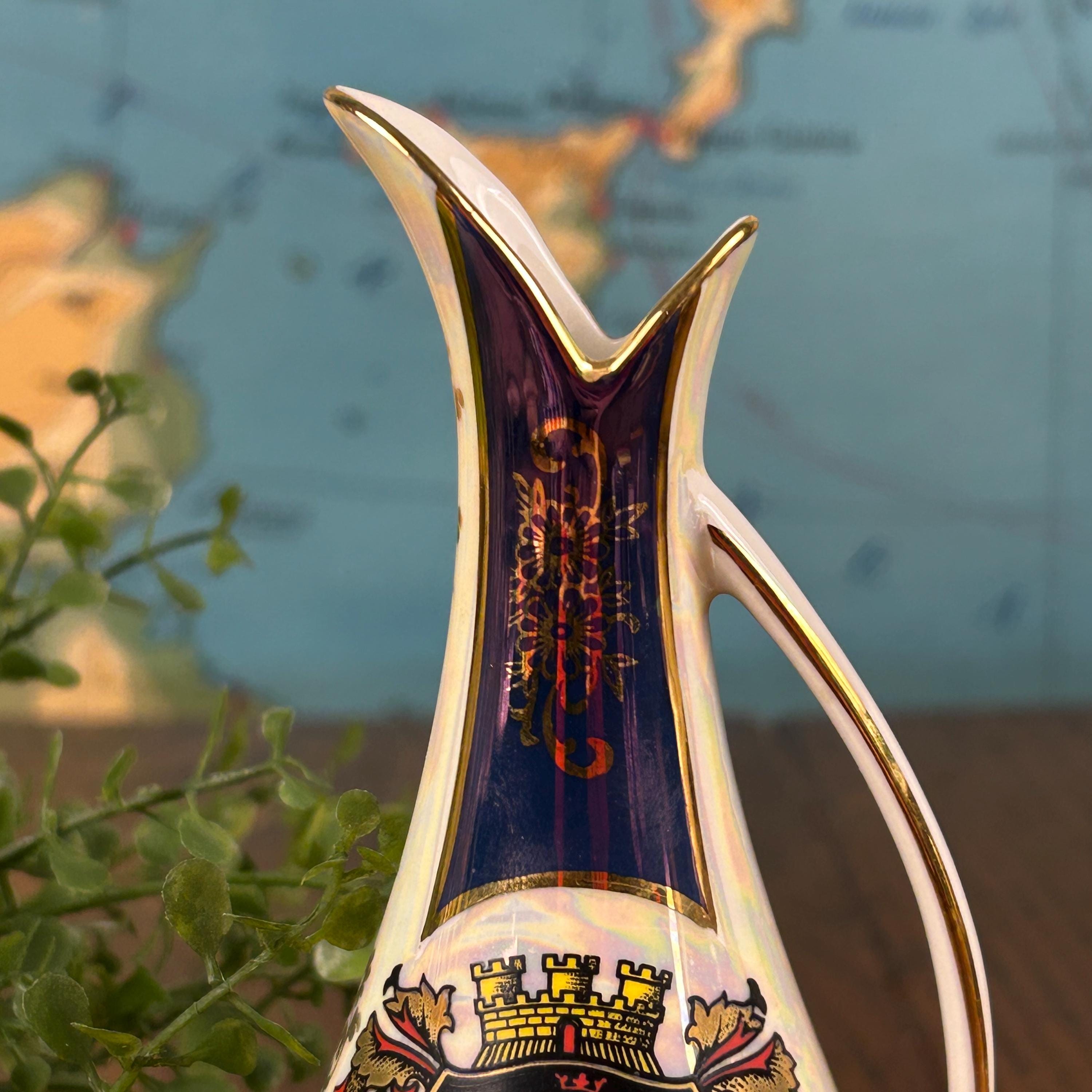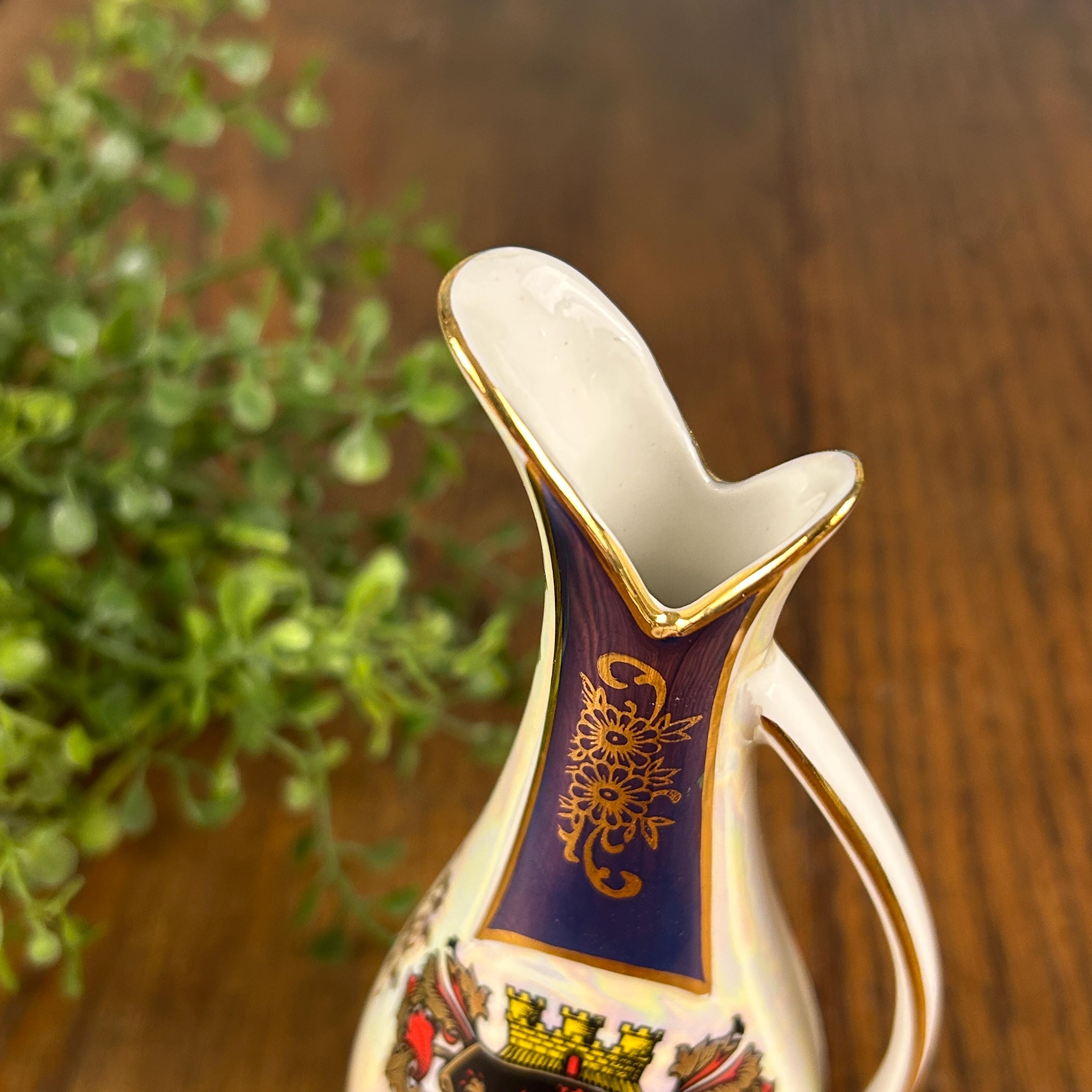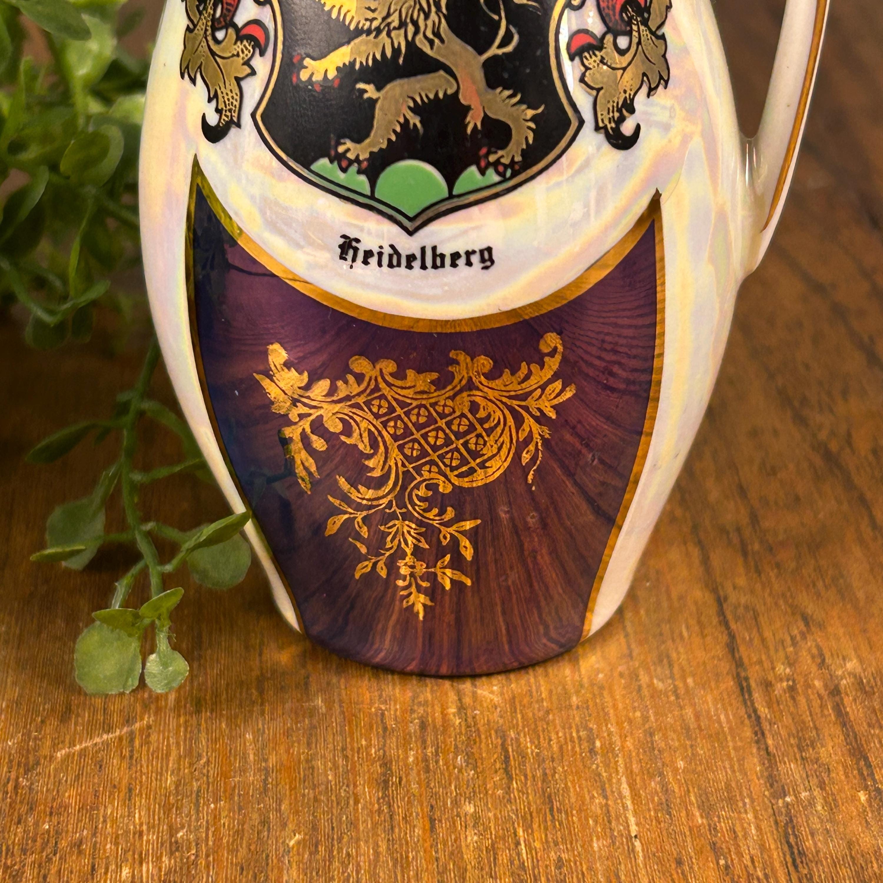 This is a charming vintage porcelain ewer / bud vase from Bavaria, produced by Crown GVD, and decorated with the coat of arms of Heidelberg, Germany. Designed as a small, decorative piece, it features a graceful handle and classic ewer form.