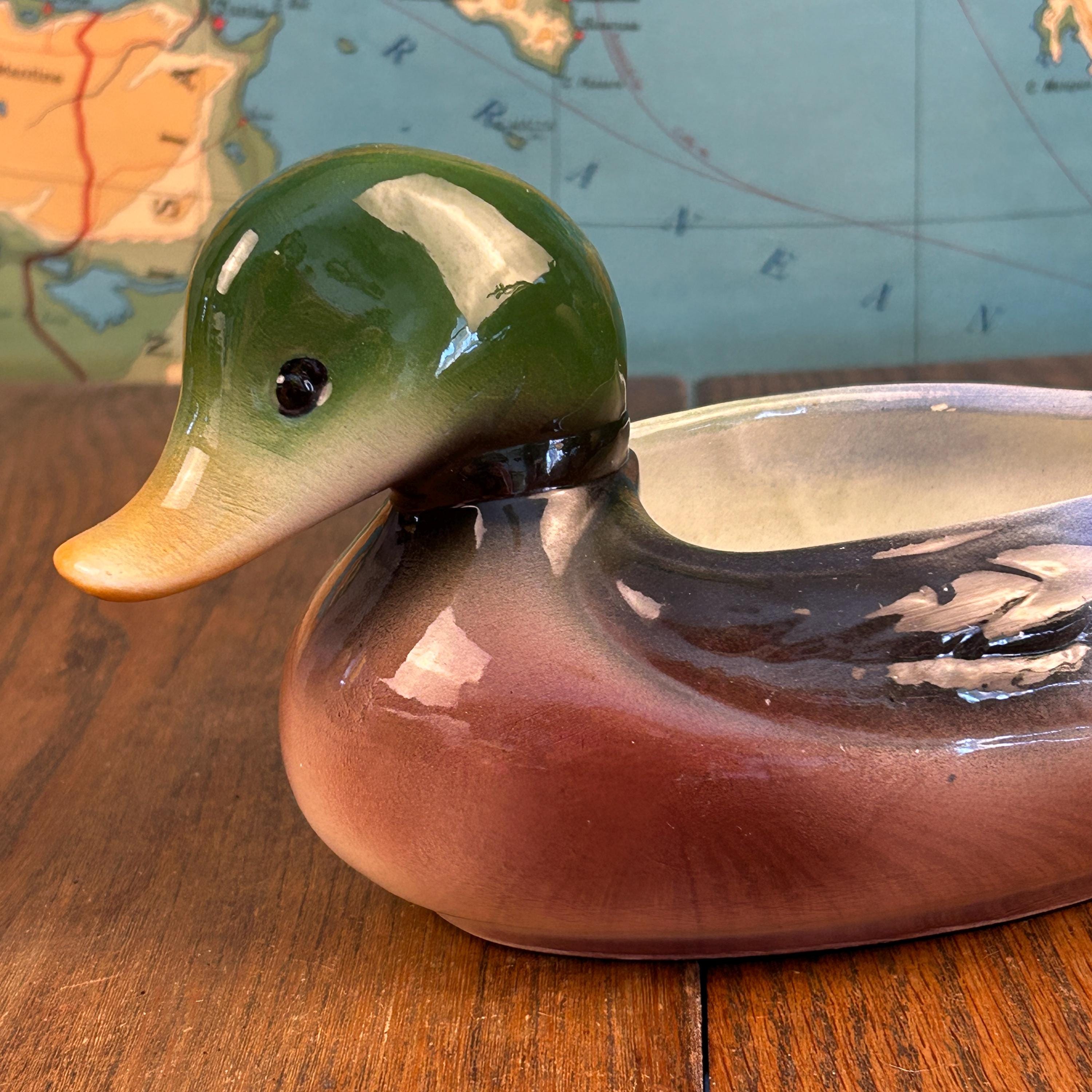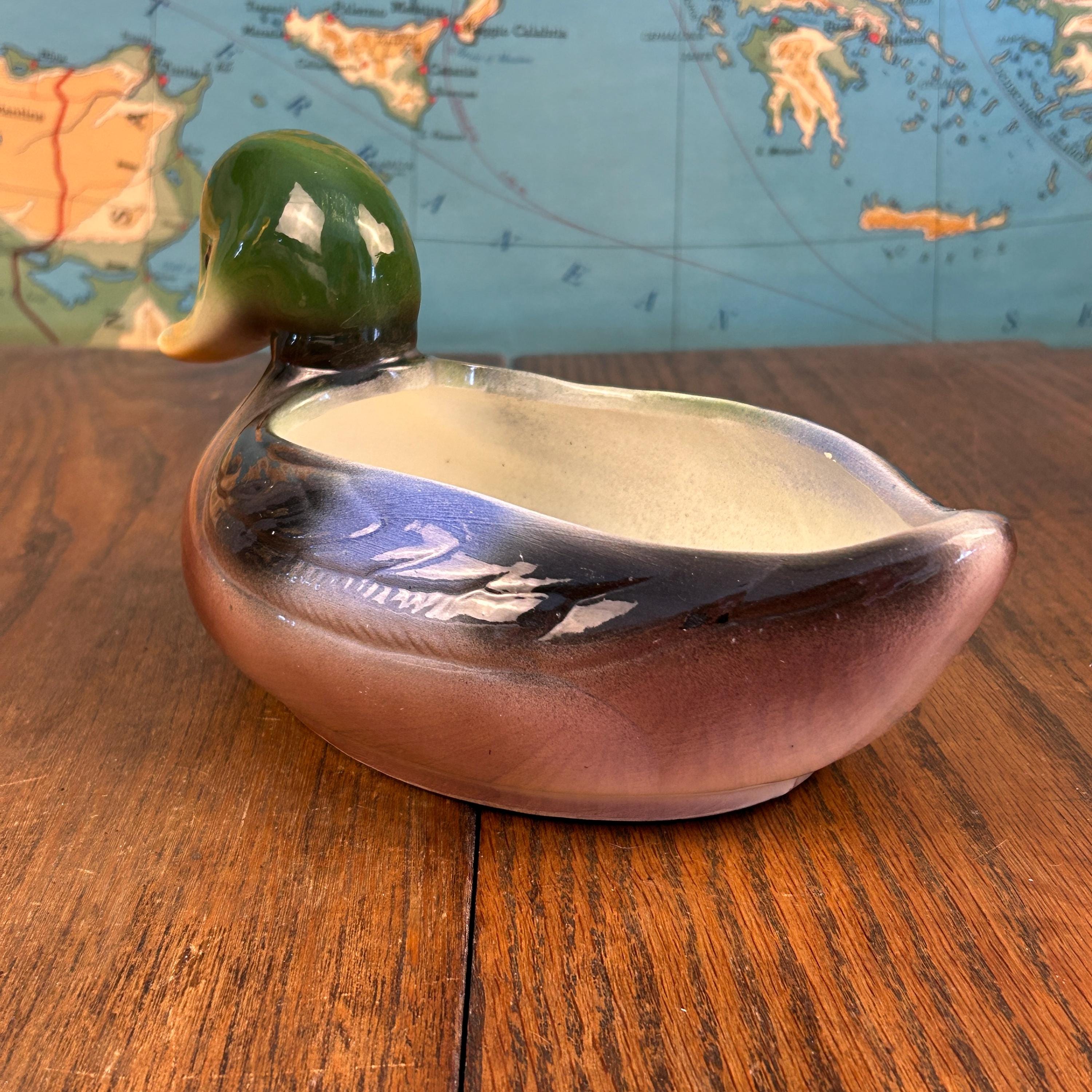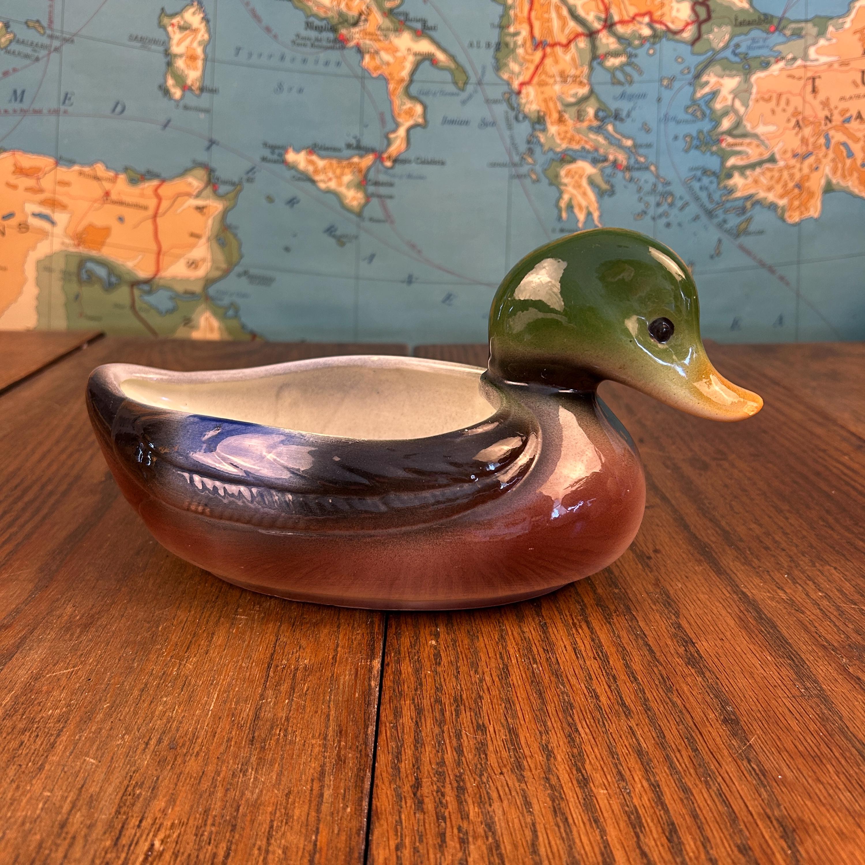 The graceful mallard form and earthy color palette make this piece perfect for farmhouse, cabin, cottage, or mid-century decor. It works wonderfully as a small planter, succulent holder, or standalone display piece.