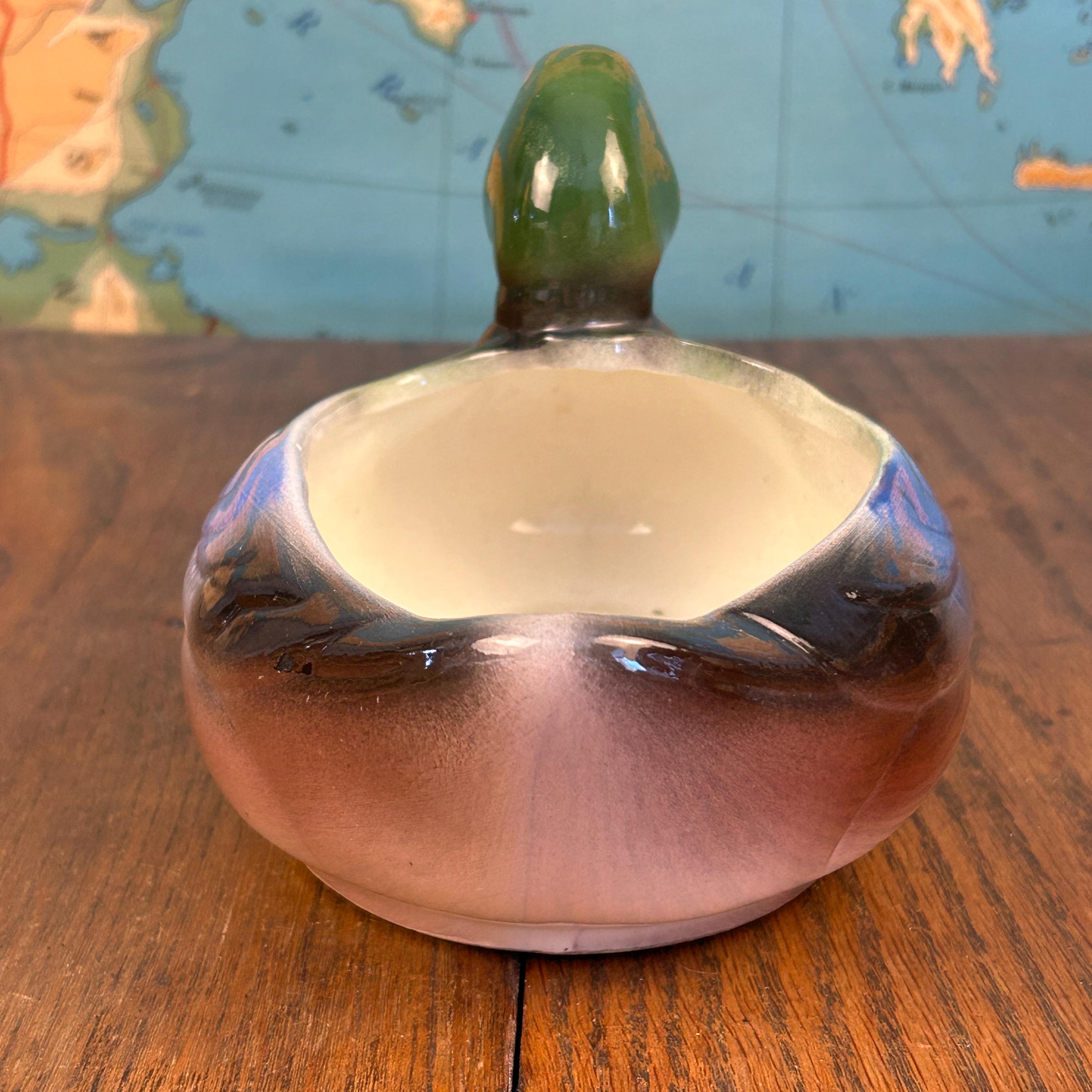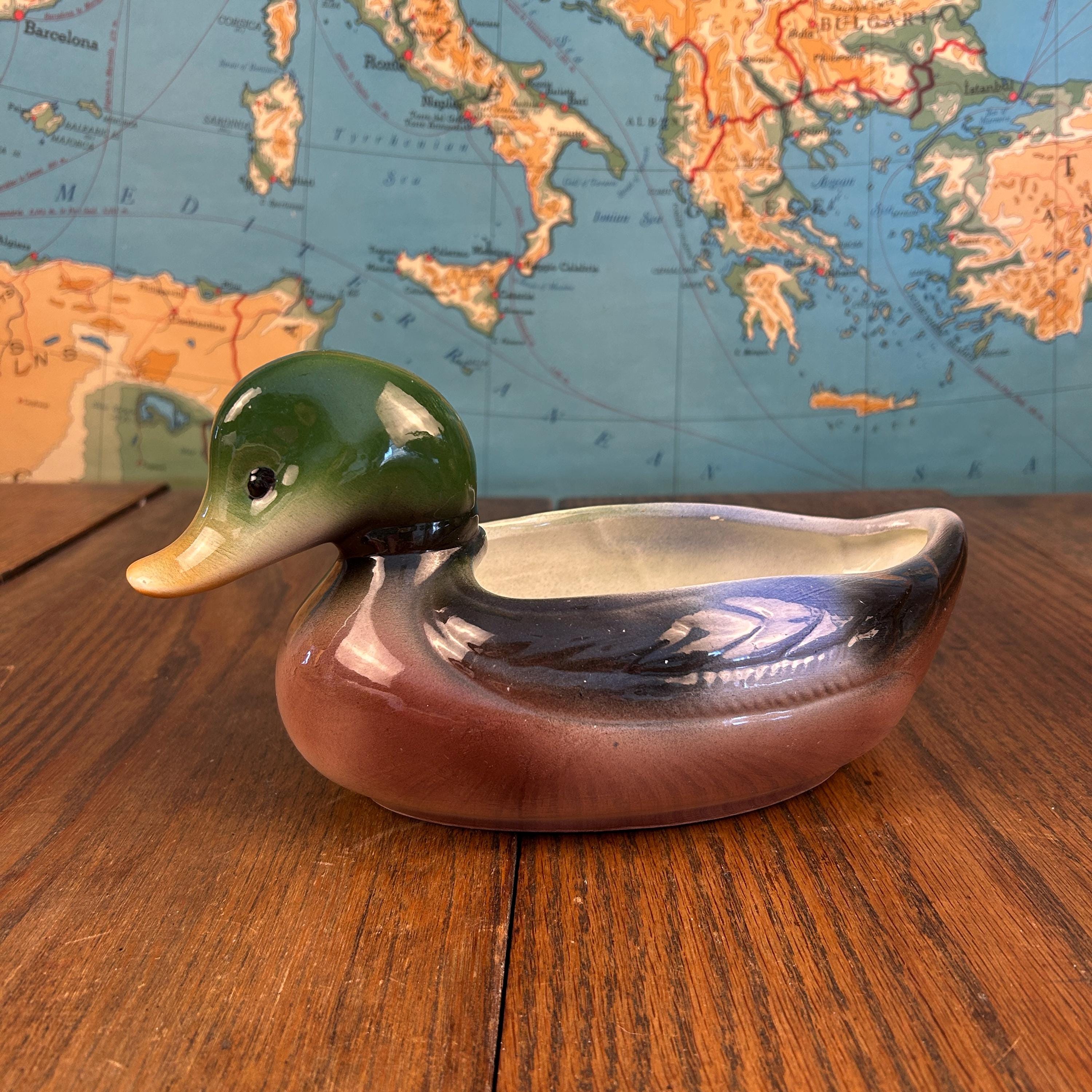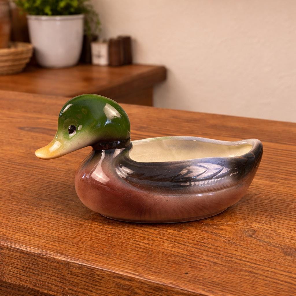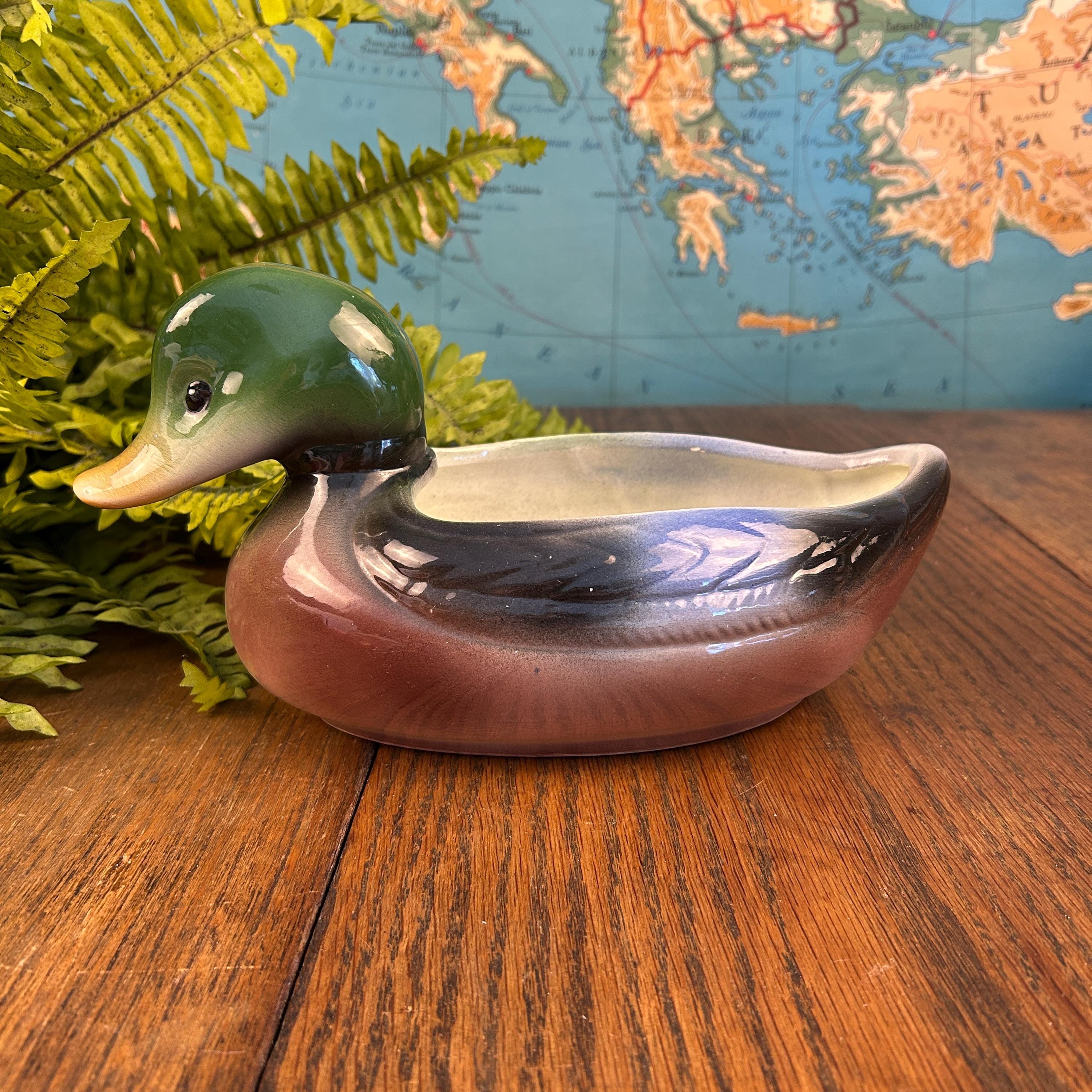 The graceful mallard form and earthy color palette make this piece perfect for farmhouse, cabin, cottage, or mid-century decor. It works wonderfully as a small planter, succulent holder, or standalone display piece.