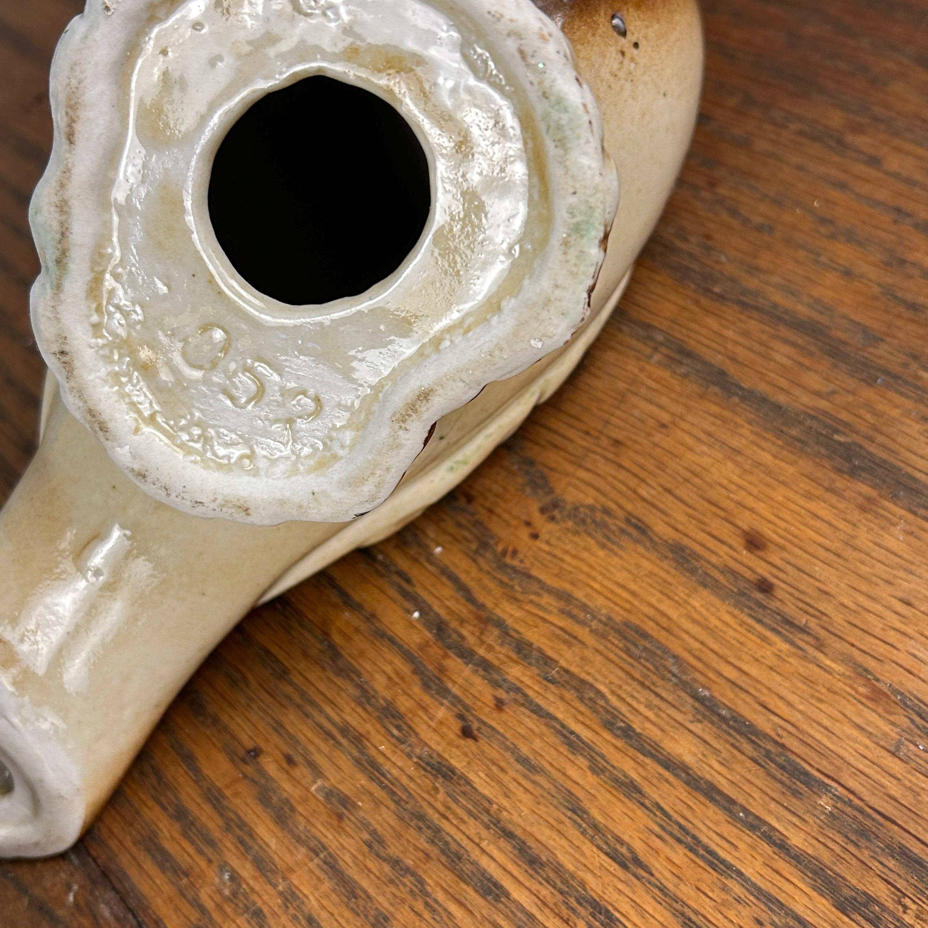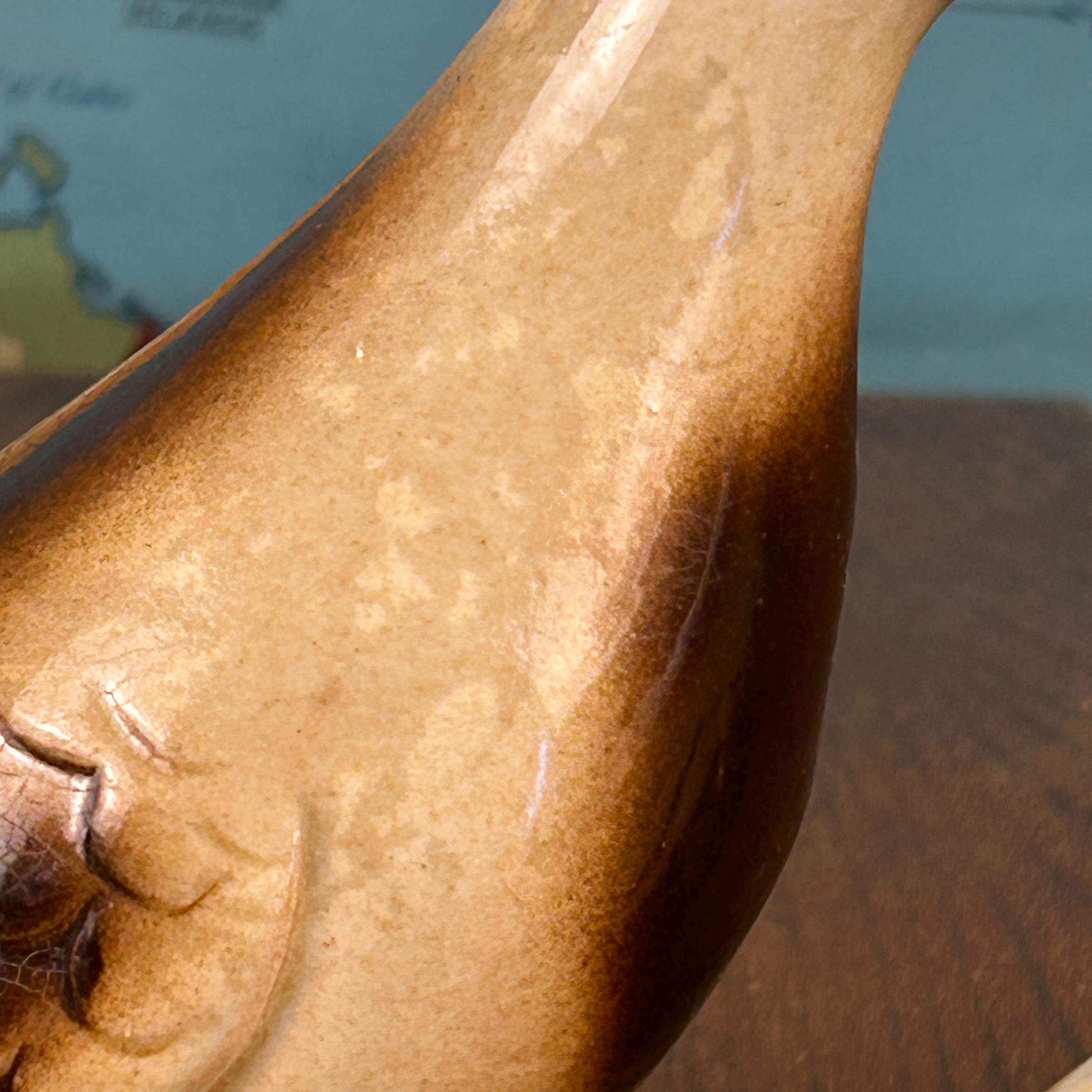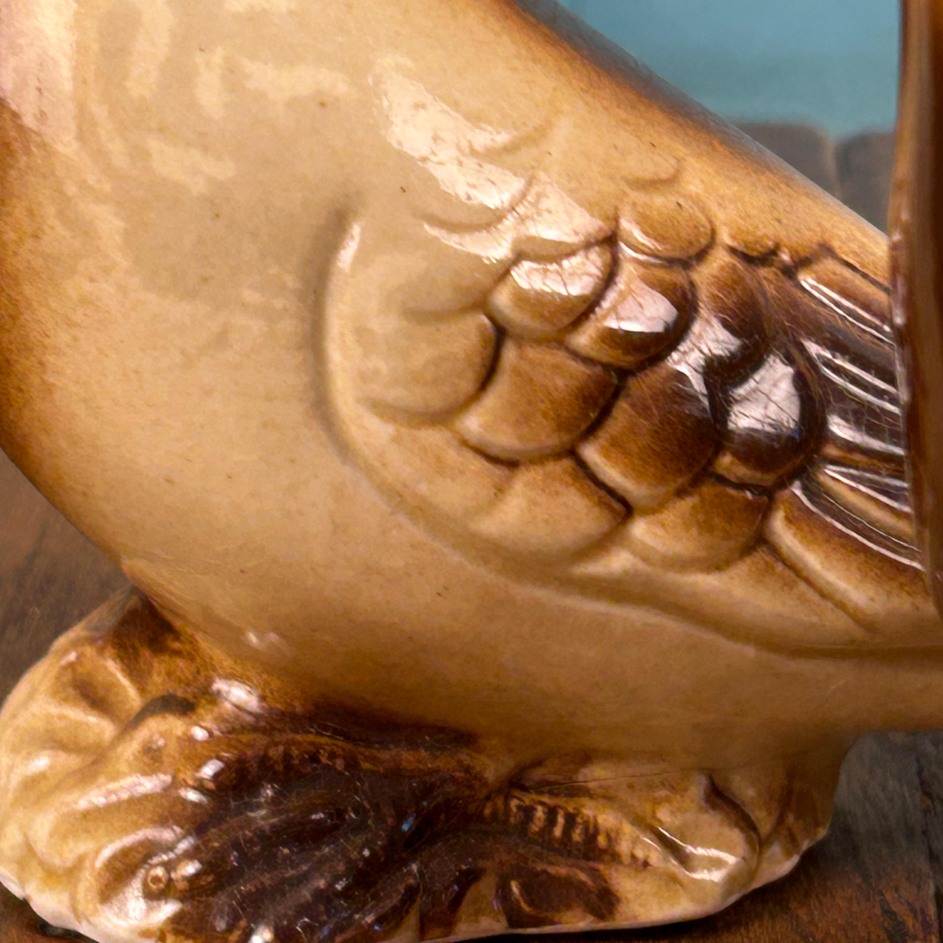 Each dove features tones of brown and tan with a luminous luster glaze, accented by orange beaks and eyes that give them sweet personality. The underside of each piece is marked 2052 and they are believed to have been made in Brazil, a country well known for producing collectible ceramic figurines during the mid-20th century.