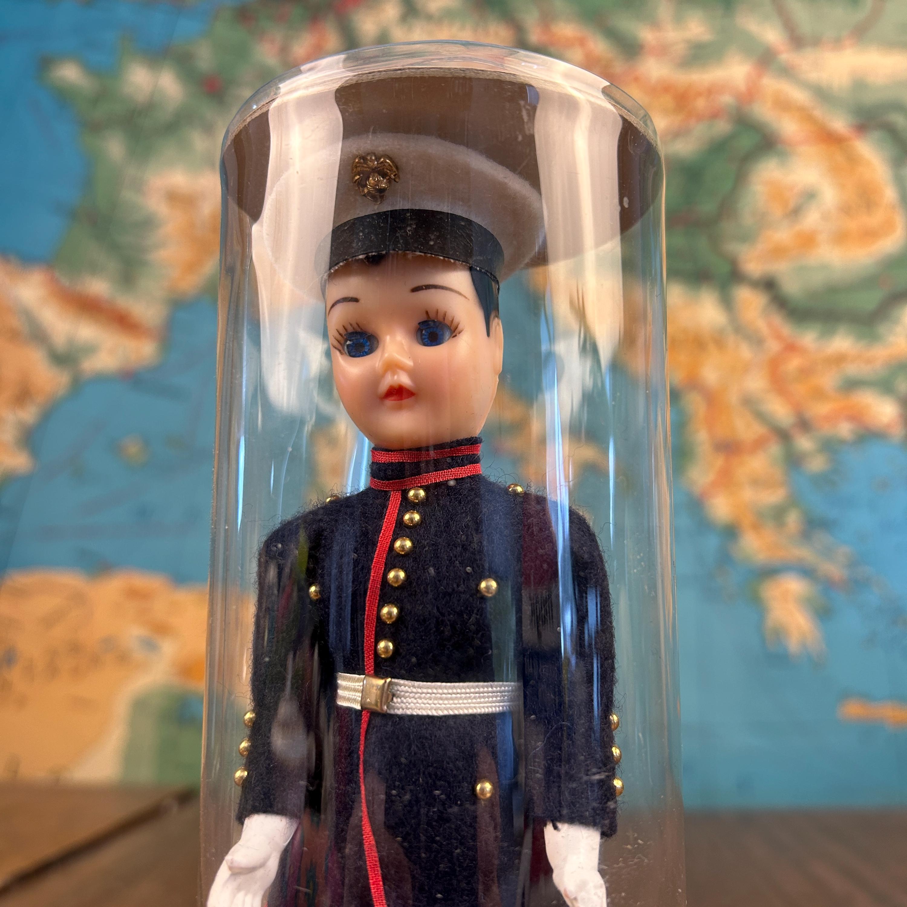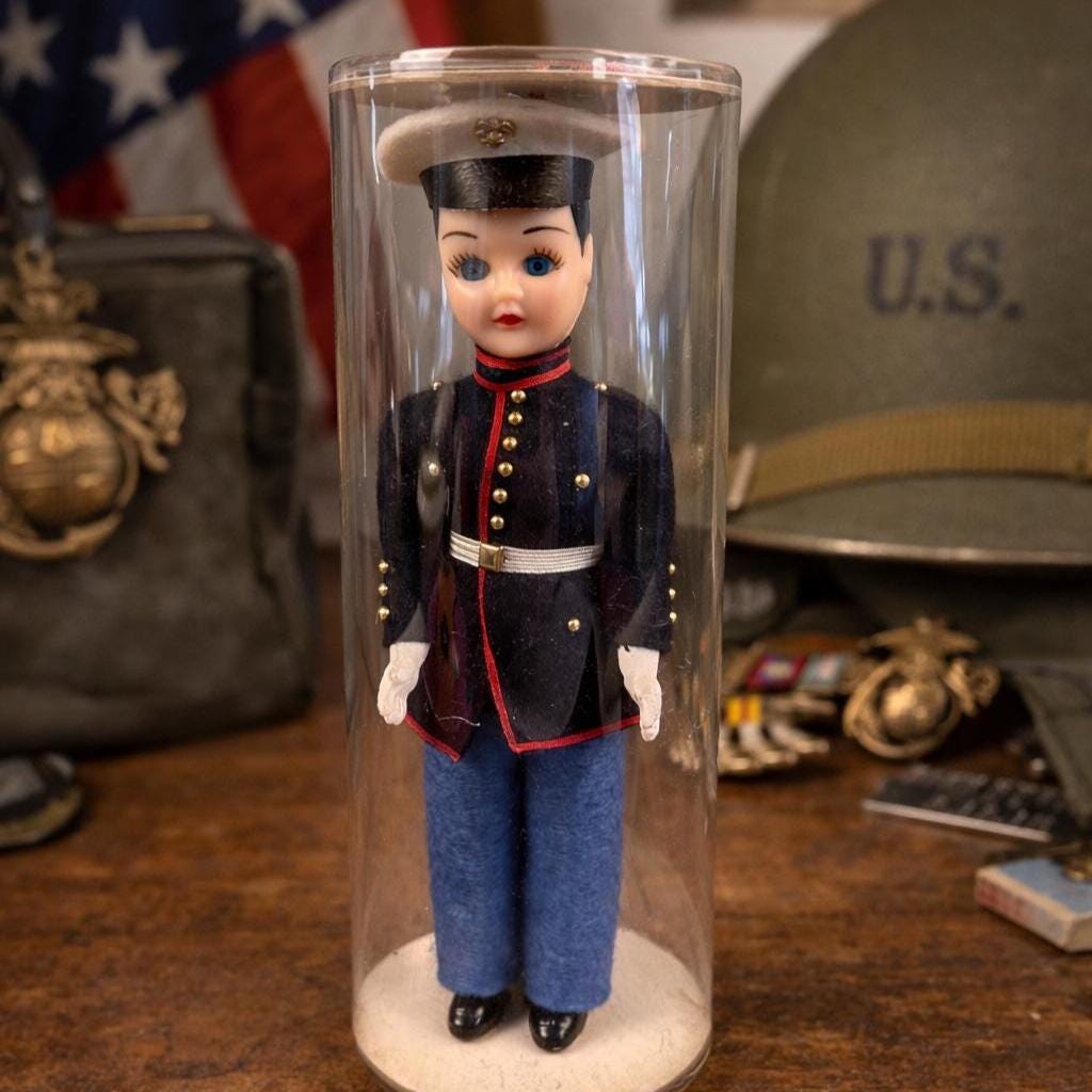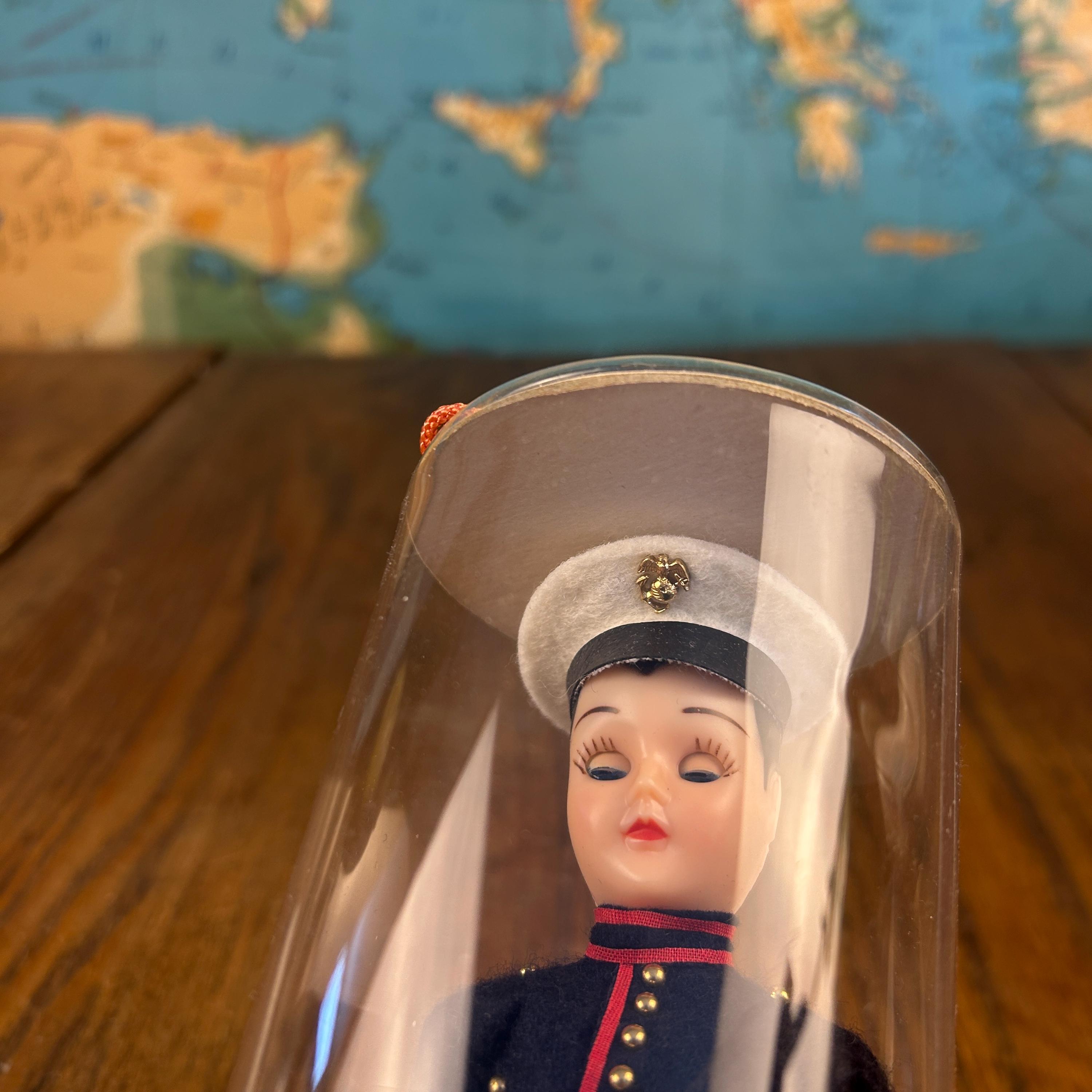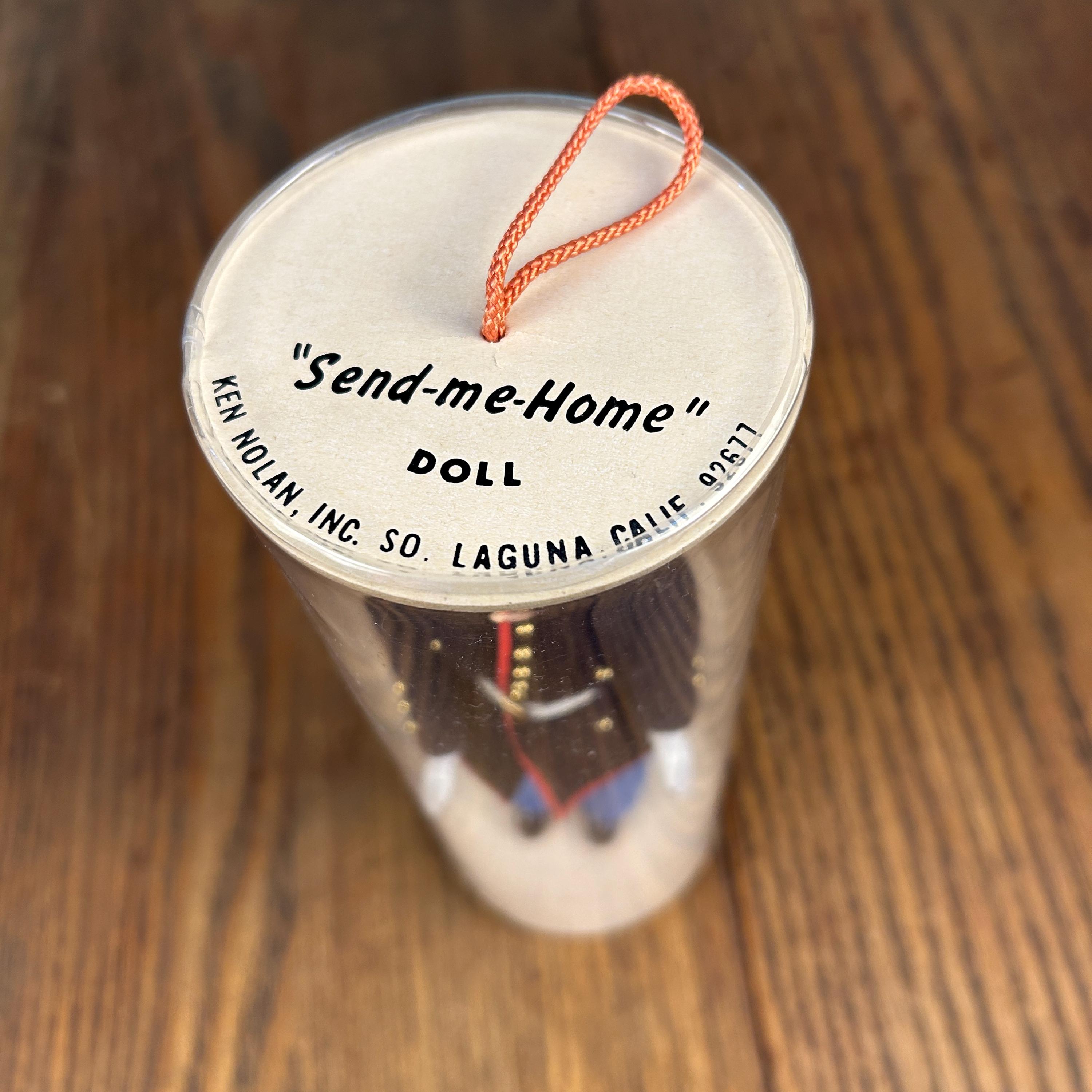 This is a post ww2 souvenir doll. A classic mid-century military collectible, this is a vintage "Send-me-Home" doll by Ken Nolan, Inc. of South Laguna, CA. The doll is presented in a United States Marine Corps (USMC) Dress Blues