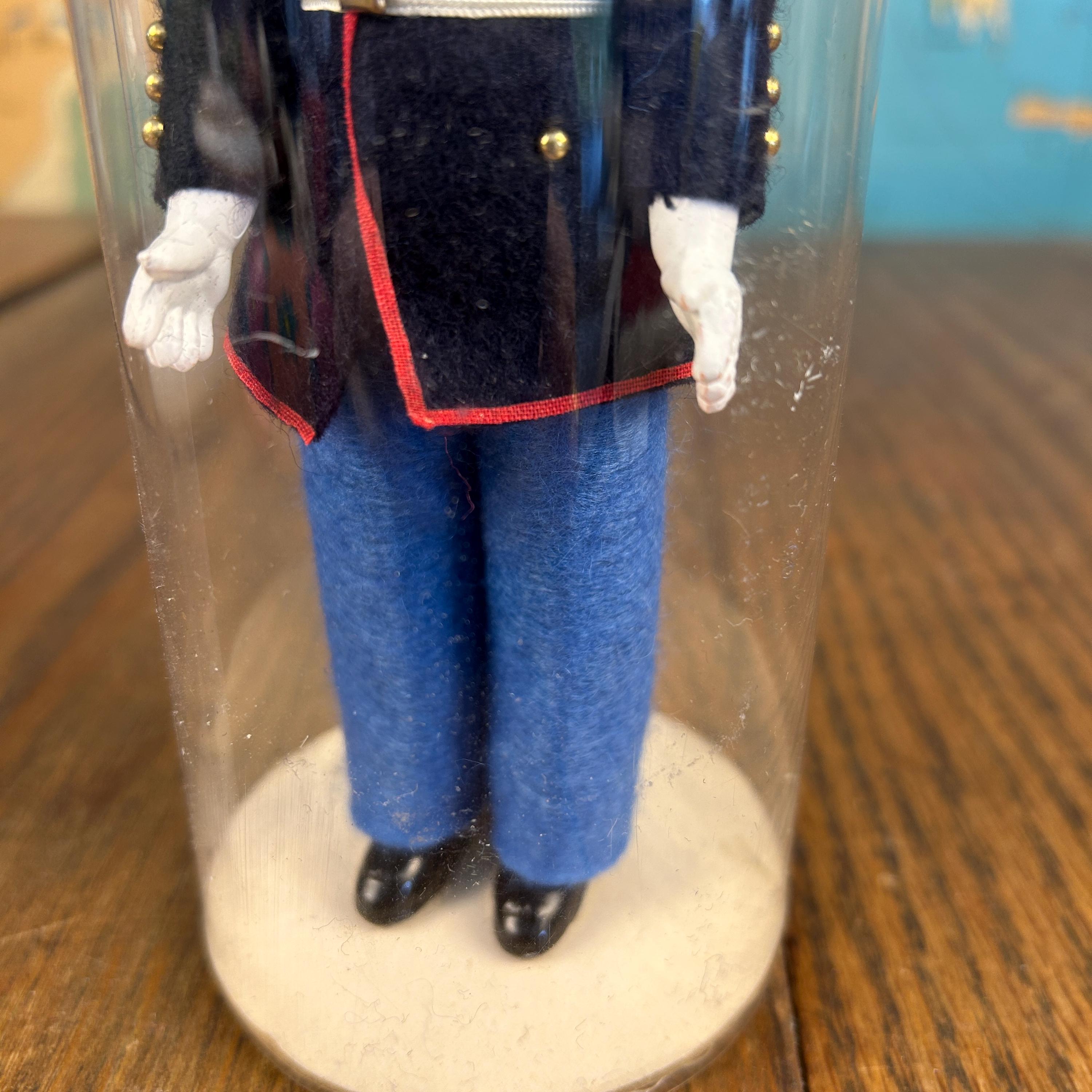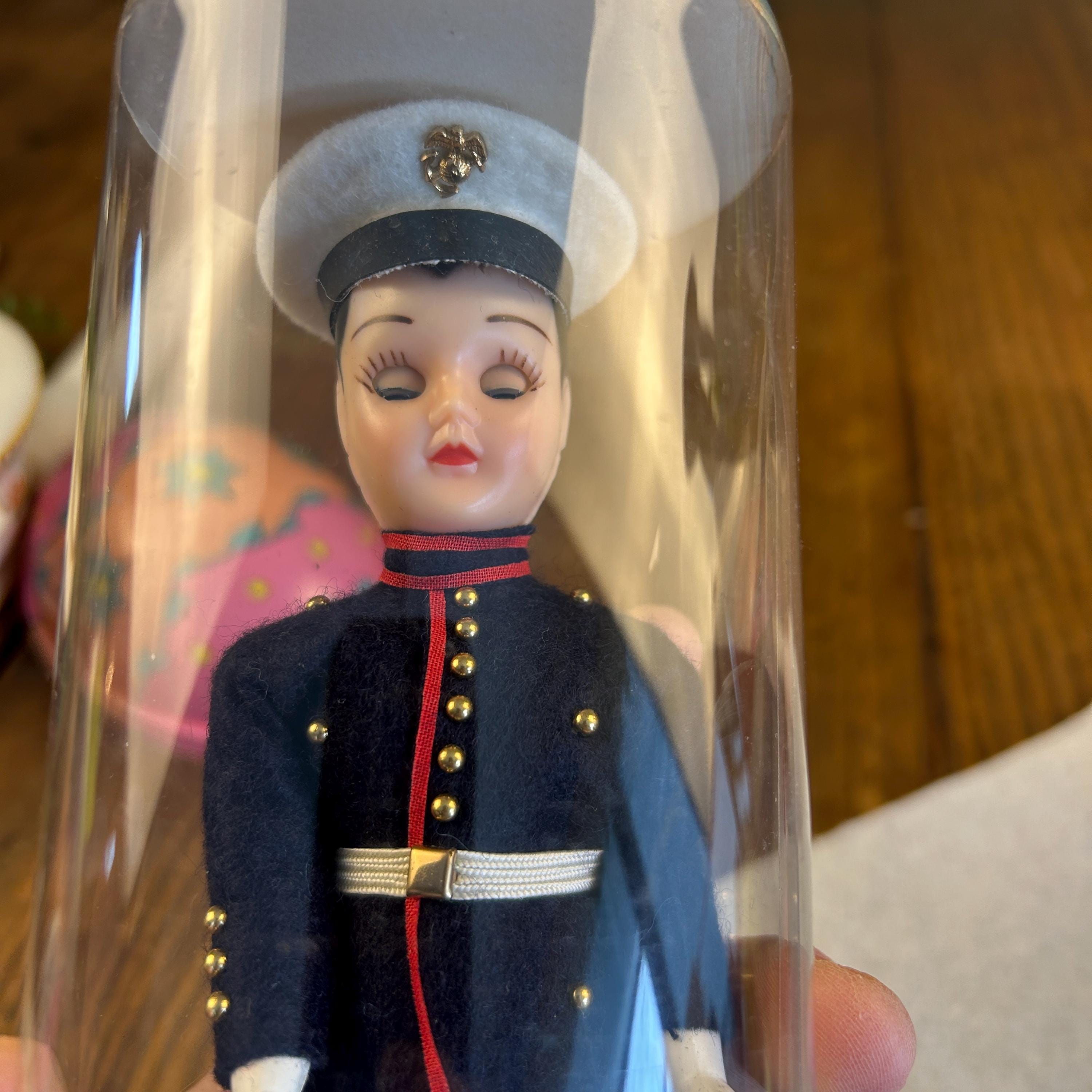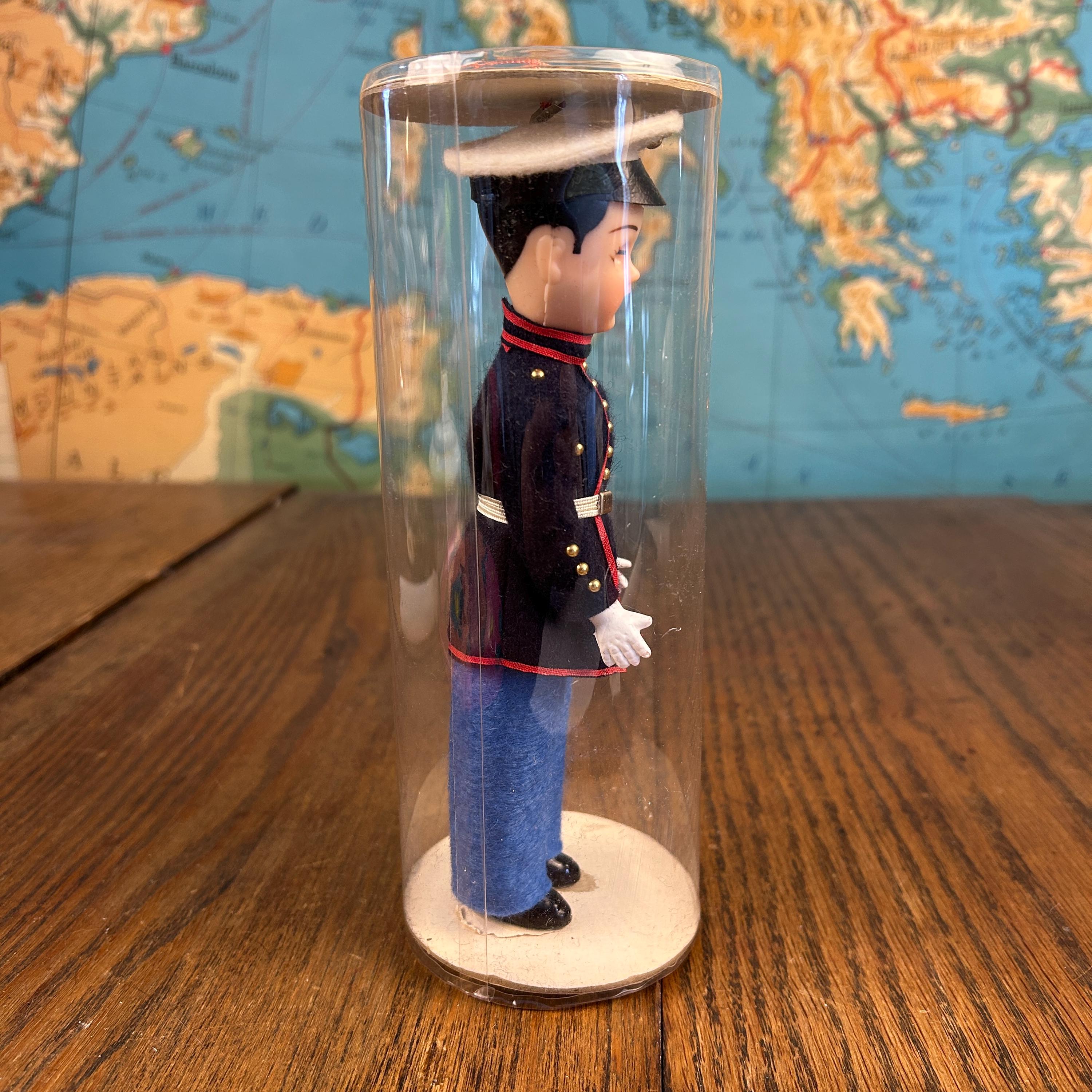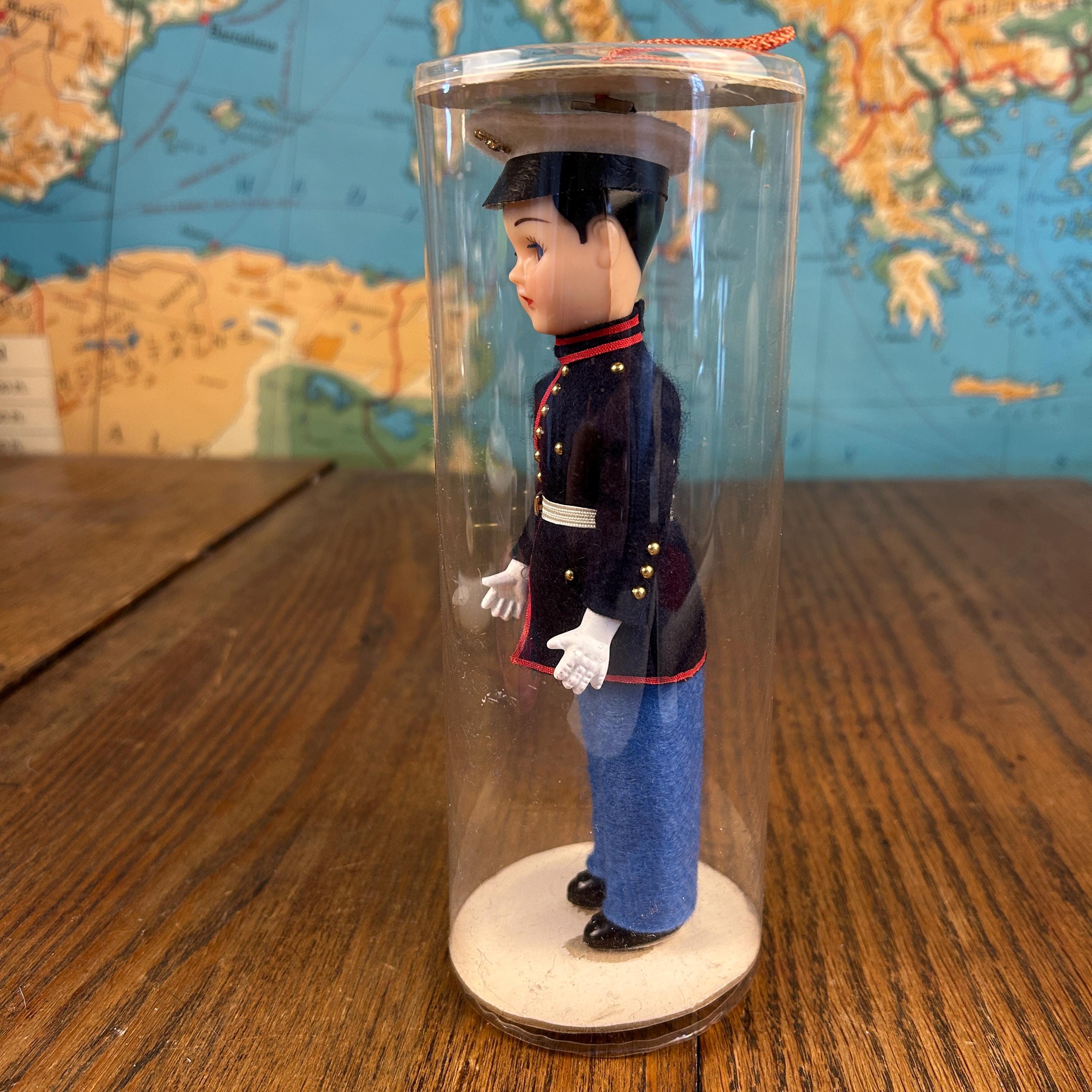 This is a post ww2 souvenir doll. A classic mid-century military collectible, this is a vintage "Send-me-Home" doll by Ken Nolan, Inc. of South Laguna, CA. The doll is presented in a United States Marine Corps (USMC) Dress Blues