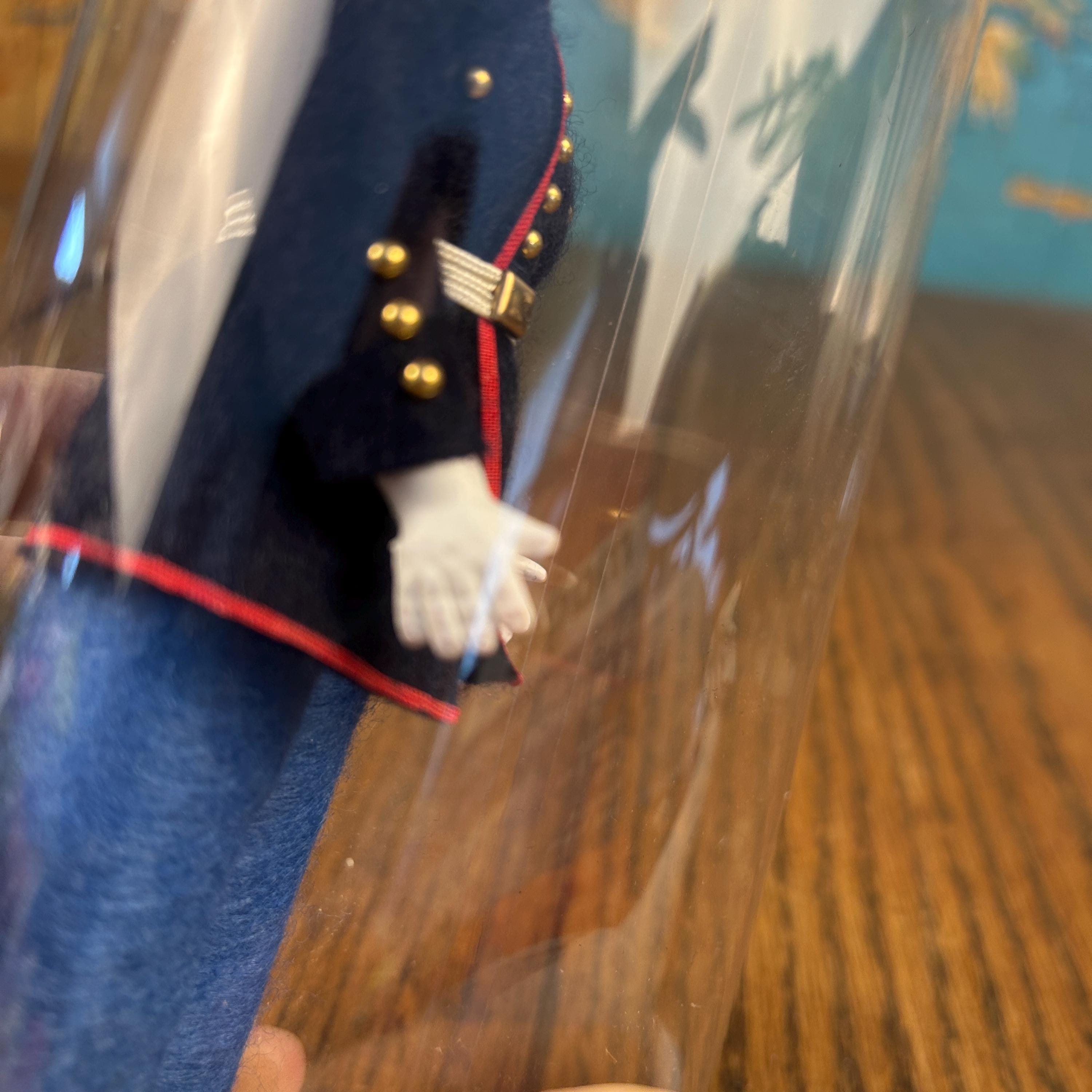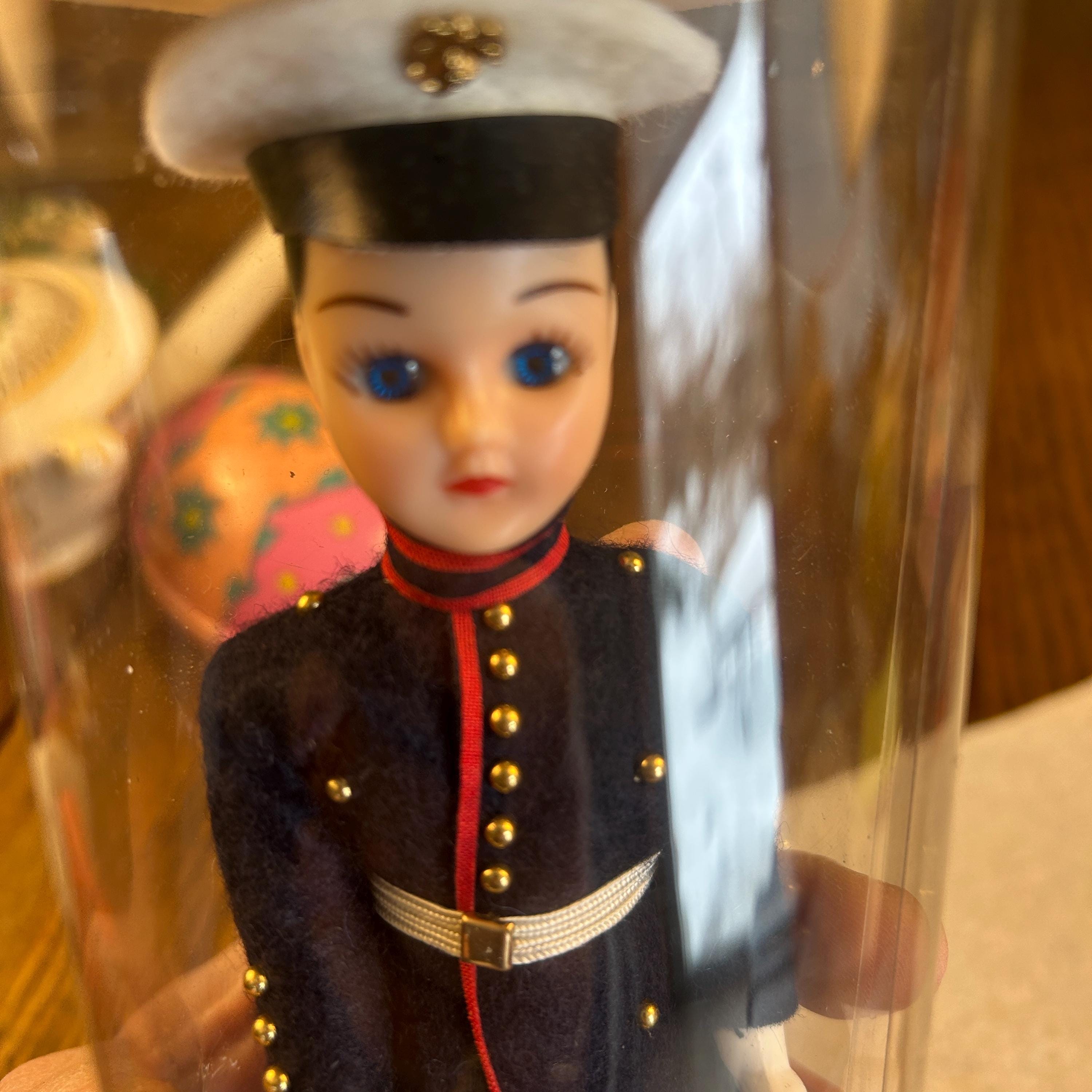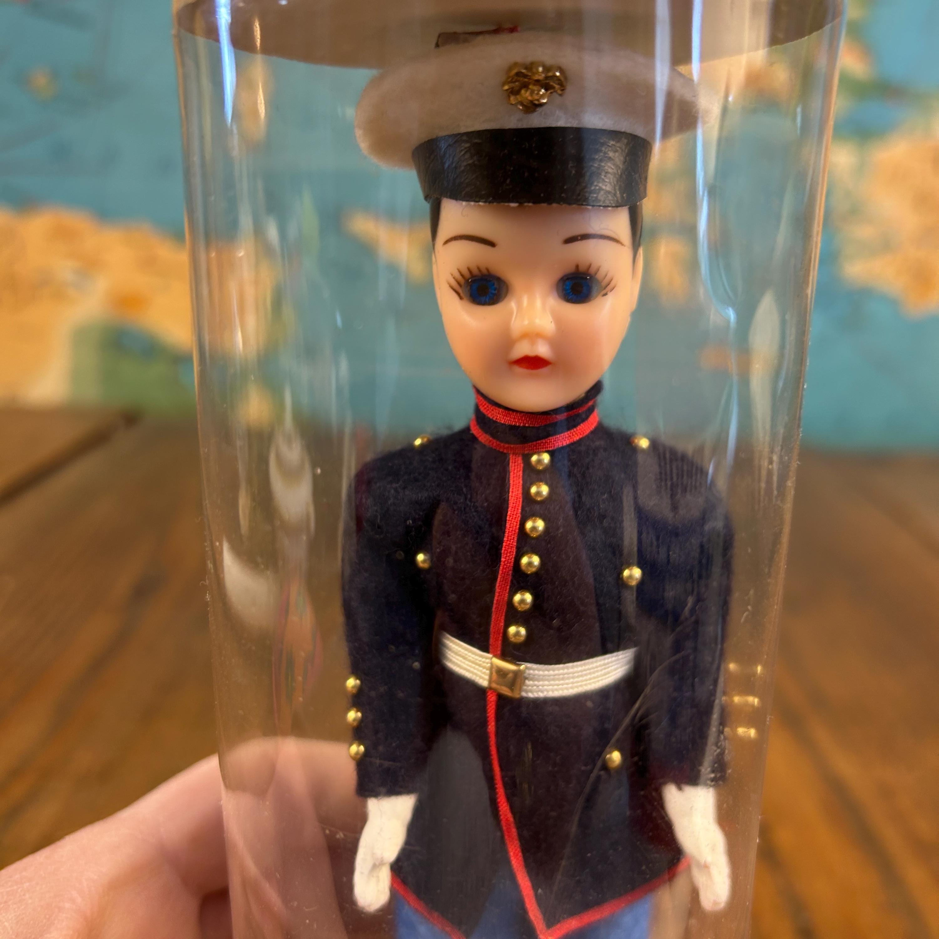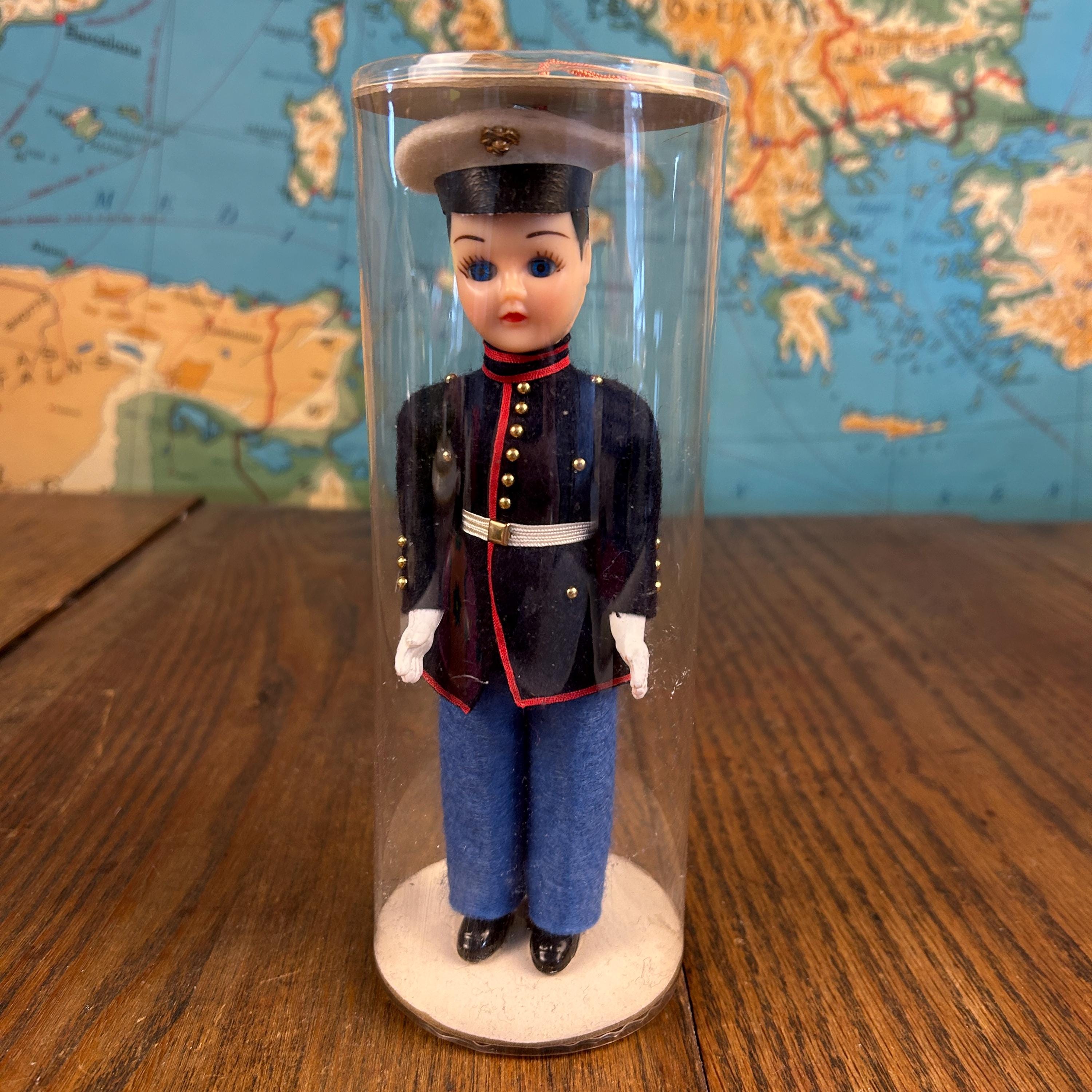 This is a post ww2 souvenir doll. A classic mid-century military collectible, this is a vintage "Send-me-Home" doll by Ken Nolan, Inc. of South Laguna, CA. The doll is presented in a United States Marine Corps (USMC) Dress Blues