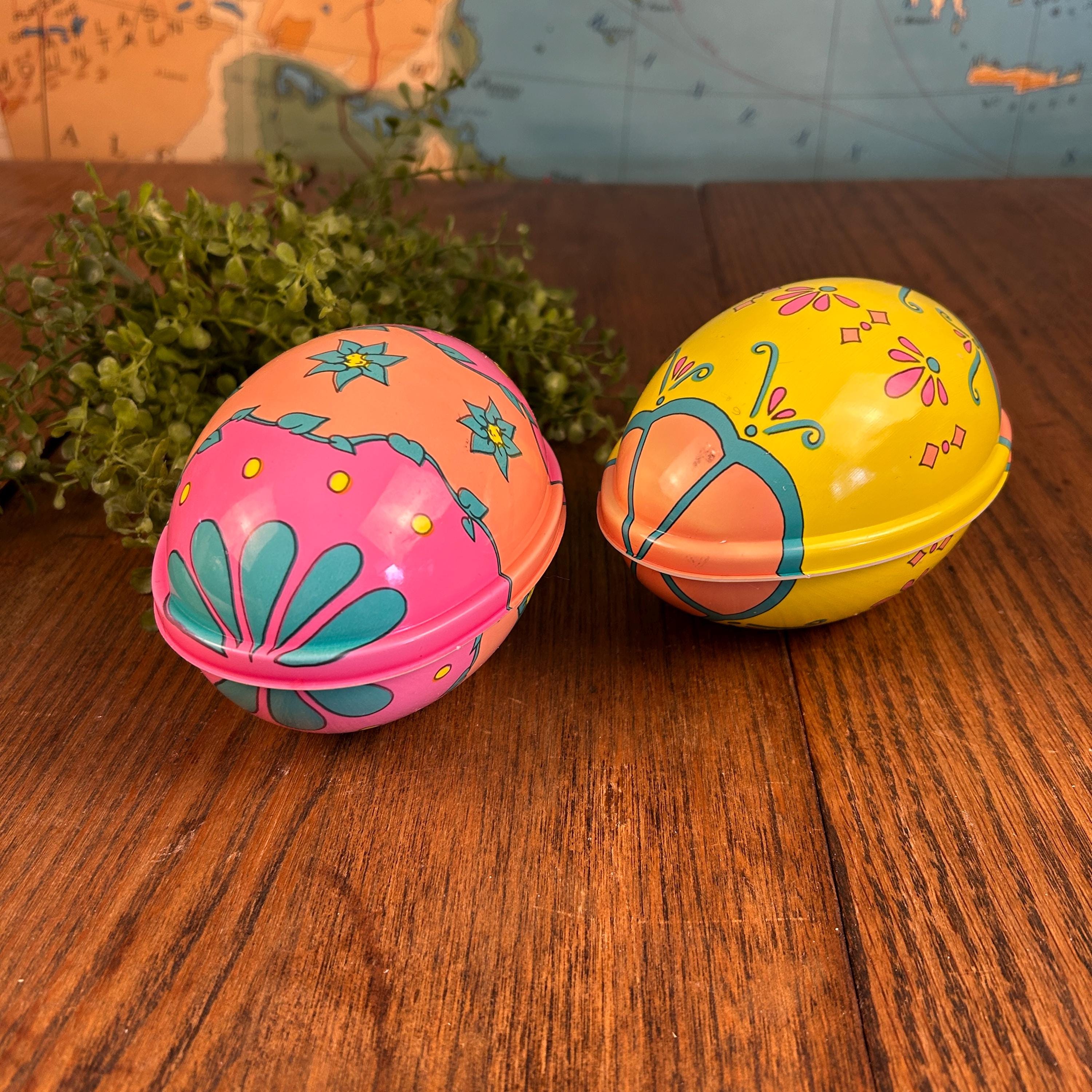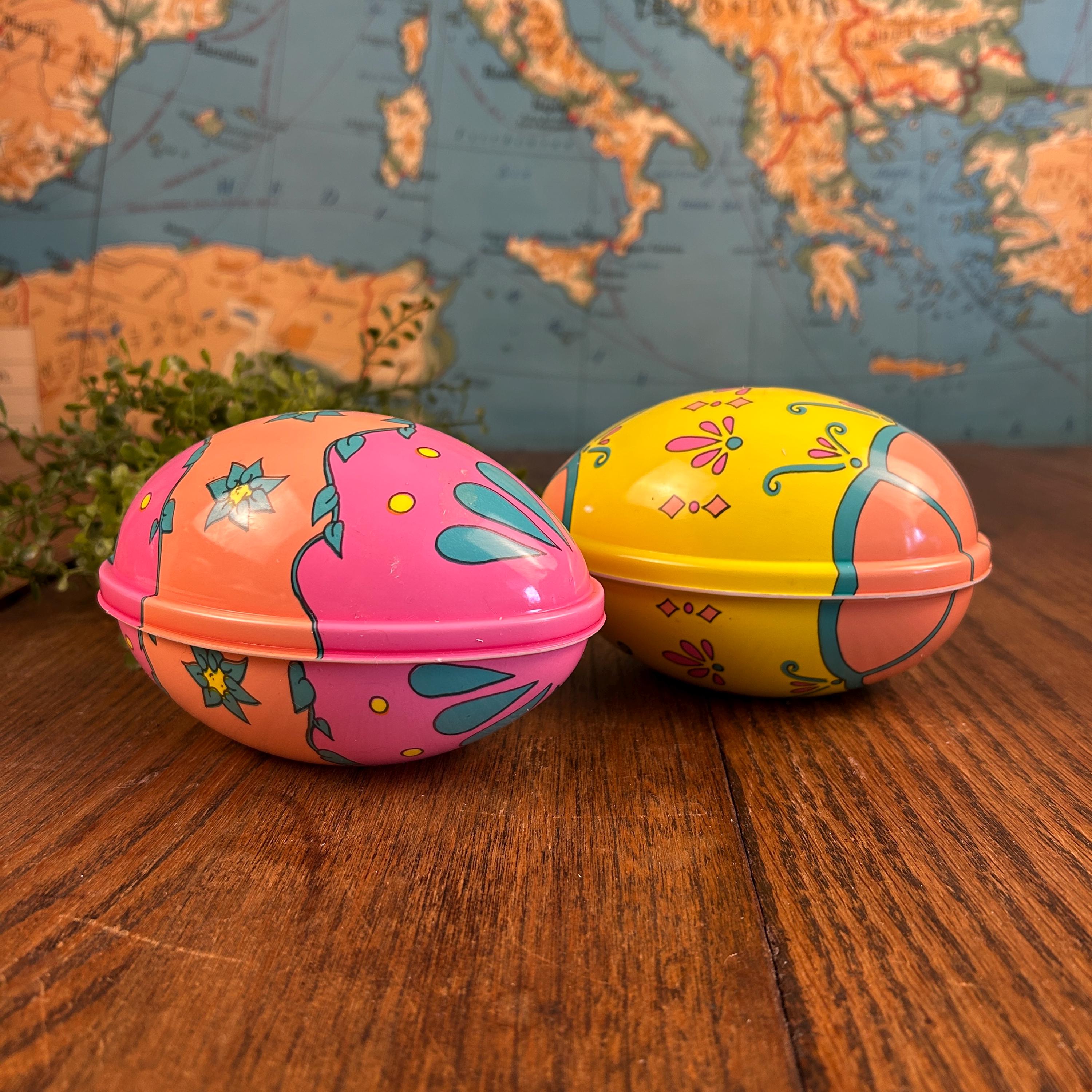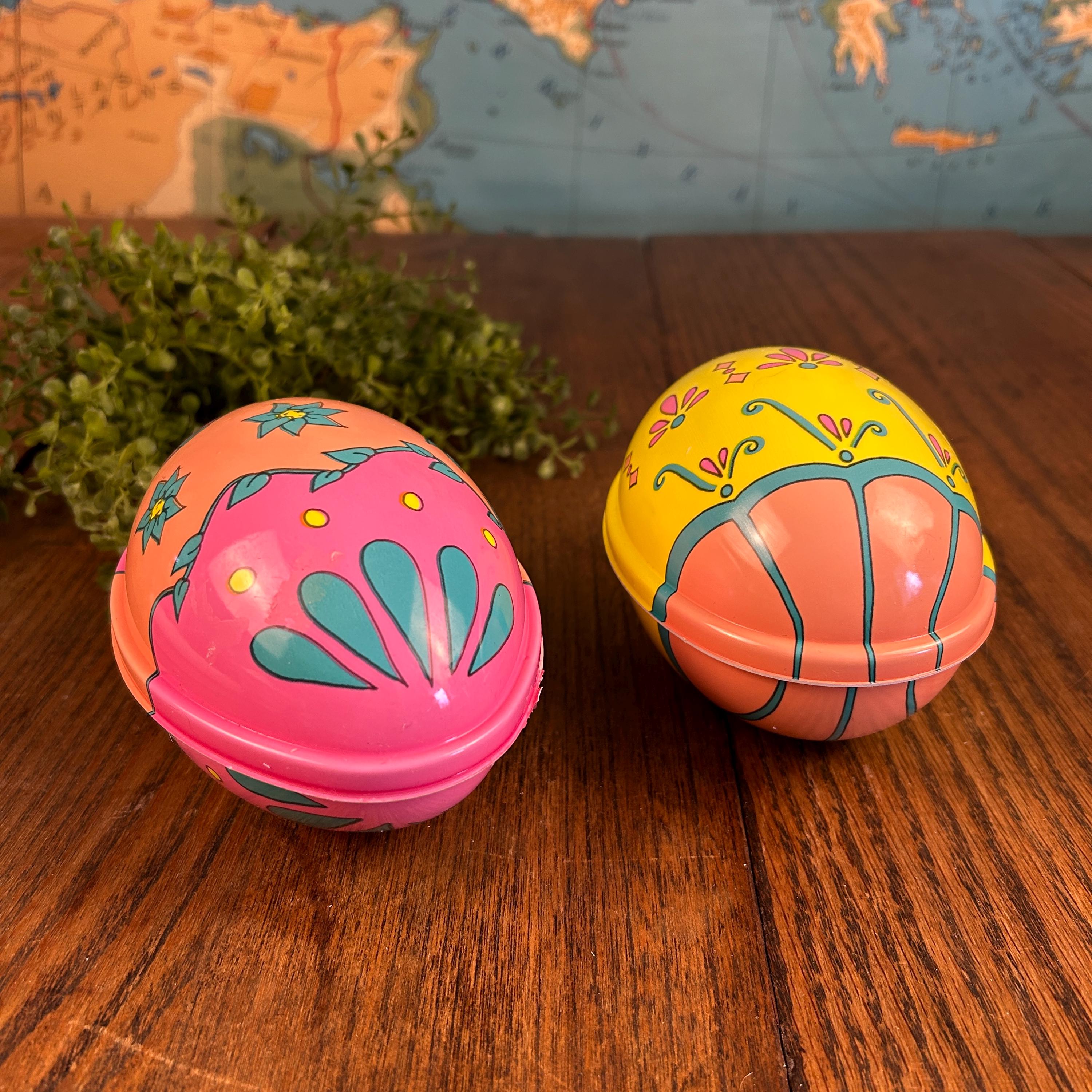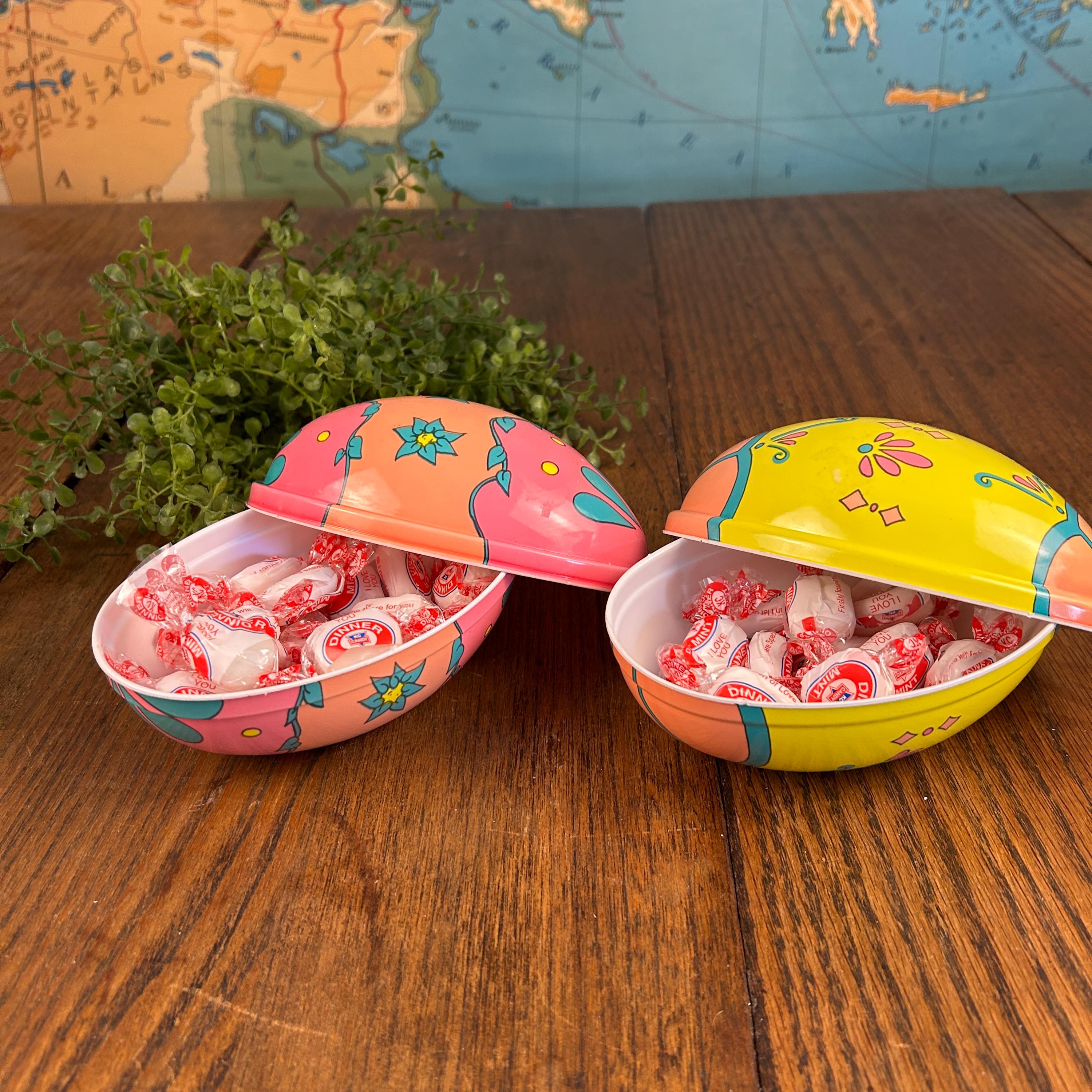Add a pop of cheerful vintage color to your spring décor with these vintage hard plastic floral Easter eggs. Each egg features a bright, vibrant floral design that perfectly captures that classic retro Easter look.