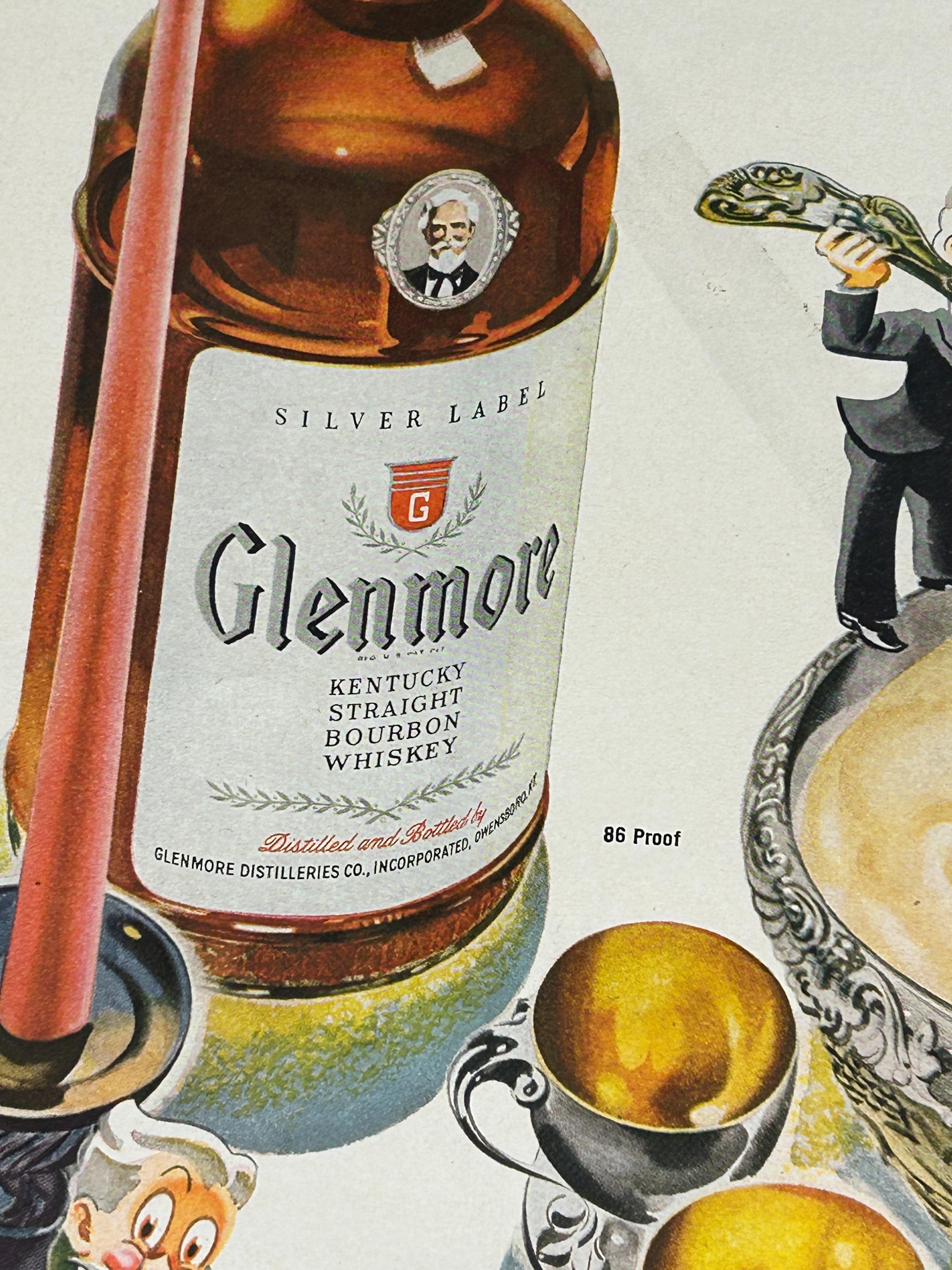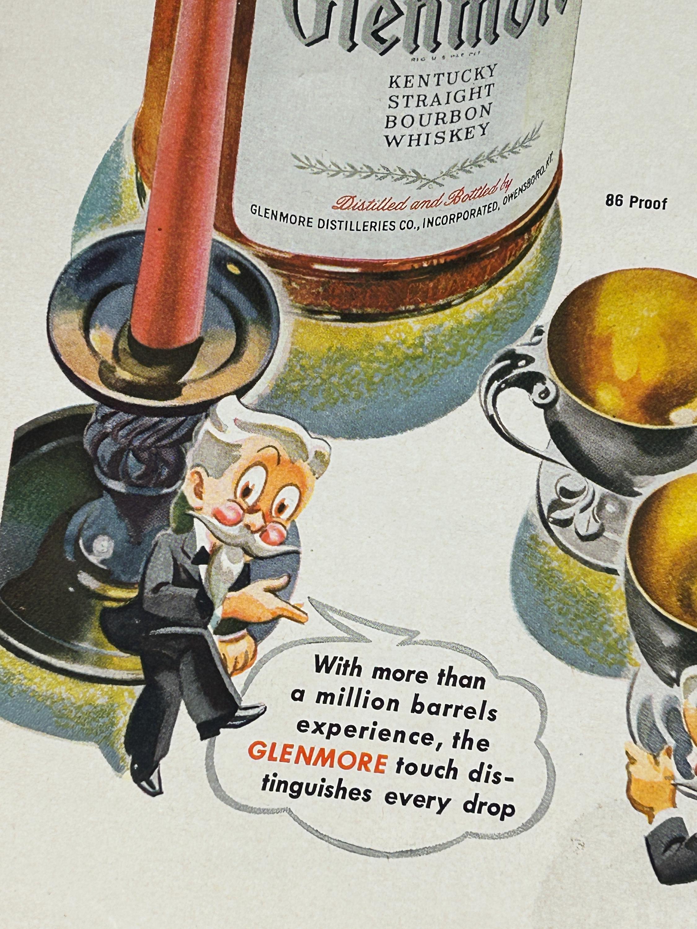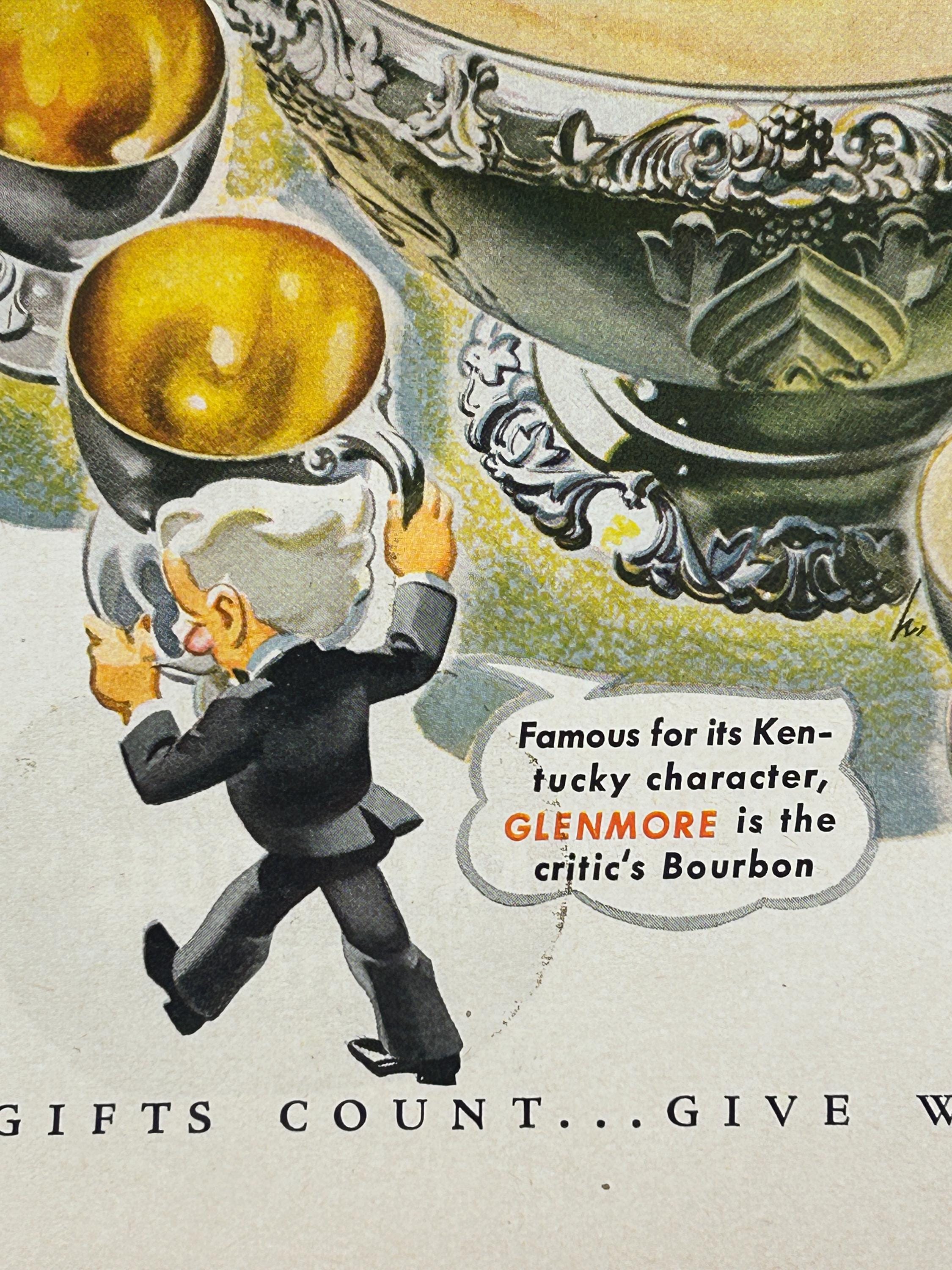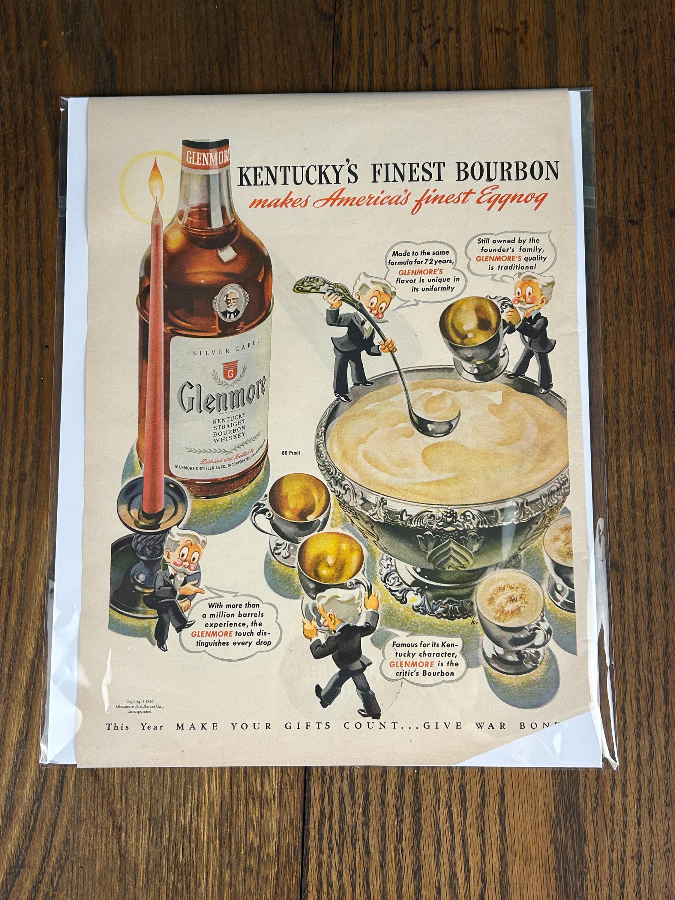 This is an original 1943 print advertisement for Glenmore Distilleries Glenmore Kentucky Bourbon Whiskey. A fantastic example of World War II–era American advertising, this ad showcases the bold illustration and confident typography that made 1940s liquor ads so memorable.