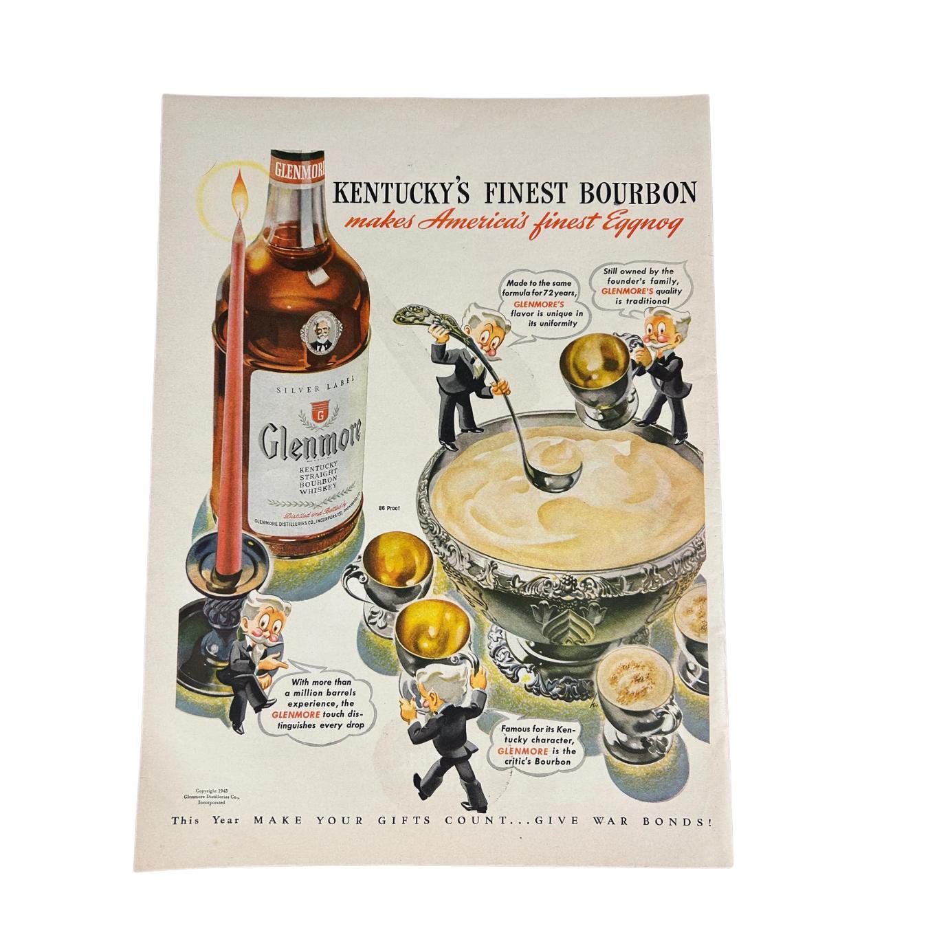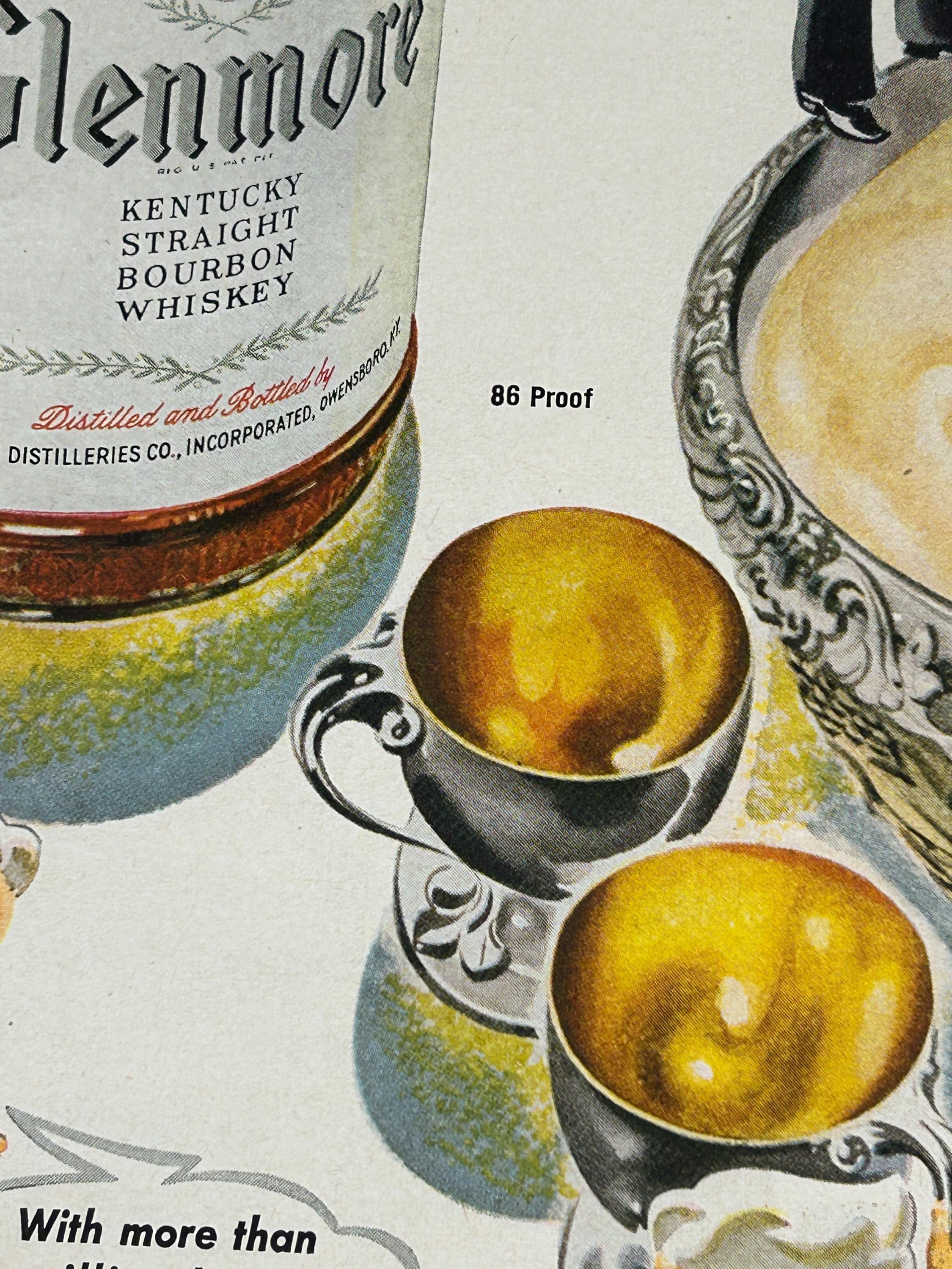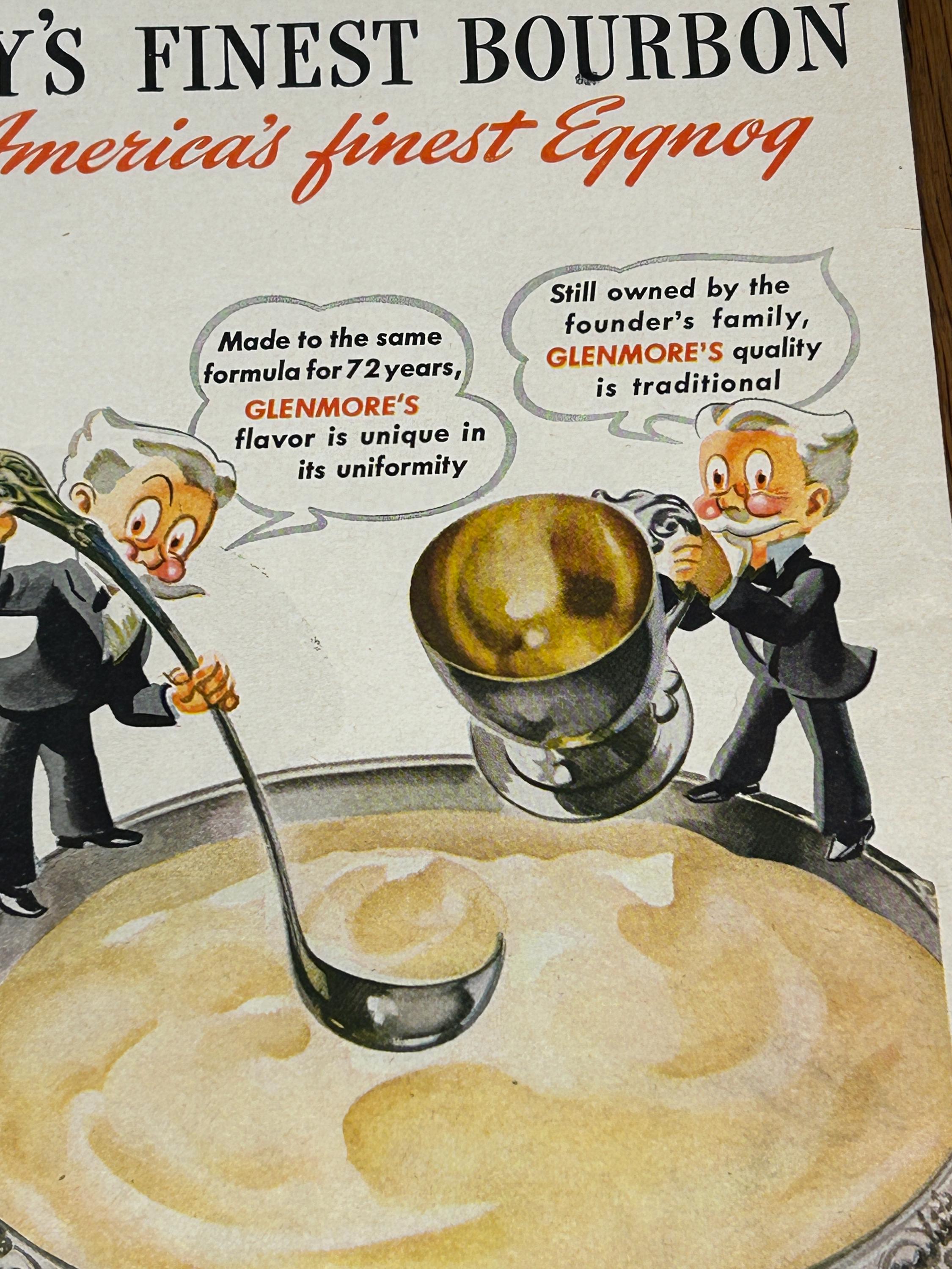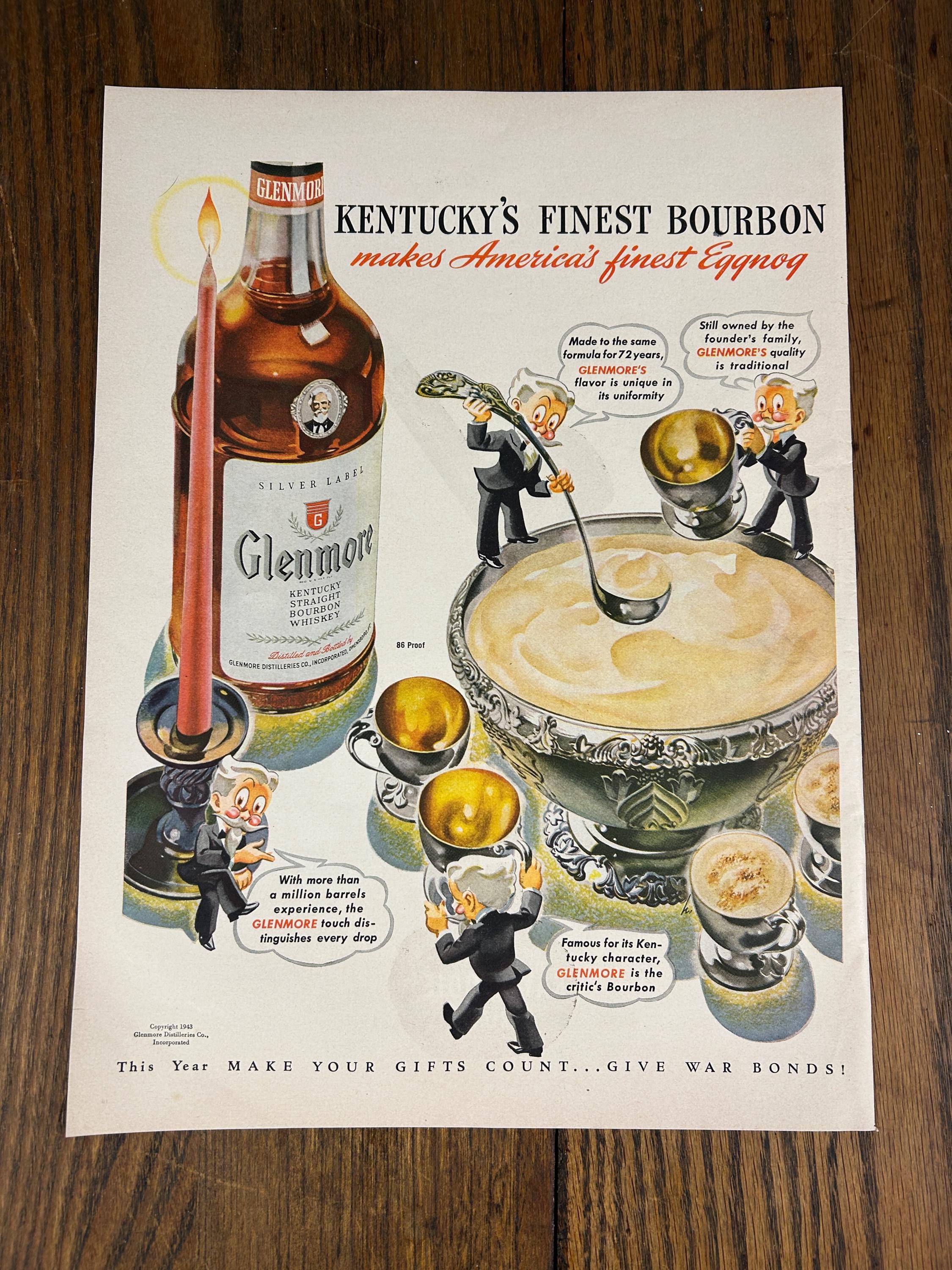 This is an original 1943 print advertisement for Glenmore Distilleries Glenmore Kentucky Bourbon Whiskey. A fantastic example of World War II–era American advertising, this ad showcases the bold illustration and confident typography that made 1940s liquor ads so memorable.
