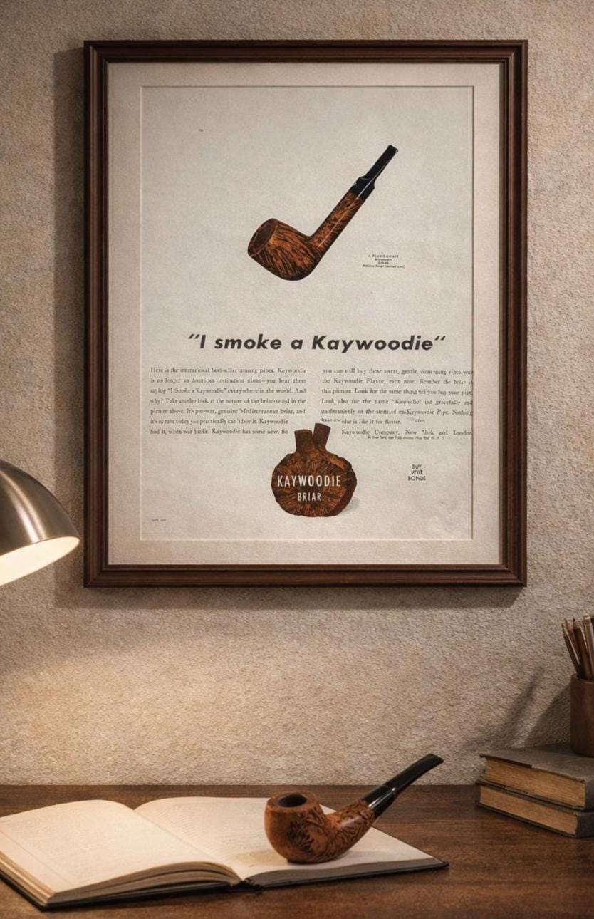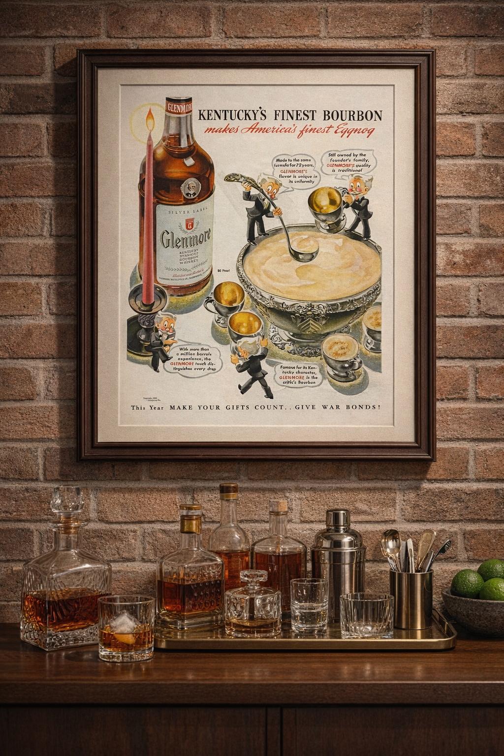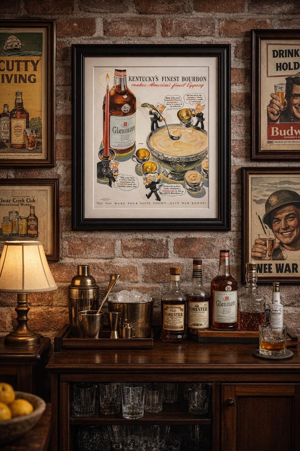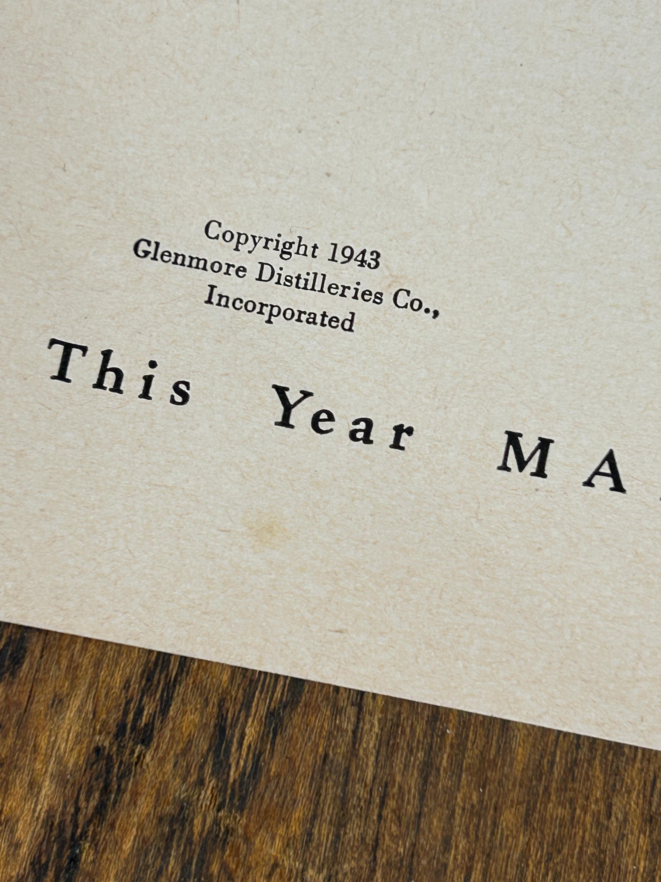 This is an original 1943 print advertisement for Glenmore Distilleries Glenmore Kentucky Bourbon Whiskey. A fantastic example of World War II–era American advertising, this ad showcases the bold illustration and confident typography that made 1940s liquor ads so memorable.