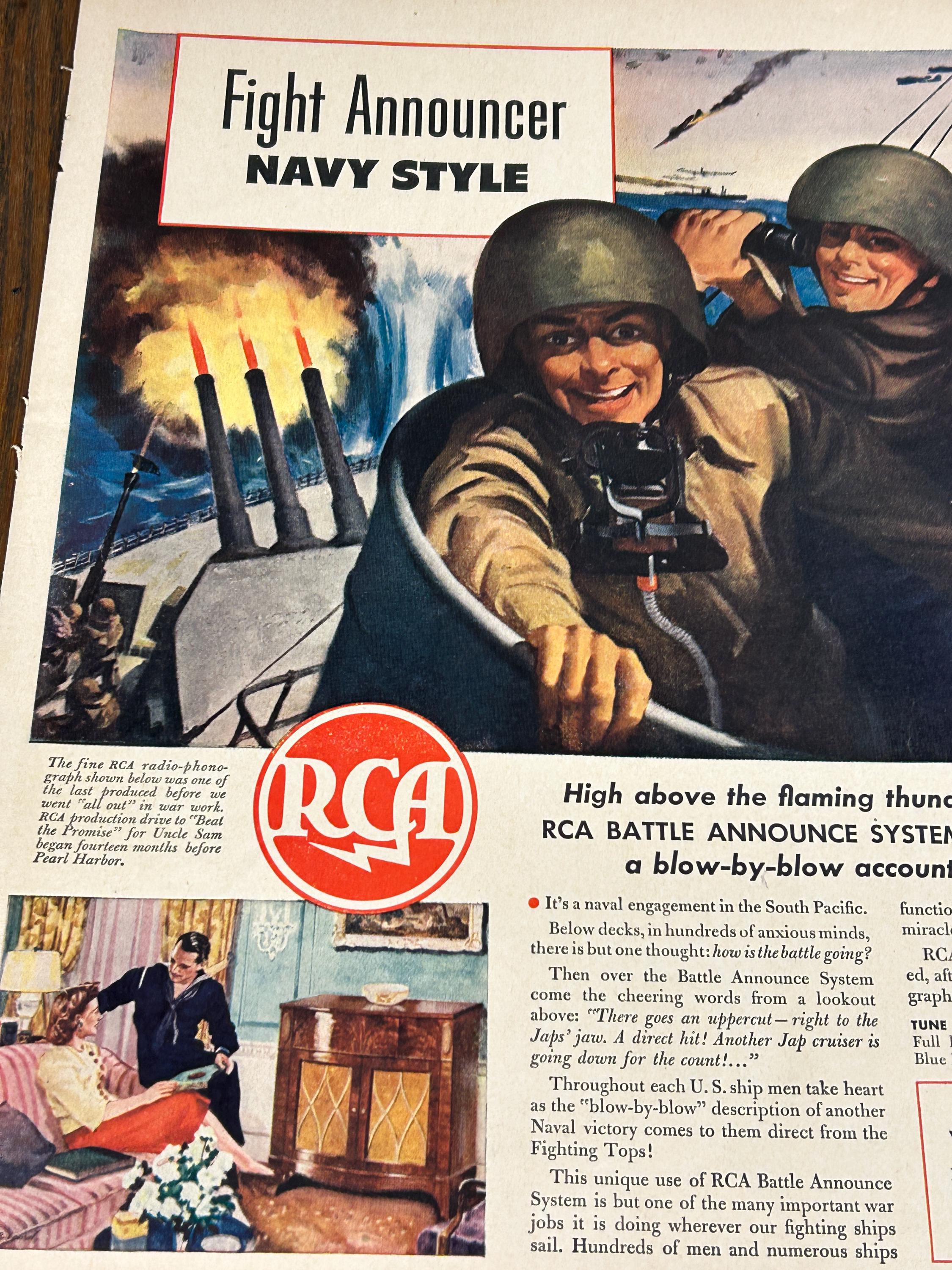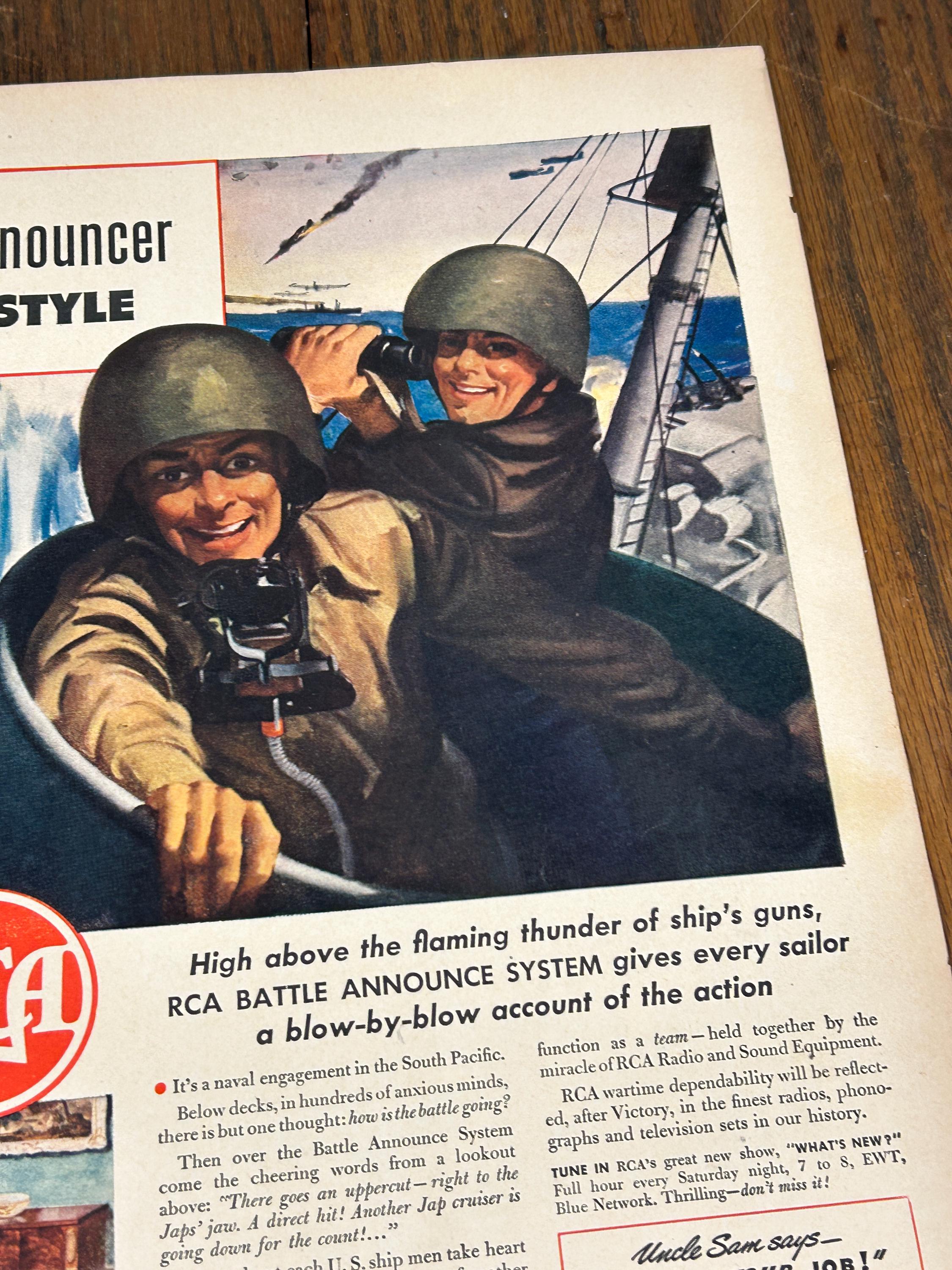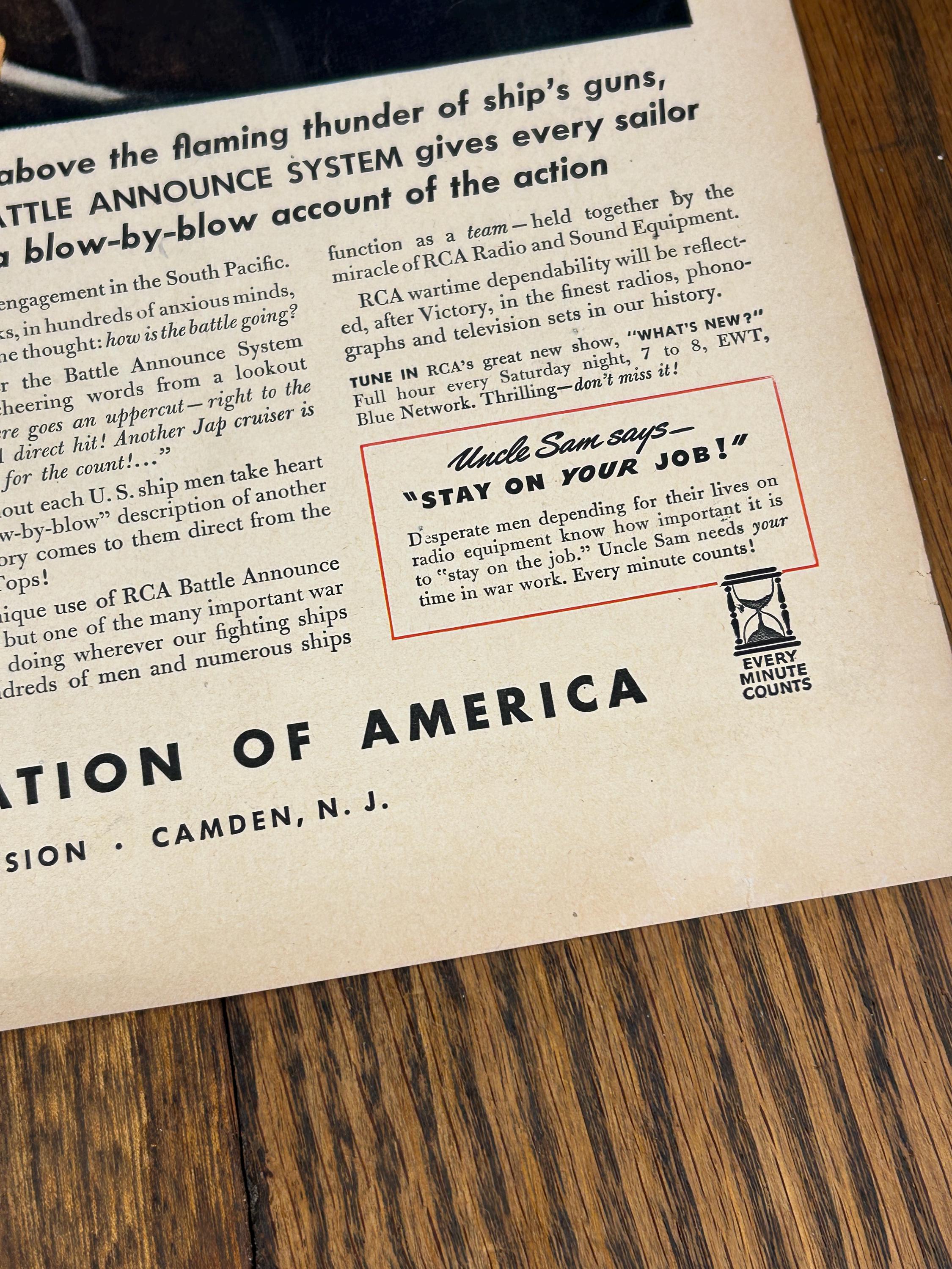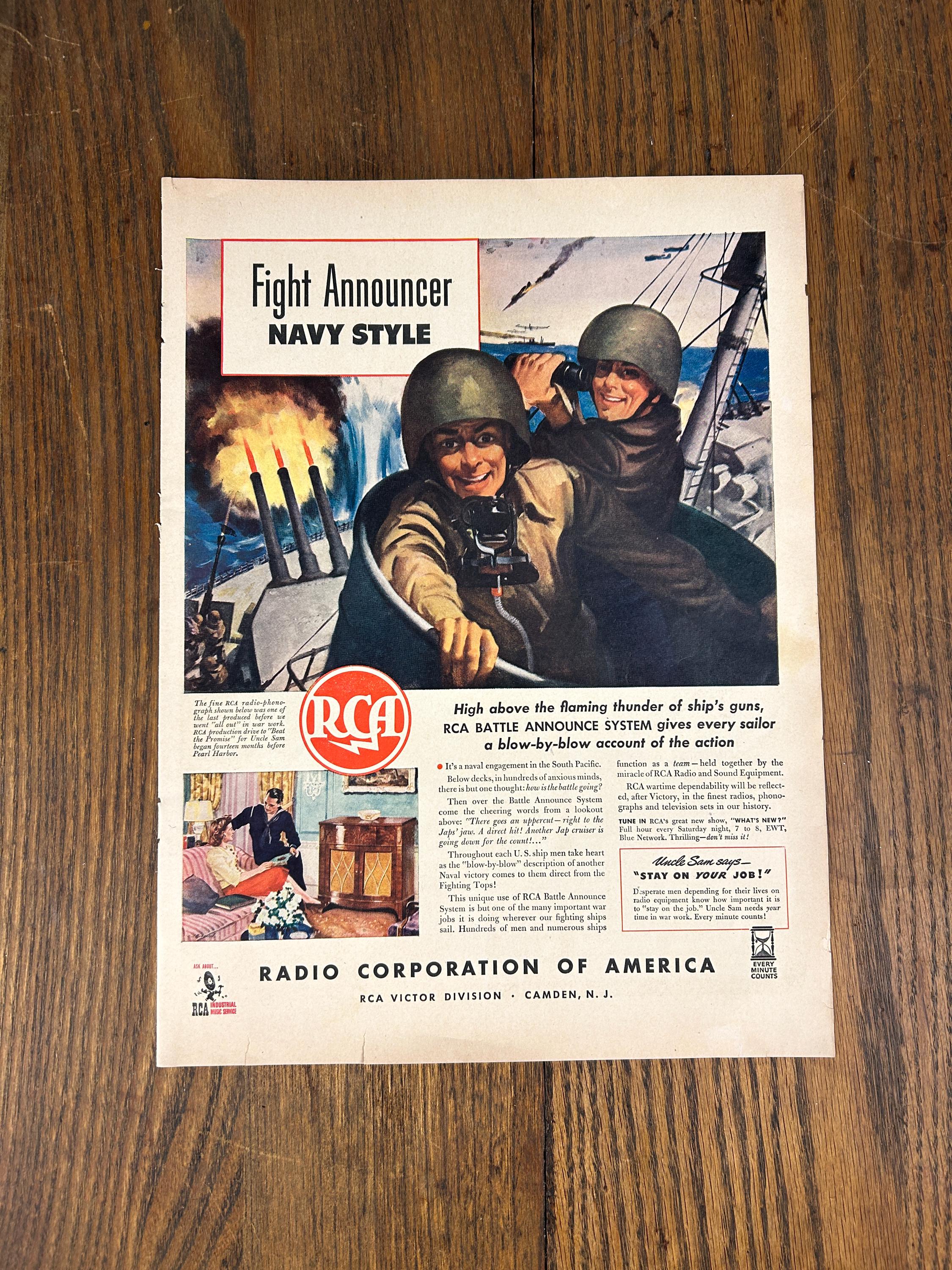 The ad showcases RCA’s “Battle Announce System,” a critical shipboard communication system used on U.S. Navy vessels. The dramatic copy compares real naval combat communication to a fast-paced, “blow-by-blow” fight broadcast, highlighting the speed, clarity, and reliability of RCA wartime technology.