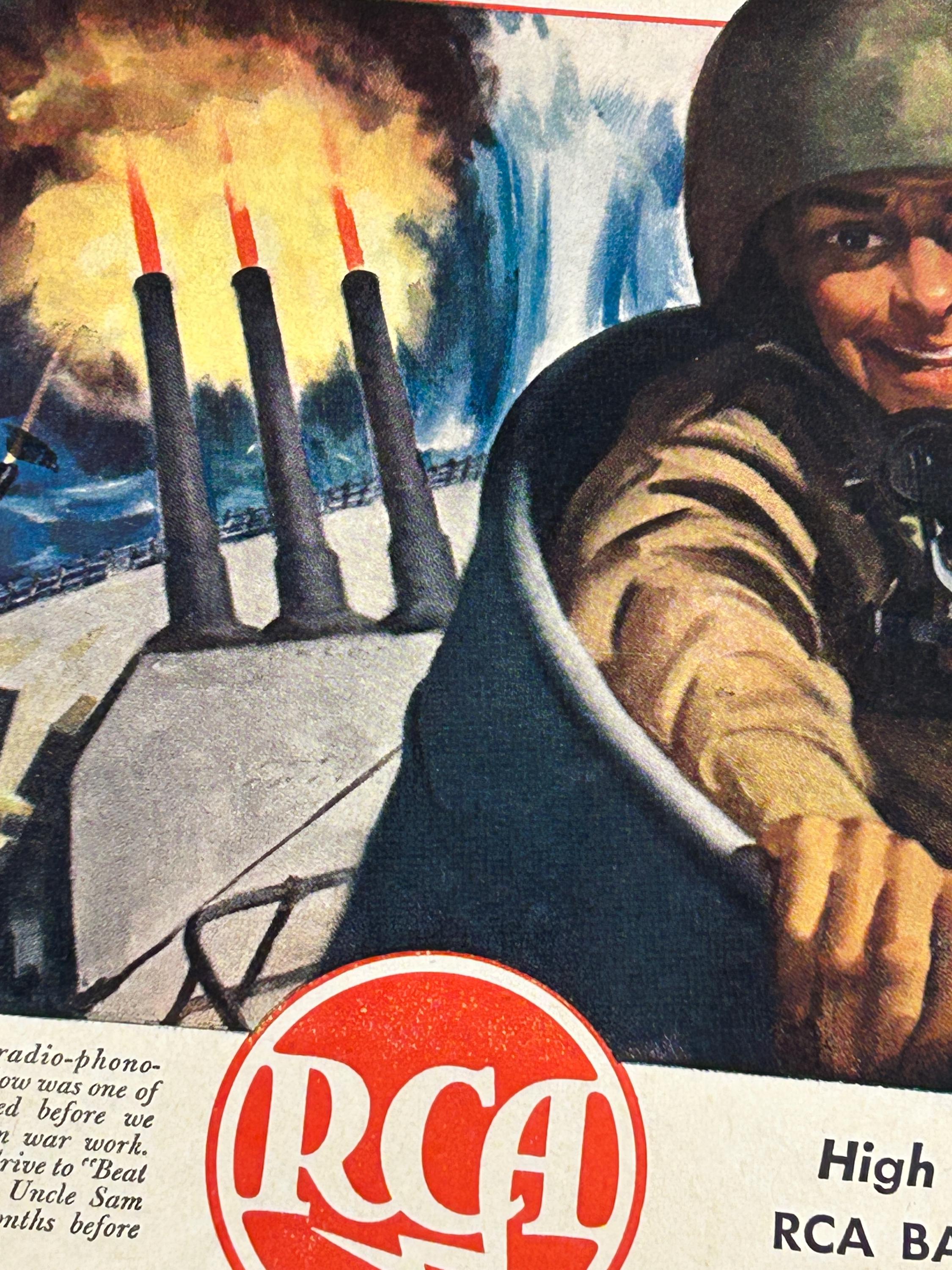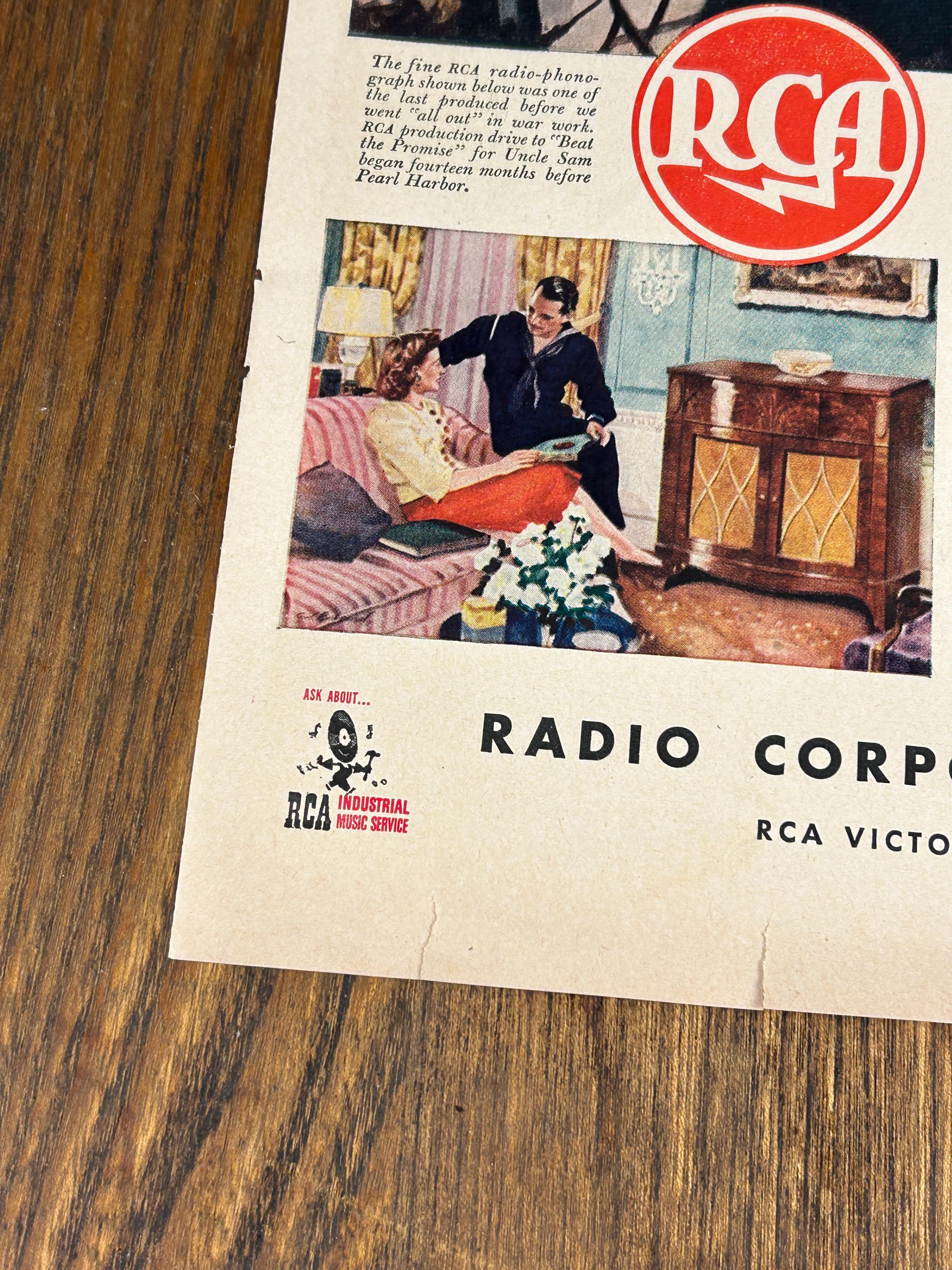 This is an original 1943 magazine advertisement from RCA (Radio Corporation of America), RCA Victor Division, created during the height of World War II.