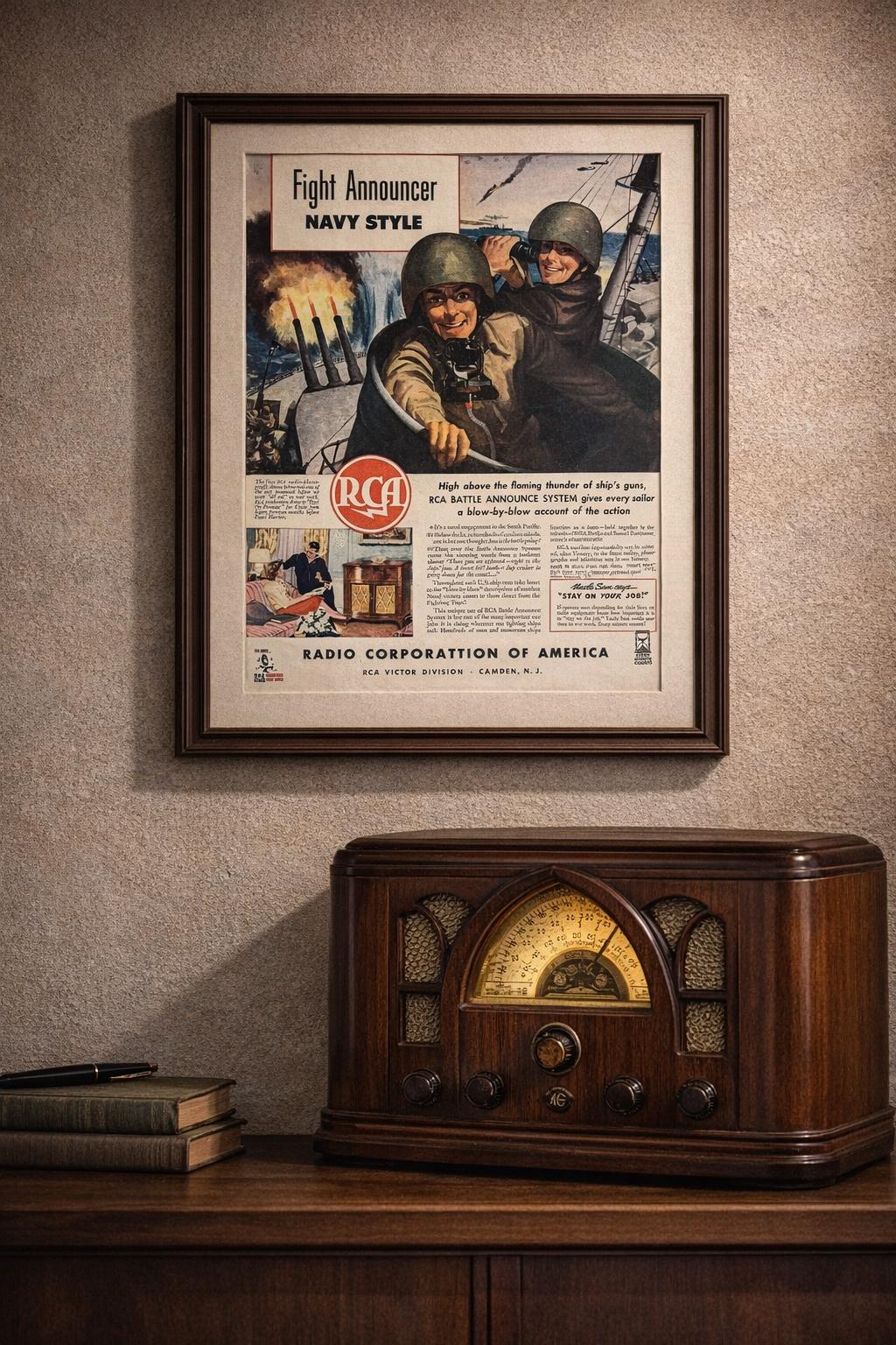 A striking collectible for fans of vintage electronics, military history, WWII memorabilia, or retro industrial advertising.