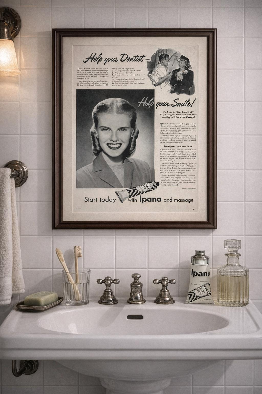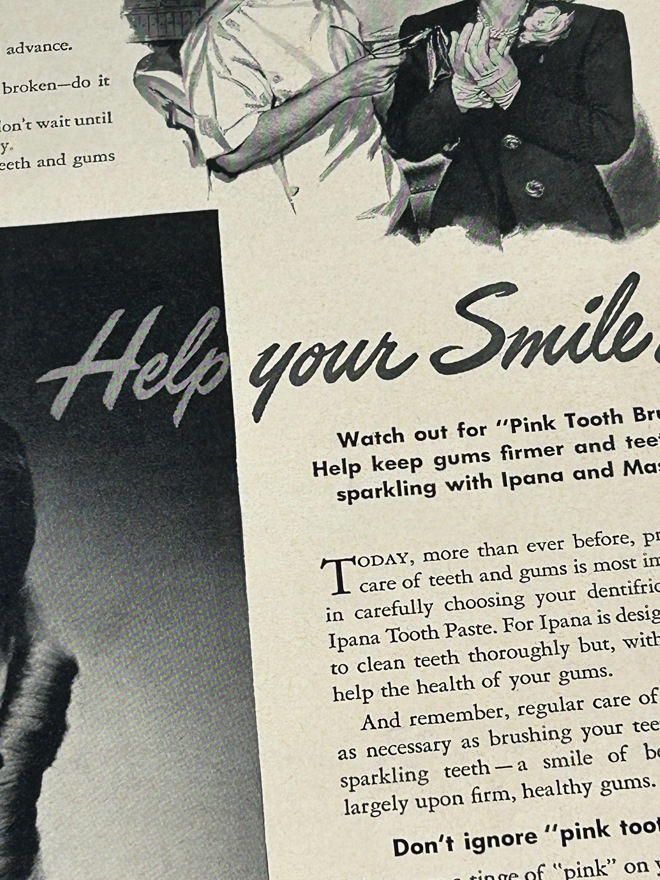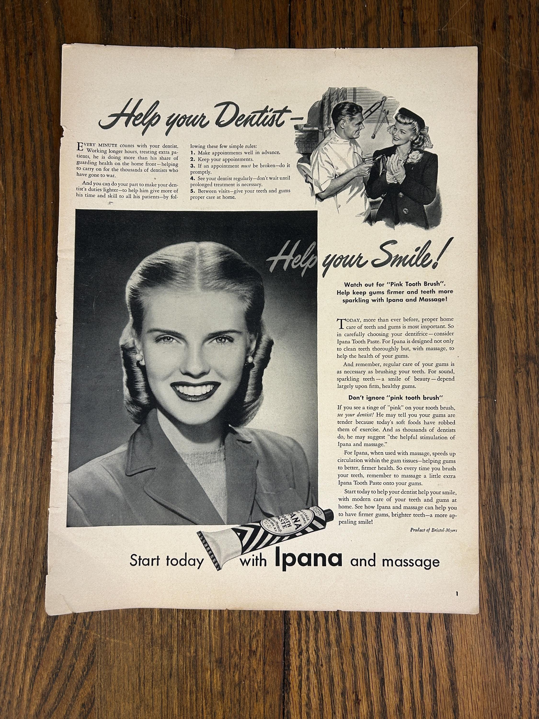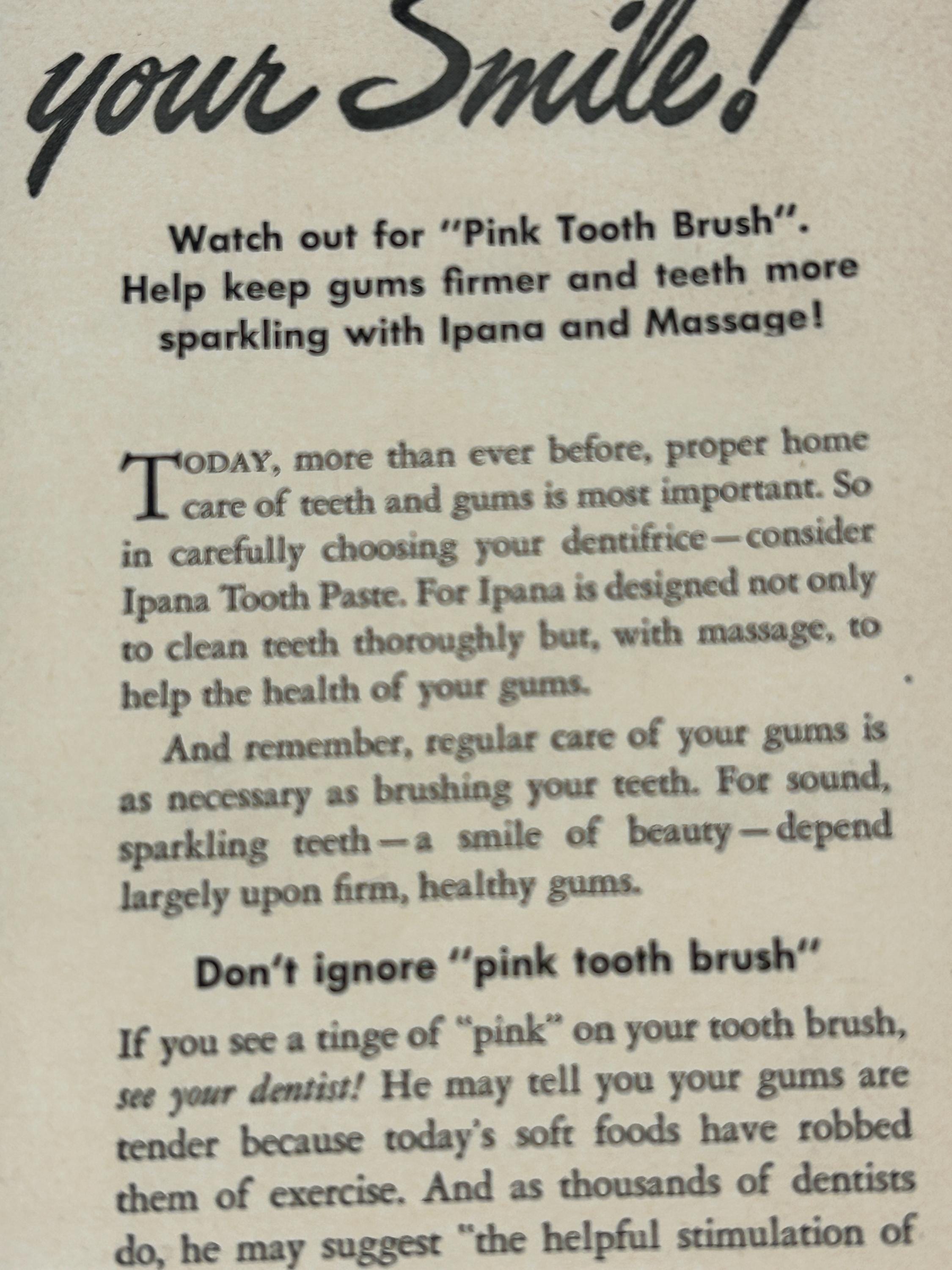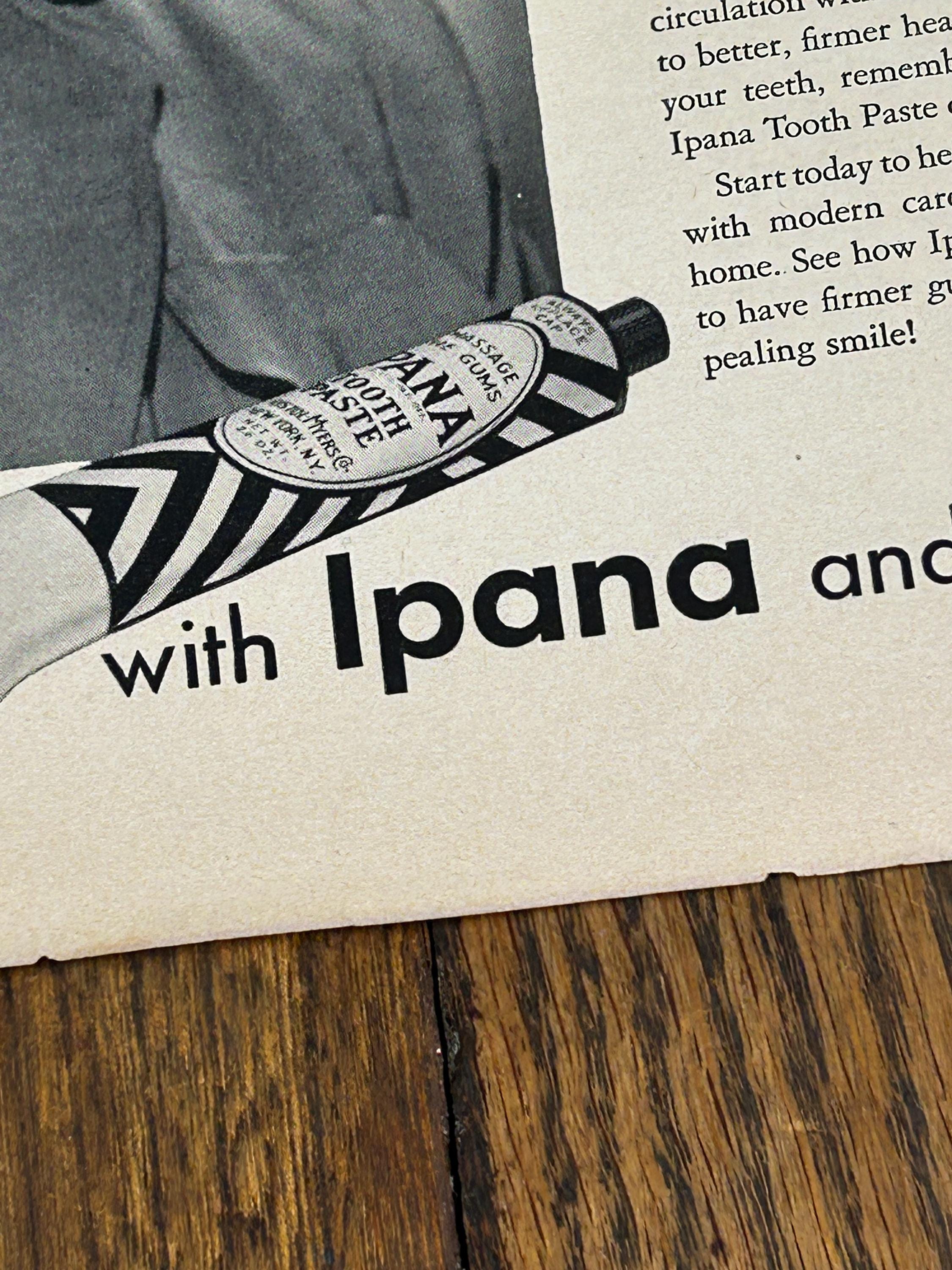 Ipana is promoted as a toothpaste that cleans teeth thoroughly and, when used with gum massage, helps keep gums firm and healthy — preventing what the ad calls “Pink Tooth Brush” (a vintage term for bleeding gums).