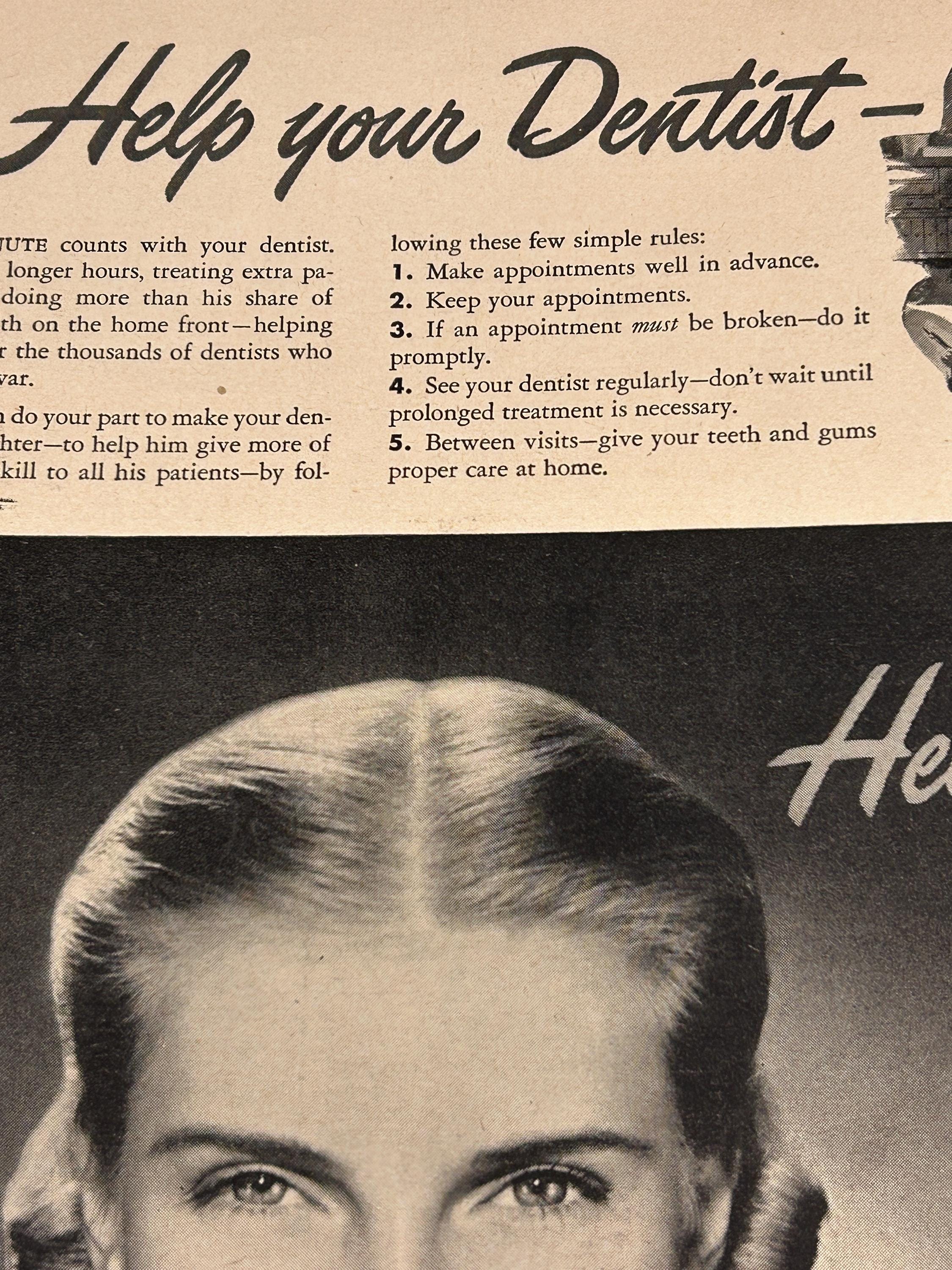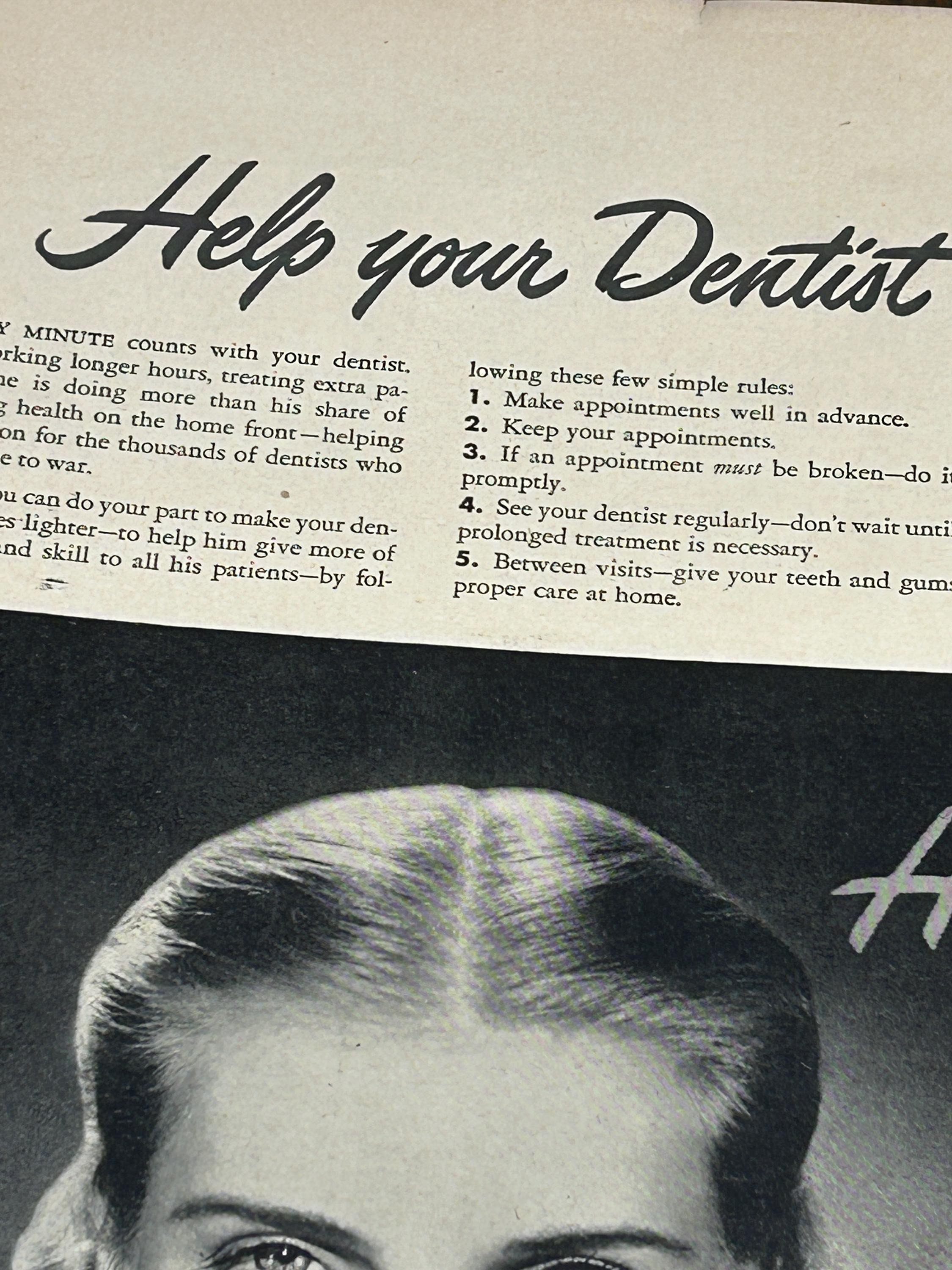The ad carries a strong wartime home-front message, reminding Americans that many dentists were serving in the military, creating shortages at home. It encourages readers to “Help your Dentist” and “Help your Smile!” by practicing good dental care habits and keeping regular appointments.