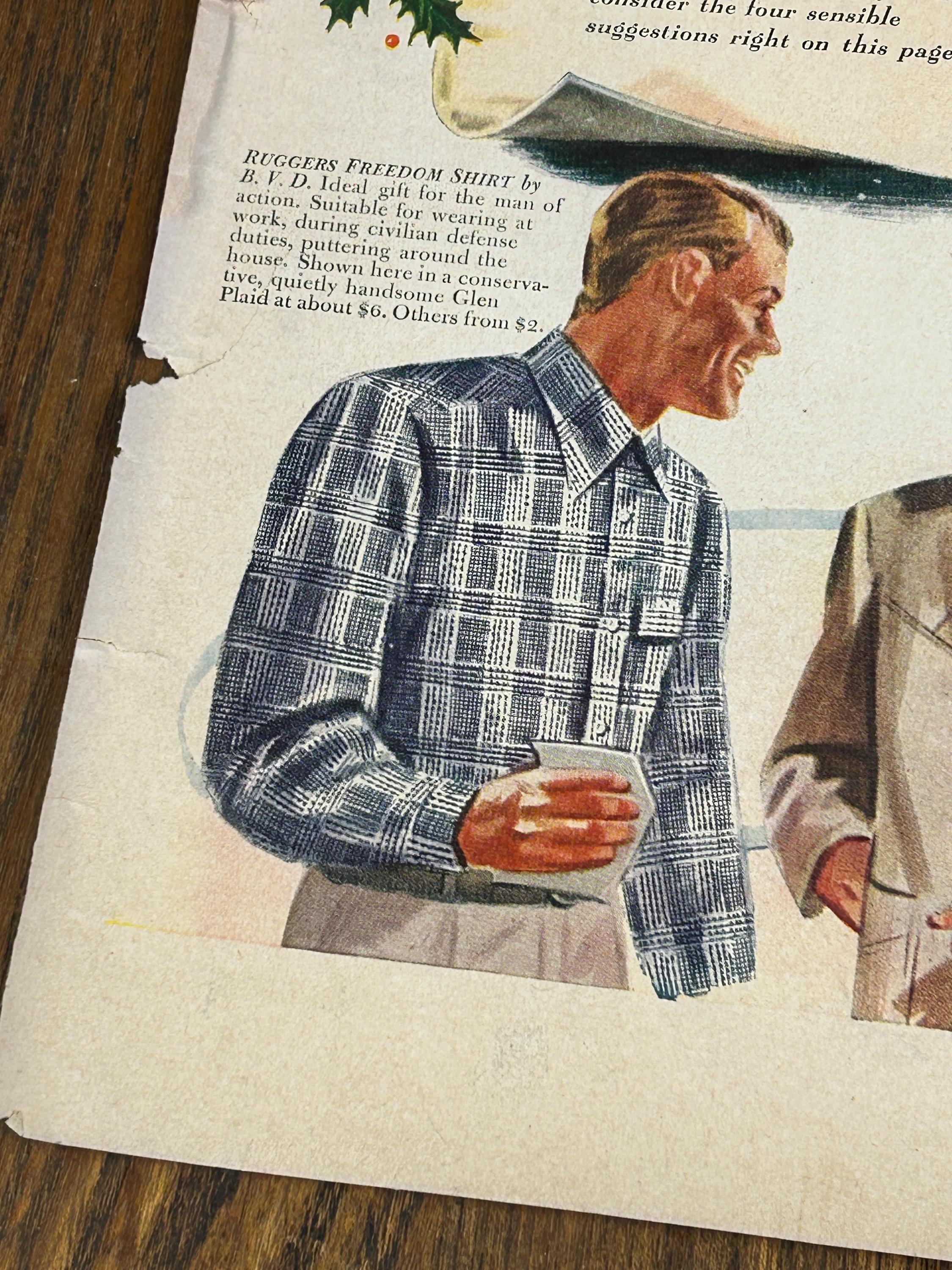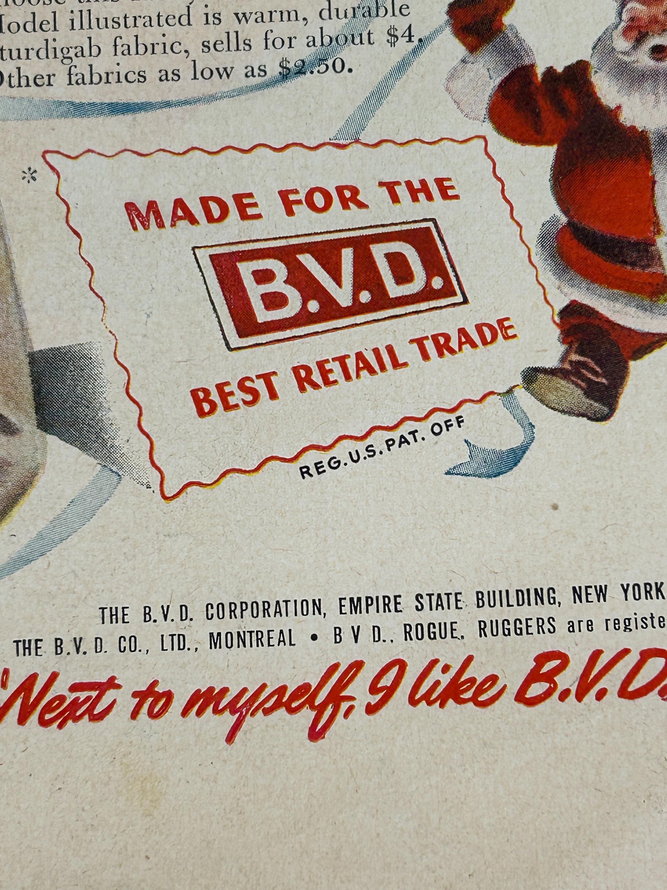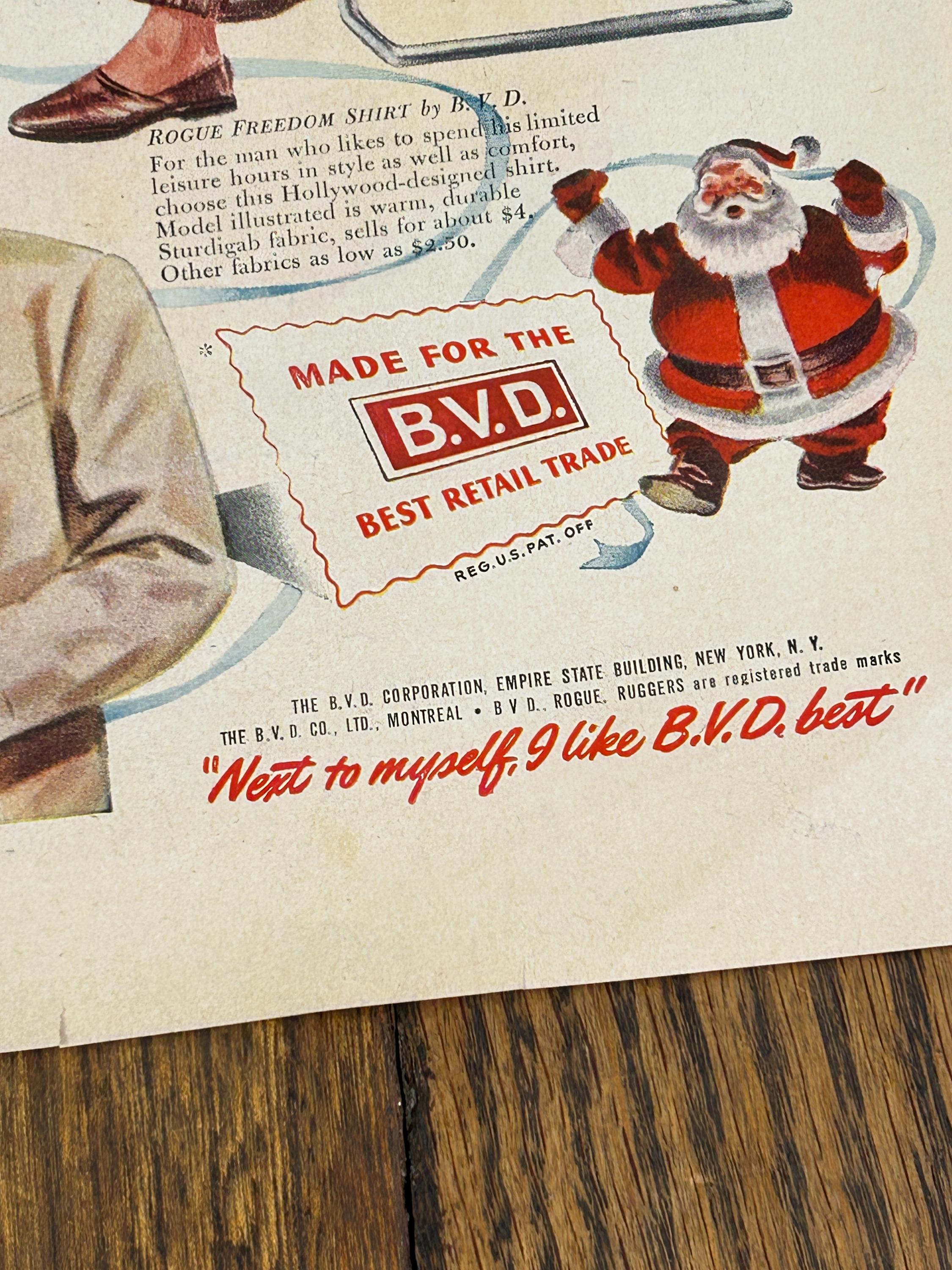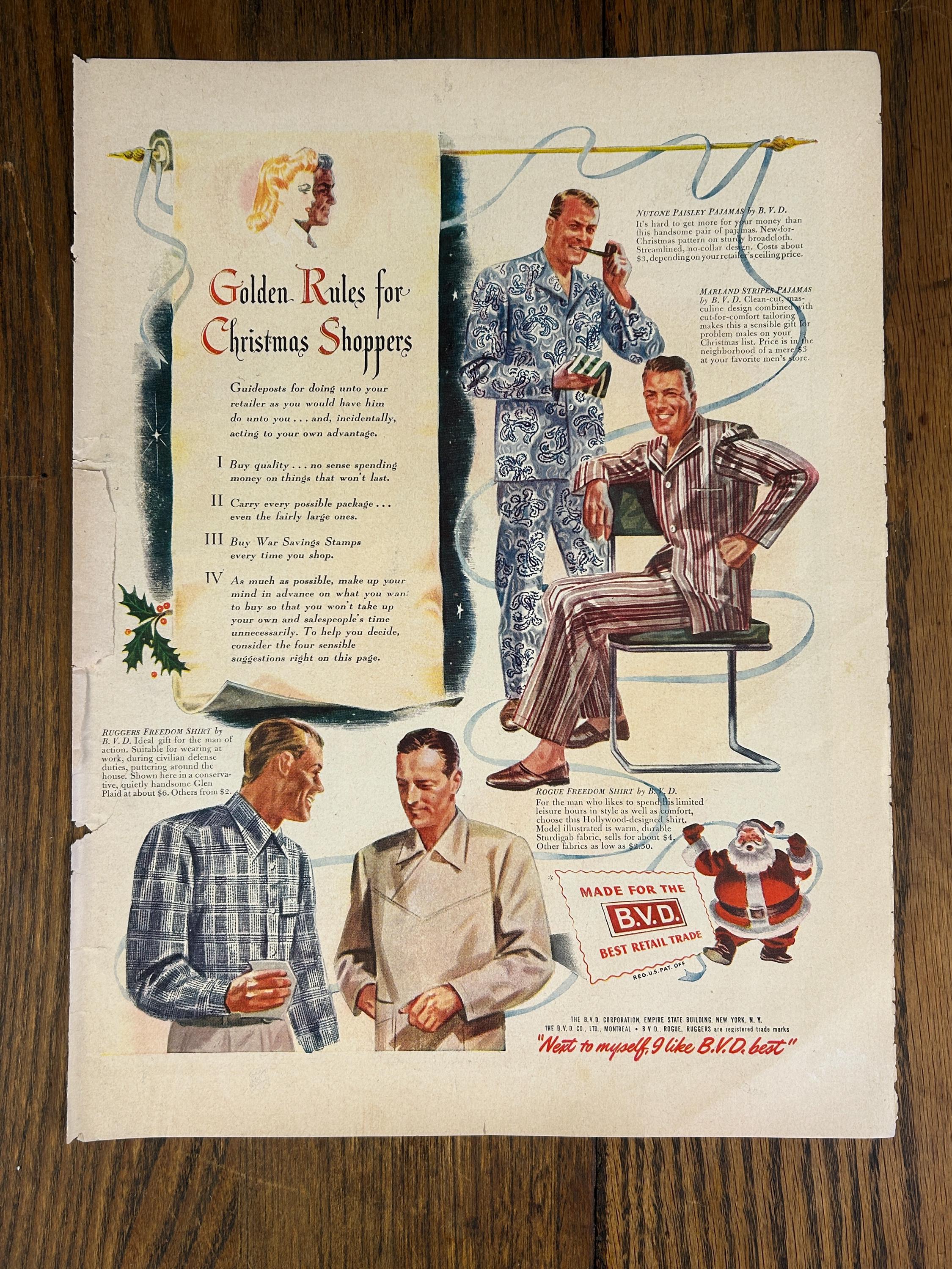 Back side of advertisement features a vintage 1943 B.V.D. print advertisement for men's pajamas and shirts, featuring "Golden Rules for Christmas Shoppers".