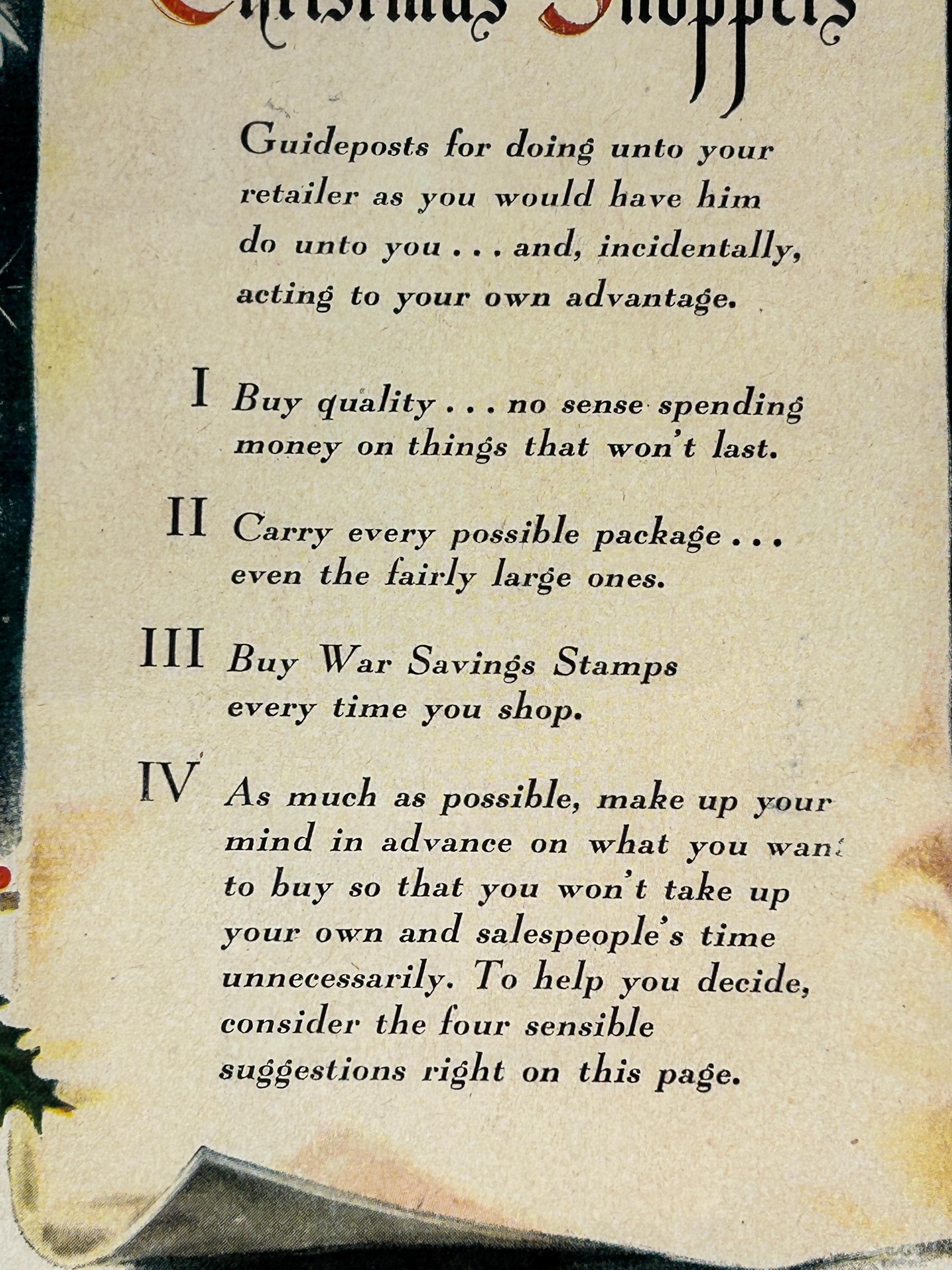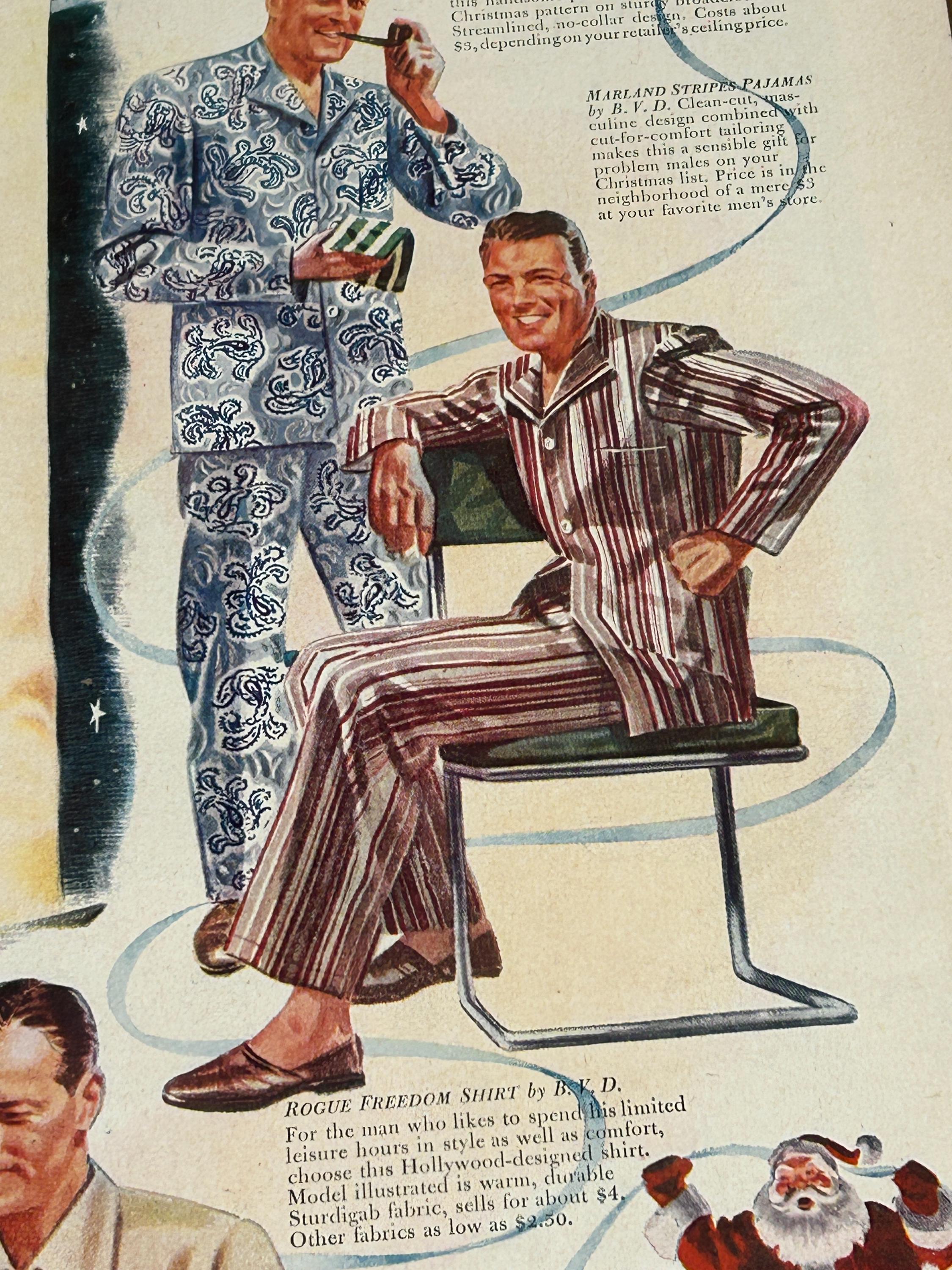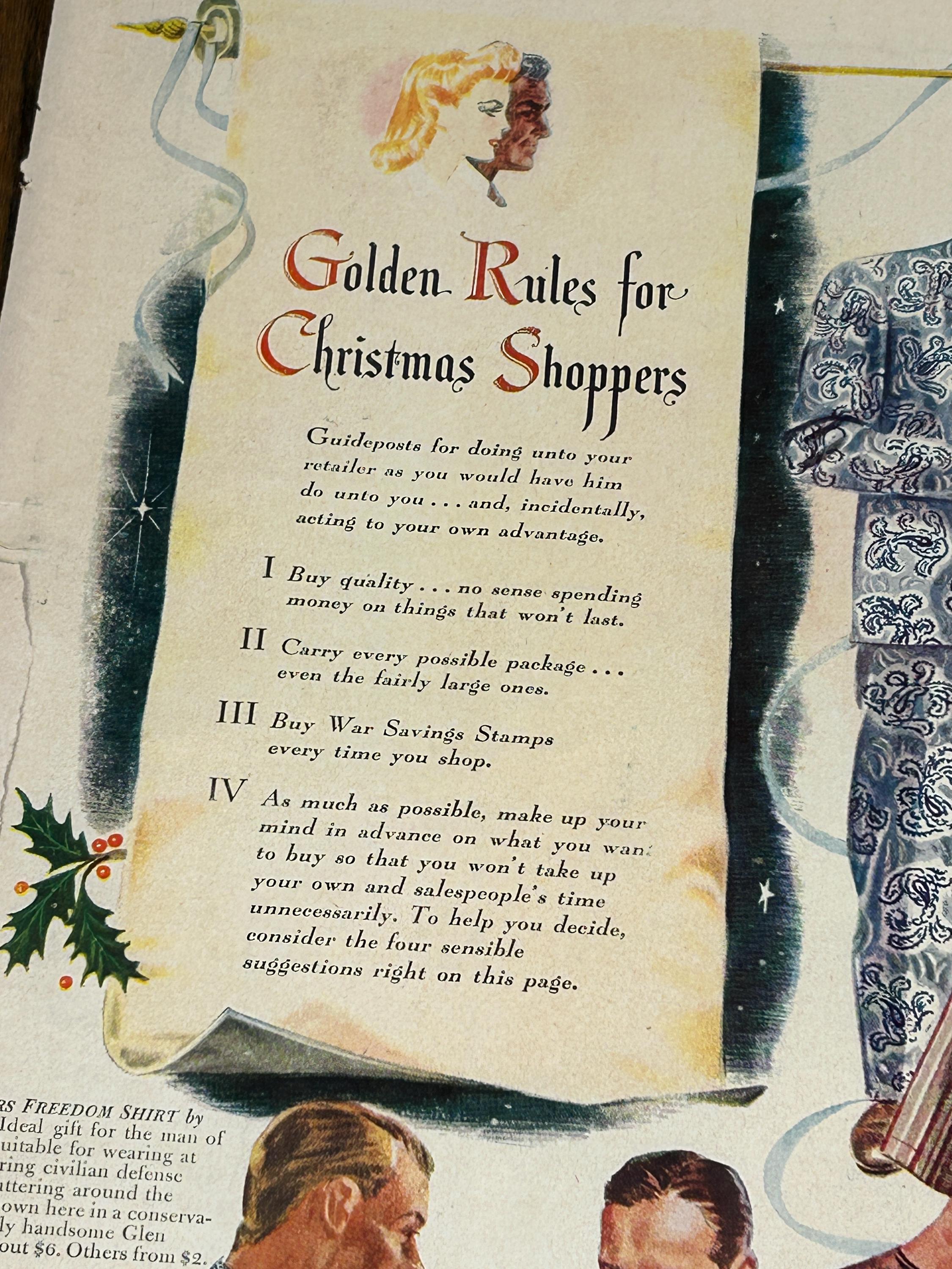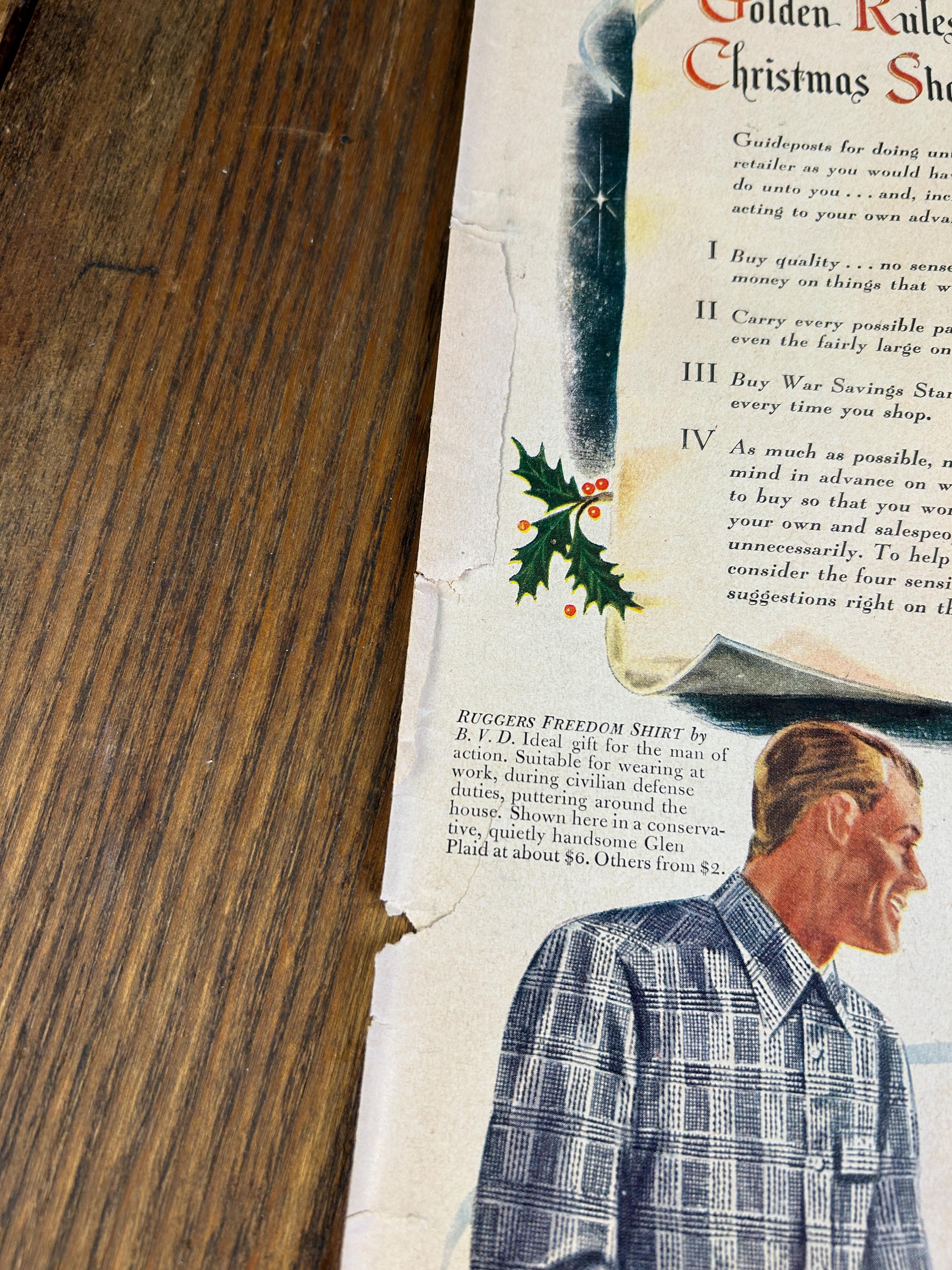 Back side of advertisement features a vintage 1943 B.V.D. print advertisement for men's pajamas and shirts, featuring "Golden Rules for Christmas Shoppers".