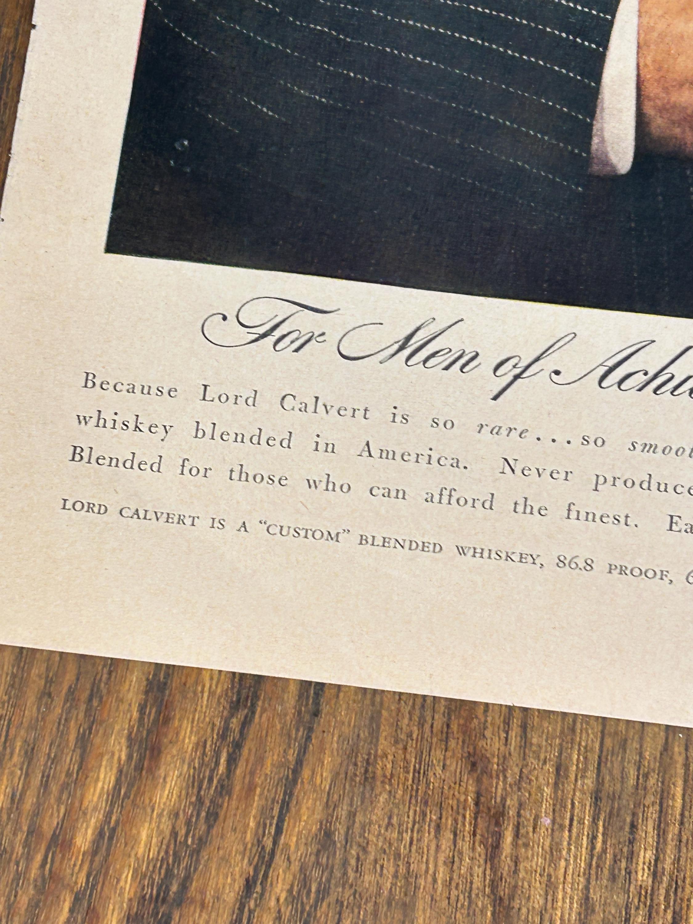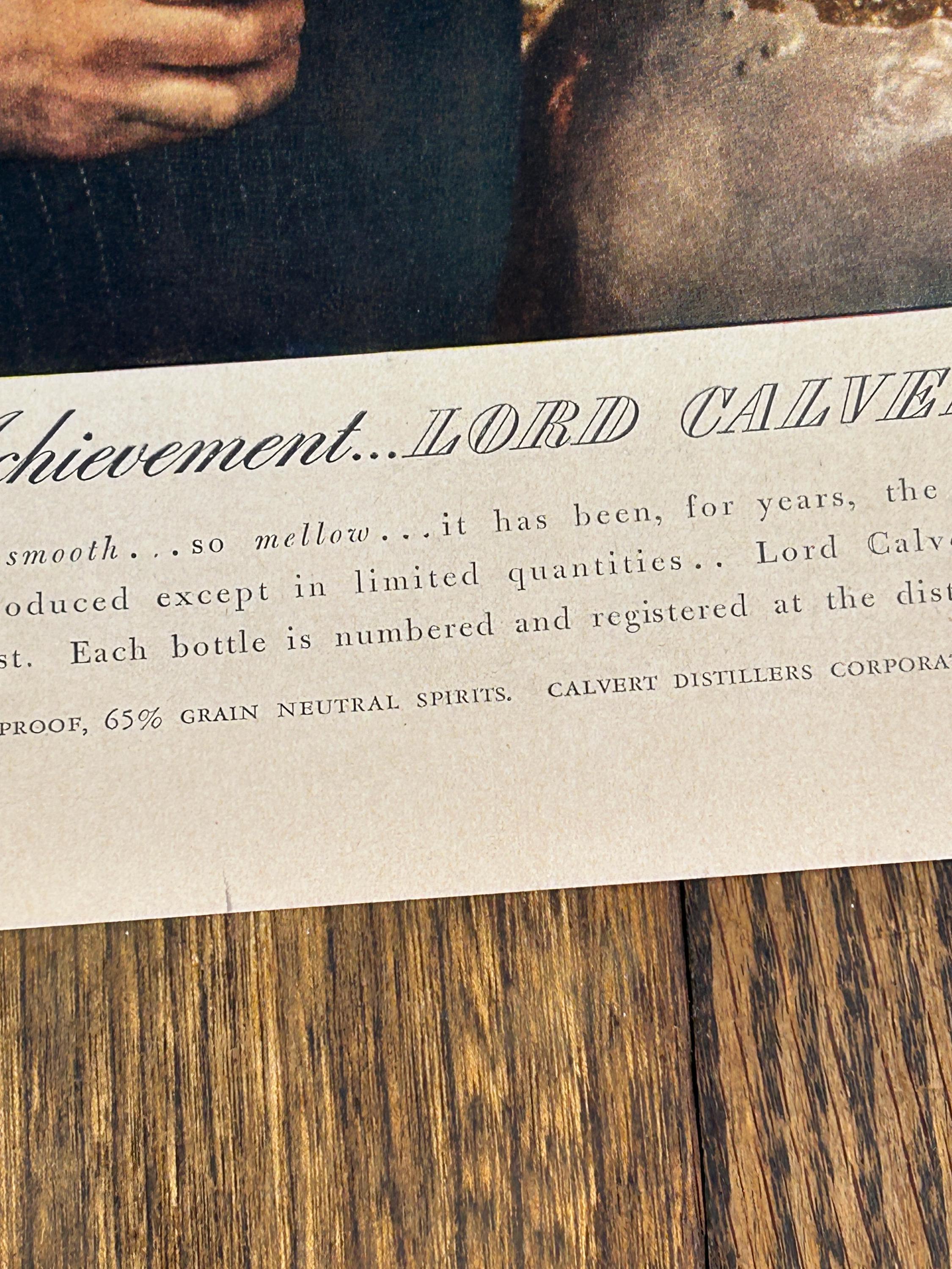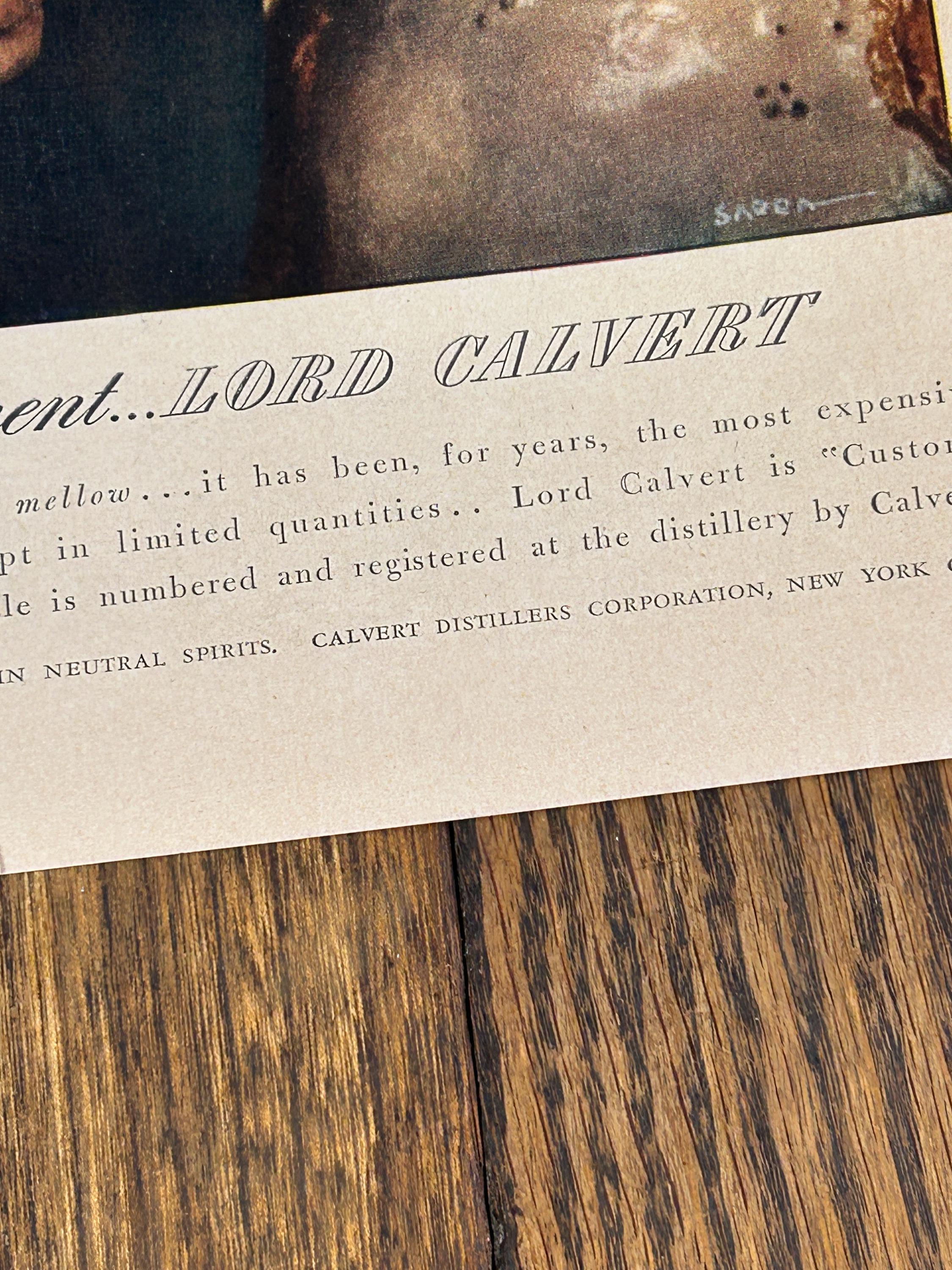 This is an original 1943 magazine advertisement for Lord Calvert Custom Blended Whiskey, a brand marketed in the 1940s as one of the most luxurious blended whiskies available.