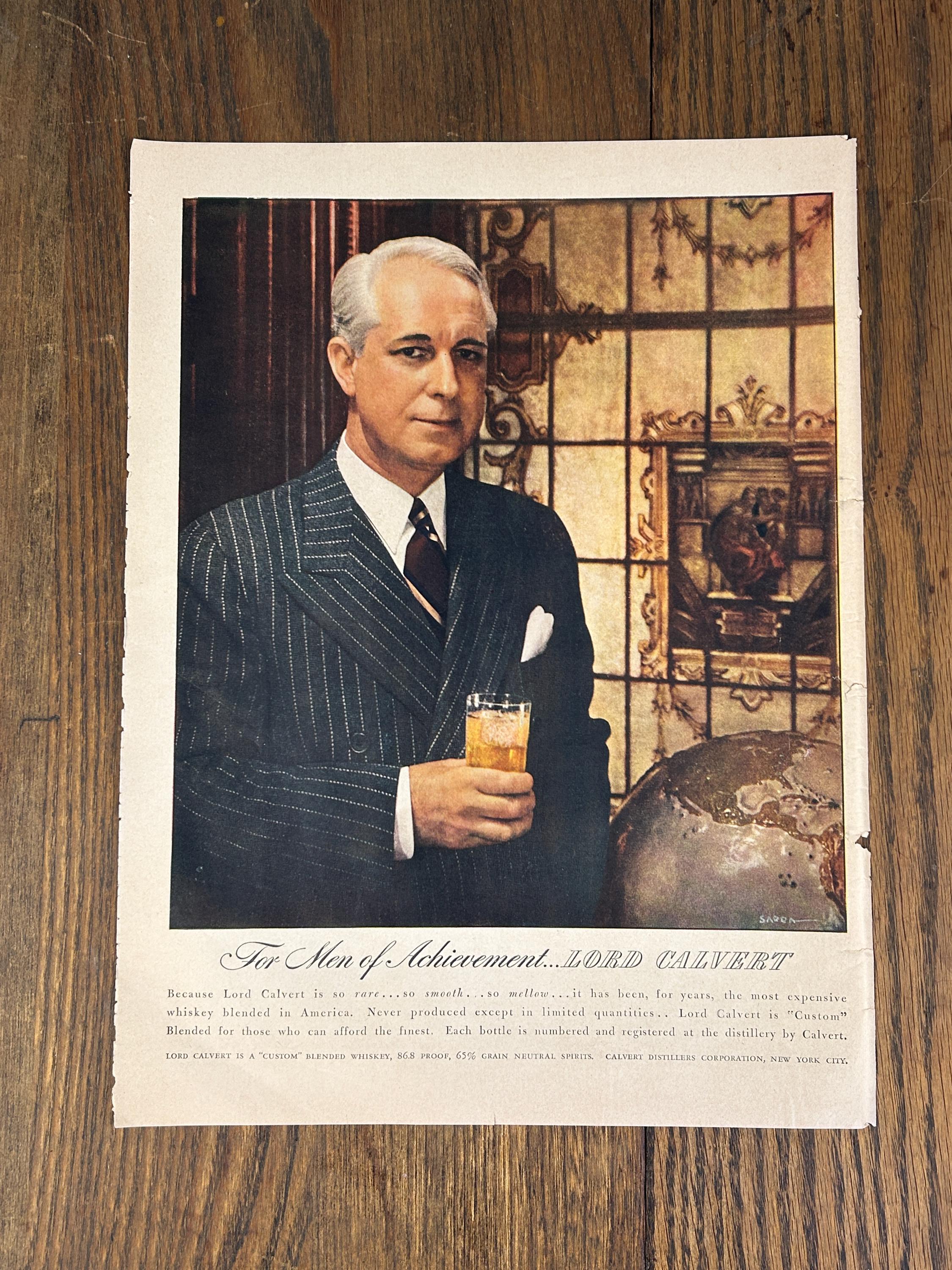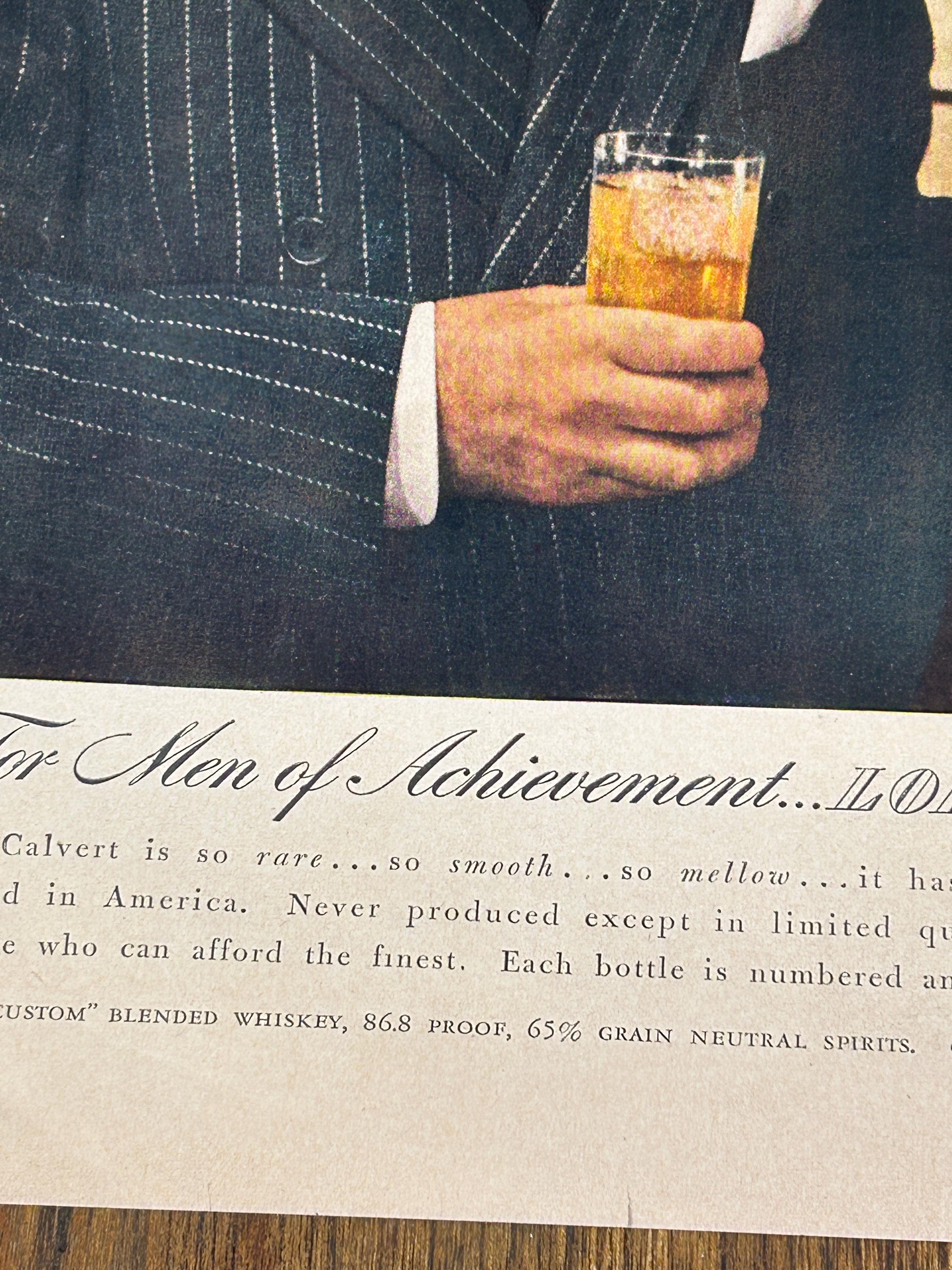 The elegant ad copy describes the whiskey as “so rare… so smooth… so mellow” and boldly calls it the “most expensive whiskey blended in America.” Each bottle was said to be numbered and registered at the distillery by Calvert, reinforcing the exclusive, high-end image of this “Custom” blend created for those who appreciated the finest.