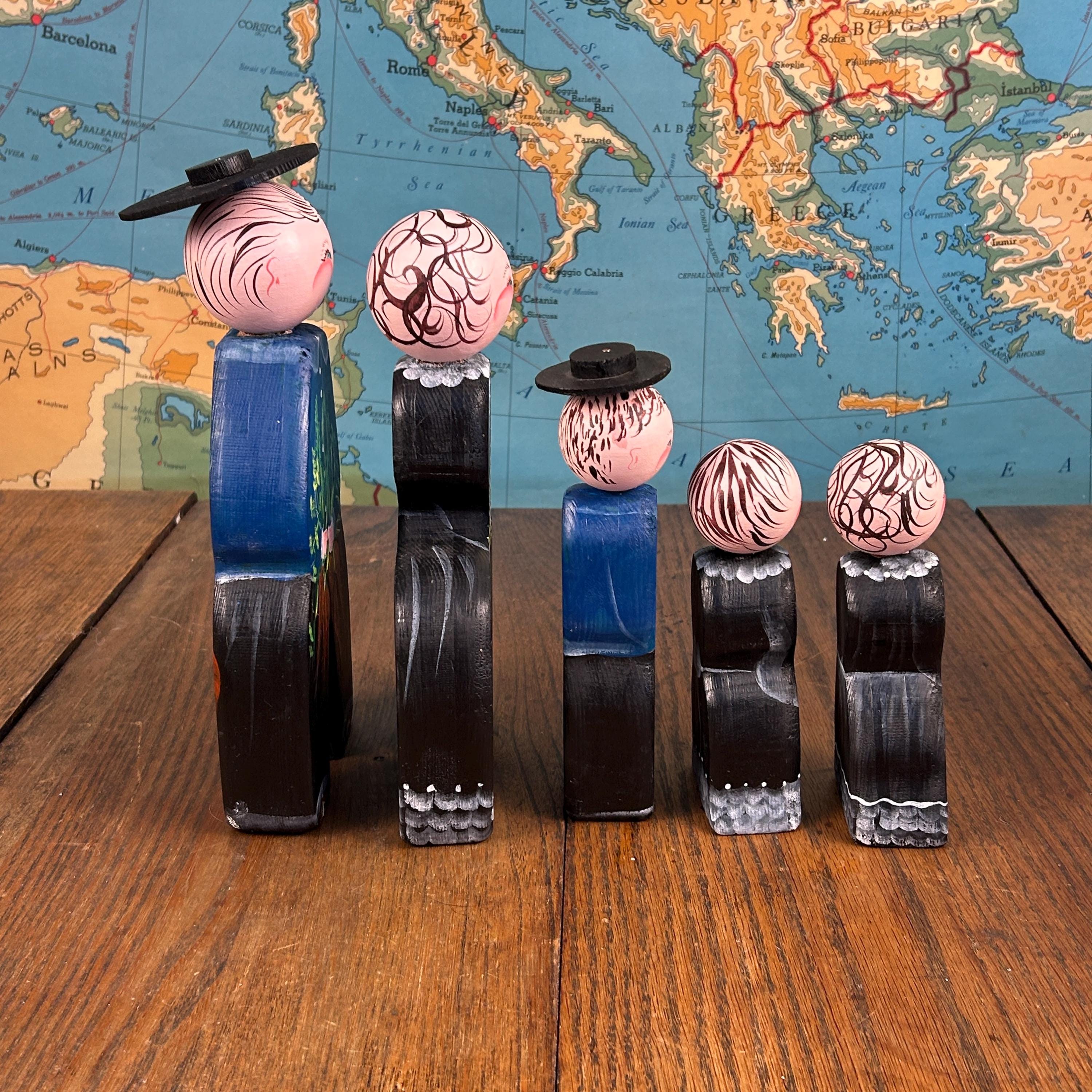 • Set of 5 vintage wooden peg dolls