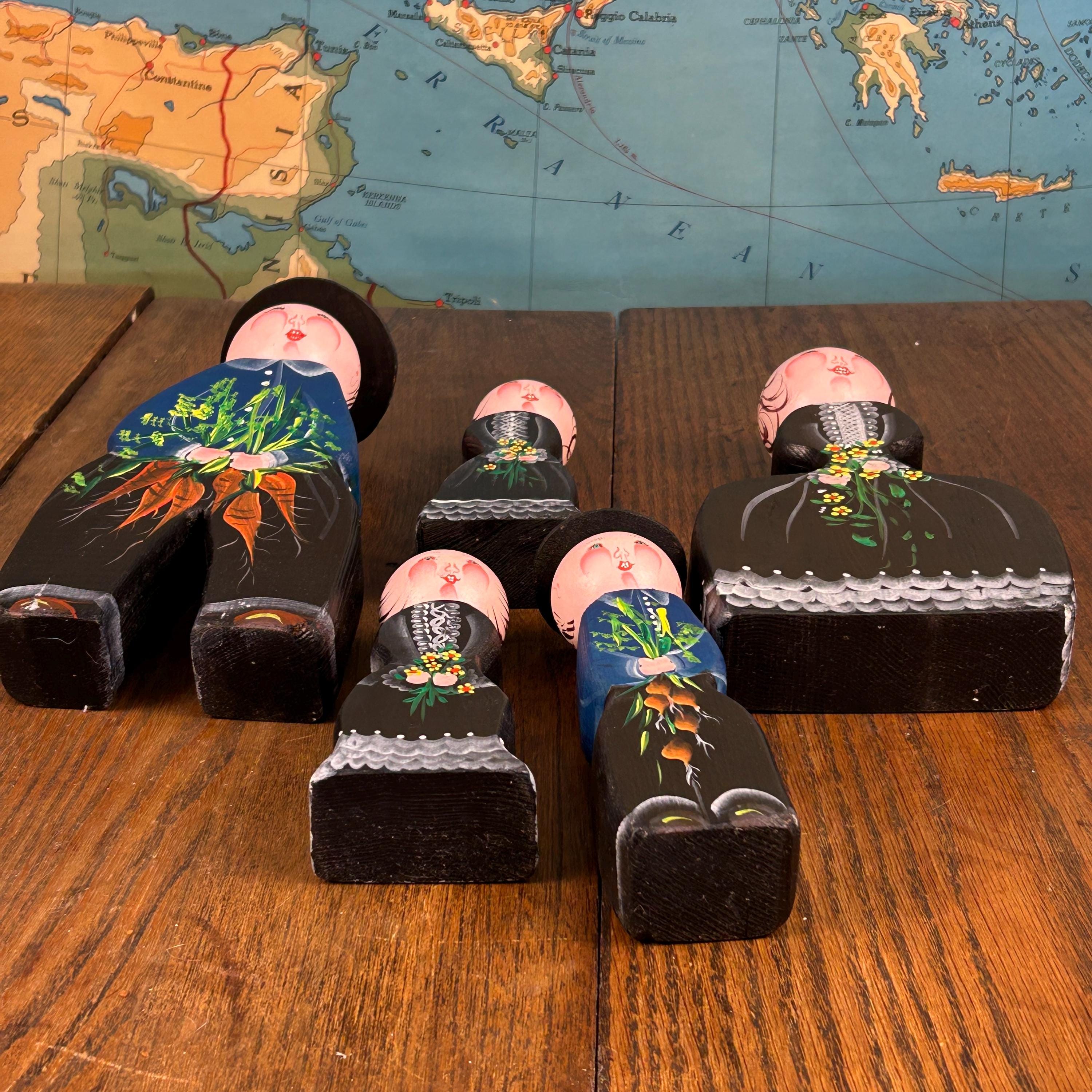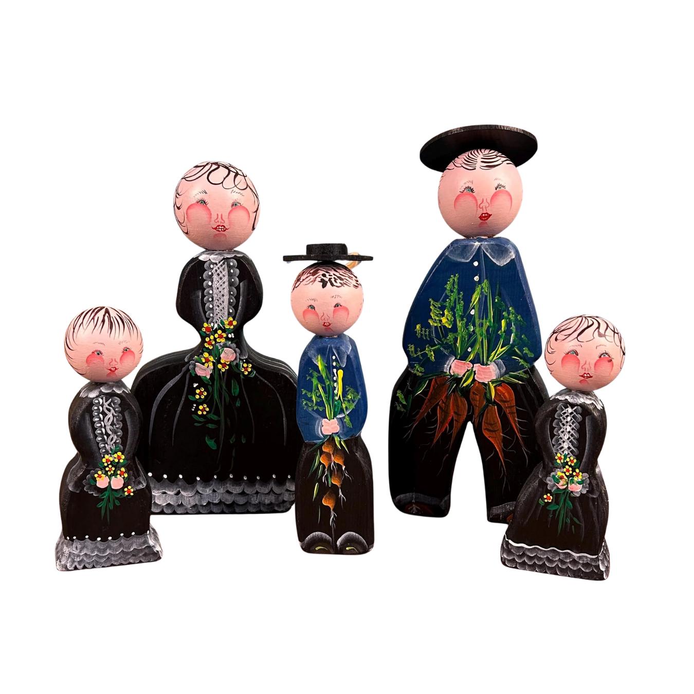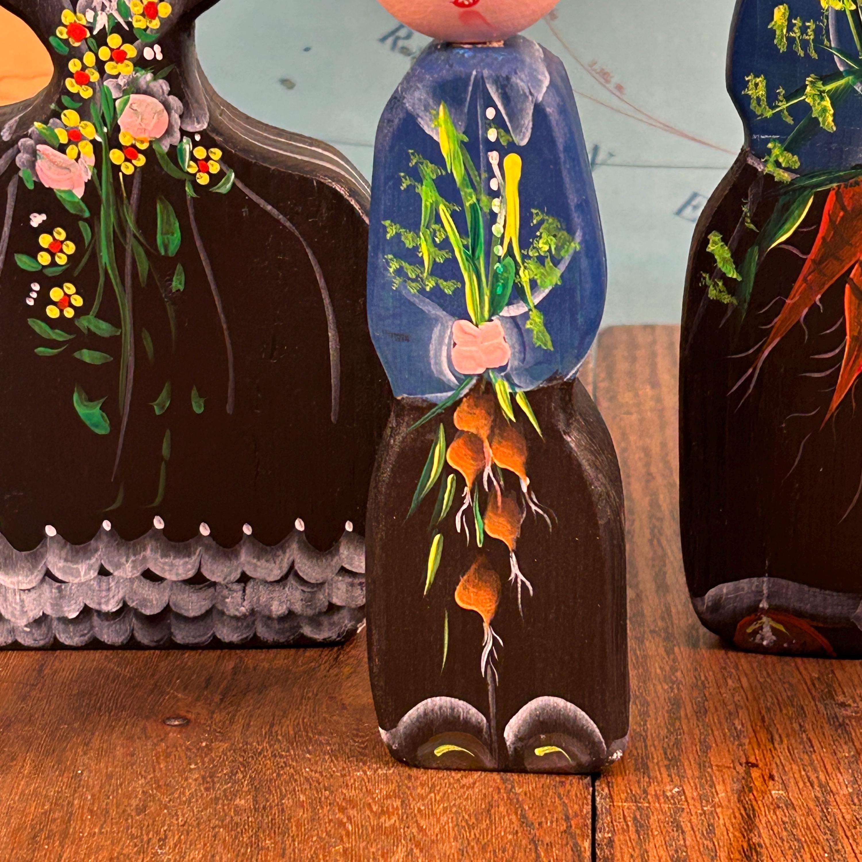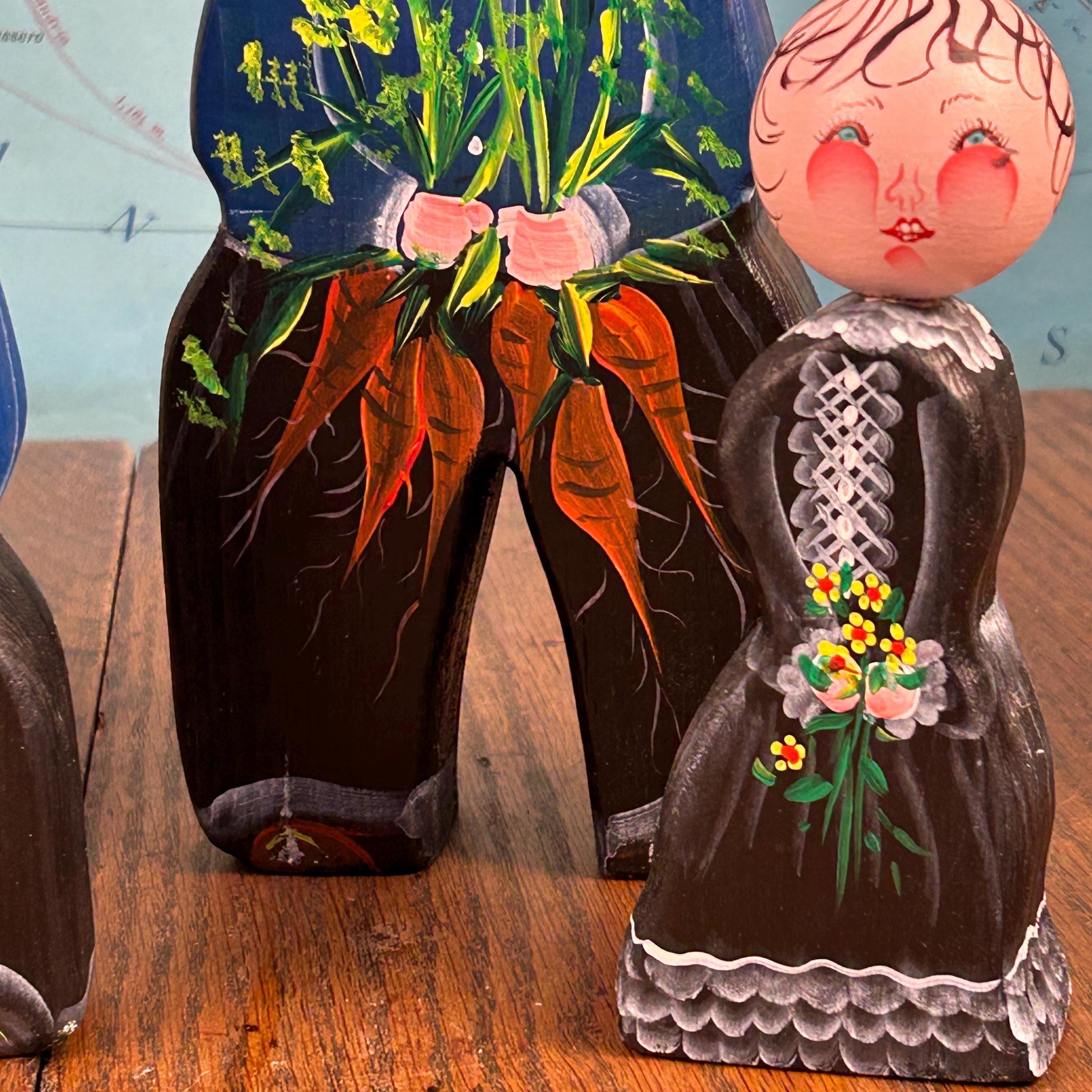 This delightful set of five vintage wooden folk figurines features hand-painted peg dolls dressed in traditional European-style costumes. Each figure is uniquely detailed and appears to be holding a small painted bouquet of flowers or carrots, adding to their rustic, countryside charm.